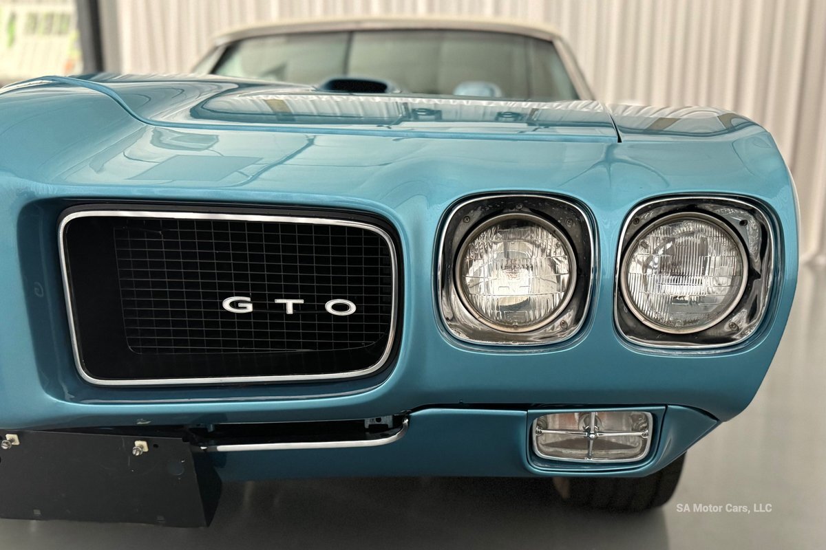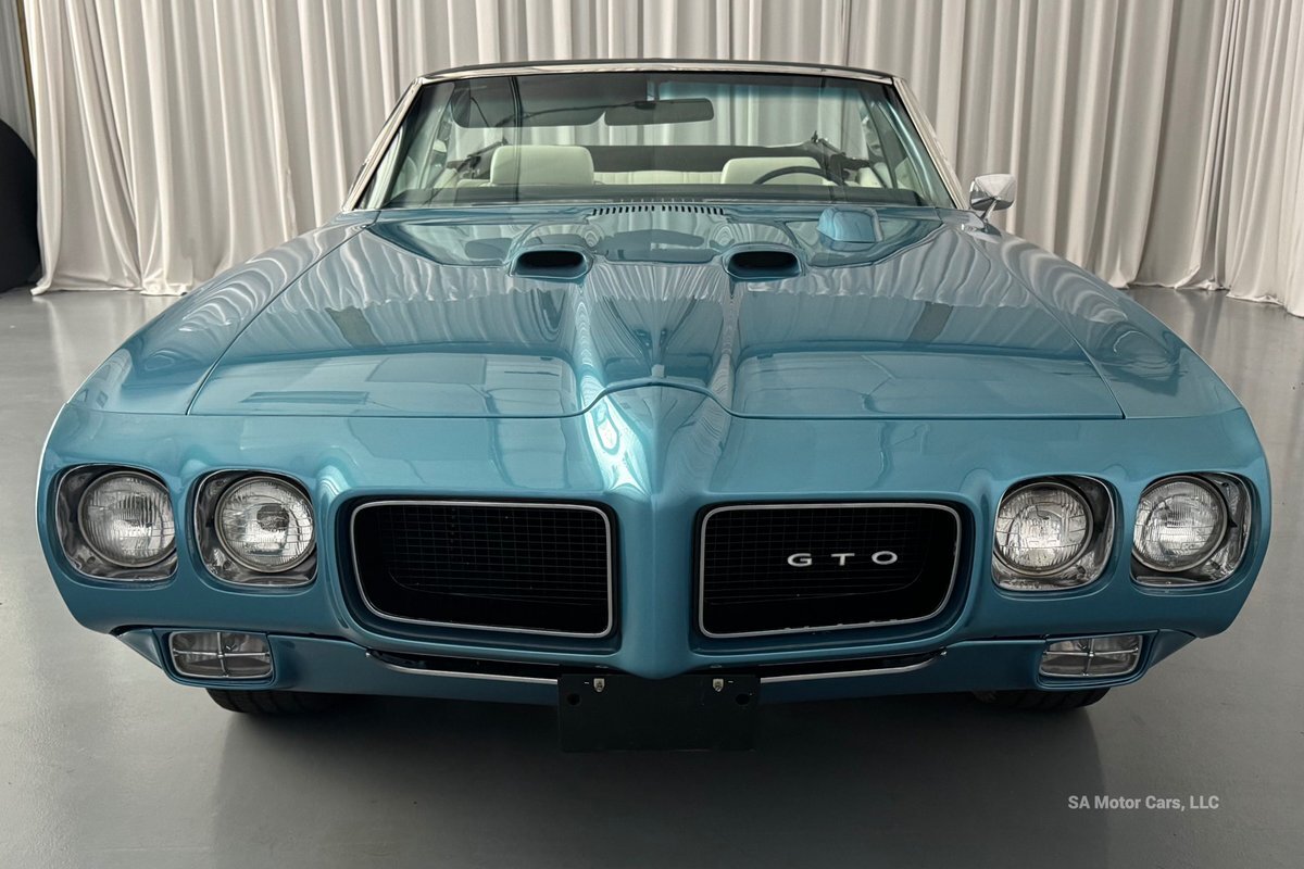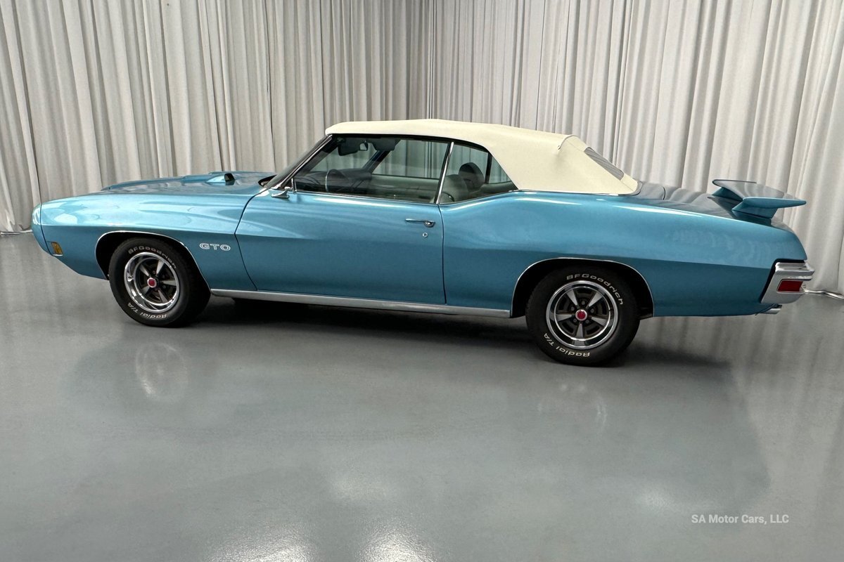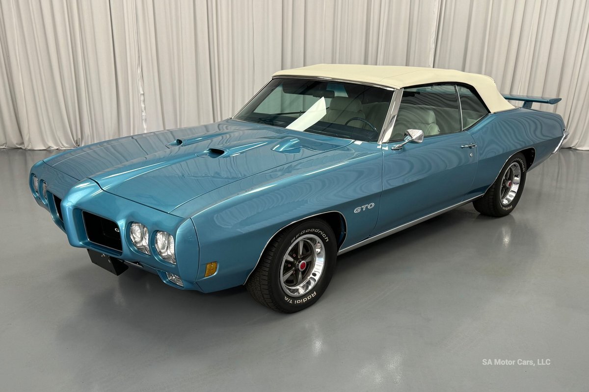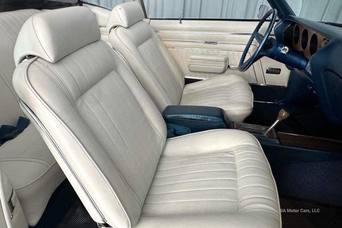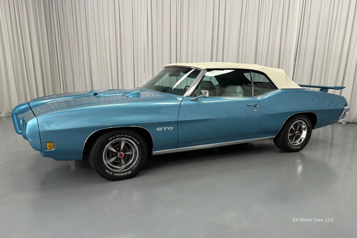 Check out this amazing 1970 Pontiac GTO! This Convertible is Sporting gorgeous Blue Exterior Paint and a White Convertible top! On the exterior this GTO is sporting its GTO emblems on both front panels, front grille and trunk lid. The interior of this GTO is also sporting a beautiful White interior with bucket seats in front and a bench seat in rear, black Pontiac floor mats, 3-spoke Pontiac steering wheel, and so much more!