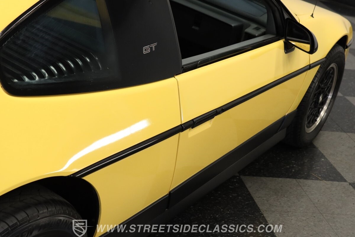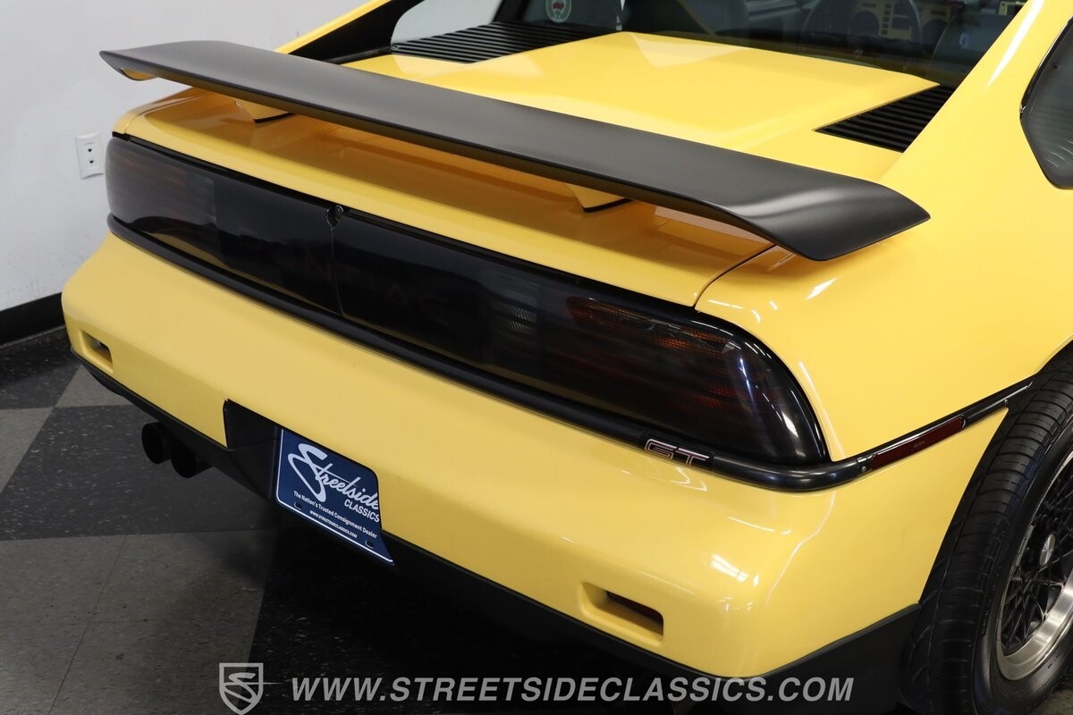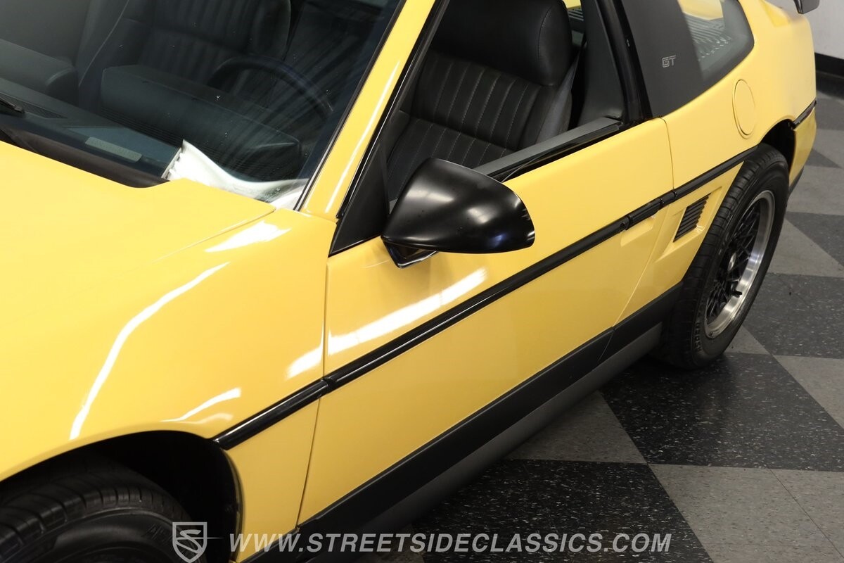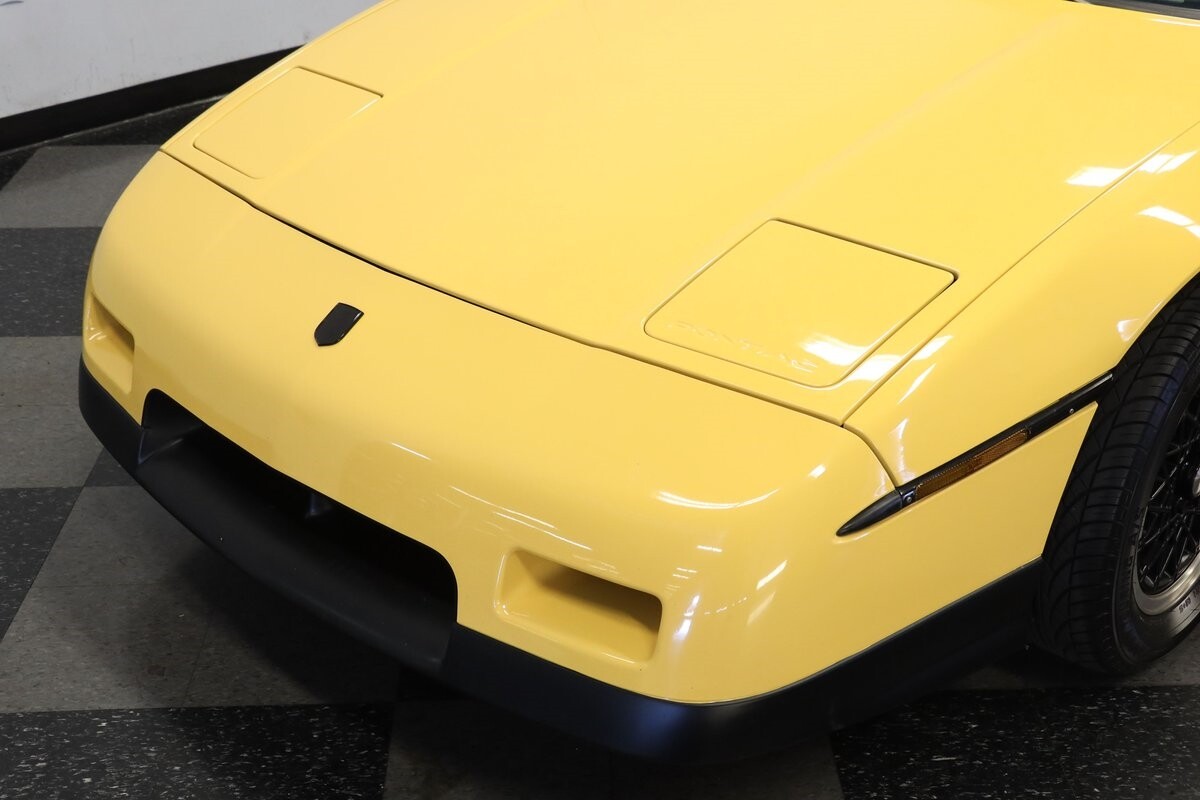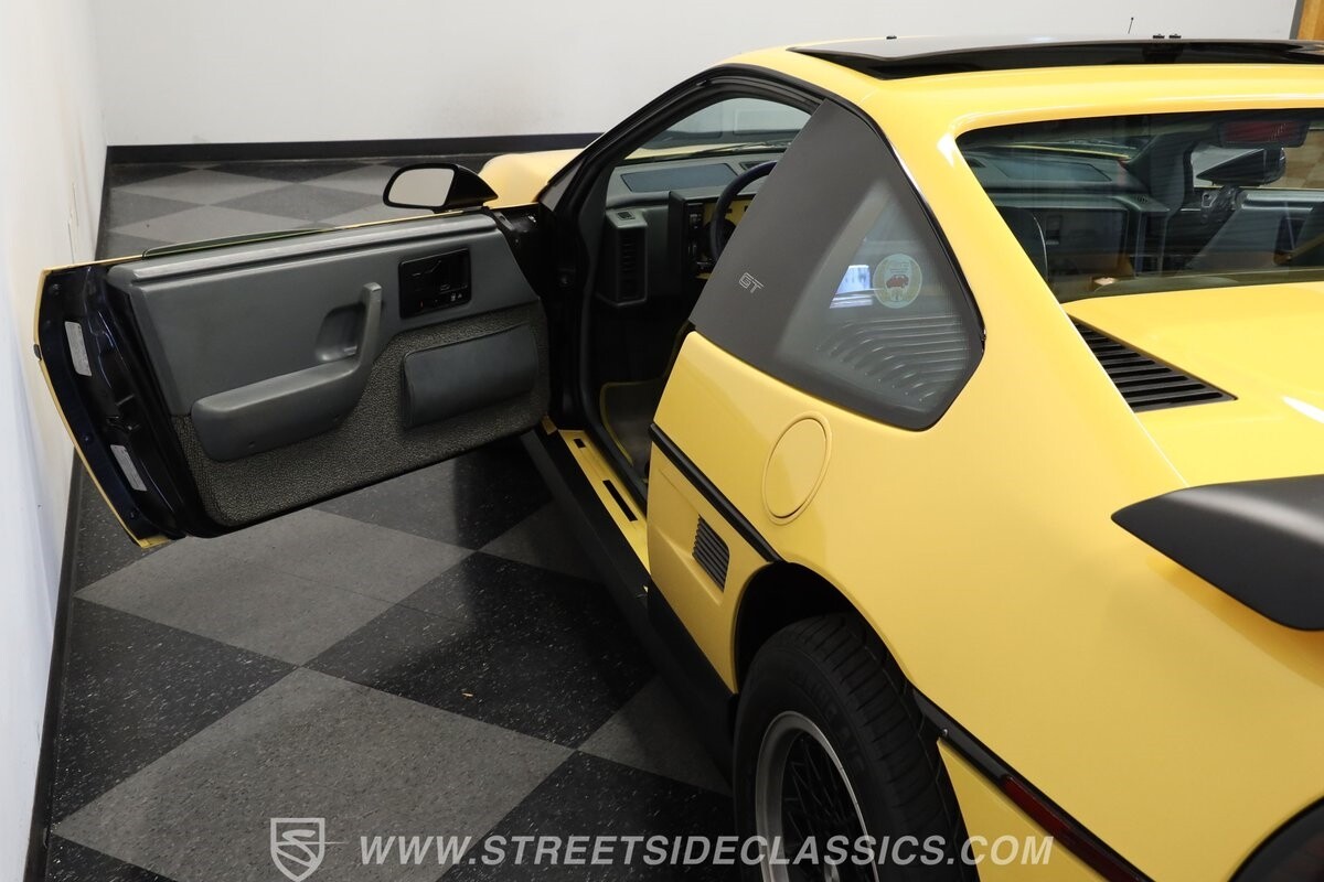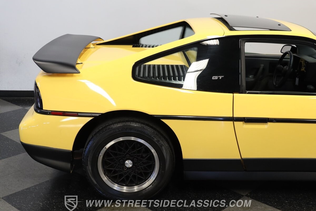 The design of the Fiero GT is irresistible. It looks like a Ferrari with the special front nose, sleek factory body kit, and hidden headlight front end. And the fastback flying buttress rear is pure supercar. Plus, the full-width rear spoiler and quad tailpipes gave it some Trans Am-style flair. And we particularly like the Bright Yellow factory color. It was resprayed later in life to make sure it continues to have a vibrant style. This kind of bold color will draw even more comparisons to a Ferrari, and so will the rarity. This is the final year for the Fiero, and only 241 were done in yellow. When you put all the main options together, including the GT and interior, that number goes down to only one of 21 ever! We also like this yellow because it makes the dark side pop. You can really see the black on the lower body kit, sweeping side trim, blackout rear panel, and the rear spoiler. Even the crosslace wheels coordinate to deliver a thoughtful total package you'll drive with pride.