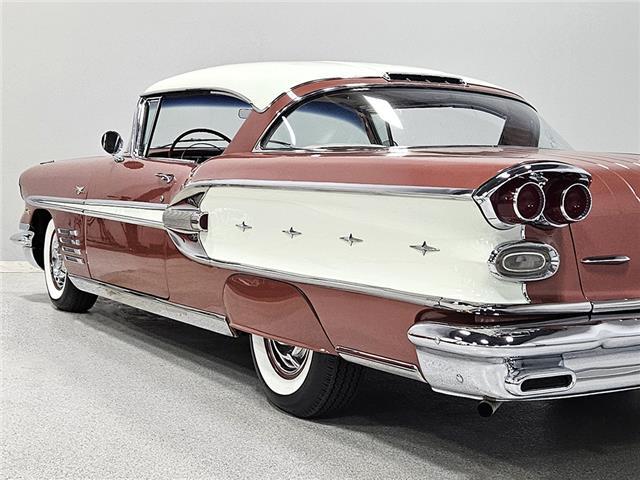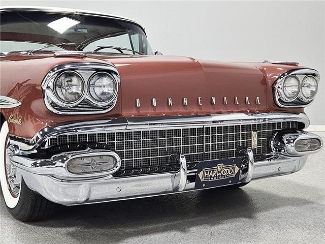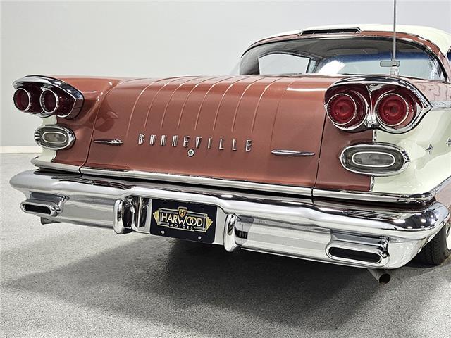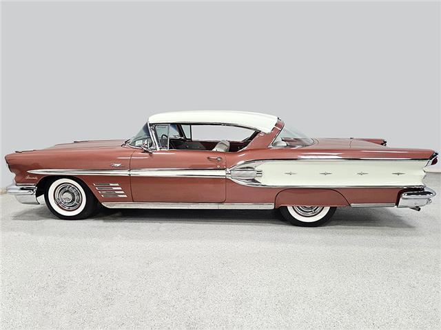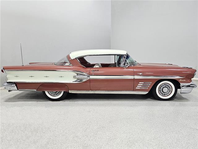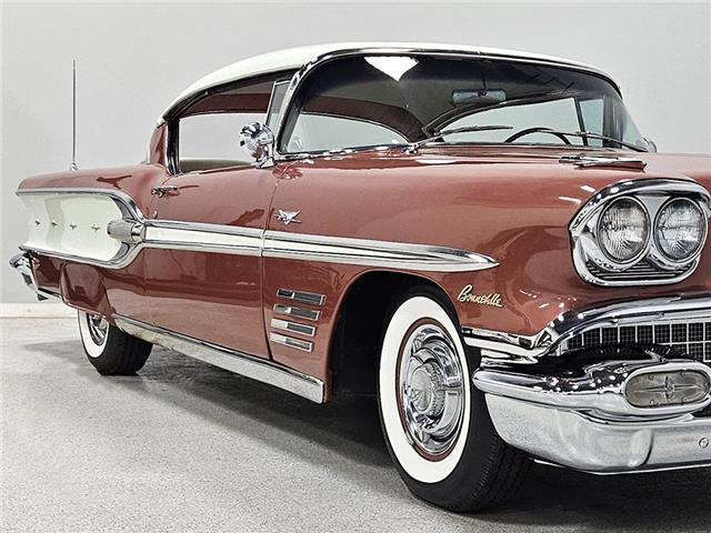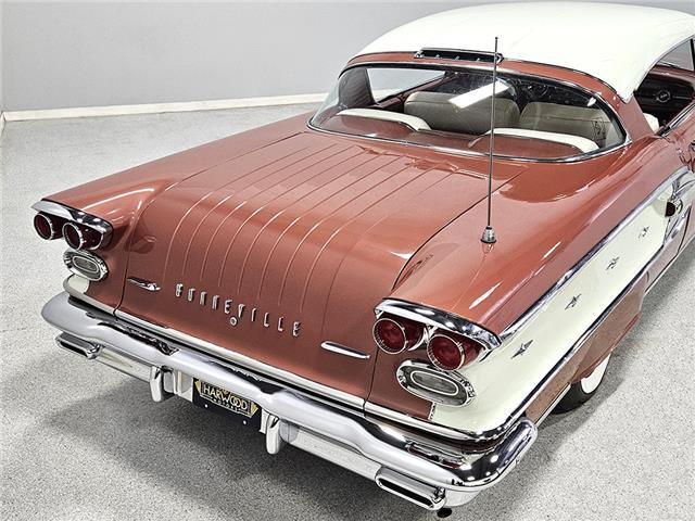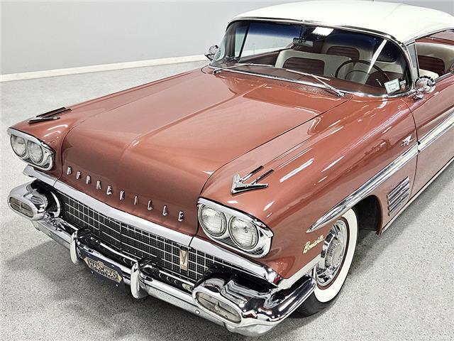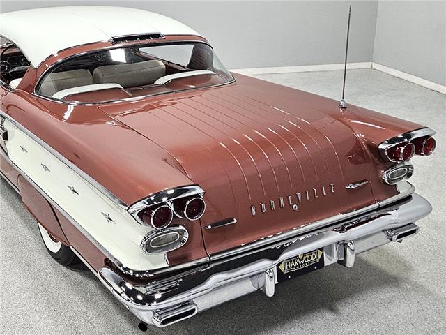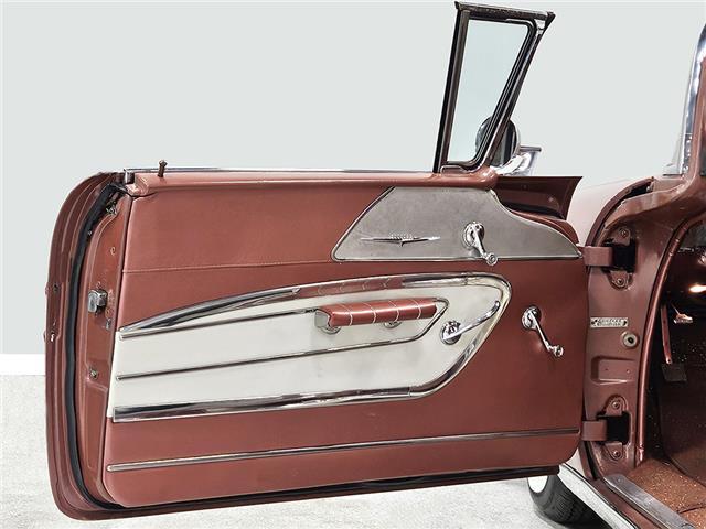 For reasons we don’t quite understand, the all-new 1958 Pontiac Bonneville sport coupe was a tough sell, as only 3481 were built—fewer than any other model except the station wagon. Seeing this stunning top-of-the-line coupe in person makes you wonder why more buyers didn’t fall in love, because it’s just a gorgeous car. GM’s one-year-only styling was a big success in 1958, transforming the automotive landscape almost overnight, and Pontiac was just discovering its swagger with big horsepower and fantastic design. Finished in Patina Ivory over Redwood Copper, it looks every bit the ‘50s cruiser that it is, packing luxury and performance into a right-sized package. Paint and bodywork are excellent, with good gaps and doors that swing closed with a precise-sounding THUNK rather than a loose rattle, a testament to both GM’s build quality and the restoration work. The paint shines up beautifully and lets the brilliant chrome trim do most of the talking. And yes, there’s a LOT of chrome on this car, all of which appears to have been restored at the same time as the rest of the bodywork. There are a few minor signs of age, but nothing really worth mentioning. Instead, it has an all-of-a-piece look that suggests it has always been lovingly maintained but also used as intended. This is a car that stops people in their tracks as they browse through our showroom.