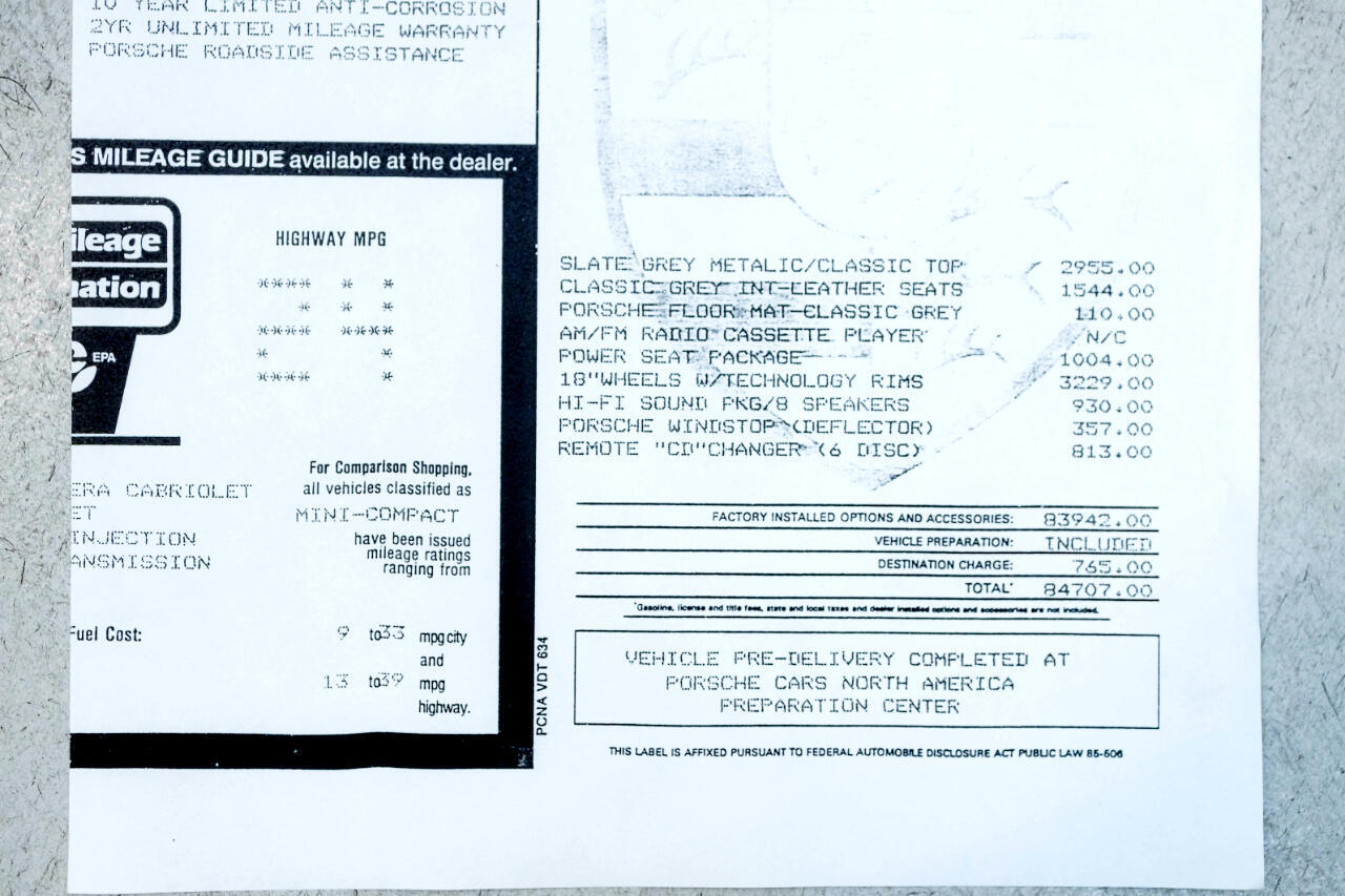 FULL HIGH RESOLUTION PHOTOS AND DETAILED DESCRIPTION ON YOU HAVE A VEHICLE YOU ARE LOOKING TO SELL, PLEASE CALL US AT 770-455-8494WE SHOW VEHICLES BY APPOINTMENT ONLY. PLEASE CALL TO SCHEDULE AN APPOINTMENT IN ORDER TO VIEW A LISTING IN PERSON.NEW ARRIVAL!! BRAND NEW TIRES!! BEAUTIFUL PAINT-TO-SAMPLE PORSCHE 993 CARRERA 2 CABRIOLET!! PCA MEMBER-OWNED CAR. COMES WITH BOOKS, MANUALS, TONNEAU COVER, WIND SCREEN, FOLDER OF SERVICE RECORDS, AND FULL SET OF PORSCHE CARPETED FLOOR MATS!EXTERIOR IS FINISHED IN PAINT-TO-SAMPLESLATE GREY METALLIC OVERCLASSIC GREYLEATHER INTERIOR.FACTORY OPTIONS AND FEATURES INCLUDE:3.6L NATURALLY ASPIRATED FLAT 6 CYLINDER6 SPEED MANUAL TRANSMISSIONPORSCHE CR210 HEAD UNITPOWERFRONT SEATSPOWER WINDOWSPOWERSOFT TOPSPLIT FOLD REAR SEATSBASKET HANDLE ON REAR DECKCLASSIC GREY PORSCHE FLOOR MATSAM/FM RADIO CASSETTE PLAYER8 SPEAKER HI-FI SOUND PACKAGEPORSCHE WIND DEFLECTORREMOTE 6-DISC CD CHANGERAIR CONDITIONINGAND SO MUCH MORE.GAS MOTORCARS IS A FAMILY OWNED AND OPERATED CAR DEALERSHIP LOCATED IN MARIETTA, GA. WE ONLY SELL VEHICLES OF THE HIGHEST QUALITY. WE SHIP VEHICLES WORLDWIDE AT THE BUYER'S EXPENSE. WE TAKE CONSIGNMENTS AS WELL AS TRADES.WE SHOW VEHICLES BY APPOINTMENT ONLY.PLEASE CALL AHEAD TO SCHEDULE A DATE AND TIME IN ORDER TO VIEW A LISTING IN PERSON.CONNECT WITH US ON INSTAGRAM @GASMOTORCARSIt is the customers sole responsibility to verify the existence and condition of any equipment listed. Neither the dealership nor Dealer Socket is responsible for misprints on prices or equipment. It is the customers sole responsibility to verify the accuracy of the prices with the dealer, including the pricing for all added accessories. Visit Gas Motorcars online at to see more pictures of this vehicle or call us at770-455-8494 today to schedule your test drive.