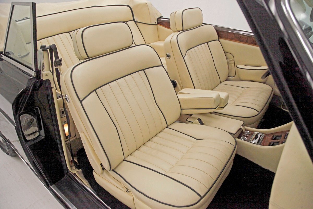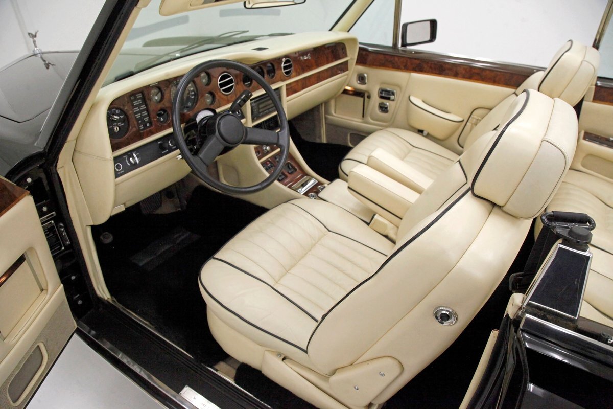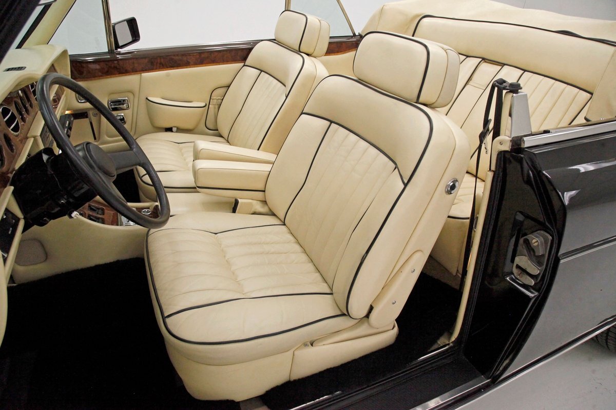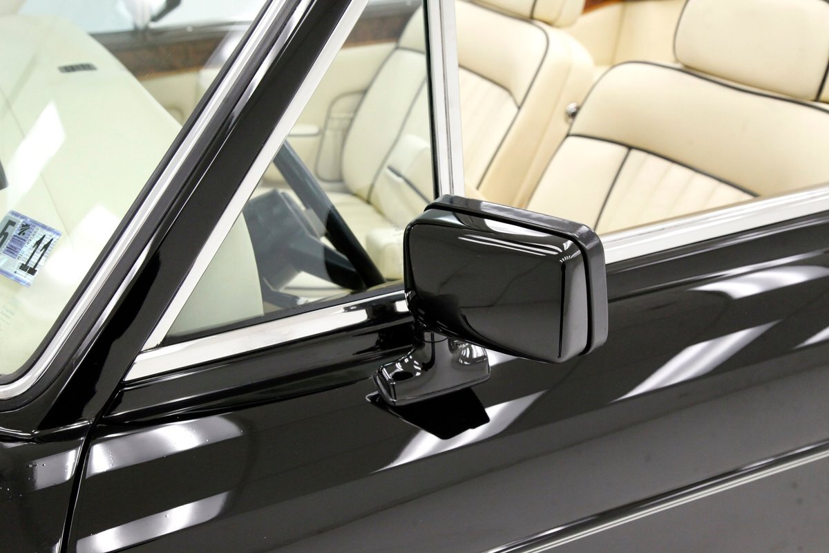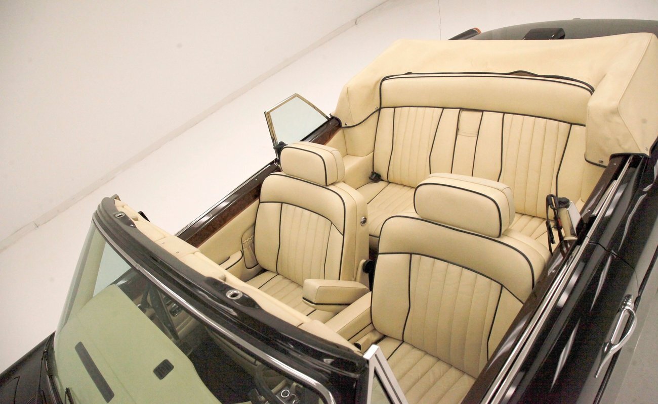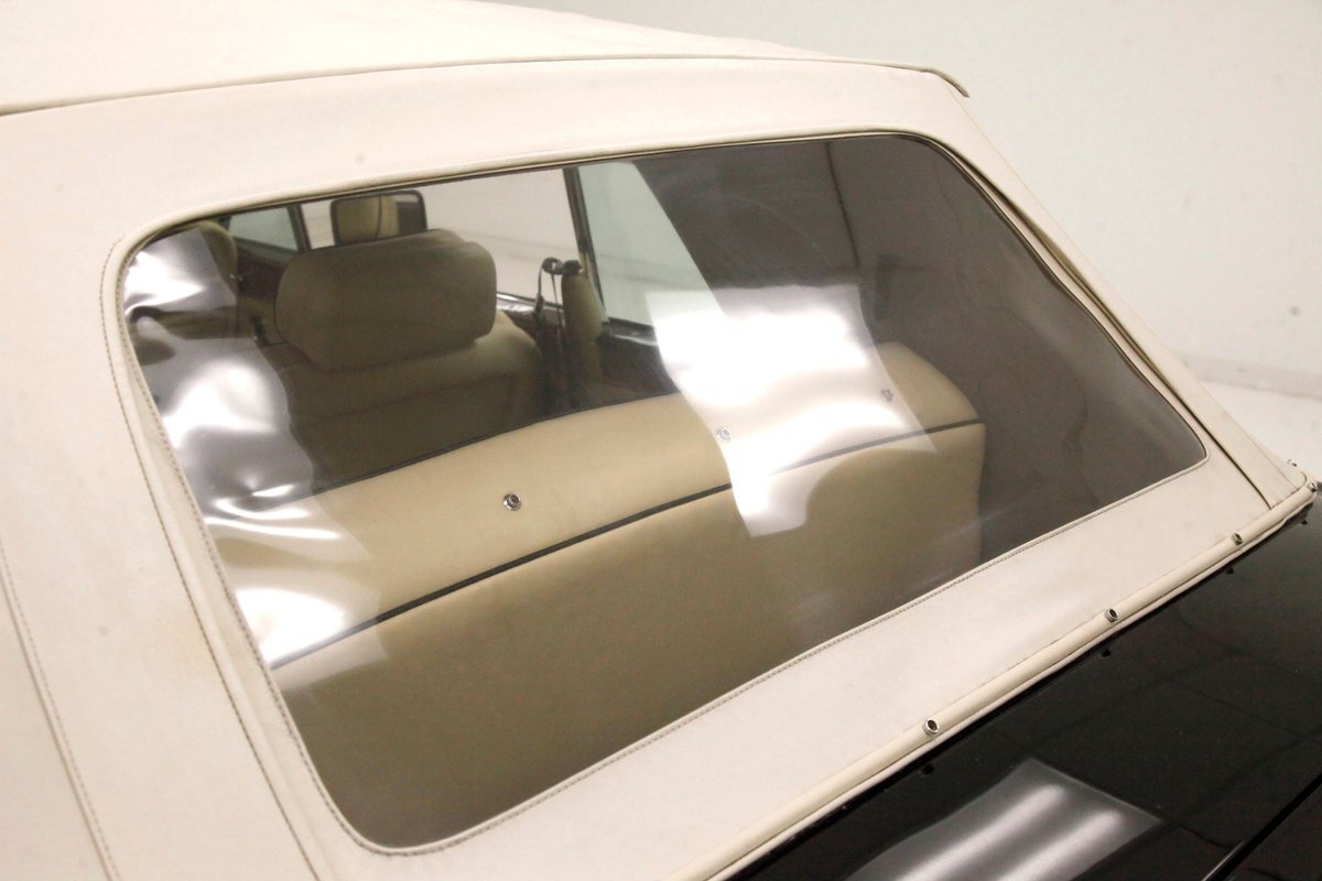 The Spirit of Ecstasy resides atop an iconic chromed radiator surround that is also the Rolls Royce look if you will, featuring a solid triangular top and vertical ribs making their way to the bumper. Dual round headlights with a shiny bezel behind both lights flank the grille, and rounded front quarters hem these into the front with their protuberant rounded front corners, topped by a turn signal light. Below a black bumper frames the bottom, and has a touch of chrome at the edge which serves as a visual landing strip for the grille in front and wraps around the quarters in black. A V shaped hood takes its lead from the shiny grille and works its way rearward to the window surround which is all in black with a shiny edge trimming in stainless steel. The lines are very straight, gaps are nicely minded, and on the edges of the wheel wells and the rockers, more shiny stainless steel trimming adds contrast to the black paint which is excellently applied. Also adding interest is a white thin dual stripe which follows the undulations of the body stampings from stem to stern. On the rear trunk deck in the center is the new for '86 3rd brake light, more badging, and on either corner, an MG-esque vertical tail light. Below, is another chrome tipped black bumper with dual exhaust peeking out the bottom. A new padded canvas convertible top in light bisque tan protects the precious cargo underneath in inclement weather, and moves up and down with ease electrically. A matching tonneau covering finishes off the hidden top when in the down position. Rolls Royce badged chromed wheel coverings are in the centers of 235/70R15's which are new from the 34th week of 2022.