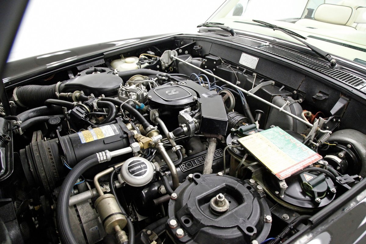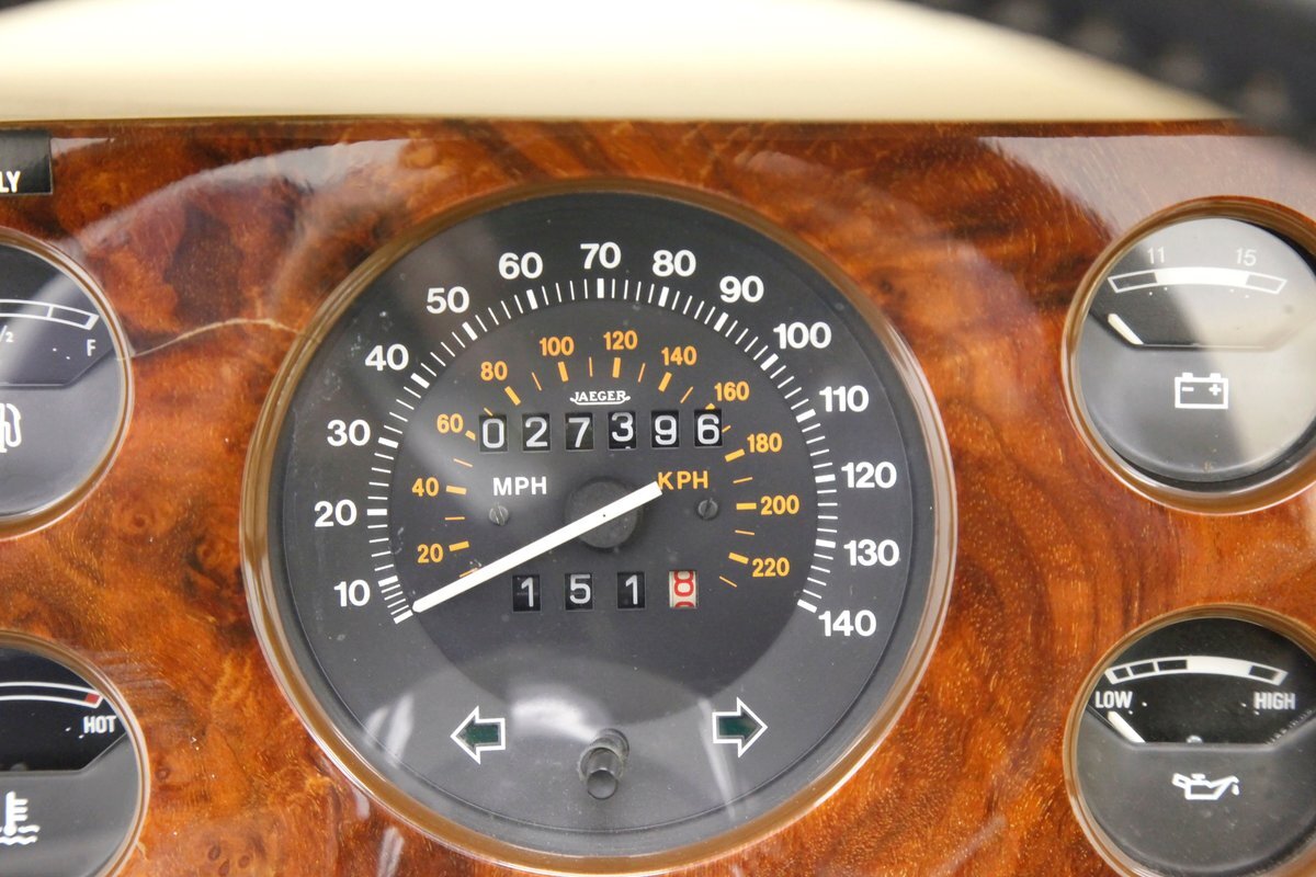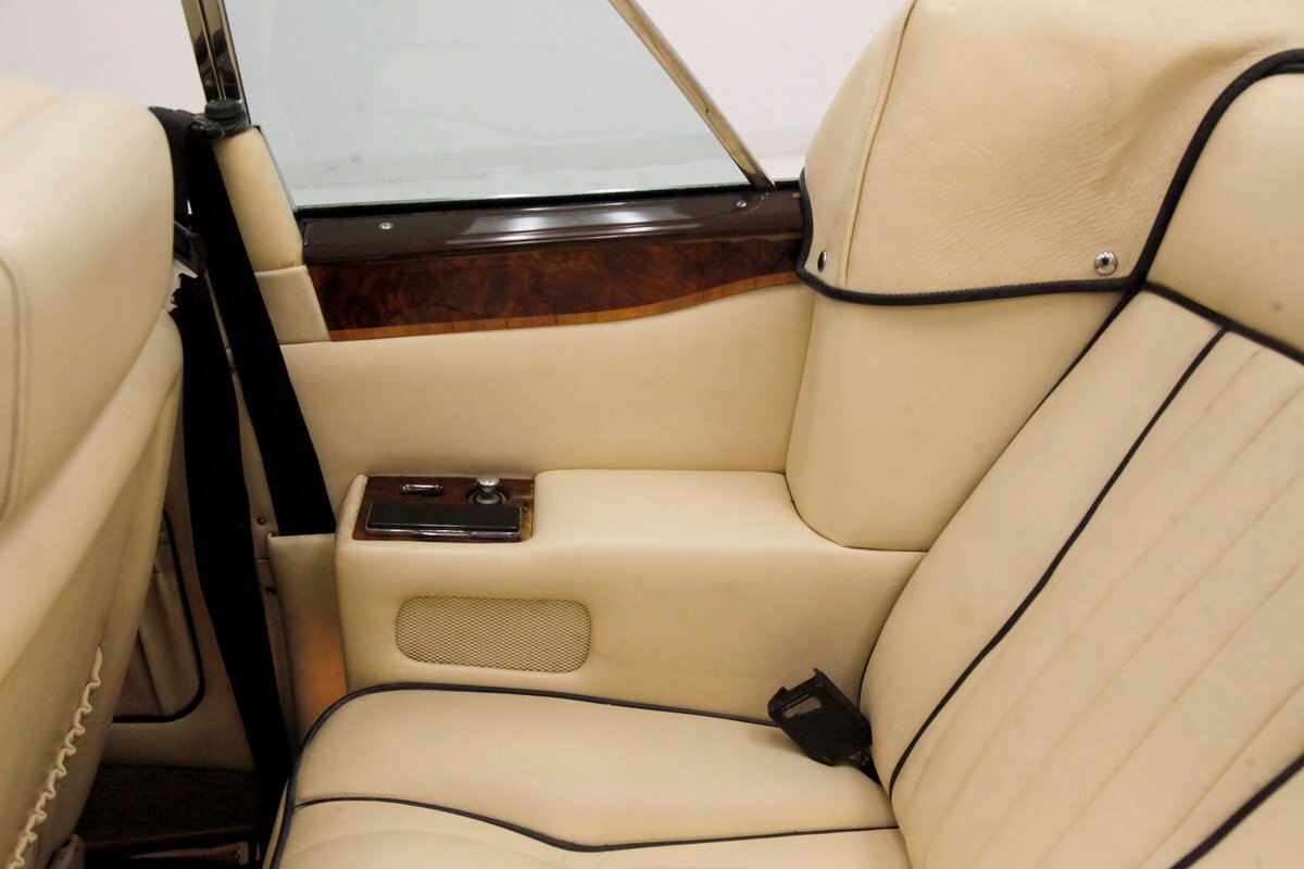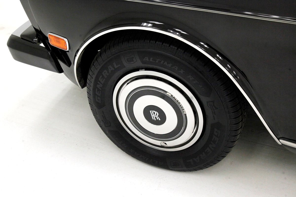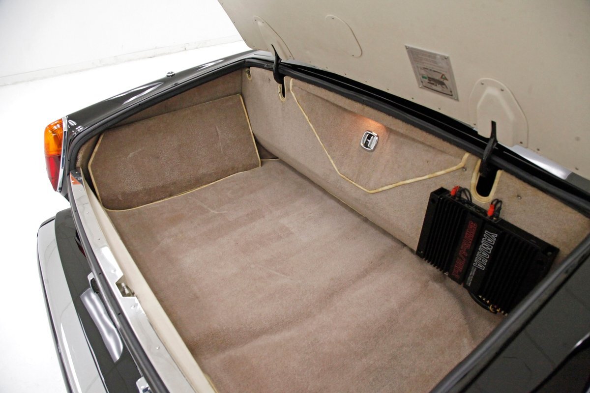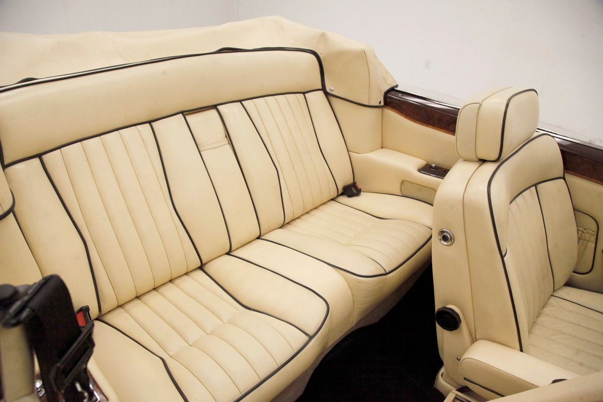 The Spirit of Ecstasy resides atop an iconic chromed radiator surround that is also the Rolls Royce look if you will, featuring a solid triangular top and vertical ribs making their way to the bumper. Dual round headlights with a shiny bezel behind both lights flank the grille, and rounded front quarters hem these into the front with their protuberant rounded front corners, topped by a turn signal light. Below a black bumper frames the bottom, and has a touch of chrome at the edge which serves as a visual landing strip for the grille in front and wraps around the quarters in black. A V shaped hood takes its lead from the shiny grille and works its way rearward to the window surround which is all in black with a shiny edge trimming in stainless steel. The lines are very straight, gaps are nicely minded, and on the edges of the wheel wells and the rockers, more shiny stainless steel trimming adds contrast to the black paint which is excellently applied. Also adding interest is a white thin dual stripe which follows the undulations of the body stampings from stem to stern. On the rear trunk deck in the center is the new for '86 3rd brake light, more badging, and on either corner, an MG-esque vertical tail light. Below, is another chrome tipped black bumper with dual exhaust peeking out the bottom. A new padded canvas convertible top in light bisque tan protects the precious cargo underneath in inclement weather, and moves up and down with ease electrically. A matching tonneau covering finishes off the hidden top when in the down position. Rolls Royce badged chromed wheel coverings are in the centers of 235/70R15's which are new from the 34th week of 2022.