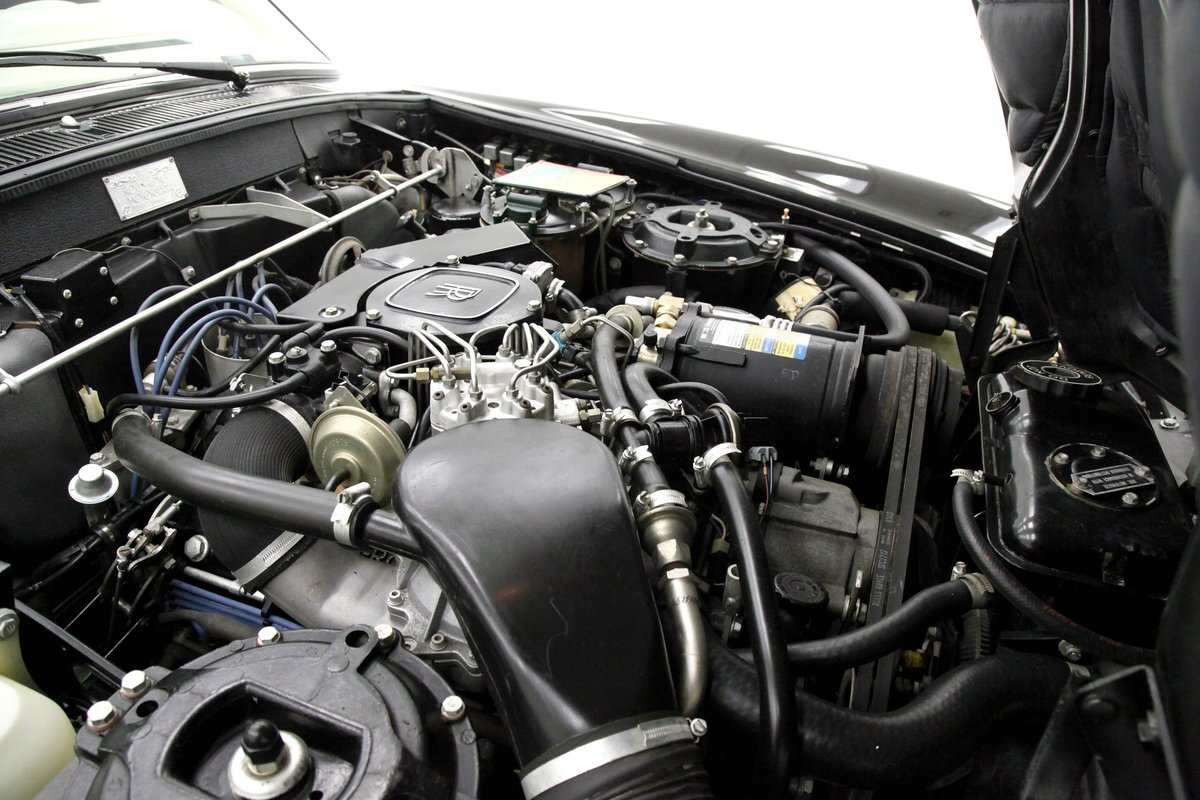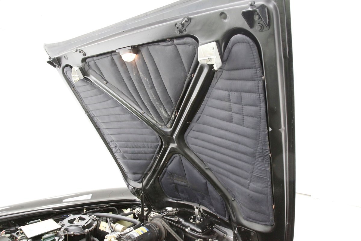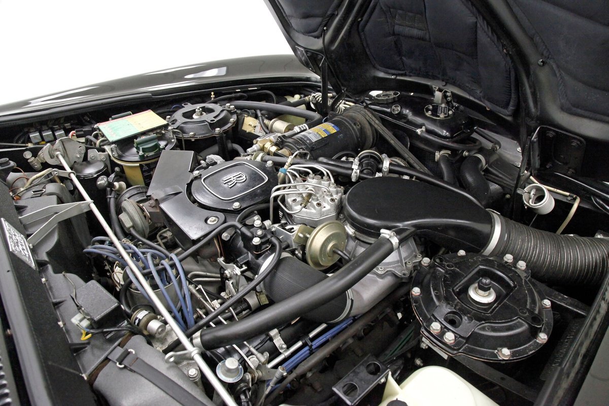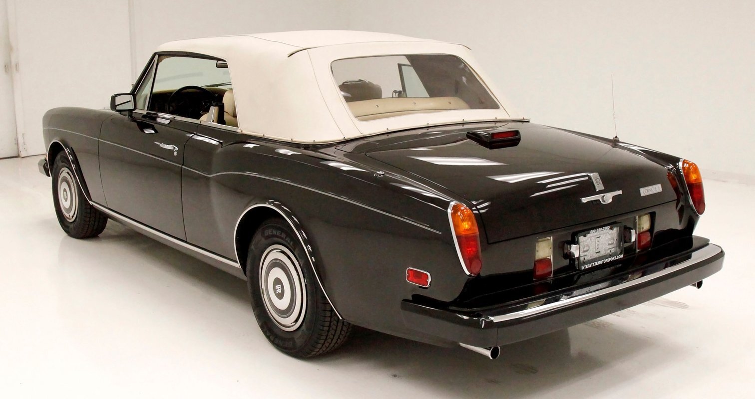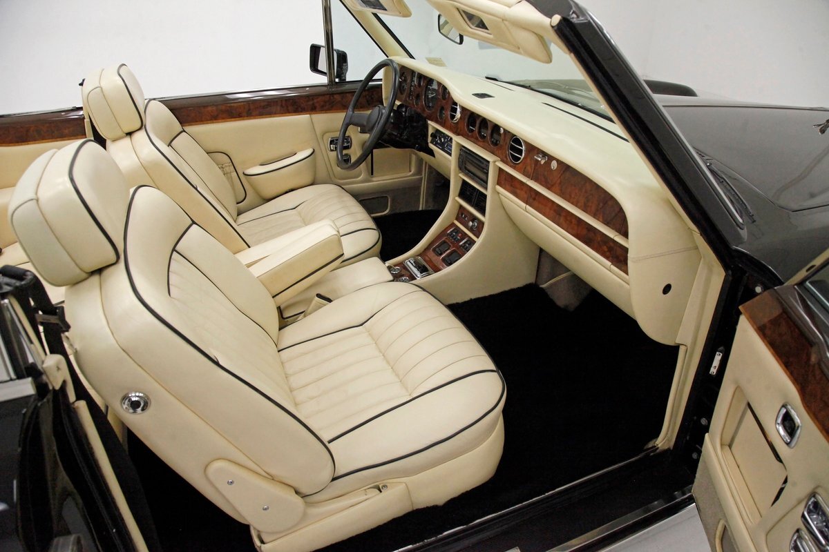 The Spirit of Ecstasy resides atop an iconic chromed radiator surround that is also the Rolls Royce look if you will, featuring a solid triangular top and vertical ribs making their way to the bumper. Dual round headlights with a shiny bezel behind both lights flank the grille, and rounded front quarters hem these into the front with their protuberant rounded front corners, topped by a turn signal light. Below a black bumper frames the bottom, and has a touch of chrome at the edge which serves as a visual landing strip for the grille in front and wraps around the quarters in black. A V shaped hood takes its lead from the shiny grille and works its way rearward to the window surround which is all in black with a shiny edge trimming in stainless steel. The lines are very straight, gaps are nicely minded, and on the edges of the wheel wells and the rockers, more shiny stainless steel trimming adds contrast to the black paint which is excellently applied. Also adding interest is a white thin dual stripe which follows the undulations of the body stampings from stem to stern. On the rear trunk deck in the center is the new for '86 3rd brake light, more badging, and on either corner, an MG-esque vertical tail light. Below, is another chrome tipped black bumper with dual exhaust peeking out the bottom. A new padded canvas convertible top in light bisque tan protects the precious cargo underneath in inclement weather, and moves up and down with ease electrically. A matching tonneau covering finishes off the hidden top when in the down position. Rolls Royce badged chromed wheel coverings are in the centers of 235/70R15's which are new from the 34th week of 2022.