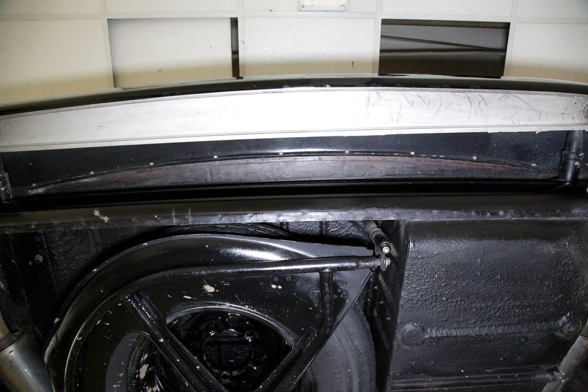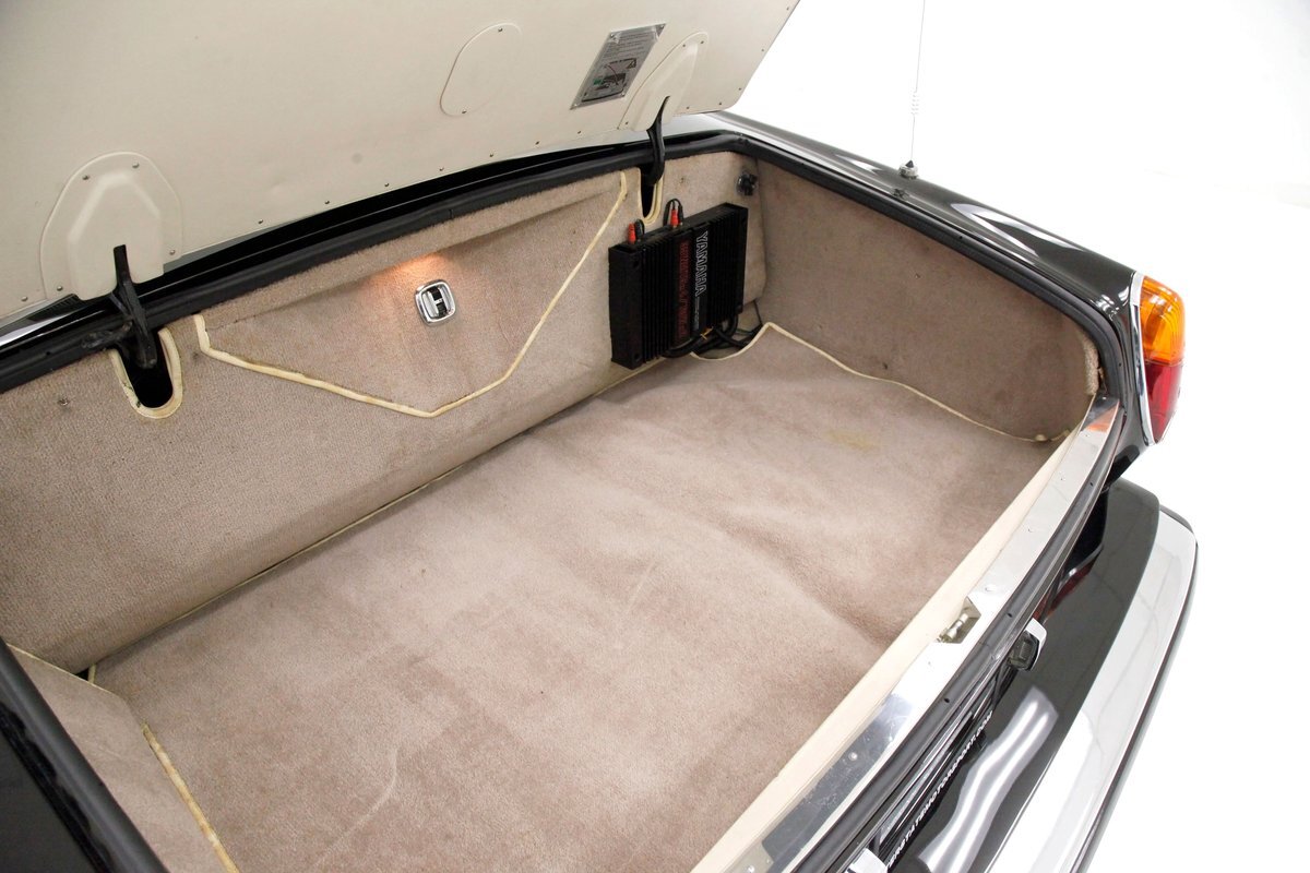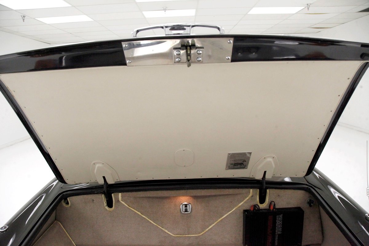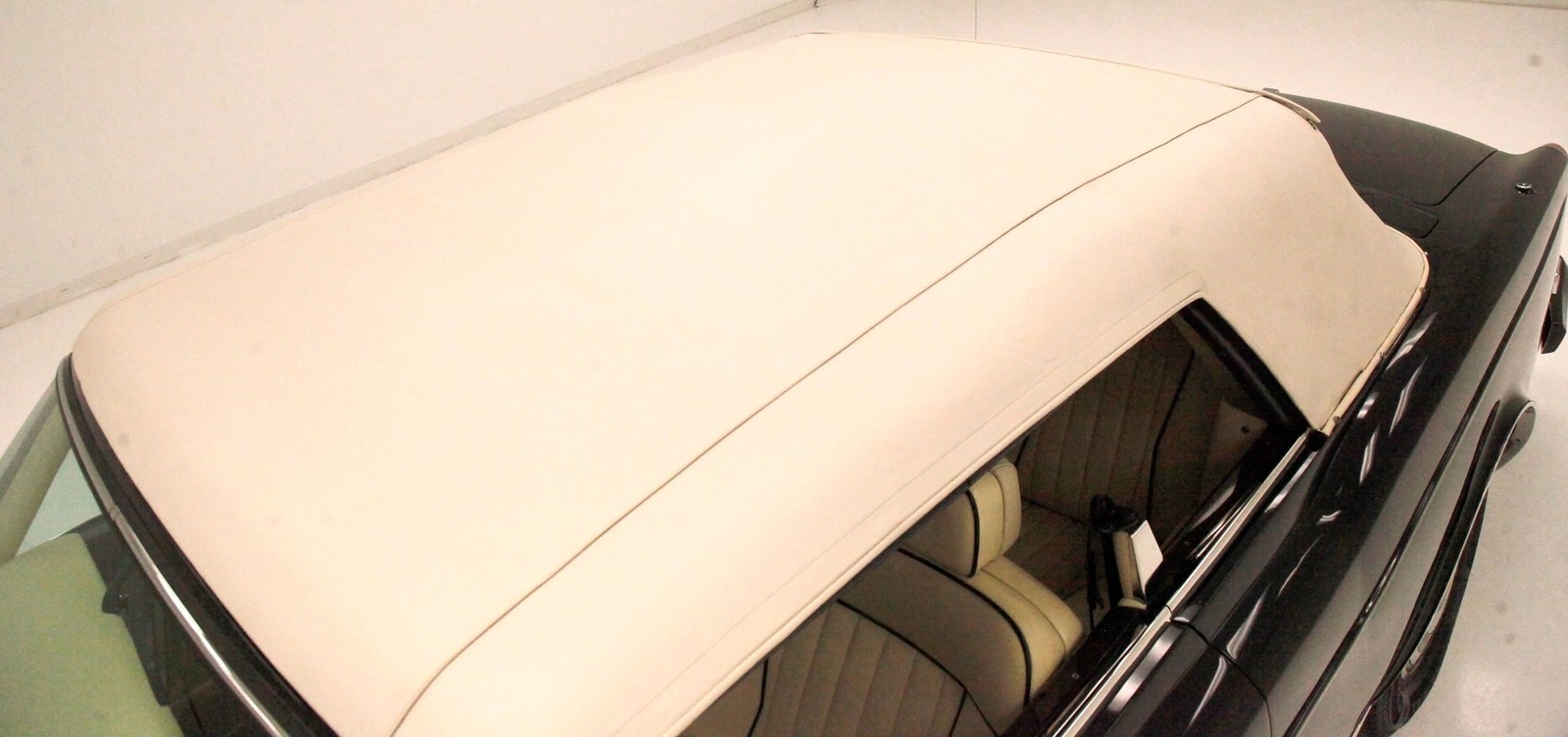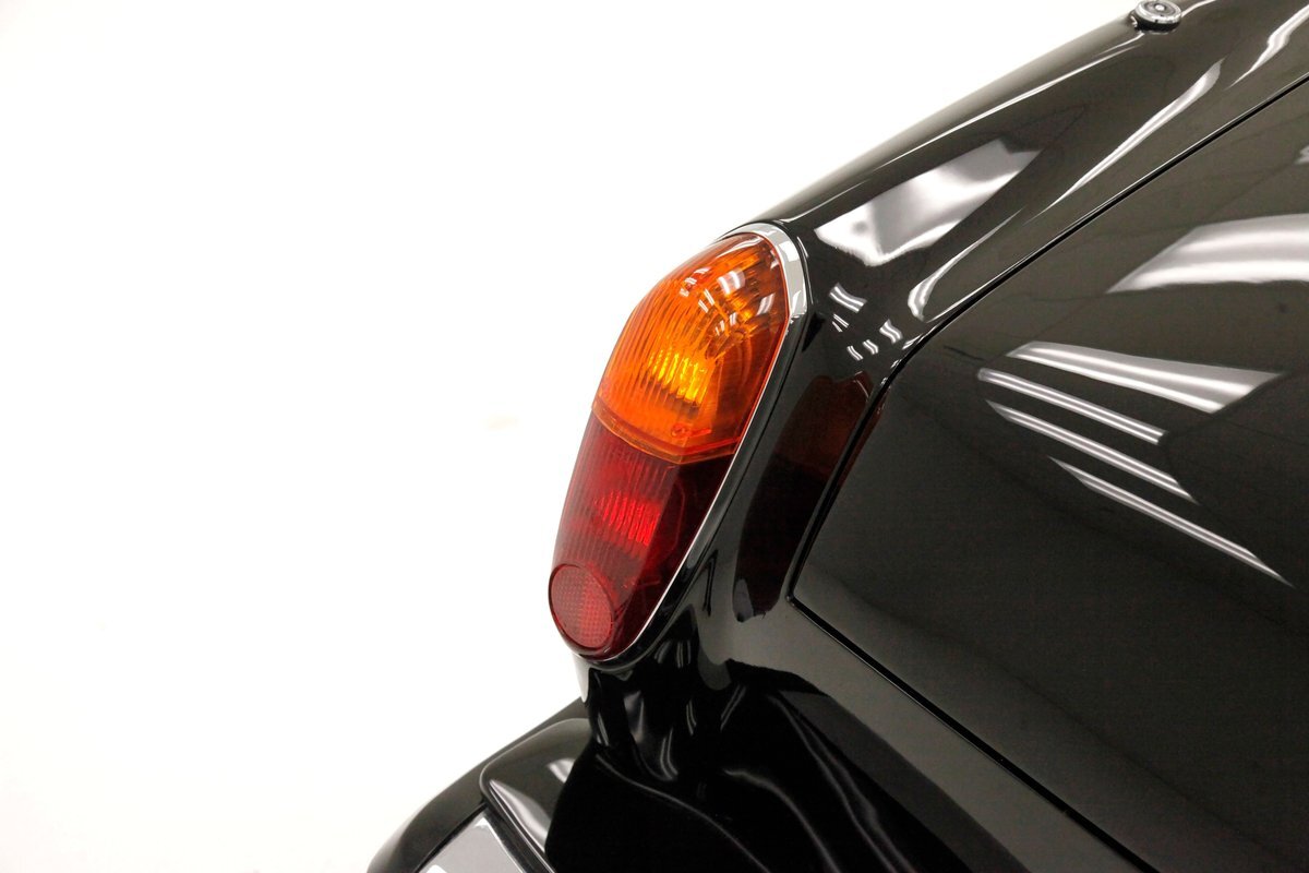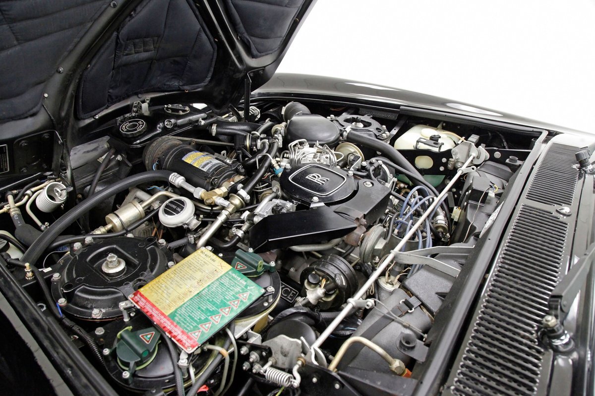The Spirit of Ecstasy resides atop an iconic chromed radiator surround that is also the Rolls Royce look if you will, featuring a solid triangular top and vertical ribs making their way to the bumper. Dual round headlights with a shiny bezel behind both lights flank the grille, and rounded front quarters hem these into the front with their protuberant rounded front corners, topped by a turn signal light. Below a black bumper frames the bottom, and has a touch of chrome at the edge which serves as a visual landing strip for the grille in front and wraps around the quarters in black. A V shaped hood takes its lead from the shiny grille and works its way rearward to the window surround which is all in black with a shiny edge trimming in stainless steel. The lines are very straight, gaps are nicely minded, and on the edges of the wheel wells and the rockers, more shiny stainless steel trimming adds contrast to the black paint which is excellently applied. Also adding interest is a white thin dual stripe which follows the undulations of the body stampings from stem to stern. On the rear trunk deck in the center is the new for '86 3rd brake light, more badging, and on either corner, an MG-esque vertical tail light. Below, is another chrome tipped black bumper with dual exhaust peeking out the bottom. A new padded canvas convertible top in light bisque tan protects the precious cargo underneath in inclement weather, and moves up and down with ease electrically. A matching tonneau covering finishes off the hidden top when in the down position. Rolls Royce badged chromed wheel coverings are in the centers of 235/70R15's which are new from the 34th week of 2022.