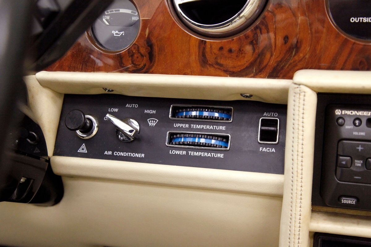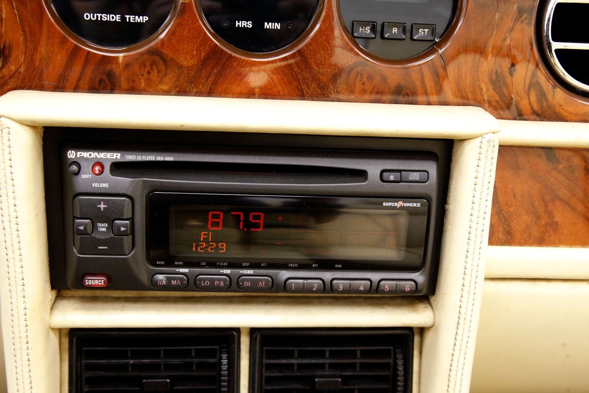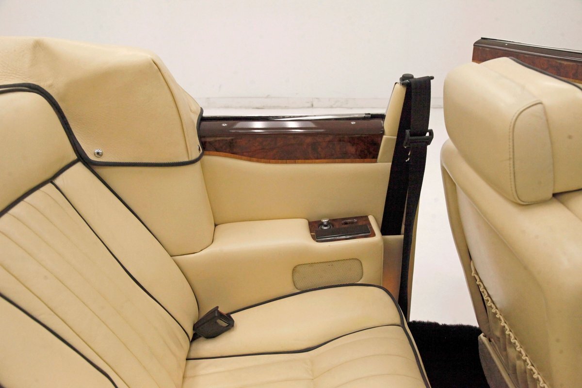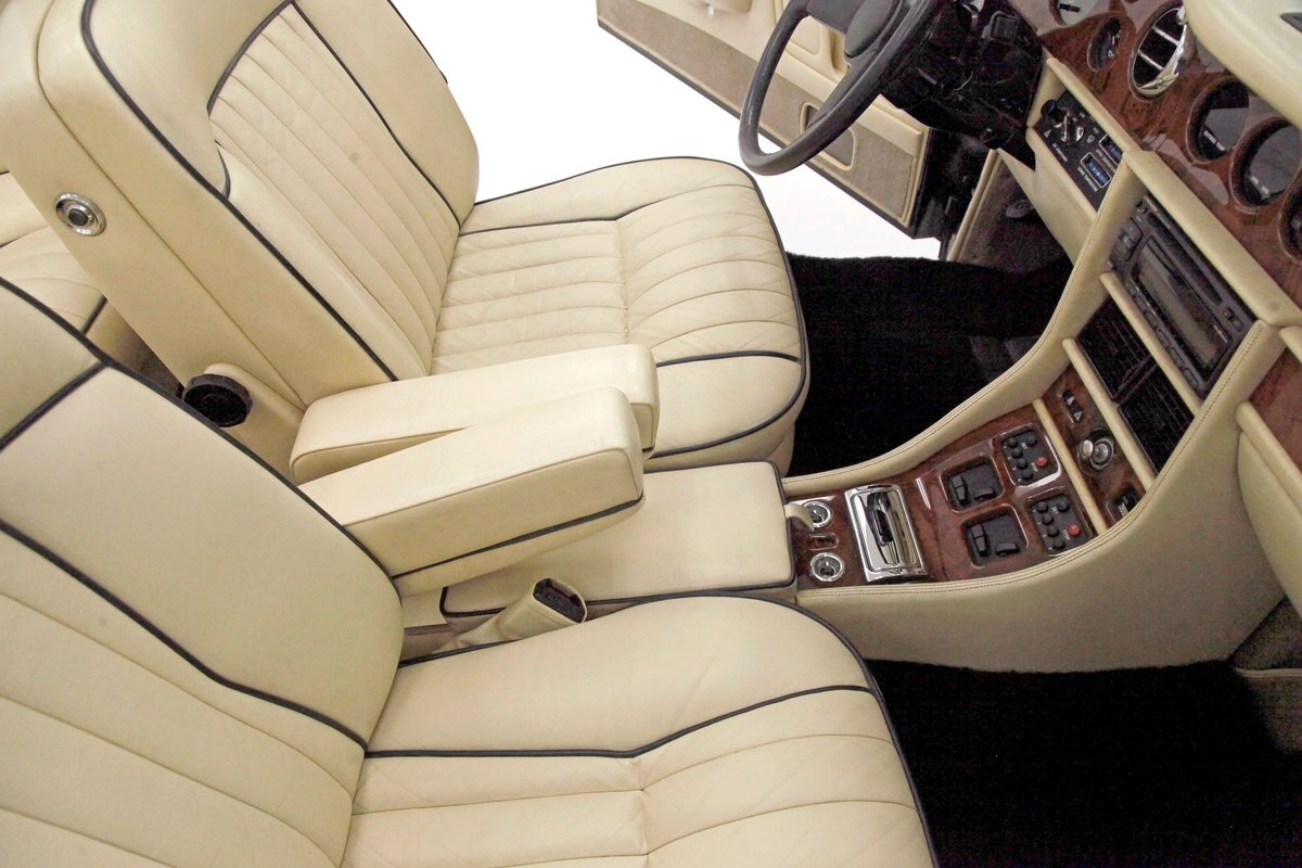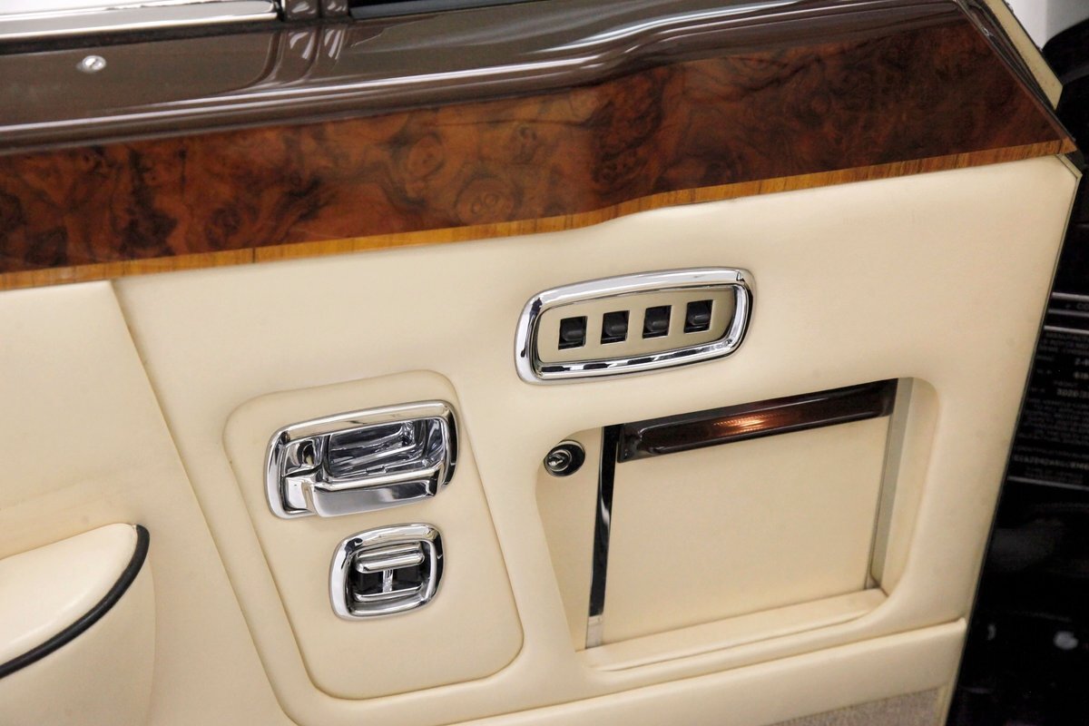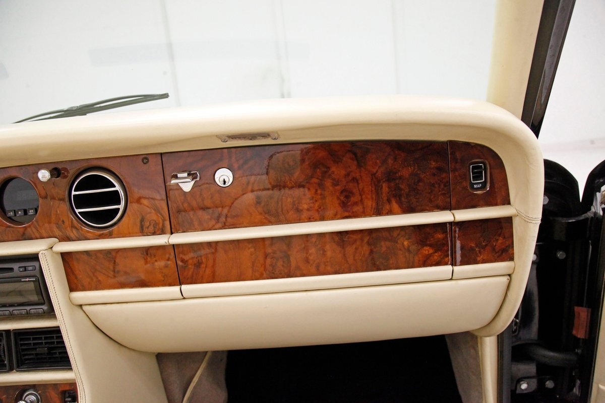 Creating a beautiful and comfortable interior environment we see plenty of leather, padded, tufted tucked and rolled and piped, and accented with English walnut lacquered burl. The doors are mostly ivory with black piping on the edges and plenty of convenience options embedded within the ivory surround and made of chrome. This follows through to the dash which utilizes plenty of the walnut burl, and padded ivory. The instruments are ergonomically arranged and easy to read, all in blackface with white lettering. Overstuffed buckets are expertly stitched with tuck and roll inserts and smooth bolsters and black piping. The rear bench affords plenty of room and of the same high end materials as the front buckets so no expense spared here. Some blue digital readouts are seen along with preset and memory set seat adjustments, upper and lower climate control dials, and a Pioneer AM/FM/CD digital radio. Also within the doors is a liquor service with a factory decanter and crystal cut glasses, which are behind a sliding "hidden" door. A shout to the trunk which has wonderful Wilton wool tan carpeting and is even padded on the underside of the lid. Black Wilton wool carpeting is covering the floors. All first class finishes in clean condition here.