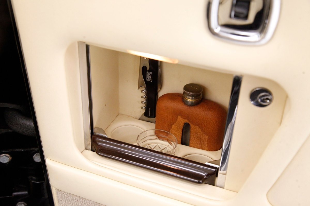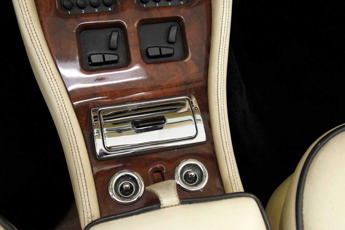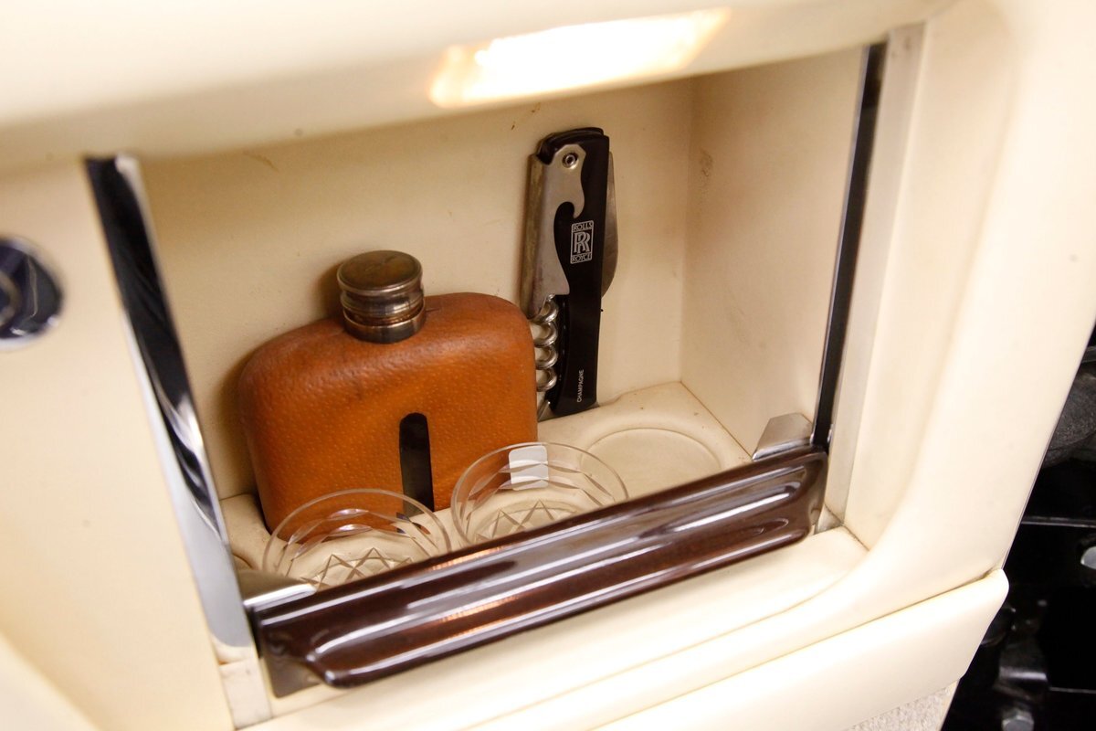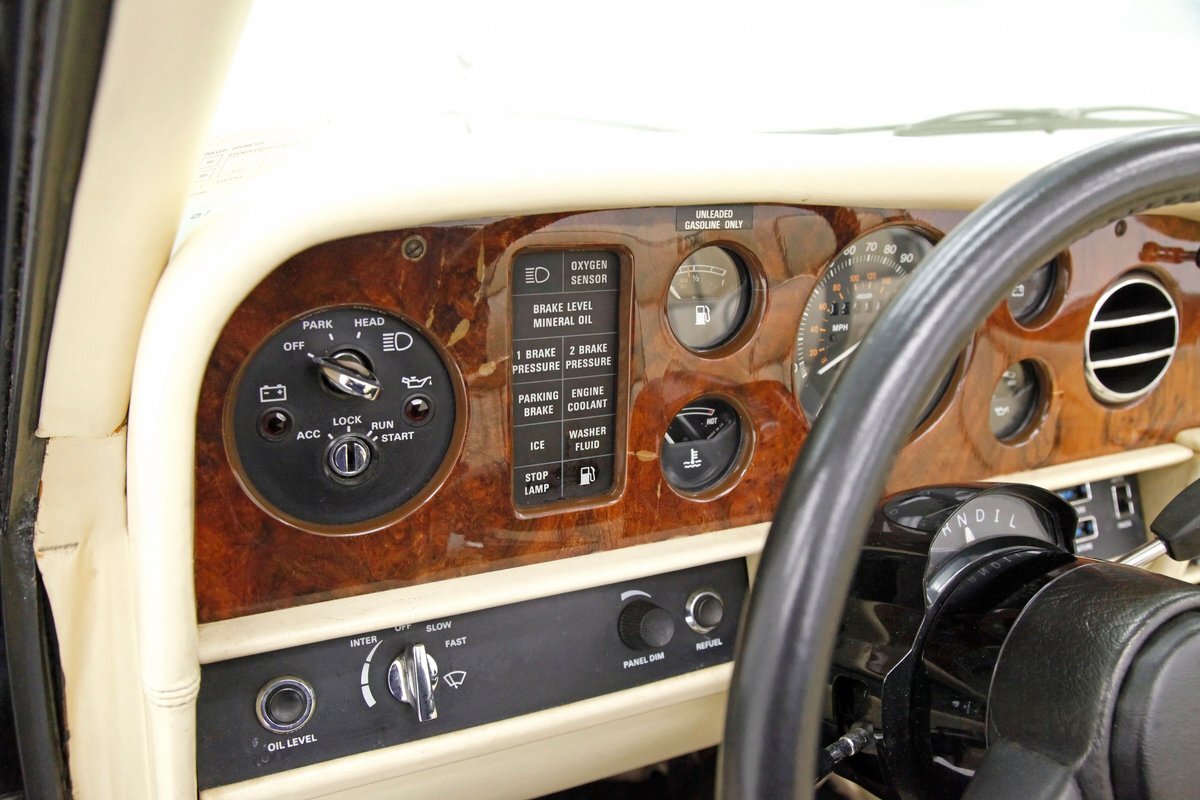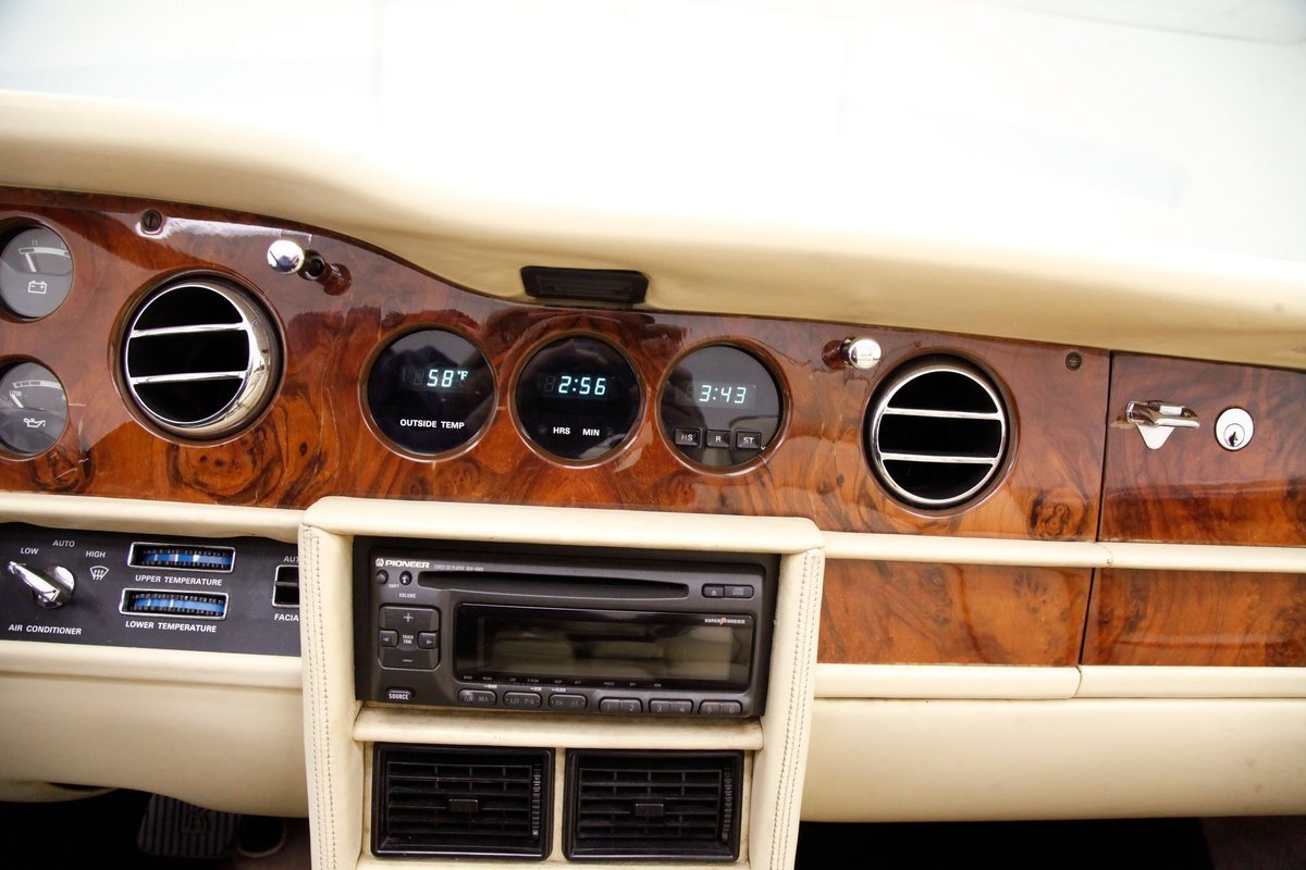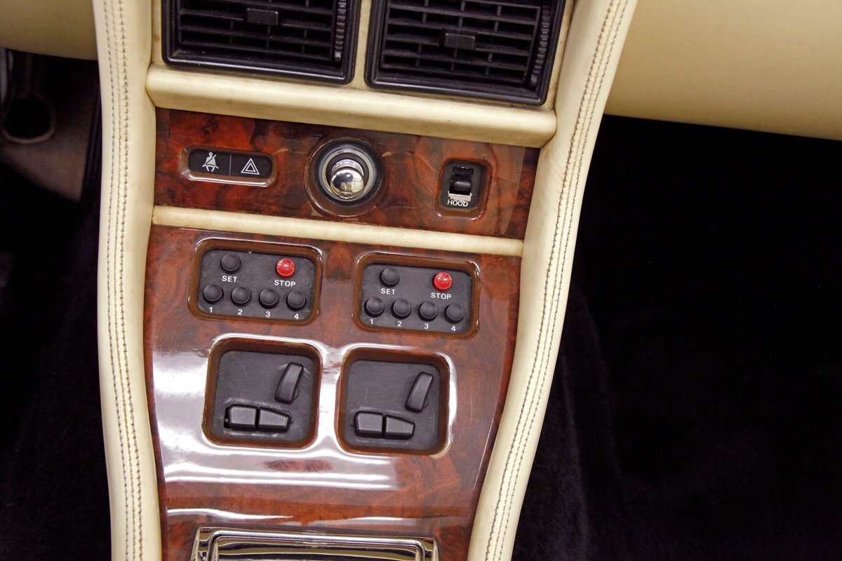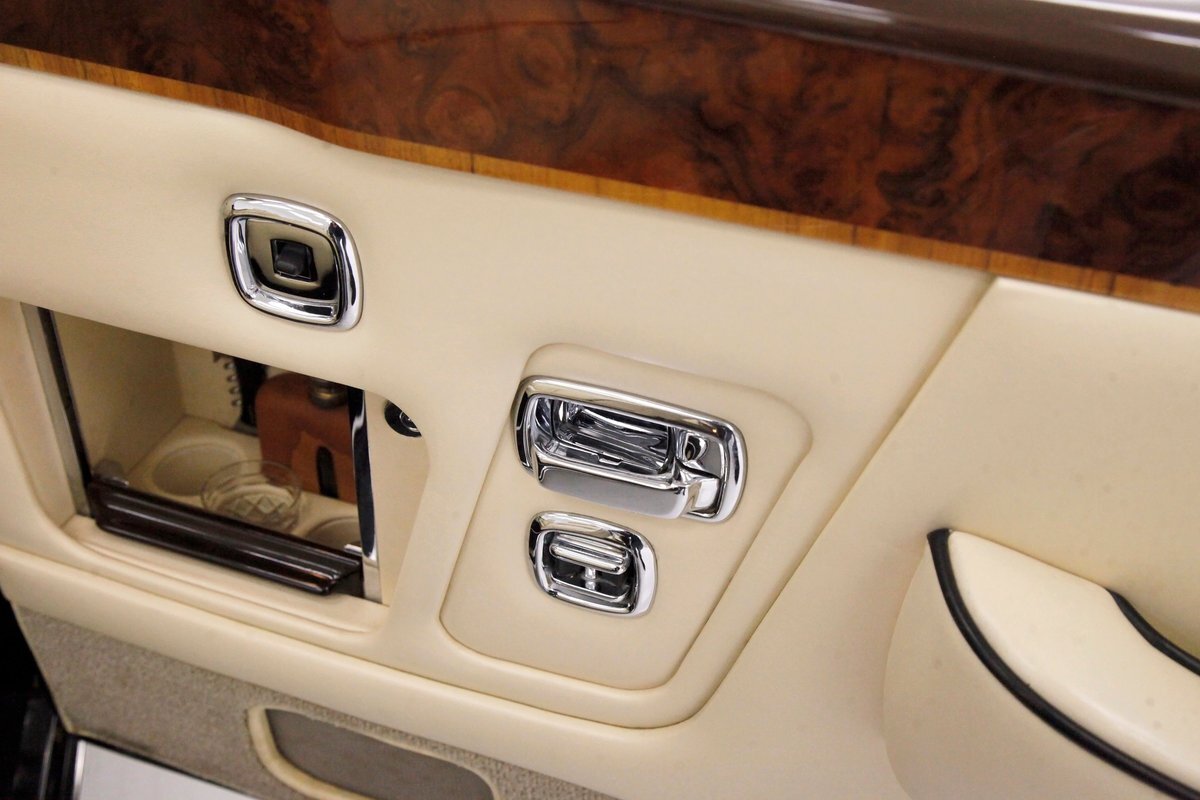Creating a beautiful and comfortable interior environment we see plenty of leather, padded, tufted tucked and rolled and piped, and accented with English walnut lacquered burl. The doors are mostly ivory with black piping on the edges and plenty of convenience options embedded within the ivory surround and made of chrome. This follows through to the dash which utilizes plenty of the walnut burl, and padded ivory. The instruments are ergonomically arranged and easy to read, all in blackface with white lettering. Overstuffed buckets are expertly stitched with tuck and roll inserts and smooth bolsters and black piping. The rear bench affords plenty of room and of the same high end materials as the front buckets so no expense spared here. Some blue digital readouts are seen along with preset and memory set seat adjustments, upper and lower climate control dials, and a Pioneer AM/FM/CD digital radio. Also within the doors is a liquor service with a factory decanter and crystal cut glasses, which are behind a sliding "hidden" door. A shout to the trunk which has wonderful Wilton wool tan carpeting and is even padded on the underside of the lid. Black Wilton wool carpeting is covering the floors. All first class finishes in clean condition here.