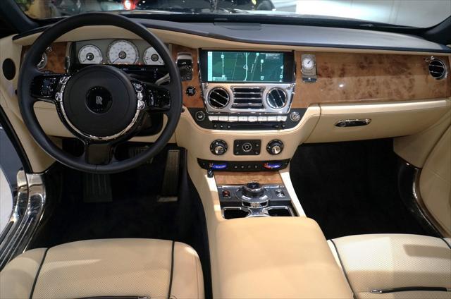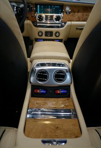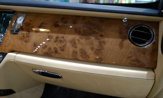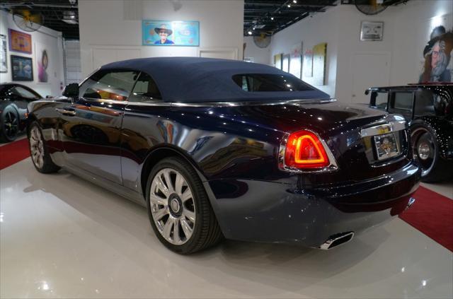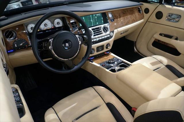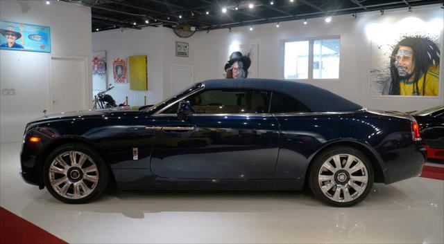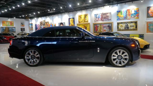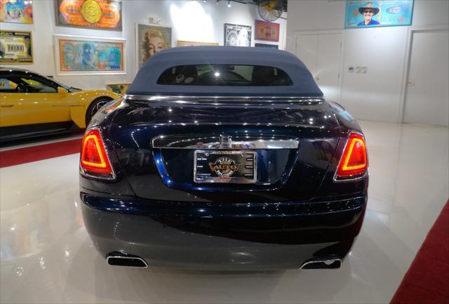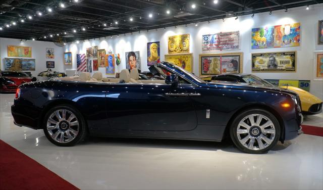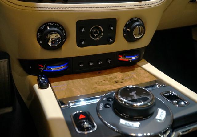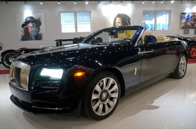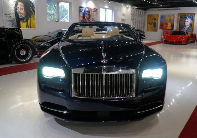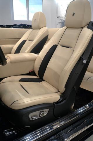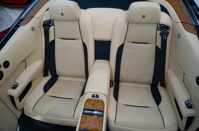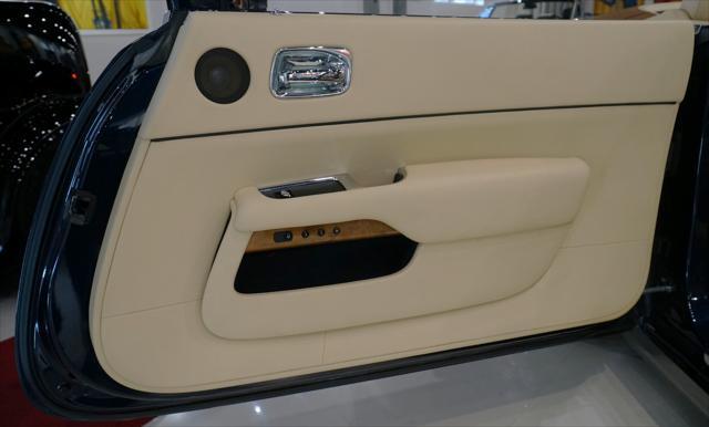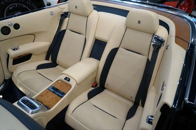 The stunning wood trim that wraps around the entirety of the cabin (as well as the cover that hides the retracted soft top) is also used straight down the center so the detailing in each half of the cabin is perfectly mirrored on the other side. The butter-soft leather seating surfaces and rich lambswool floormats are magnificent. Standard features highlights for the 2016 Rolls-Royce Dawn include 20-inch wheels front and rear parking sensors adaptive LED headlights a self-adjusting air suspension keyless ignition and entry power-closing rear-hinged ""coach"" doors auto-dimming mirrors automatic wipers a power tilt-and-telescoping steering wheel cruise control with upcoming curve detection leather upholstery and trim wood accents eight-way power-adjustable front seats with heating and four-way power lumbar adjustment and driver-seat memory settings a surround- view camera system four-zone automatic climate control Bluetooth connectivity a 10.3-inch center display screen a navigation system voice controls concierge services and an 18-speaker sound system with a CD/DVD player satellite and HD radio digital music storage an auxiliary audio jack and a USB port.