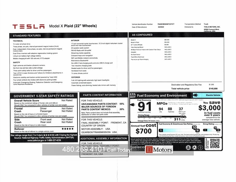 101 Motors is proud to present this stunning 2022 Tesla Model X Plaid finished in Pearl White wrapped in Kavaca Matte paint protection film. This tri-motor AWD electric SUV makes over 1,000 horsepower and is capable of launching to 60 MPH in just 2.5 seconds while earning an EPA estimated 311 miles of range on a full charge. This Model X features Full Self-Driving, 22 inch Turbine wheels, premium interior with carbon fiber decor, six seat interior and more. You don’t want to miss this incredible opportunity, call today!!