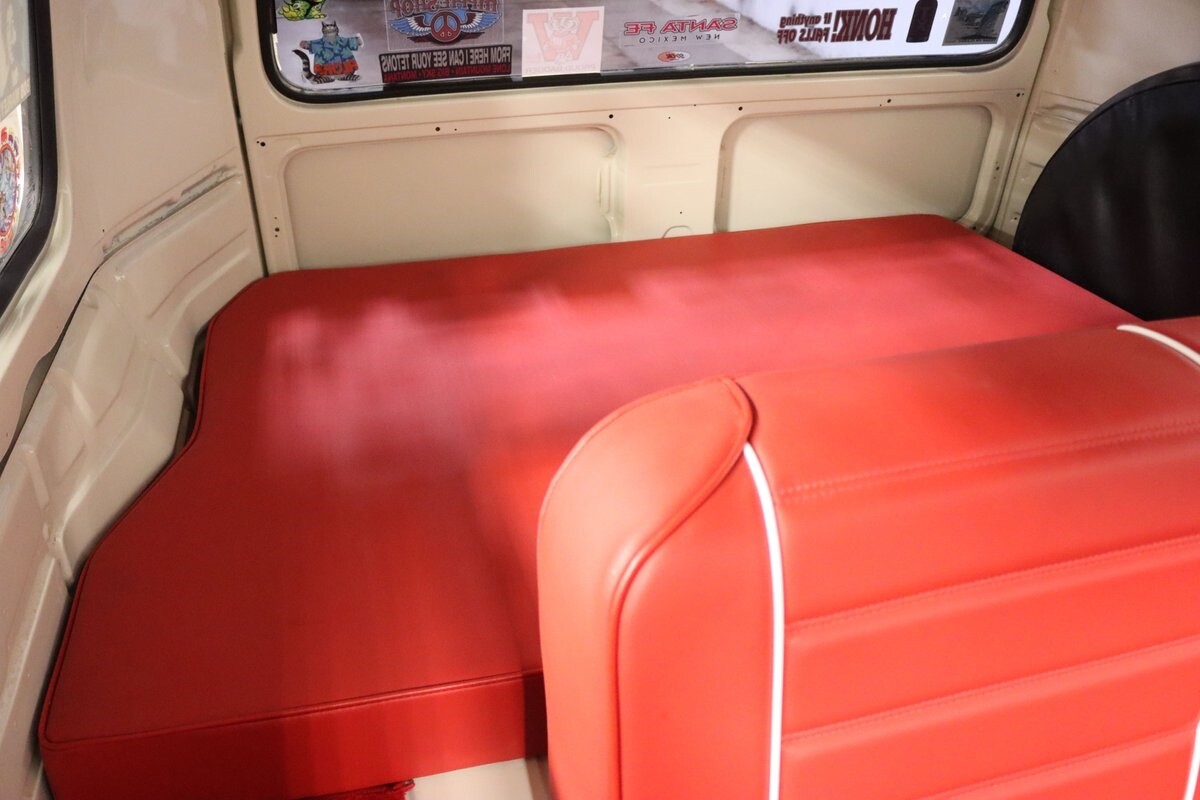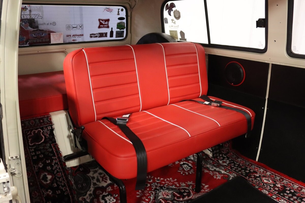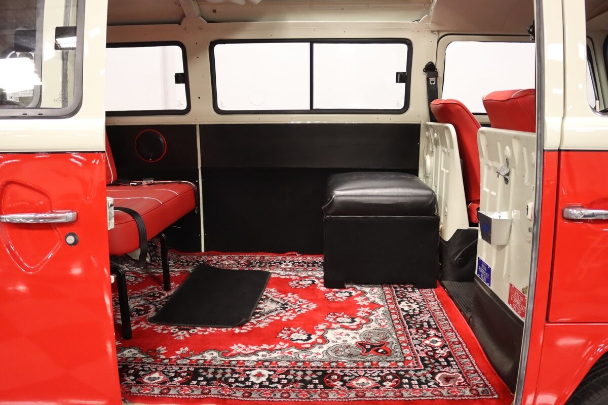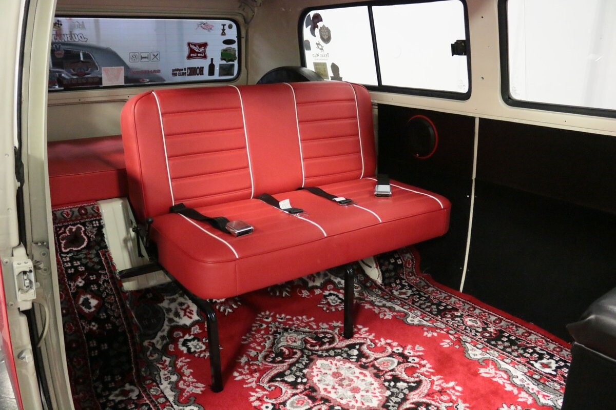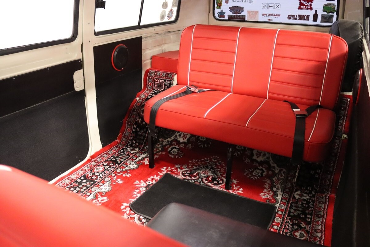 The interior is really where these vehicles shine. Totally restored, it offers durable materials and basic accommodations for passengers, but the style is timeless. Red vinyl upholstery with white piping is a wonderful complement to the red and white exterior and the updated vinyl will last practically forever. Handsome side panels and door panels give it a very finished look and the original-style headliner overhead keeps it bright and clean. Plush black carpets are up front, and a Persian-style rug was laid down in front of the rear bench seat, which as awesome touch that we think really ties the whole bus together, Big Lebowski style. But that's just like our opinion, man. The front seats offer a commanding view of the road completely free of obstructions, and the school bus-like driving position is actually comfortable for long trips, which is really what these buses were designed to do, providing a commanding driver's seat offers a panoramic view out the massive windshield. Basic instrumentation was provided by the factory, and it deviates from the Beetle by using three round pods that may just have been influenced by another air-cooled, rear-engined people transporter from VW. You'll also be pleased to see that even the stereo looks correct, because the builder picked a modern retro-style AM/FM/AUX unit that fits in the dash, with USB connectivity through a capable under the dash. And in addition to the seats, there's a reasonably large and nicely upholstered package shelf mattress-pad atop the engine bay in back, so this bus is camp-ground ready.