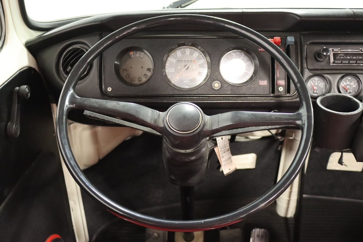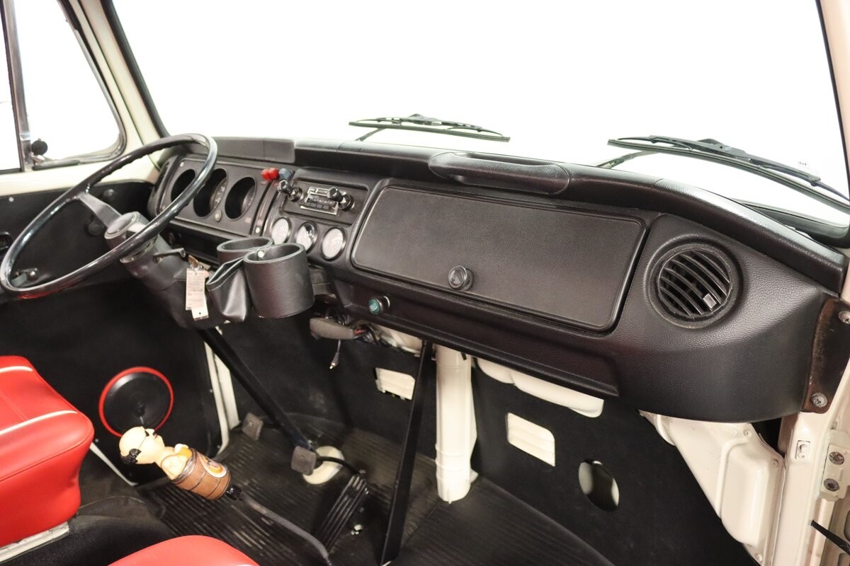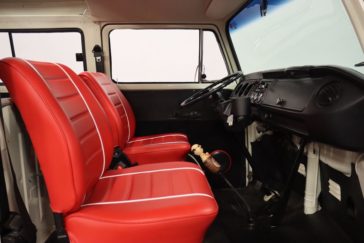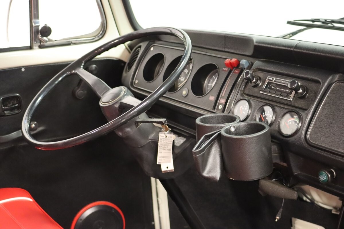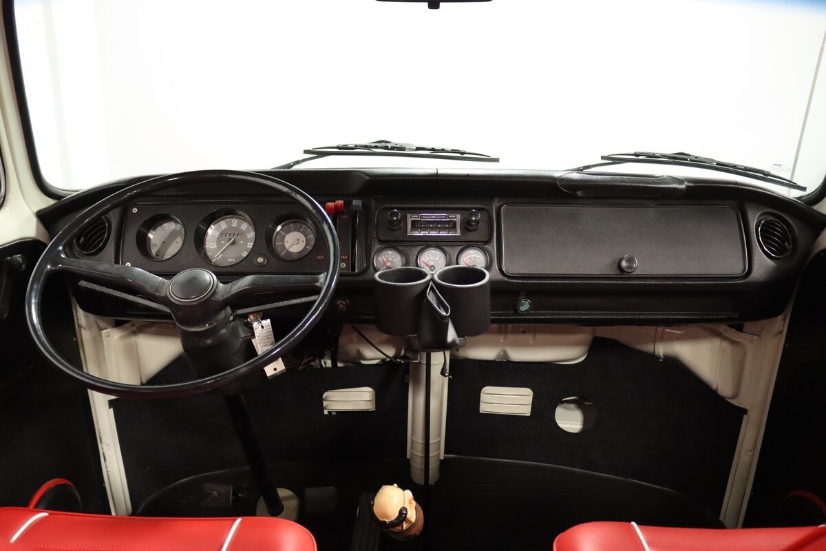 The interior is really where these vehicles shine. Totally restored, it offers durable materials and basic accommodations for passengers, but the style is timeless. Red vinyl upholstery with white piping is a wonderful complement to the red and white exterior and the updated vinyl will last practically forever. Handsome side panels and door panels give it a very finished look and the original-style headliner overhead keeps it bright and clean. Plush black carpets are up front, and a Persian-style rug was laid down in front of the rear bench seat, which as awesome touch that we think really ties the whole bus together, Big Lebowski style. But that's just like our opinion, man. The front seats offer a commanding view of the road completely free of obstructions, and the school bus-like driving position is actually comfortable for long trips, which is really what these buses were designed to do, providing a commanding driver's seat offers a panoramic view out the massive windshield. Basic instrumentation was provided by the factory, and it deviates from the Beetle by using three round pods that may just have been influenced by another air-cooled, rear-engined people transporter from VW. You'll also be pleased to see that even the stereo looks correct, because the builder picked a modern retro-style AM/FM/AUX unit that fits in the dash, with USB connectivity through a capable under the dash. And in addition to the seats, there's a reasonably large and nicely upholstered package shelf mattress-pad atop the engine bay in back, so this bus is camp-ground ready.