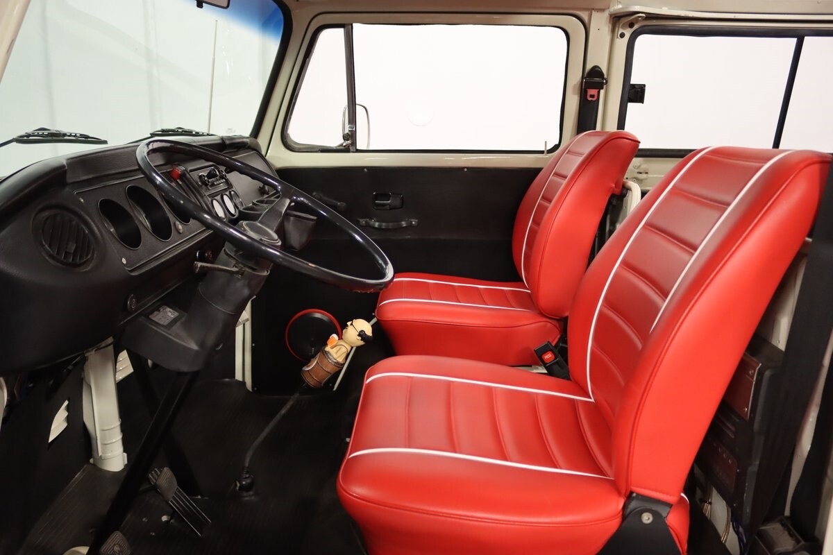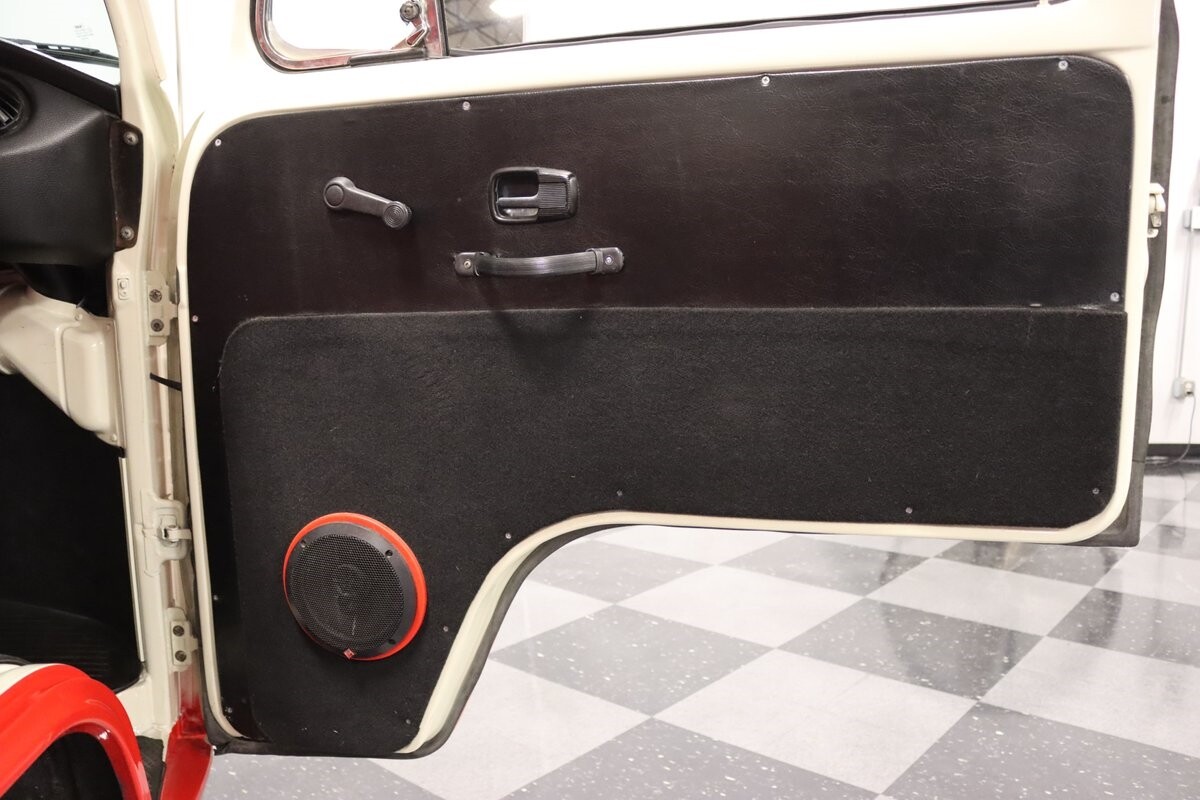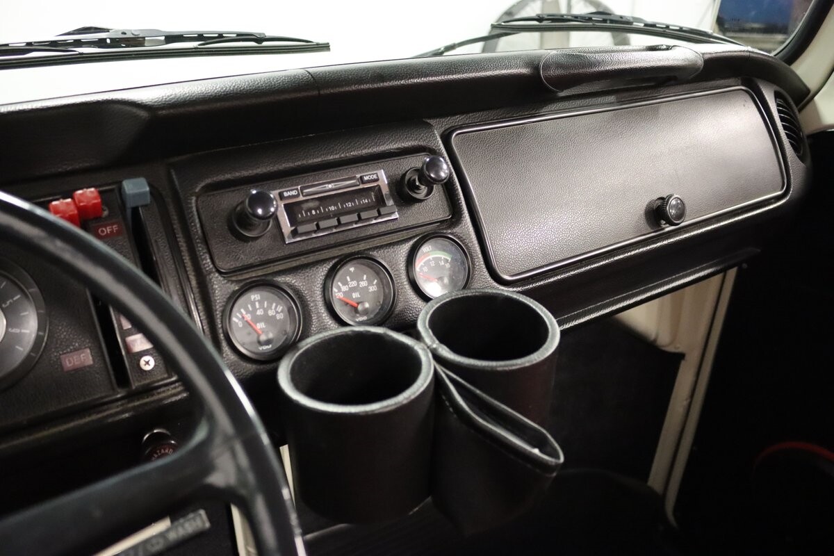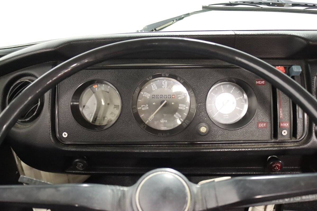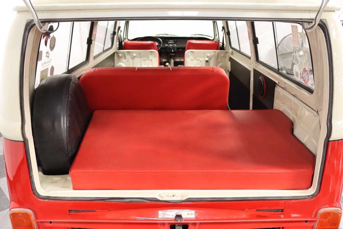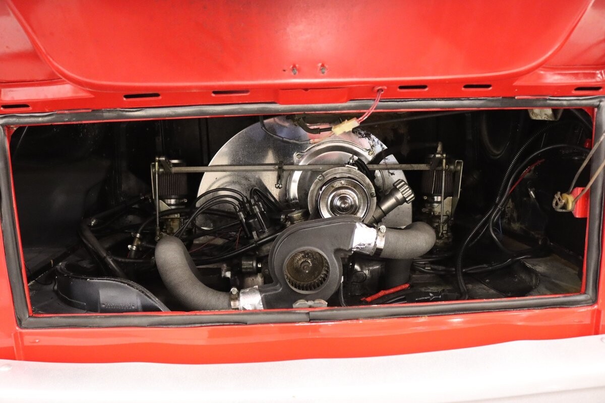 The interior is really where these vehicles shine. Totally restored, it offers durable materials and basic accommodations for passengers, but the style is timeless. Red vinyl upholstery with white piping is a wonderful complement to the red and white exterior and the updated vinyl will last practically forever. Handsome side panels and door panels give it a very finished look and the original-style headliner overhead keeps it bright and clean. Plush black carpets are up front, and a Persian-style rug was laid down in front of the rear bench seat, which as awesome touch that we think really ties the whole bus together, Big Lebowski style. But that's just like our opinion, man. The front seats offer a commanding view of the road completely free of obstructions, and the school bus-like driving position is actually comfortable for long trips, which is really what these buses were designed to do, providing a commanding driver's seat offers a panoramic view out the massive windshield. Basic instrumentation was provided by the factory, and it deviates from the Beetle by using three round pods that may just have been influenced by another air-cooled, rear-engined people transporter from VW. You'll also be pleased to see that even the stereo looks correct, because the builder picked a modern retro-style AM/FM/AUX unit that fits in the dash, with USB connectivity through a capable under the dash. And in addition to the seats, there's a reasonably large and nicely upholstered package shelf mattress-pad atop the engine bay in back, so this bus is camp-ground ready.