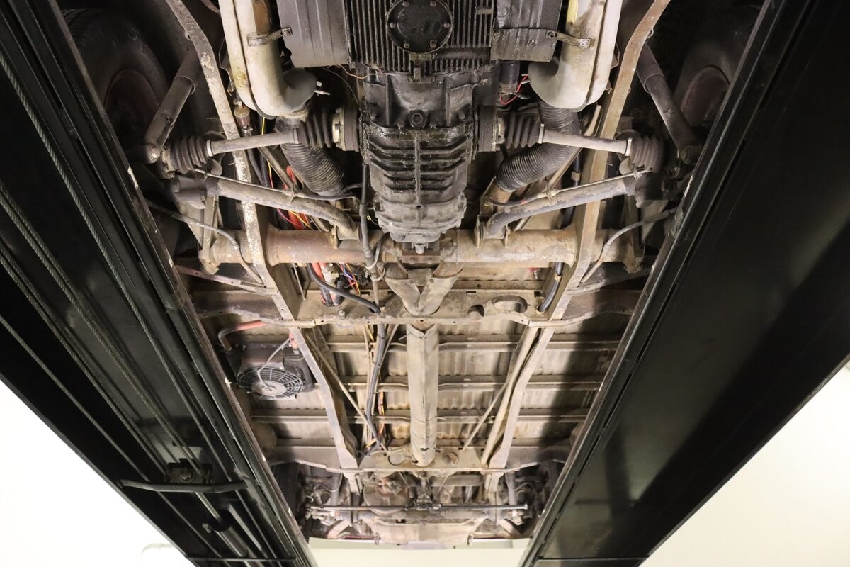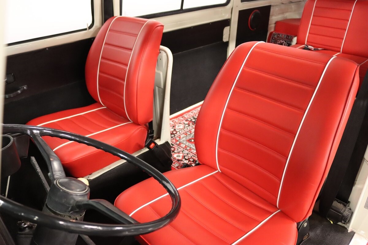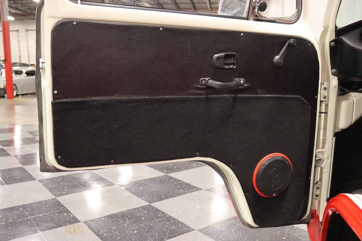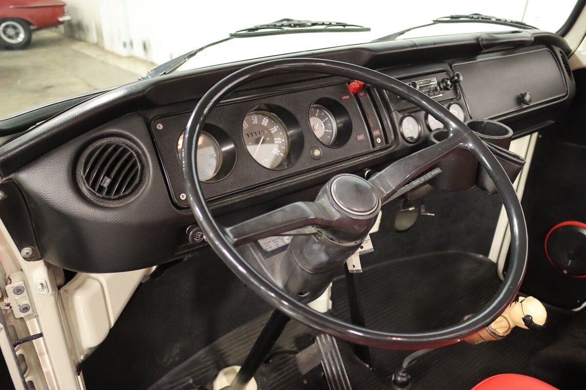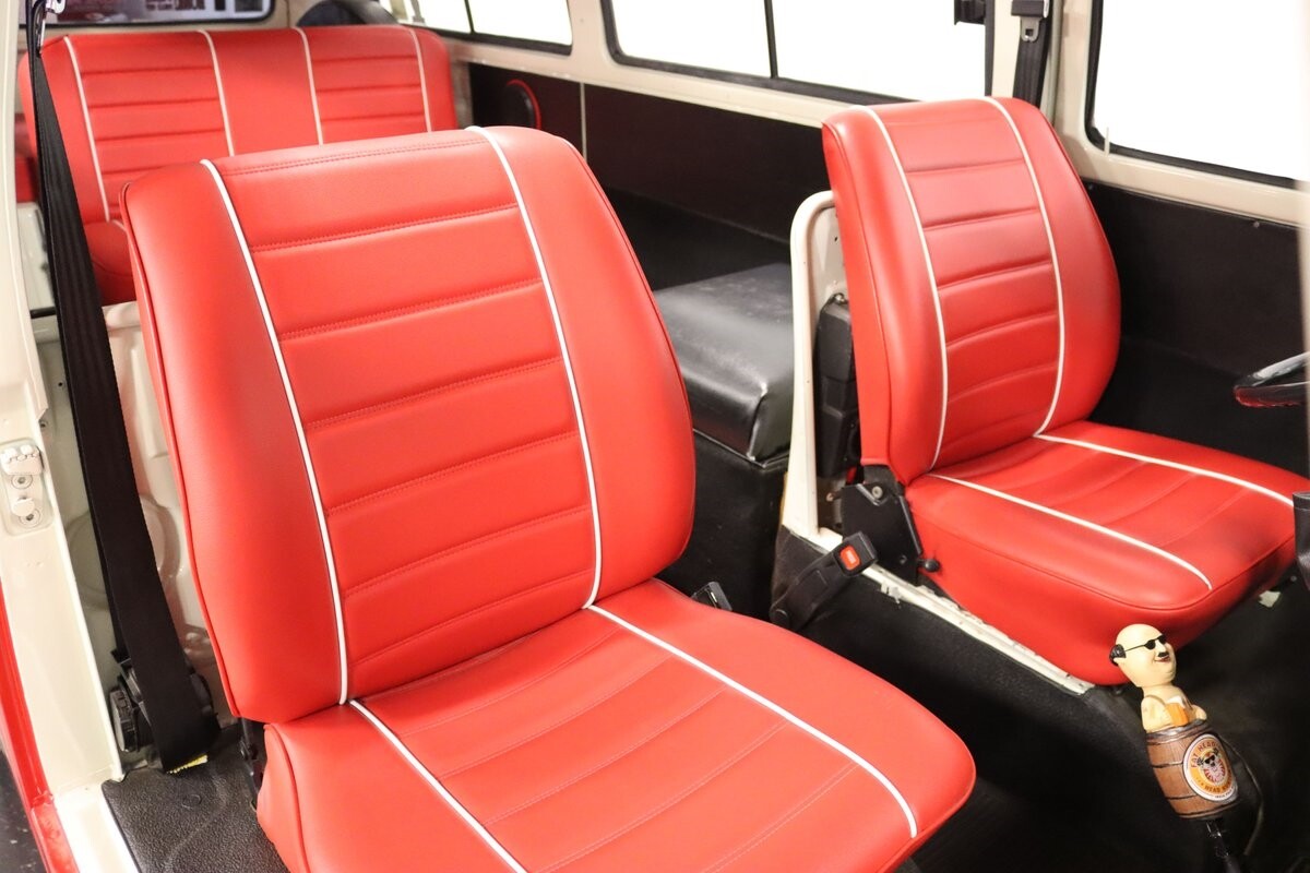 The interior is really where these vehicles shine. Totally restored, it offers durable materials and basic accommodations for passengers, but the style is timeless. Red vinyl upholstery with white piping is a wonderful complement to the red and white exterior and the updated vinyl will last practically forever. Handsome side panels and door panels give it a very finished look and the original-style headliner overhead keeps it bright and clean. Plush black carpets are up front, and a Persian-style rug was laid down in front of the rear bench seat, which as awesome touch that we think really ties the whole bus together, Big Lebowski style. But that's just like our opinion, man. The front seats offer a commanding view of the road completely free of obstructions, and the school bus-like driving position is actually comfortable for long trips, which is really what these buses were designed to do, providing a commanding driver's seat offers a panoramic view out the massive windshield. Basic instrumentation was provided by the factory, and it deviates from the Beetle by using three round pods that may just have been influenced by another air-cooled, rear-engined people transporter from VW. You'll also be pleased to see that even the stereo looks correct, because the builder picked a modern retro-style AM/FM/AUX unit that fits in the dash, with USB connectivity through a capable under the dash. And in addition to the seats, there's a reasonably large and nicely upholstered package shelf mattress-pad atop the engine bay in back, so this bus is camp-ground ready.