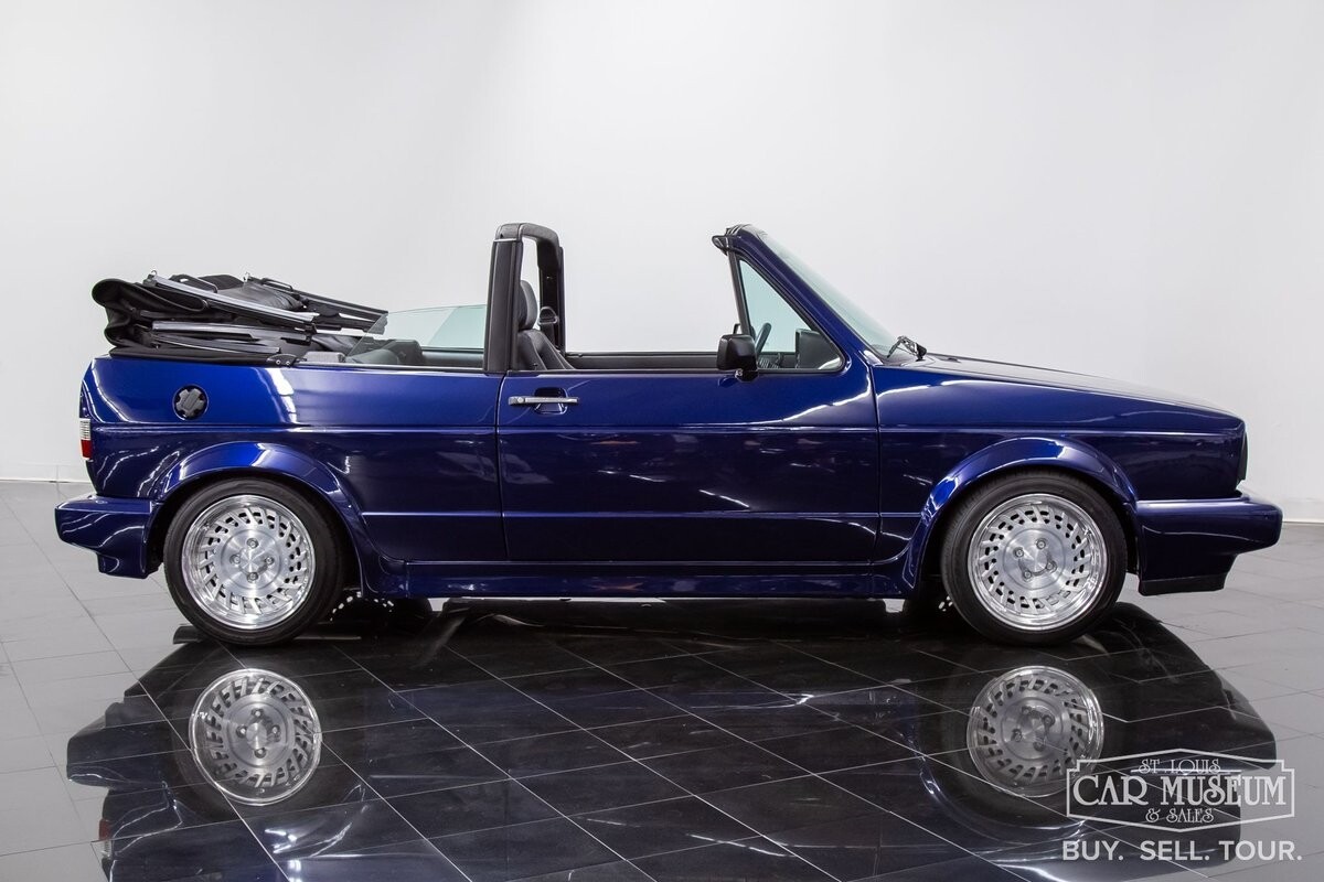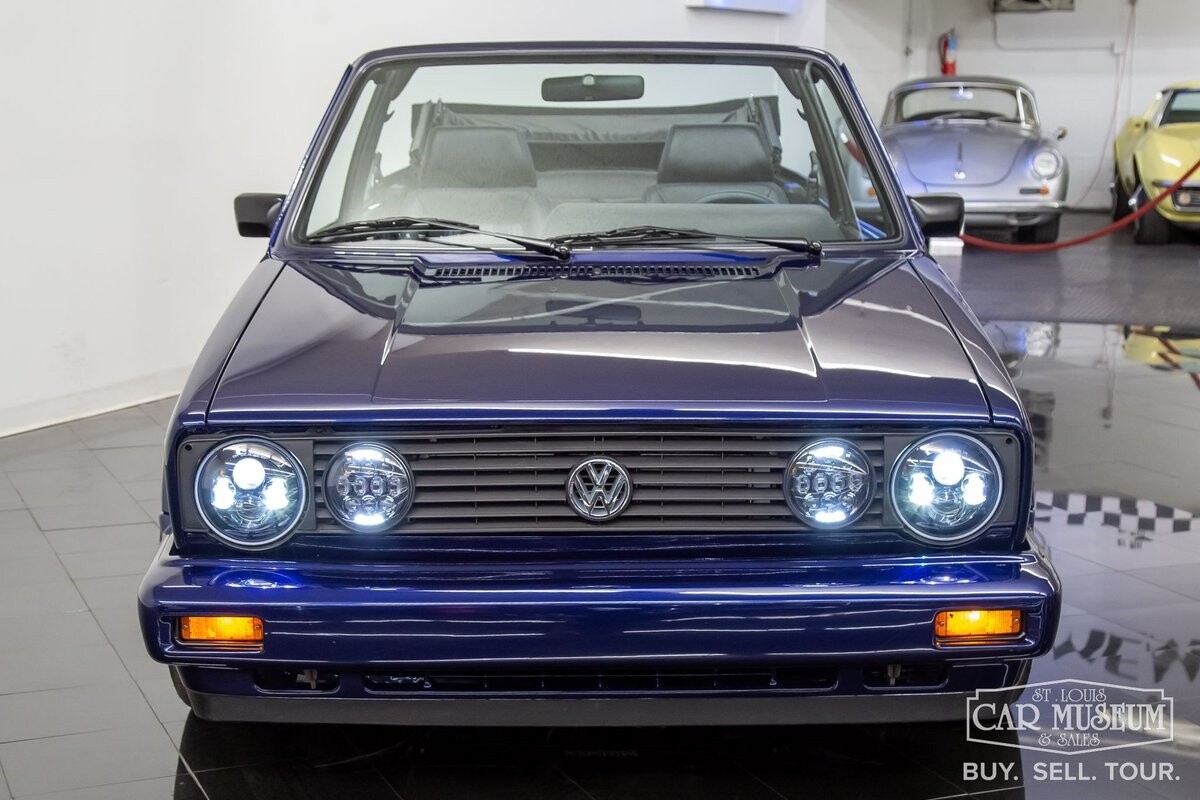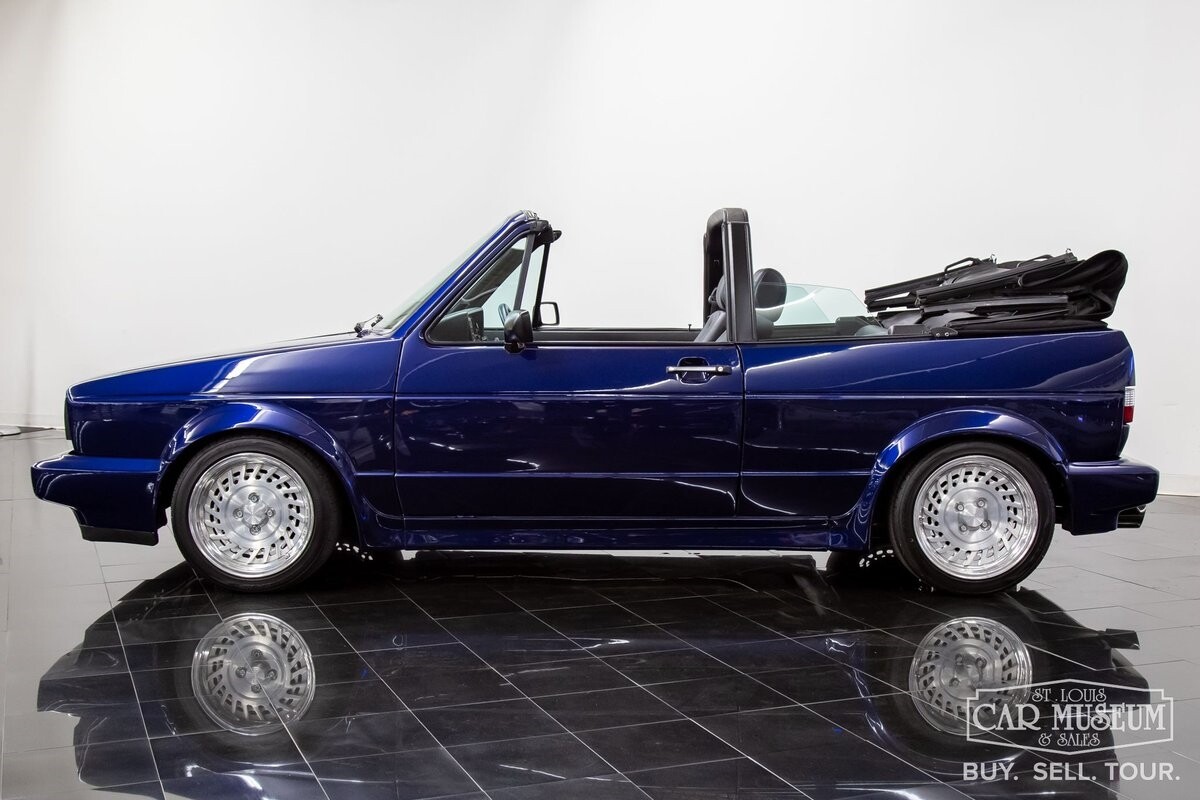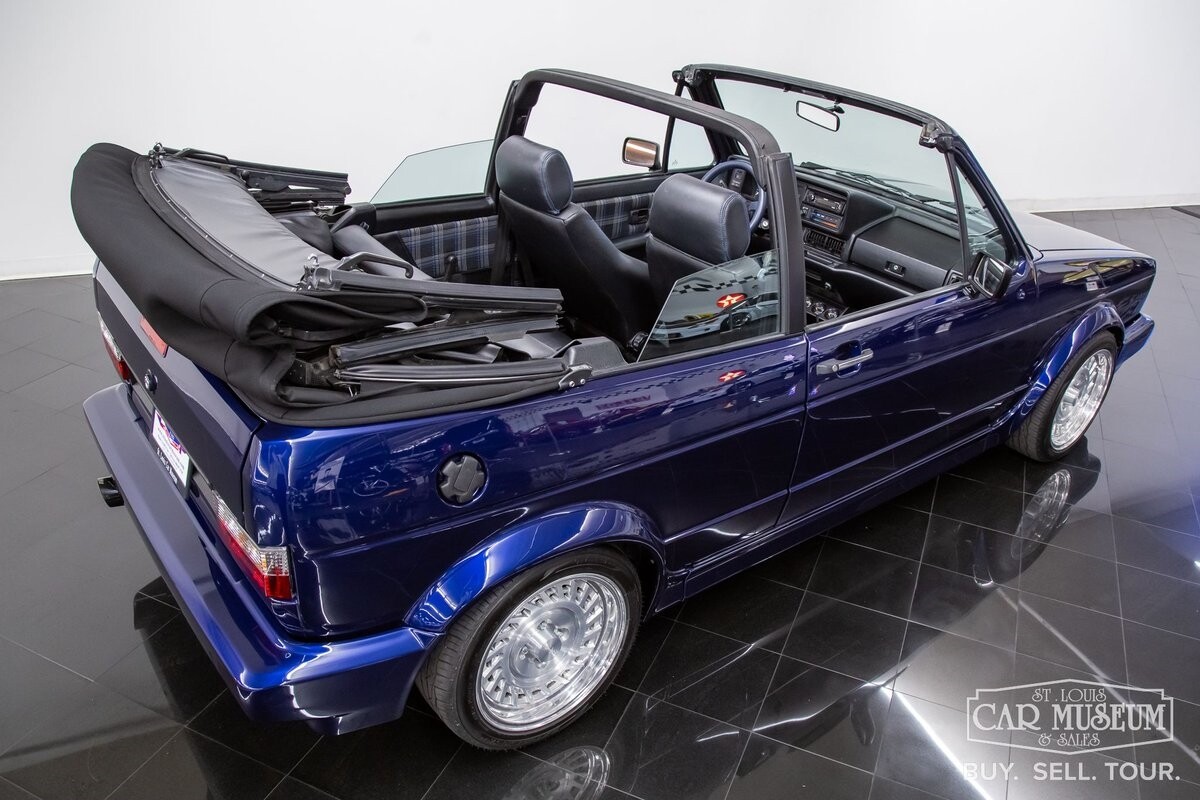 We are excited to offer this 1991 Volkswagen Golf Cabriolet professionally refinished in Navarra Blue Metallic over special Blue Plaid cloth interior. Its current owner initiated a complete custom restoration with the help of All German Performance based in Ashville, NC in 2020. Beginning with a super solid Etienne Aigner Edition Cabriolet in original Midnight Blue, they would immediately have the original engine and transmission removed, and the body sent to C&M Paint Werks in Weaverville, NC for a complete strip to bare metal. They also remove the body side moldings, marker lights, antenna, badges & emblems, and fill any unnecessary firewall and inner fender holes before a truly meticulous application of new Audi-sourced Navarra Blue Metallic paint was sprayed.