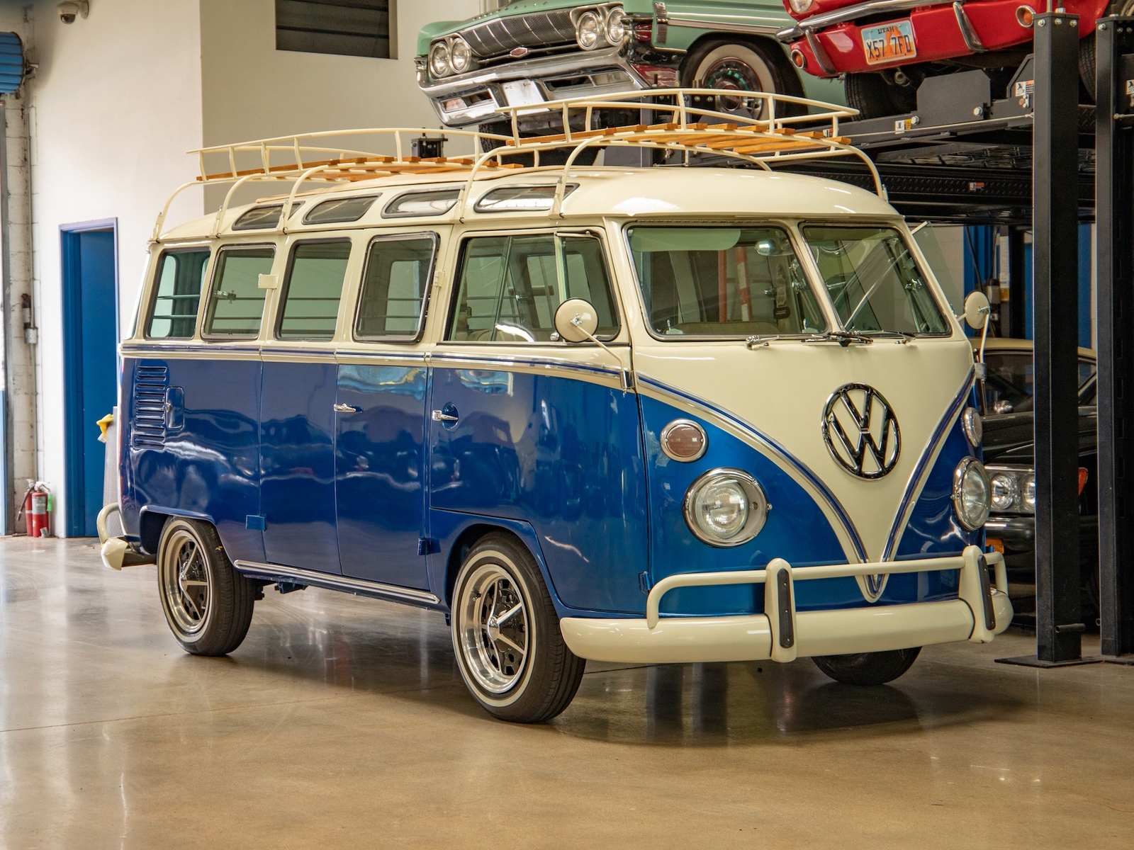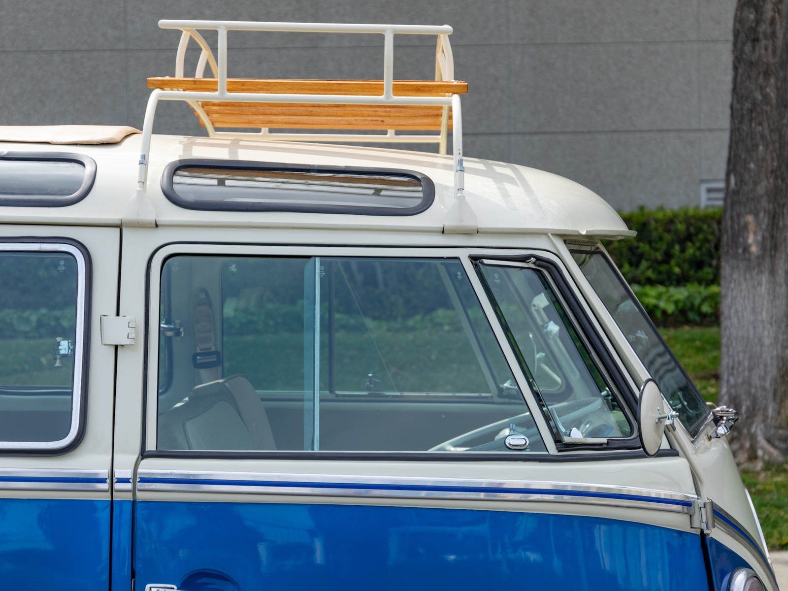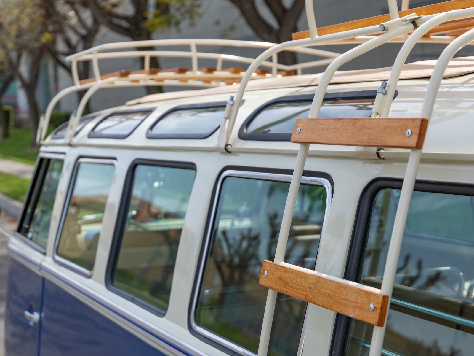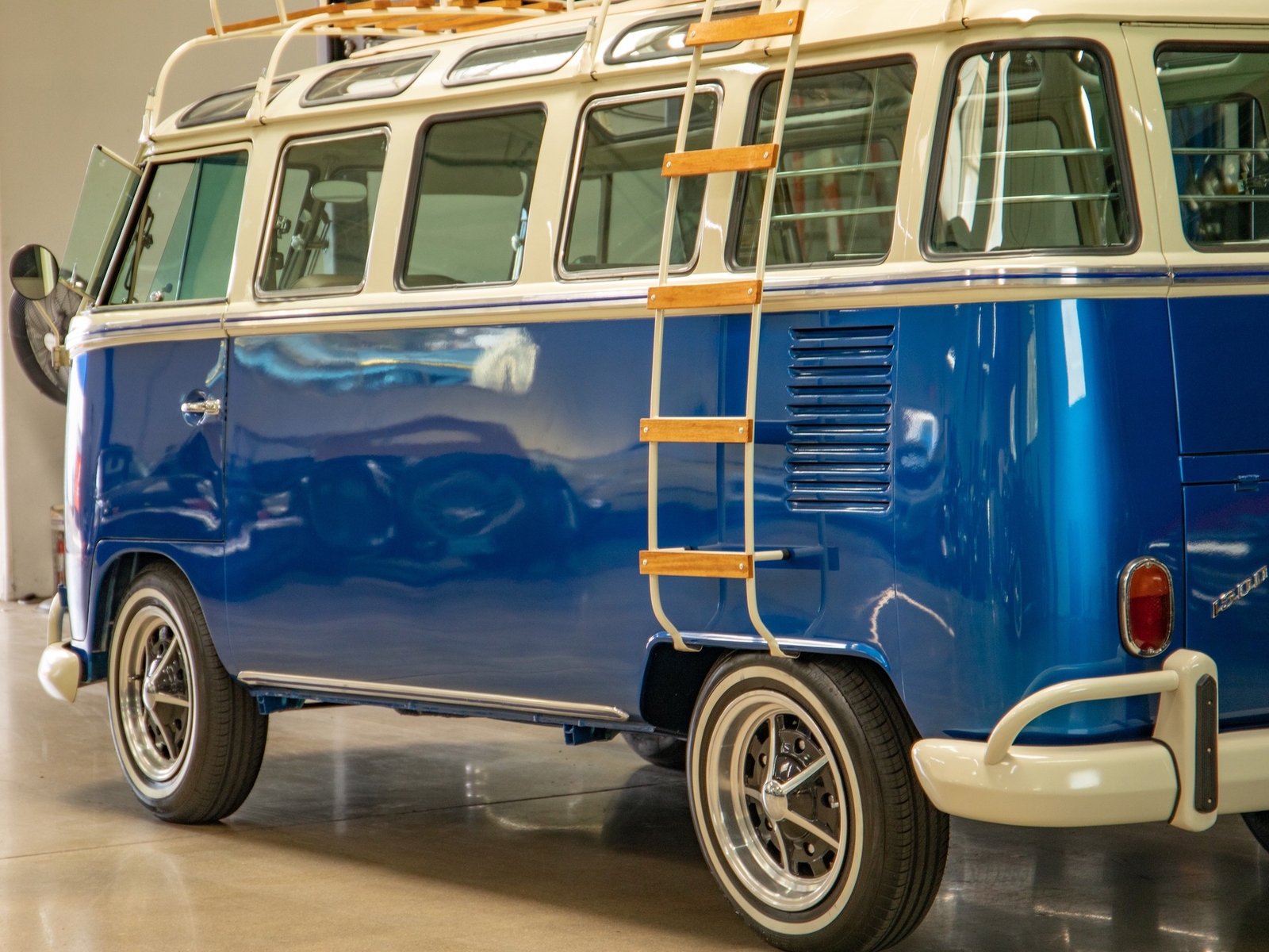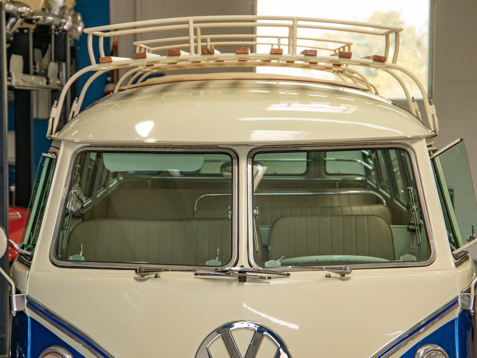 The bus is finished in two-tone colors with of Blue with an Ivory White top and a matching interior. It features safari front windows, two sets of pop-out windows on each side, a full center retractable ragtop sunroof, double cargo side doors and seating for nine. The rear wooden roof rack provides for additional storage.