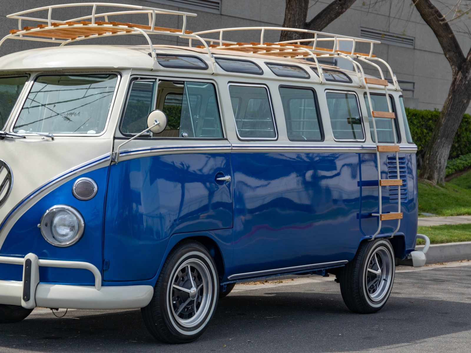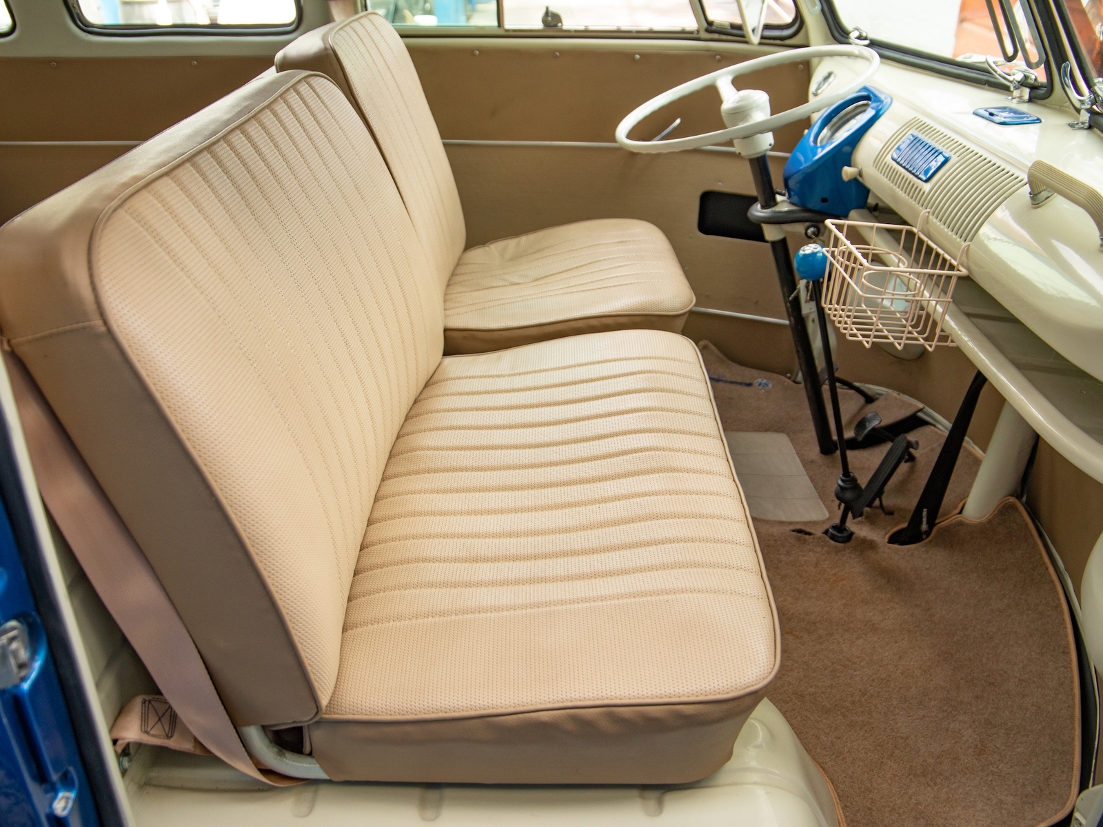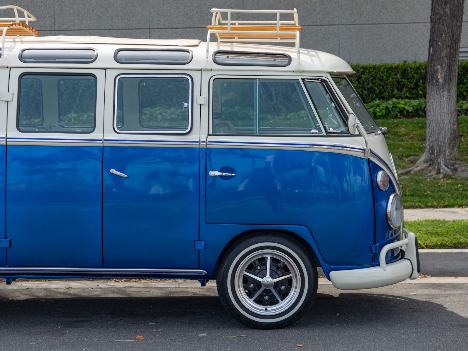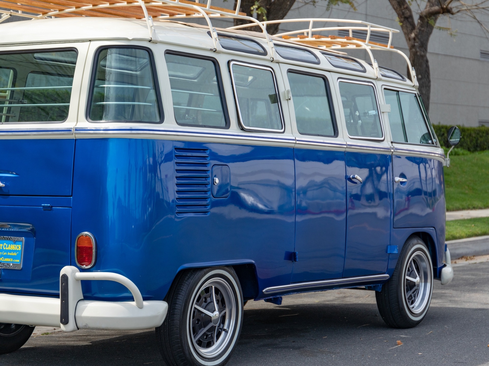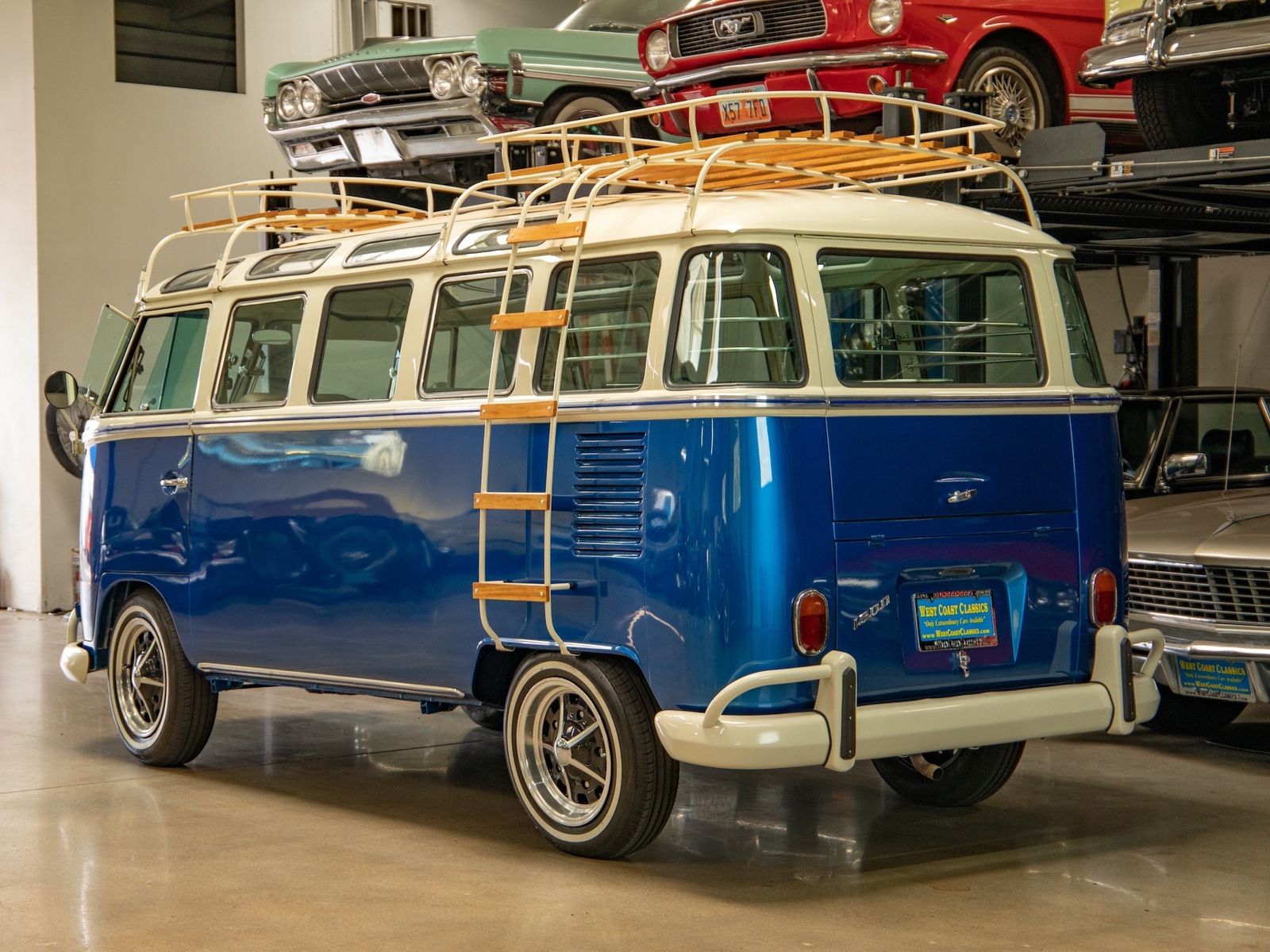 The bus is finished in two-tone colors with of Blue with an Ivory White top and a matching interior. It features safari front windows, two sets of pop-out windows on each side, a full center retractable ragtop sunroof, double cargo side doors and seating for nine. The rear wooden roof rack provides for additional storage.