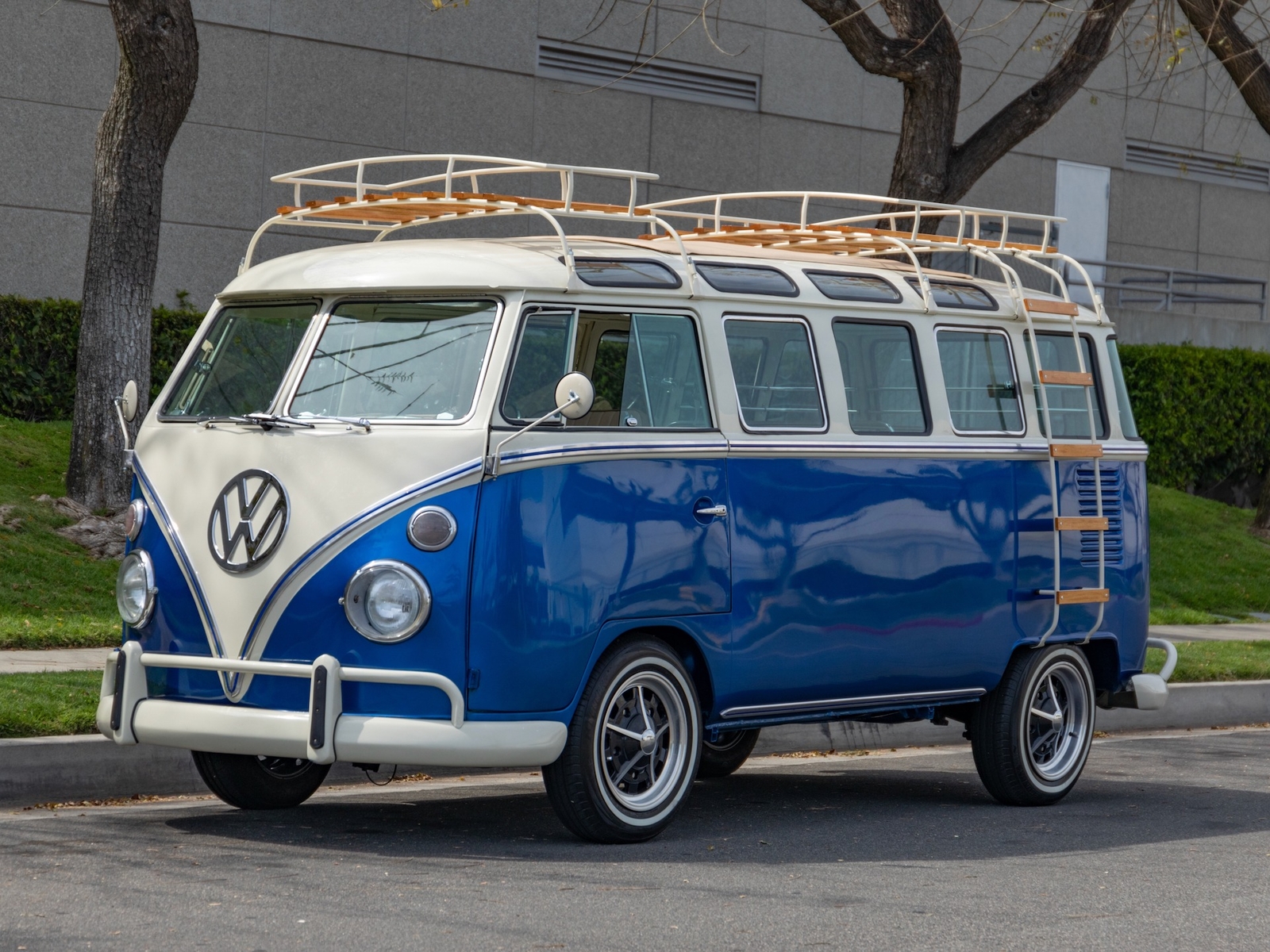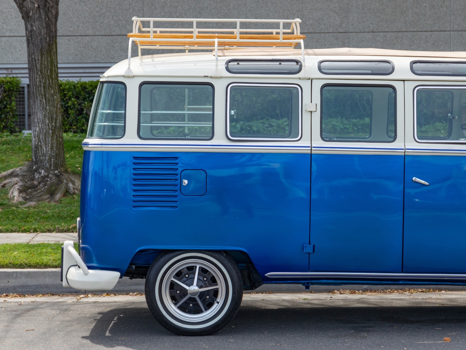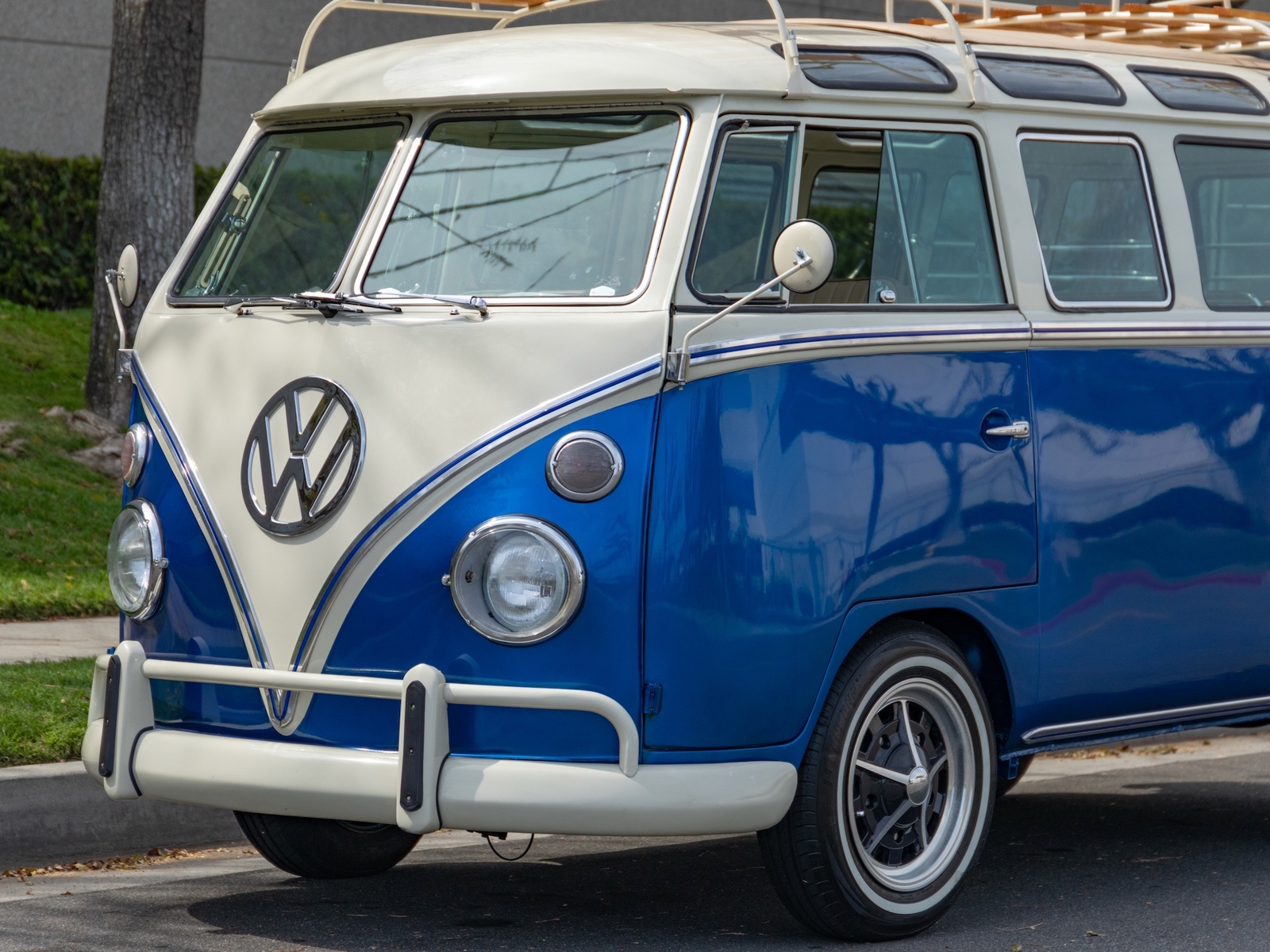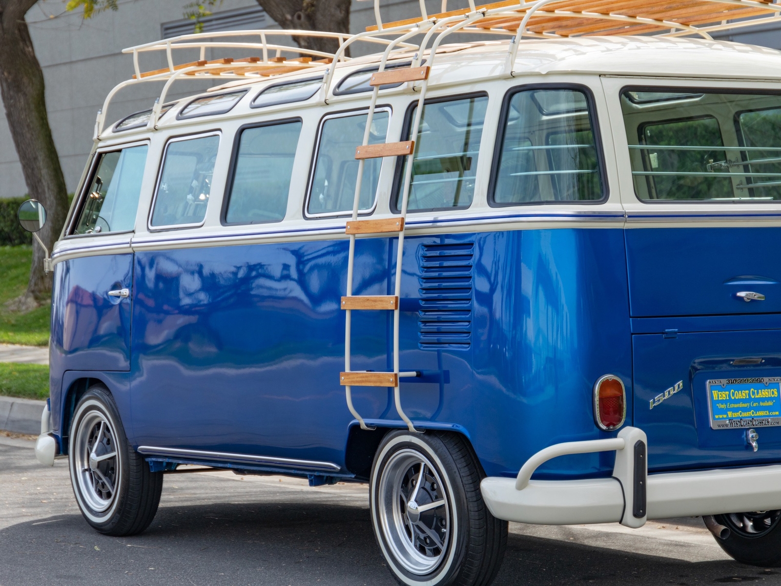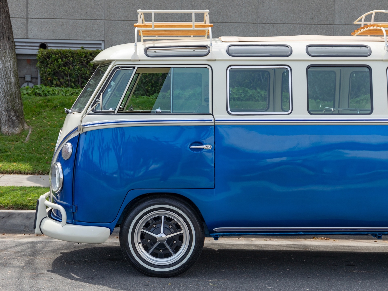 The bus is finished in two-tone colors with of Blue with an Ivory White top and a matching interior. It features safari front windows, two sets of pop-out windows on each side, a full center retractable ragtop sunroof, double cargo side doors and seating for nine. The rear wooden roof rack provides for additional storage.