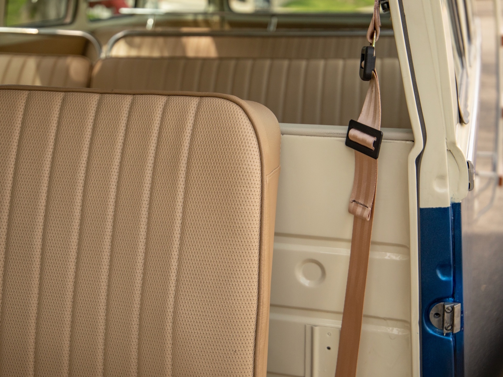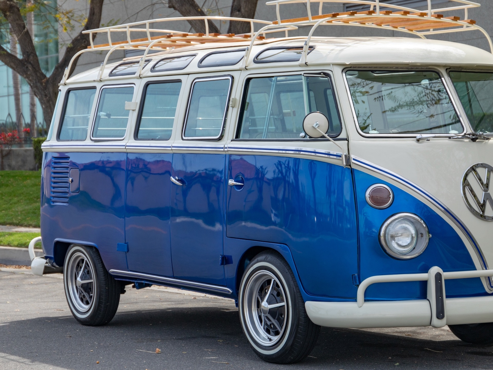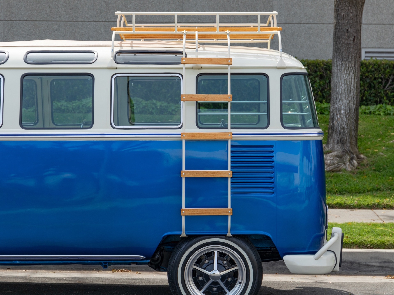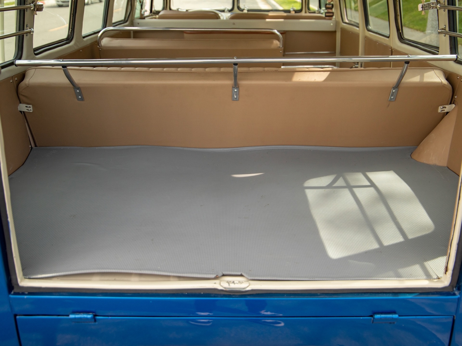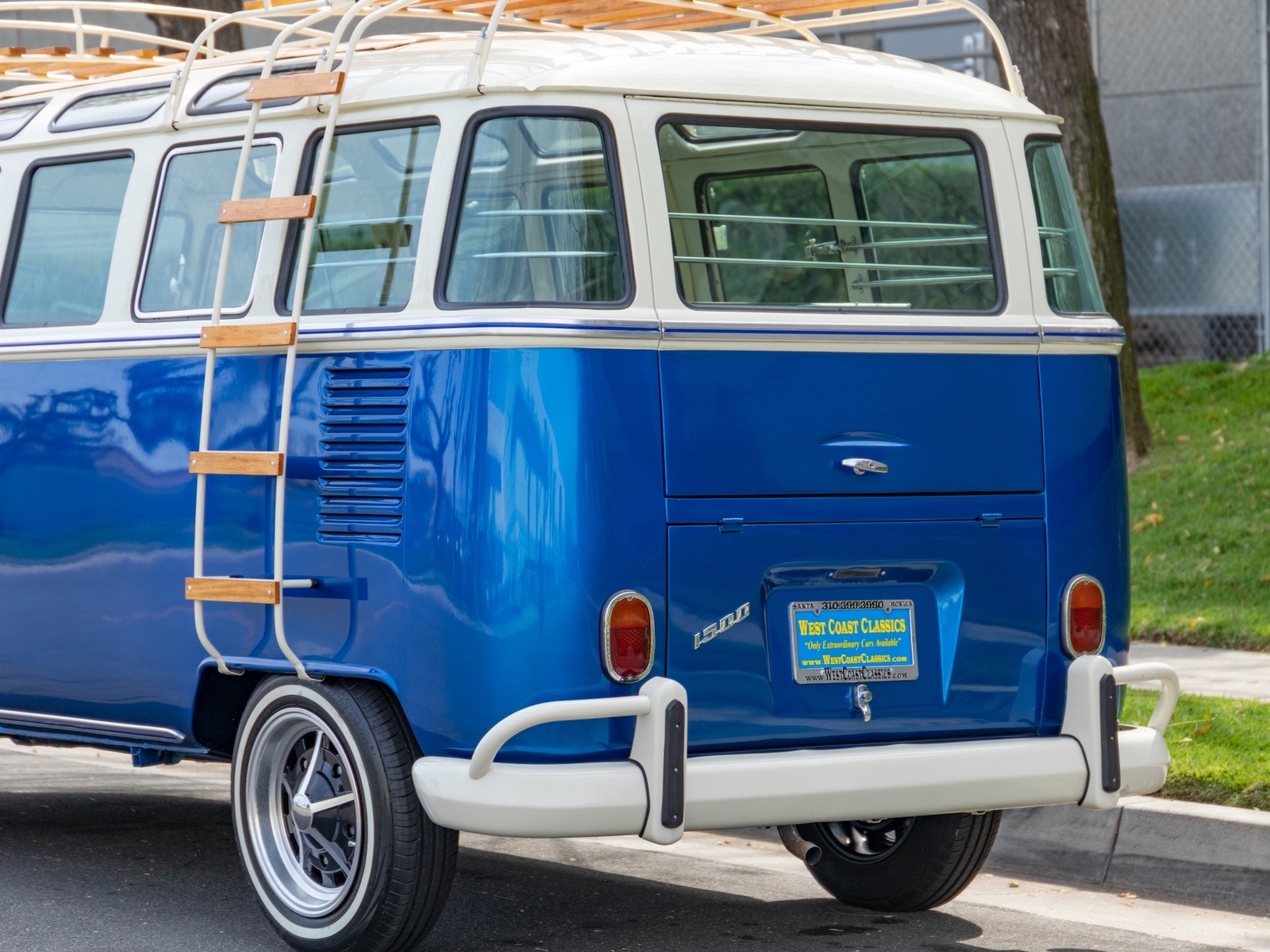 The bus is finished in two-tone colors with of Blue with an Ivory White top and a matching interior. It features safari front windows, two sets of pop-out windows on each side, a full center retractable ragtop sunroof, double cargo side doors and seating for nine. The rear wooden roof rack provides for additional storage.