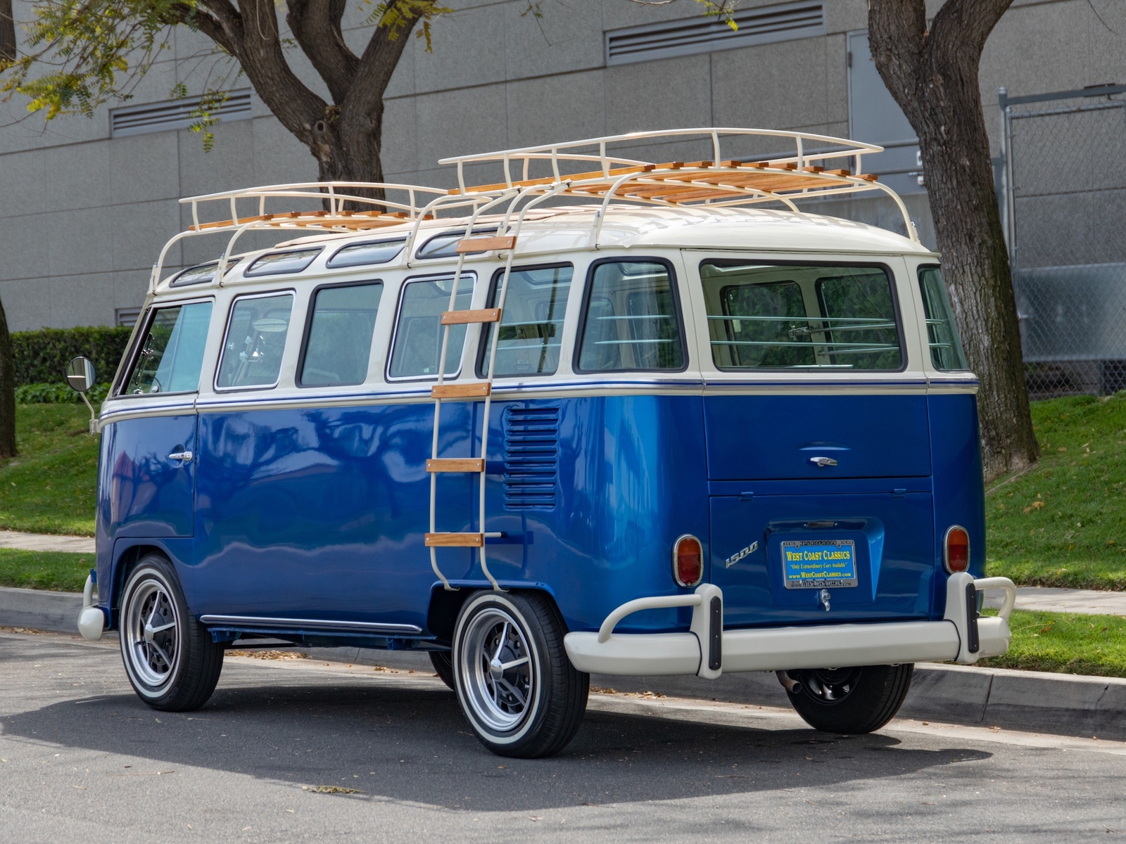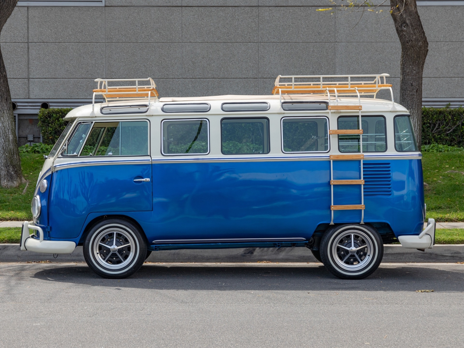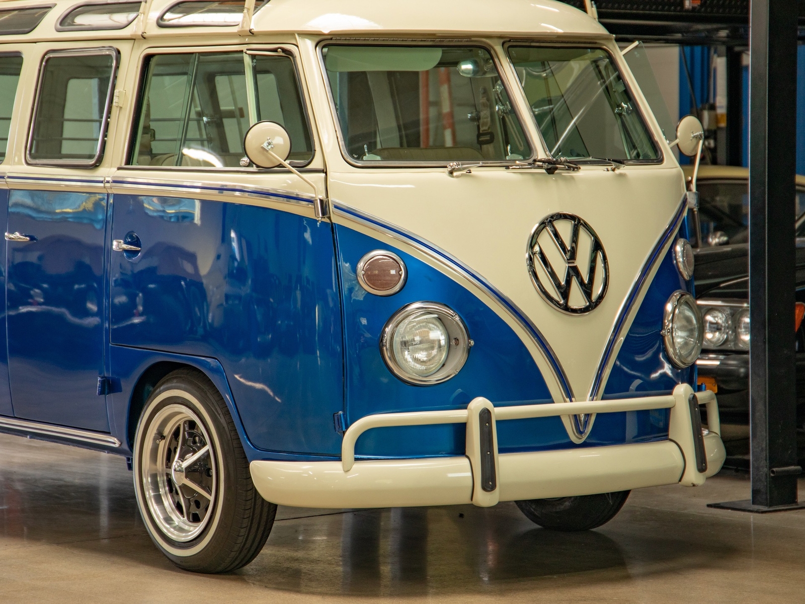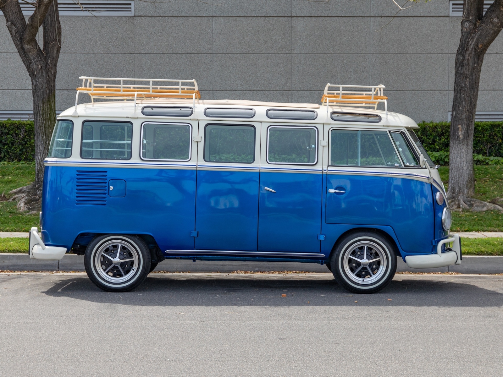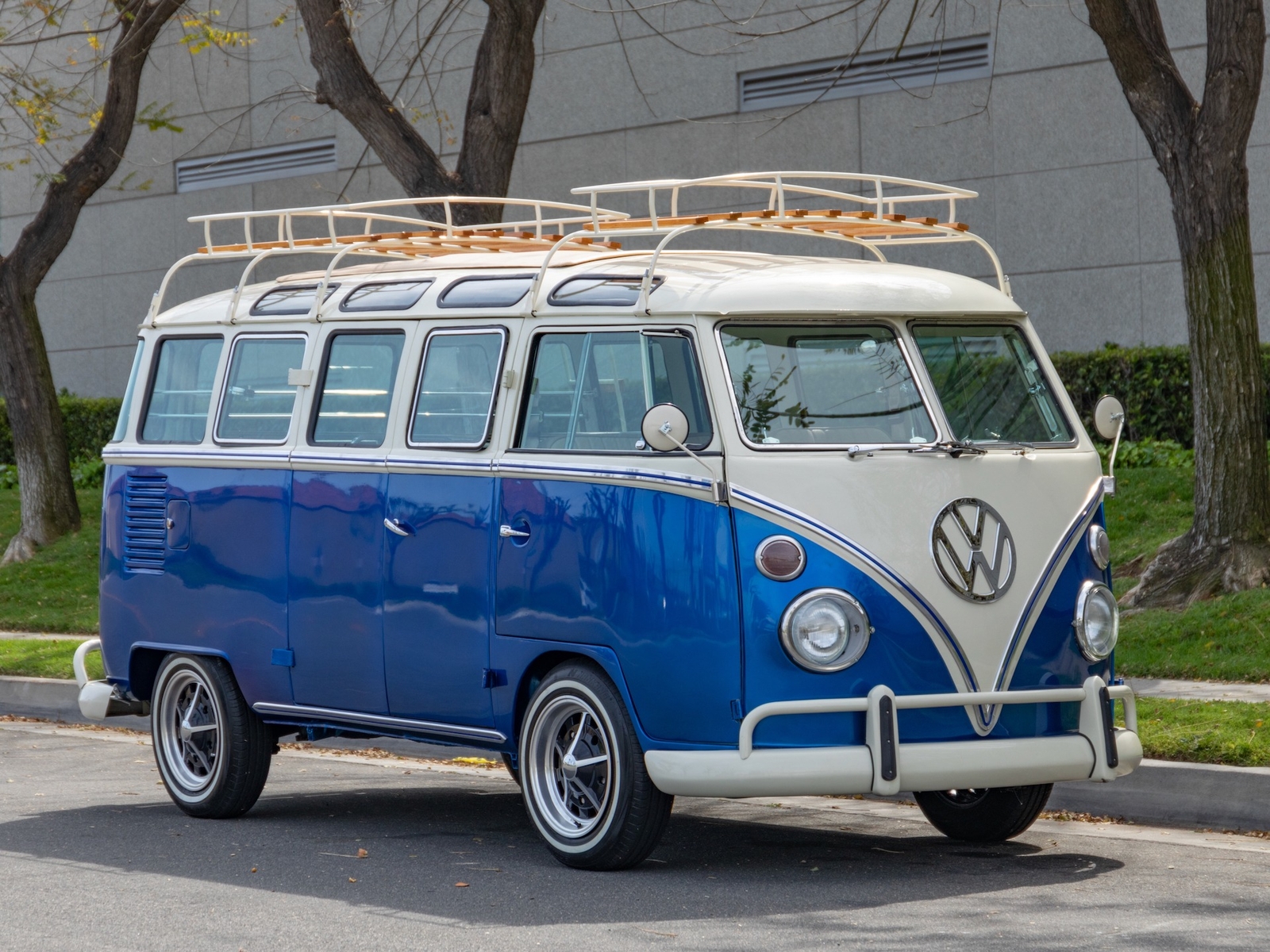 The bus is finished in two-tone colors with of Blue with an Ivory White top and a matching interior. It features safari front windows, two sets of pop-out windows on each side, a full center retractable ragtop sunroof, double cargo side doors and seating for nine. The rear wooden roof rack provides for additional storage.