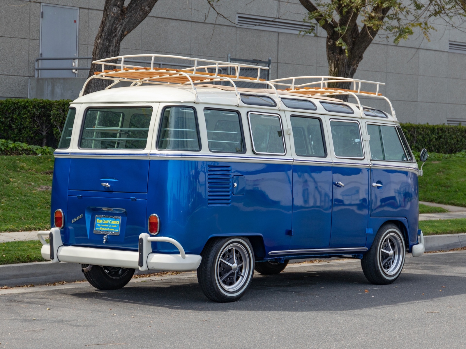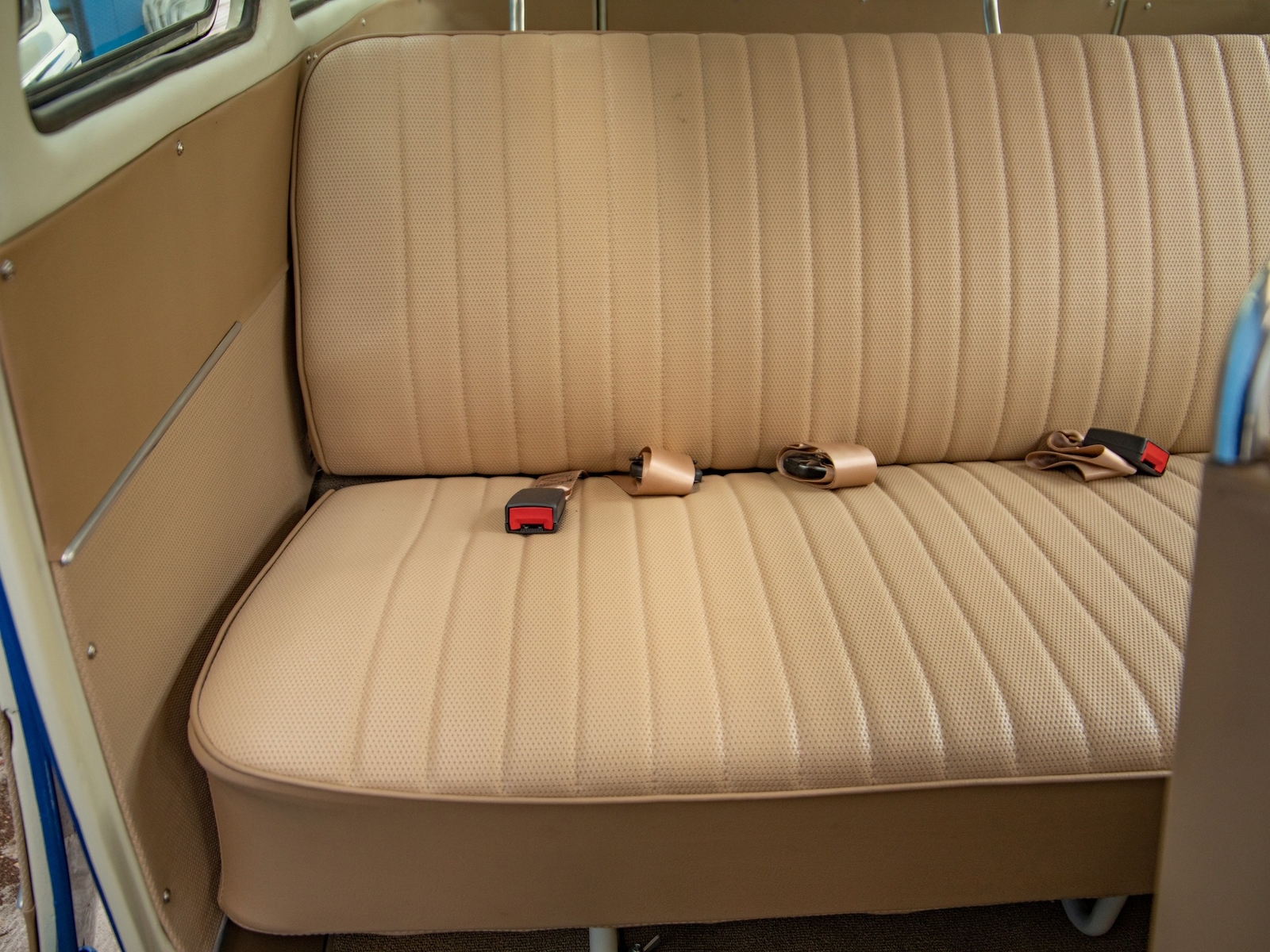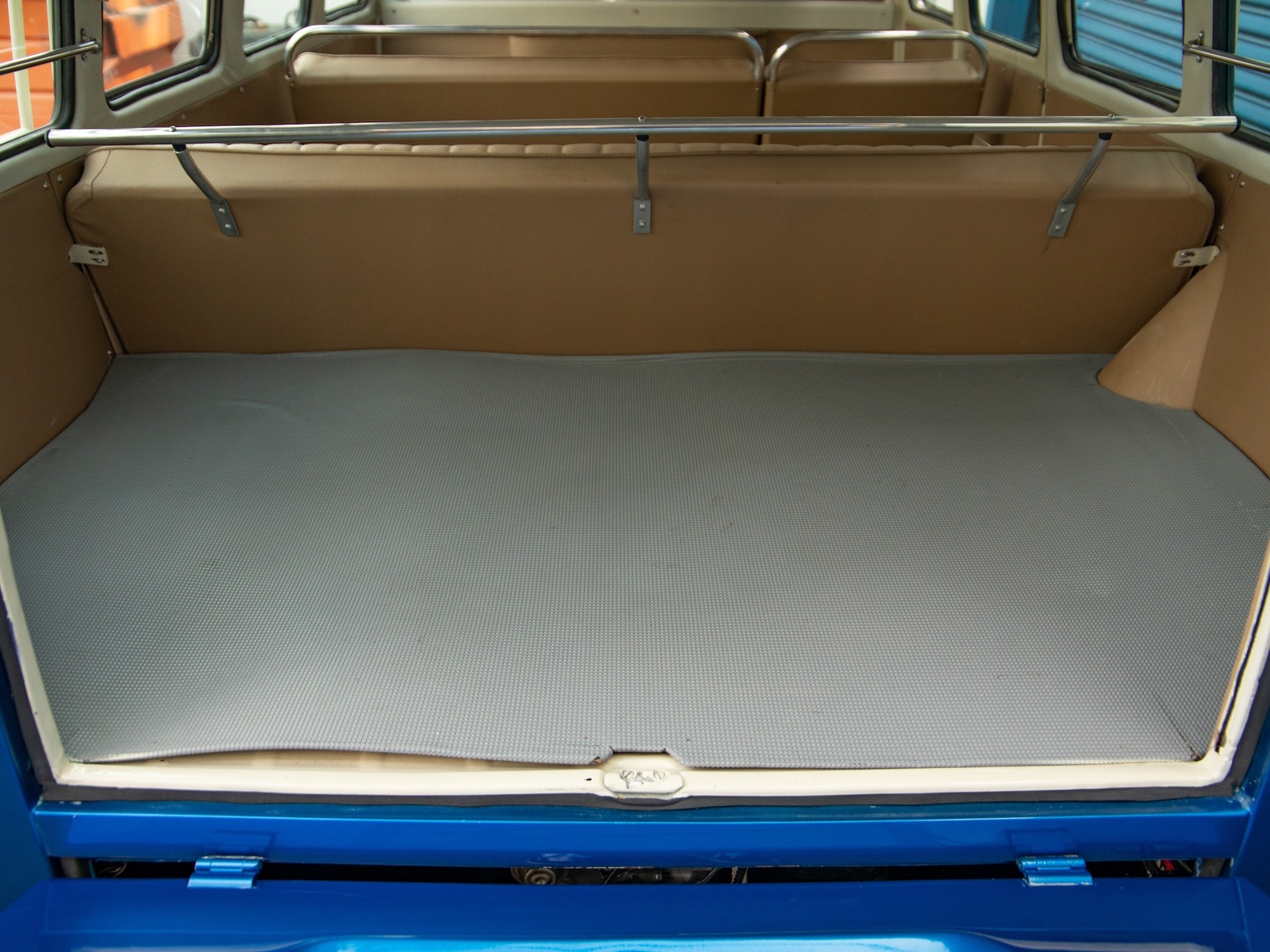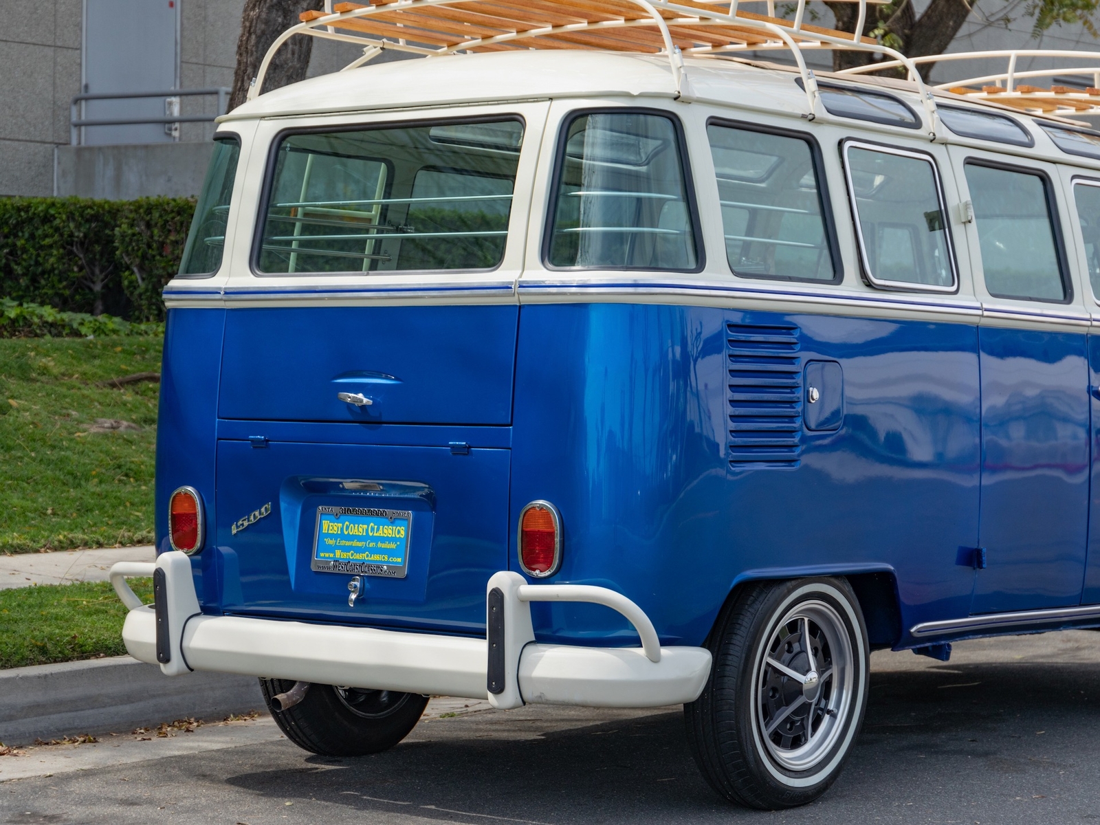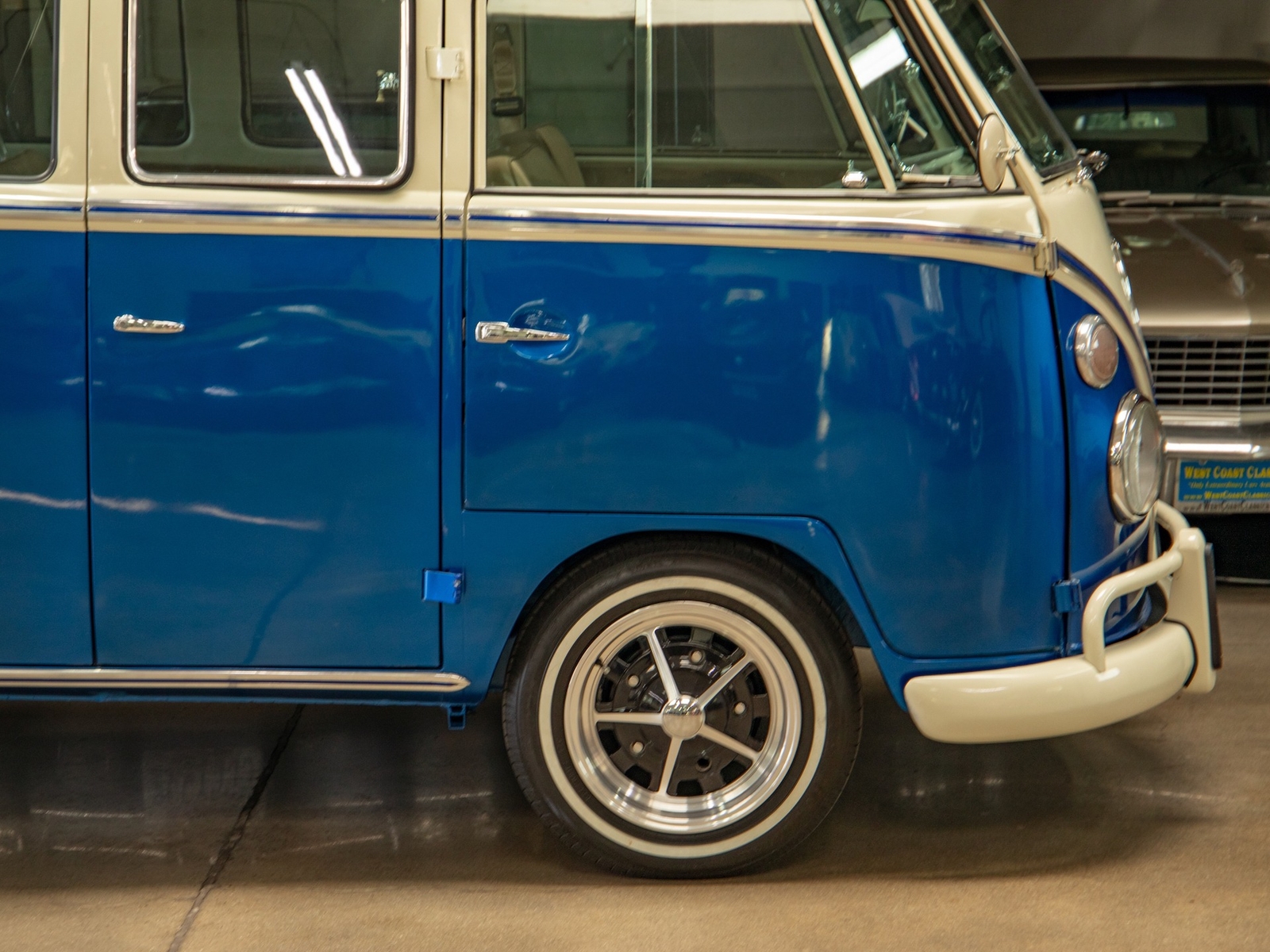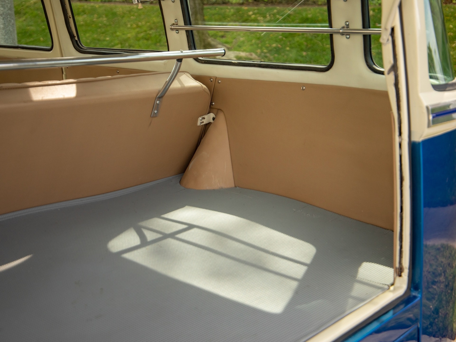 The bus is finished in two-tone colors with of Blue with an Ivory White top and a matching interior. It features safari front windows, two sets of pop-out windows on each side, a full center retractable ragtop sunroof, double cargo side doors and seating for nine. The rear wooden roof rack provides for additional storage.