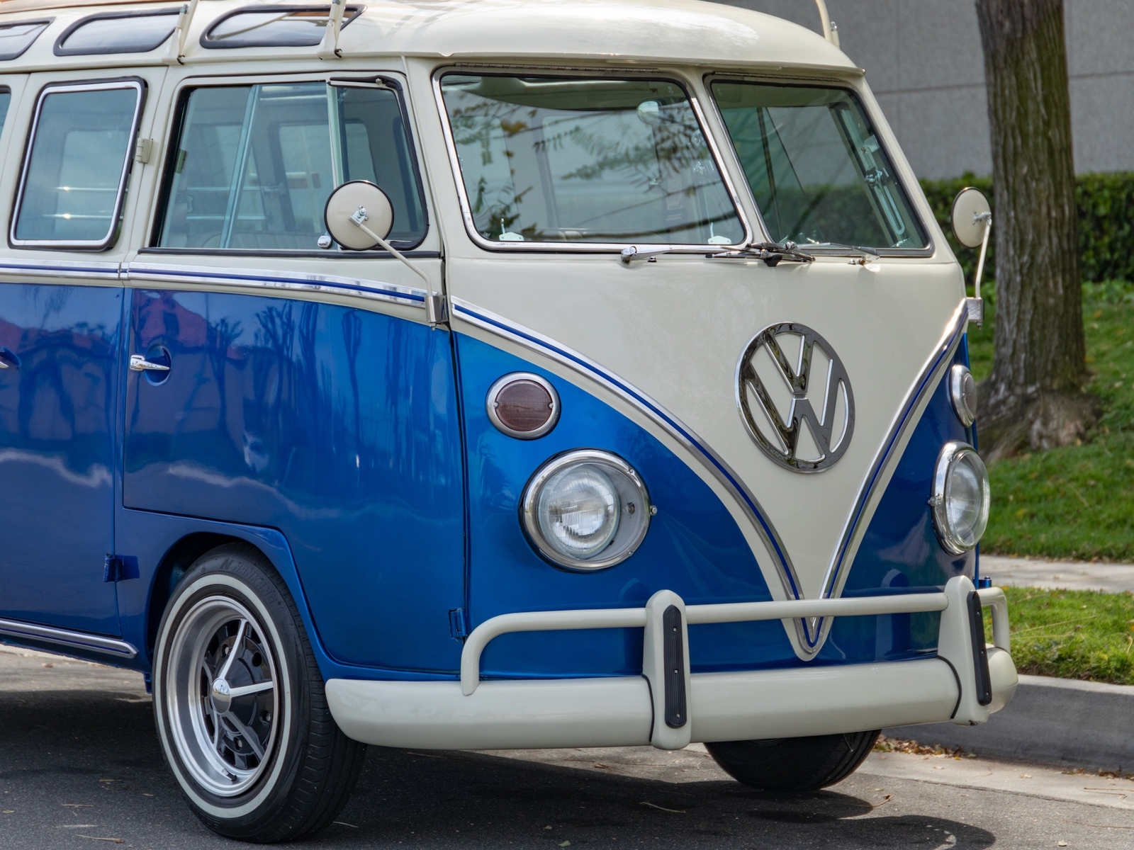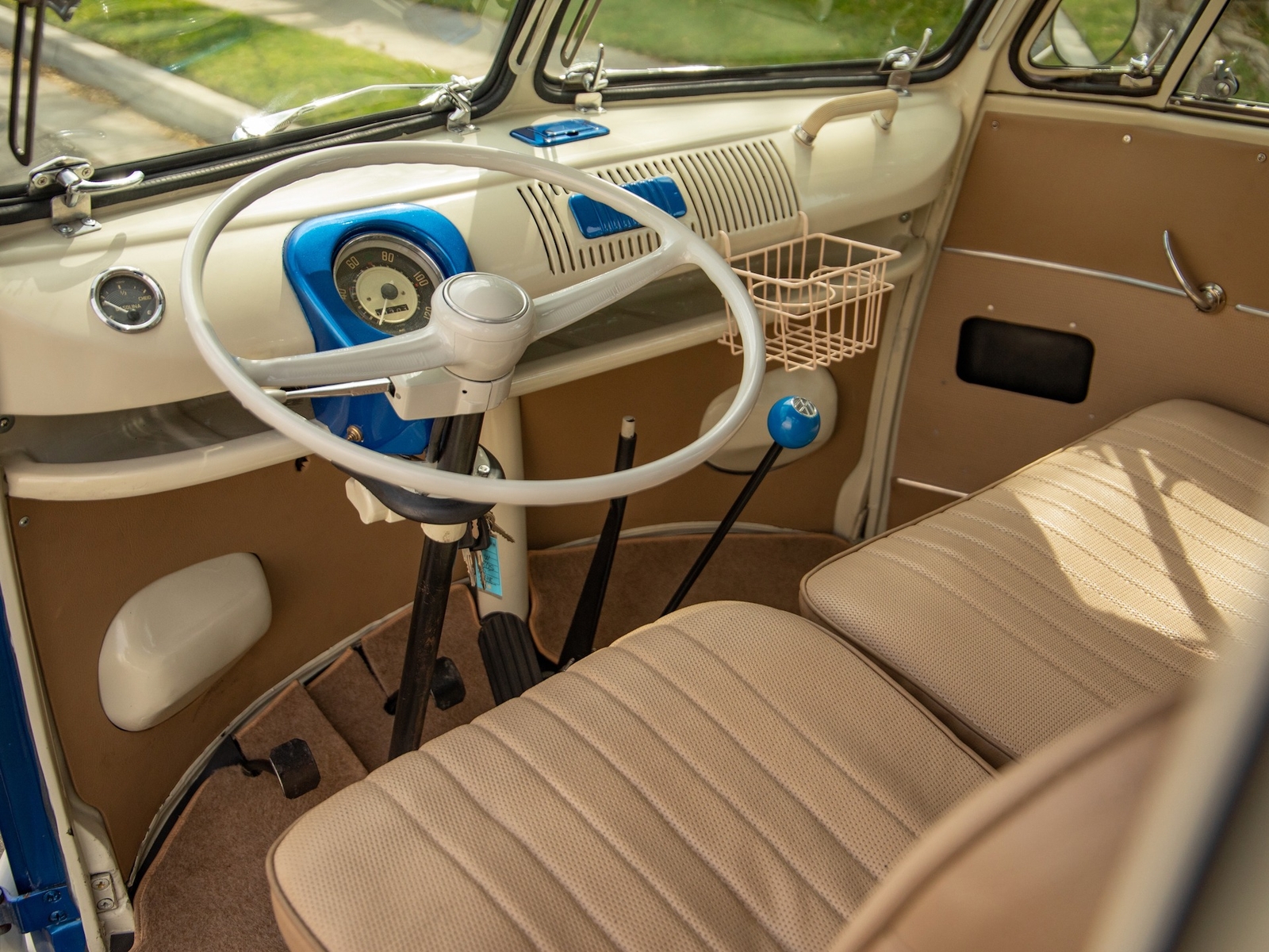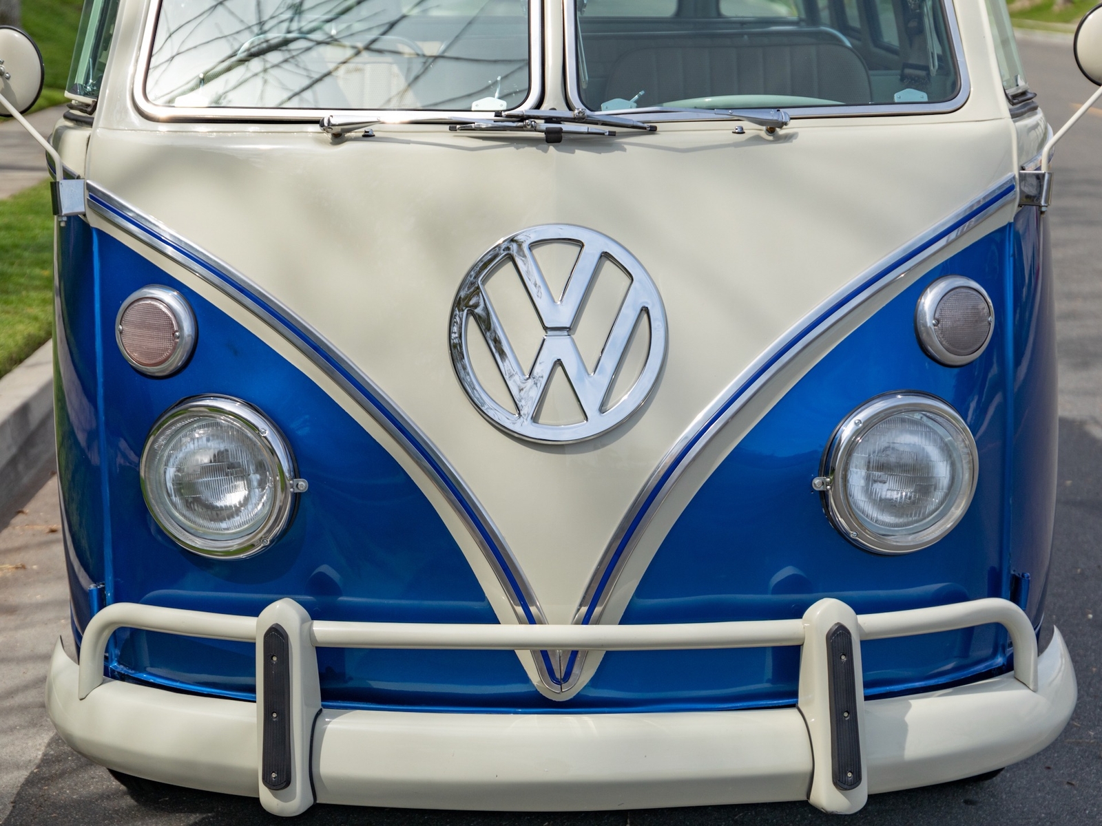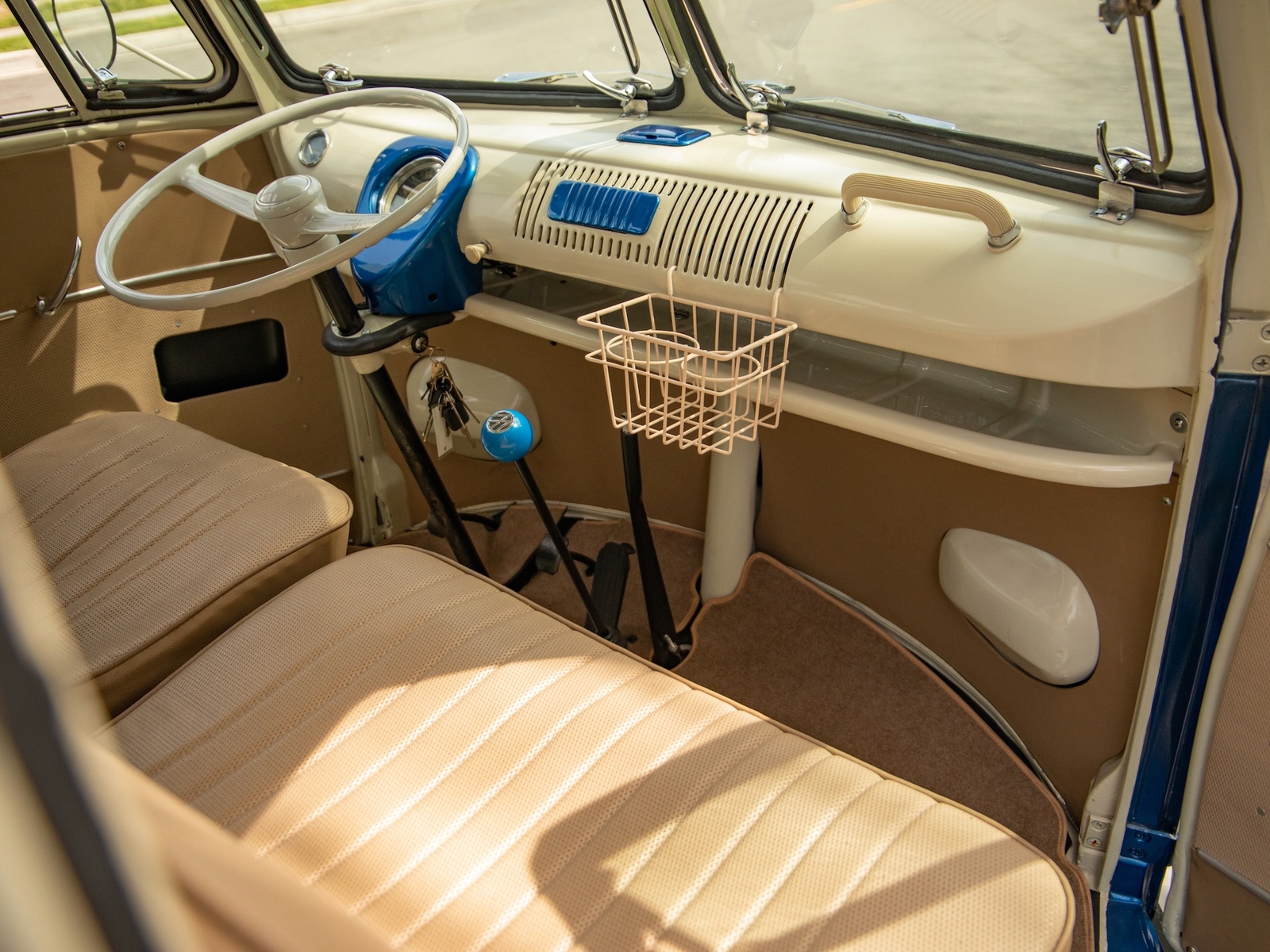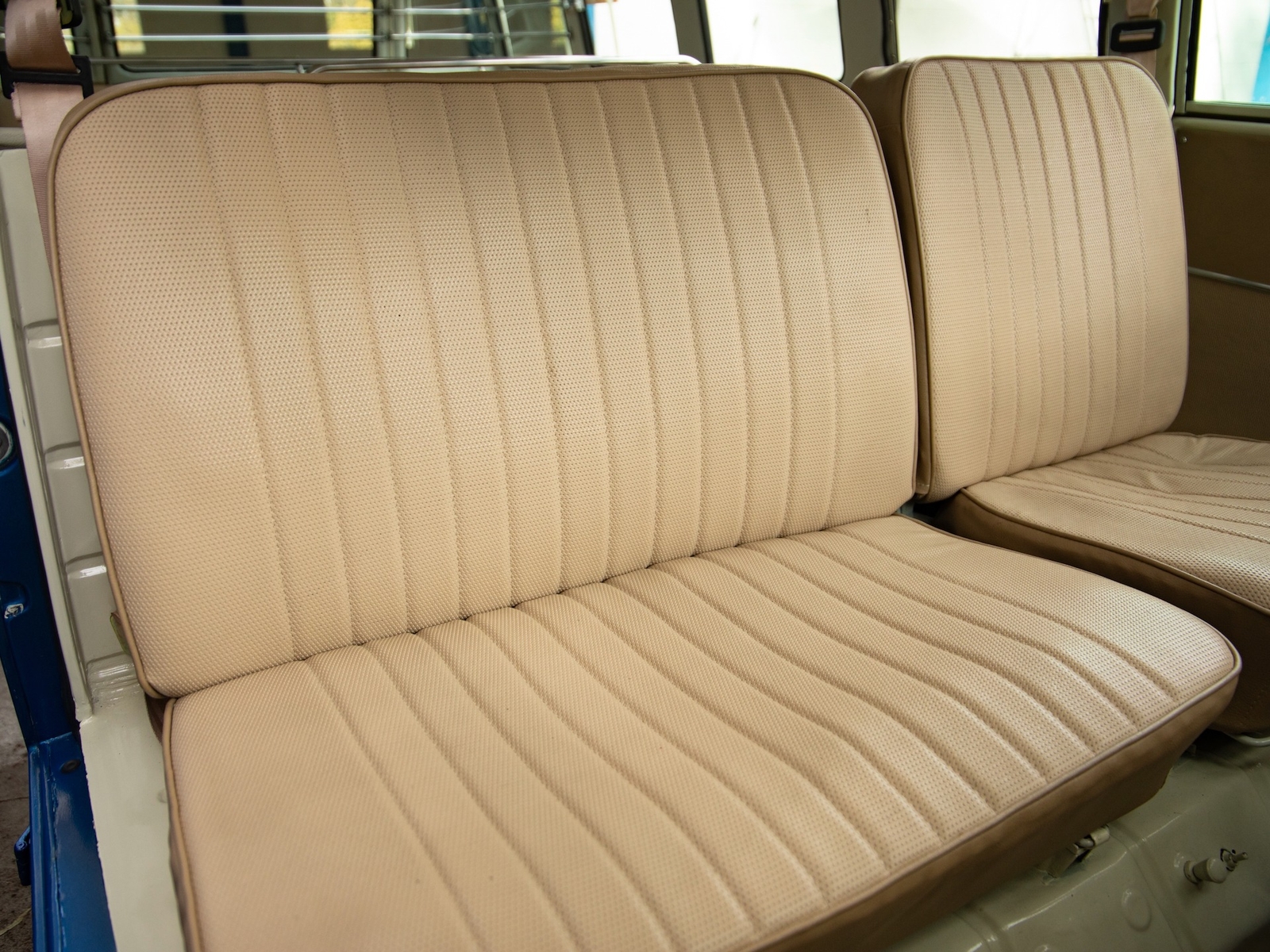 The bus is finished in two-tone colors with of Blue with an Ivory White top and a matching interior. It features safari front windows, two sets of pop-out windows on each side, a full center retractable ragtop sunroof, double cargo side doors and seating for nine. The rear wooden roof rack provides for additional storage.