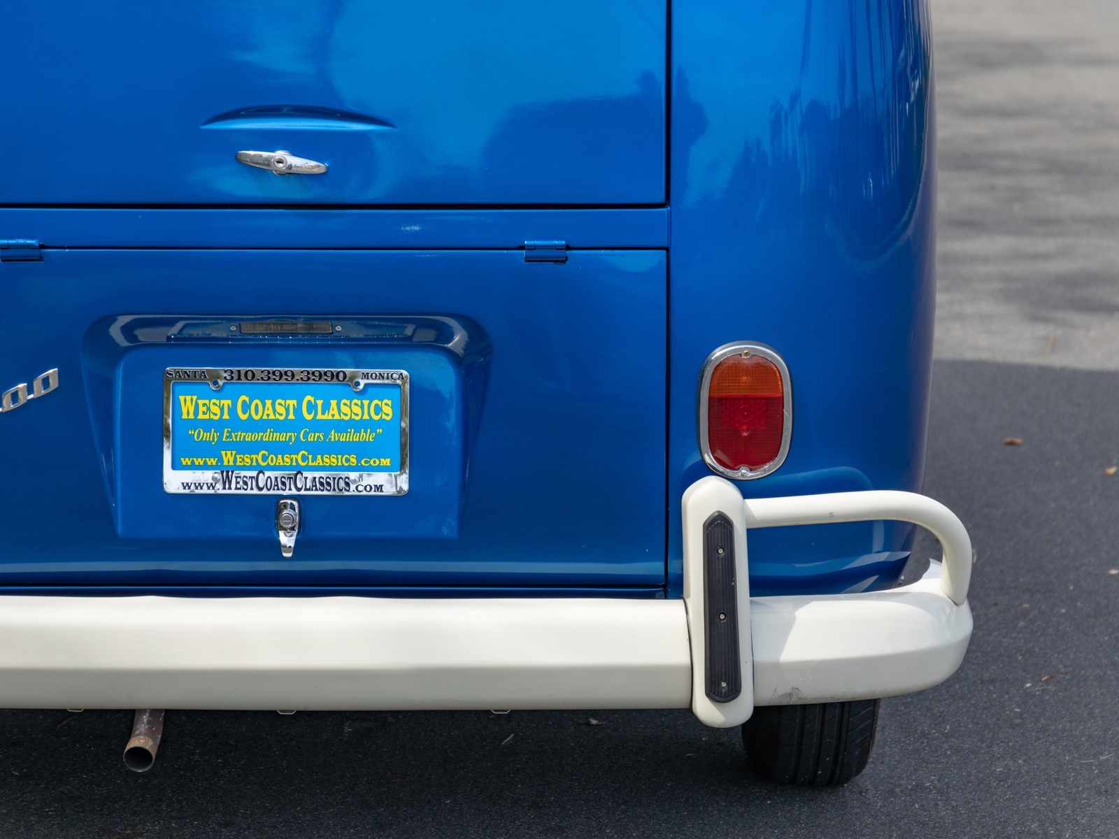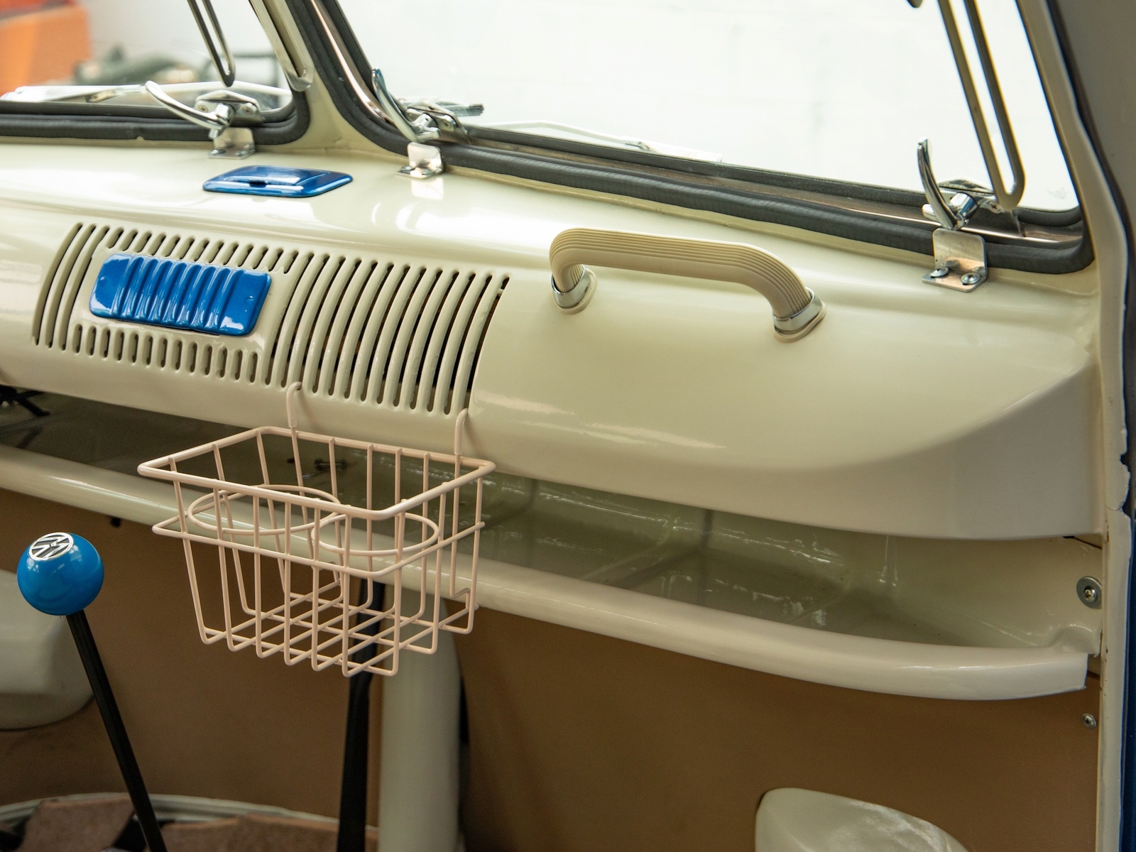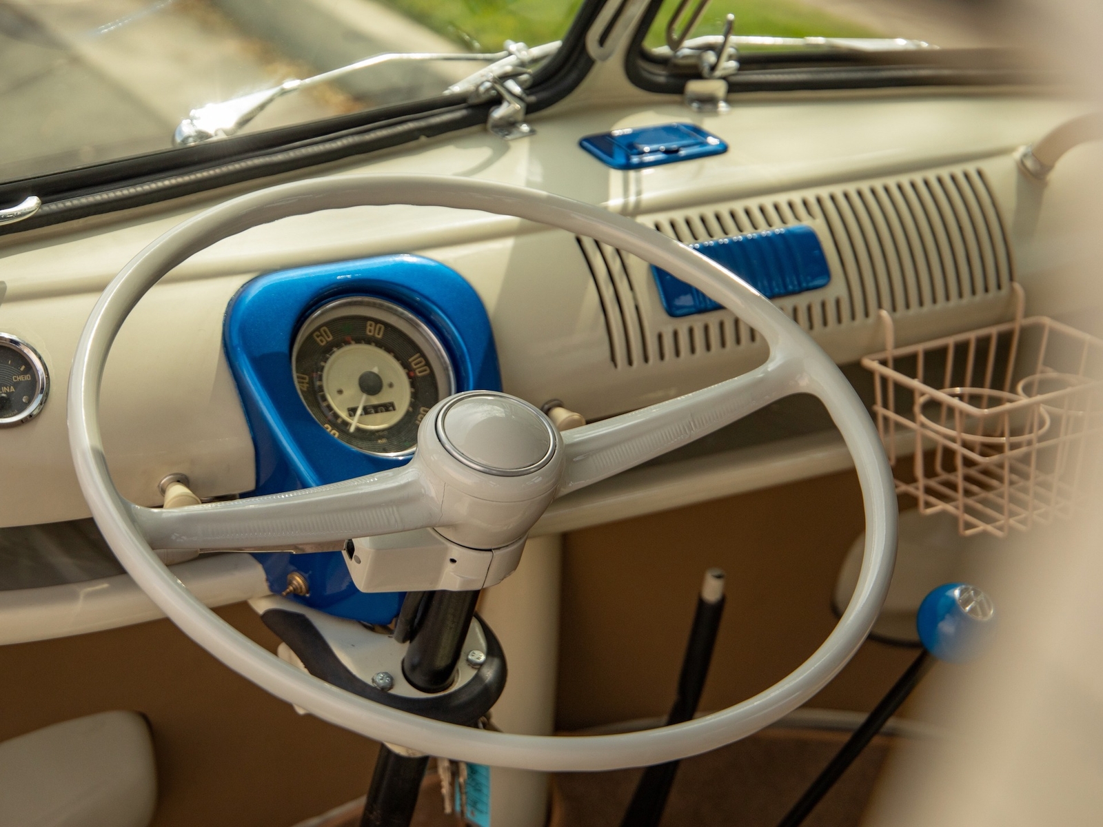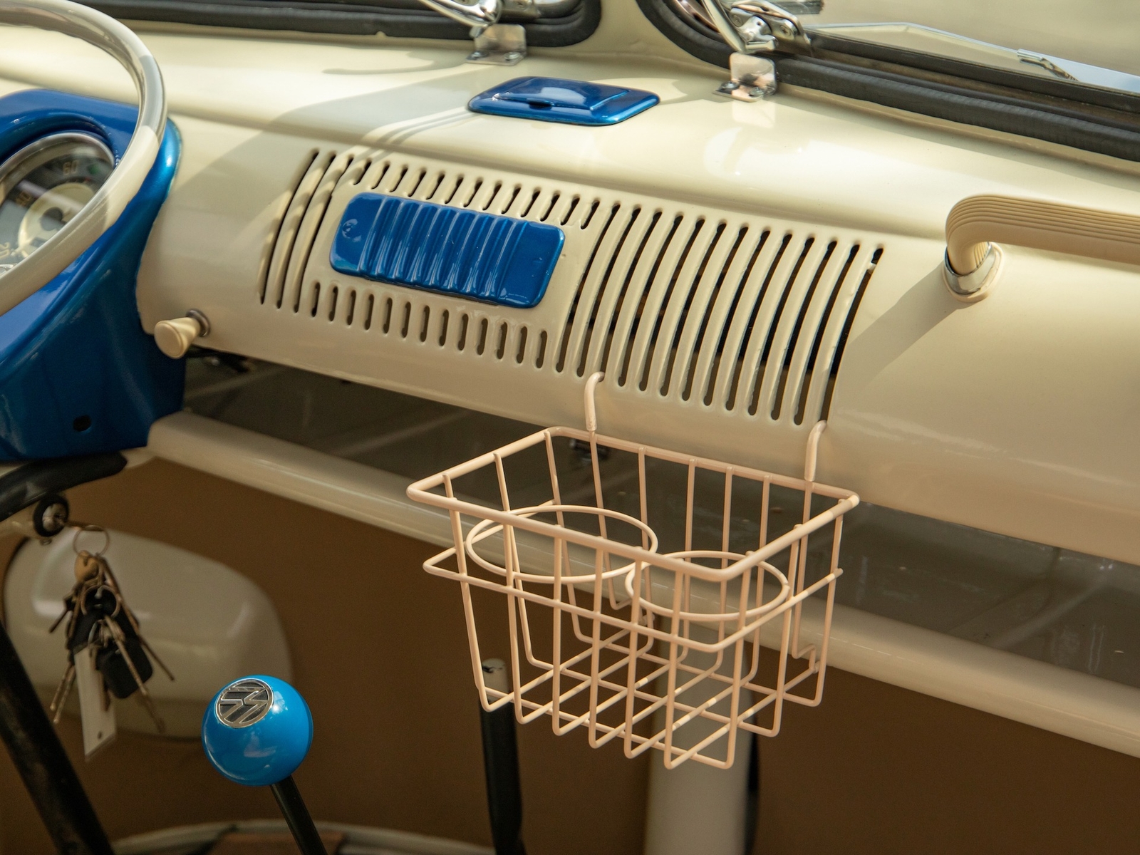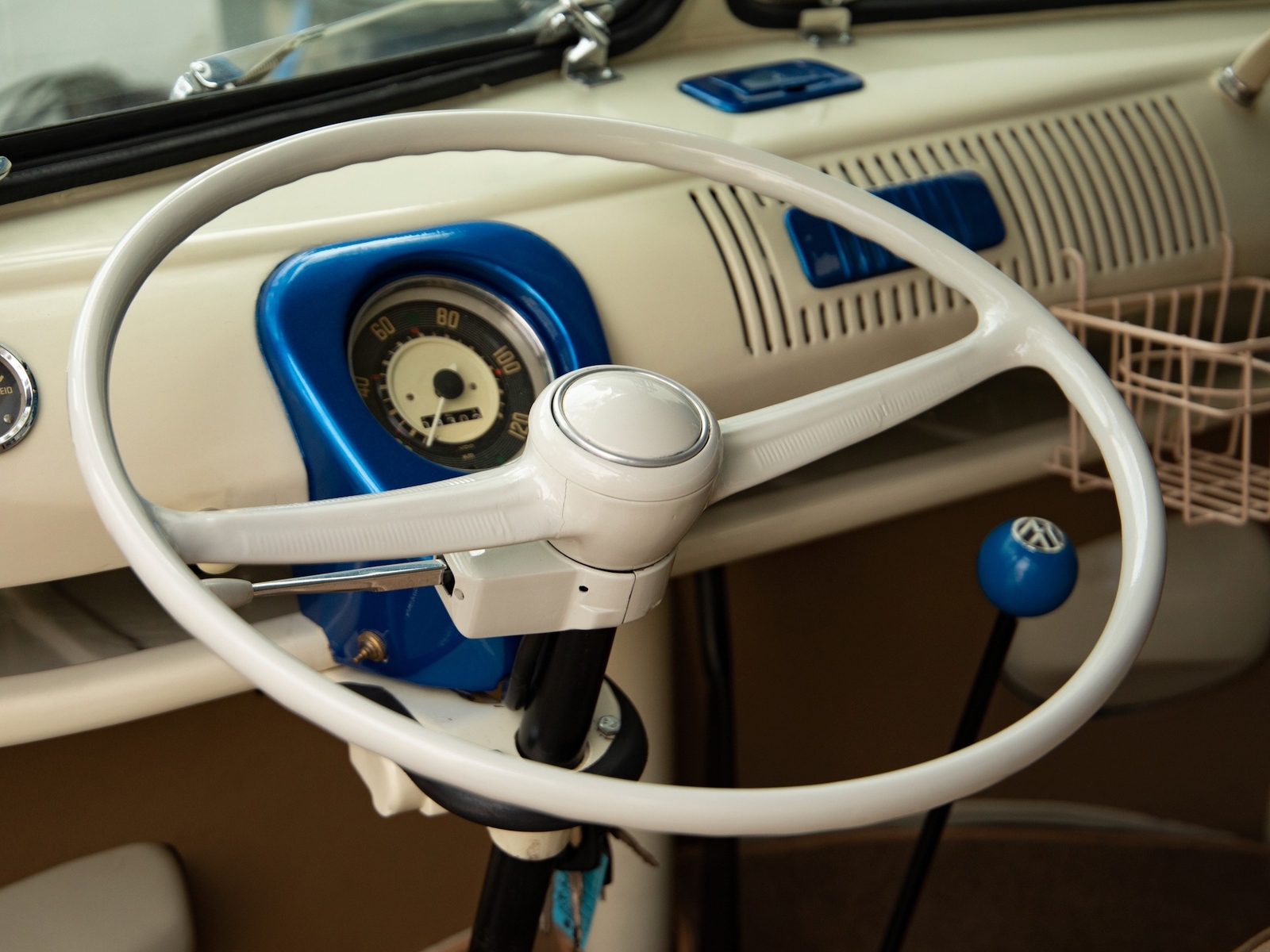 The bus is finished in two-tone colors with of Blue with an Ivory White top and a matching interior. It features safari front windows, two sets of pop-out windows on each side, a full center retractable ragtop sunroof, double cargo side doors and seating for nine. The rear wooden roof rack provides for additional storage.
