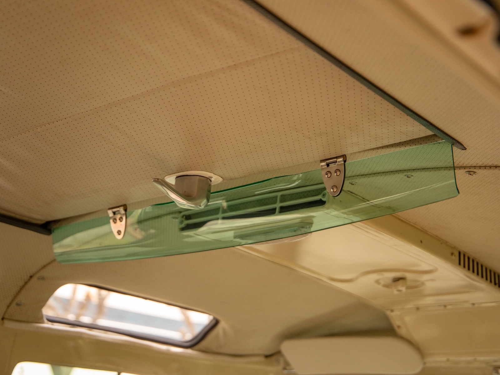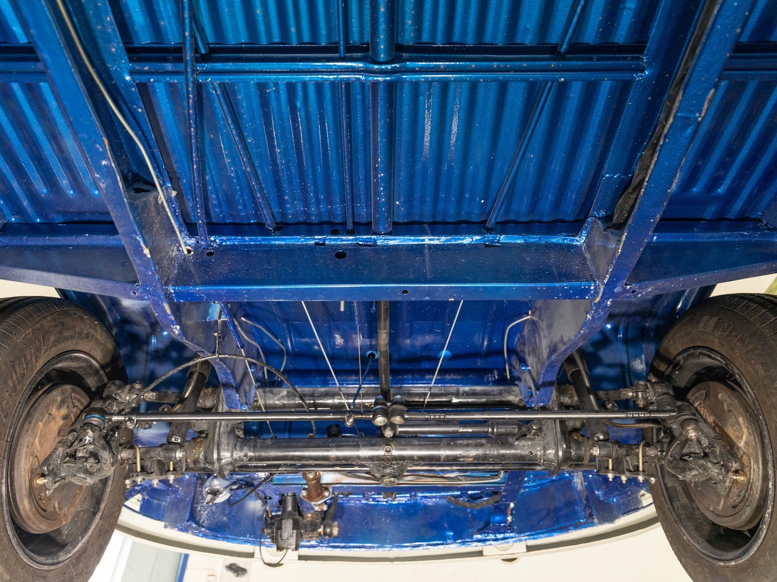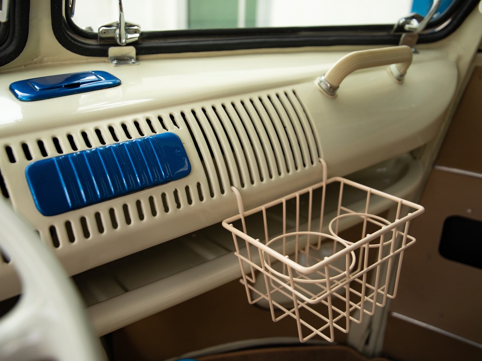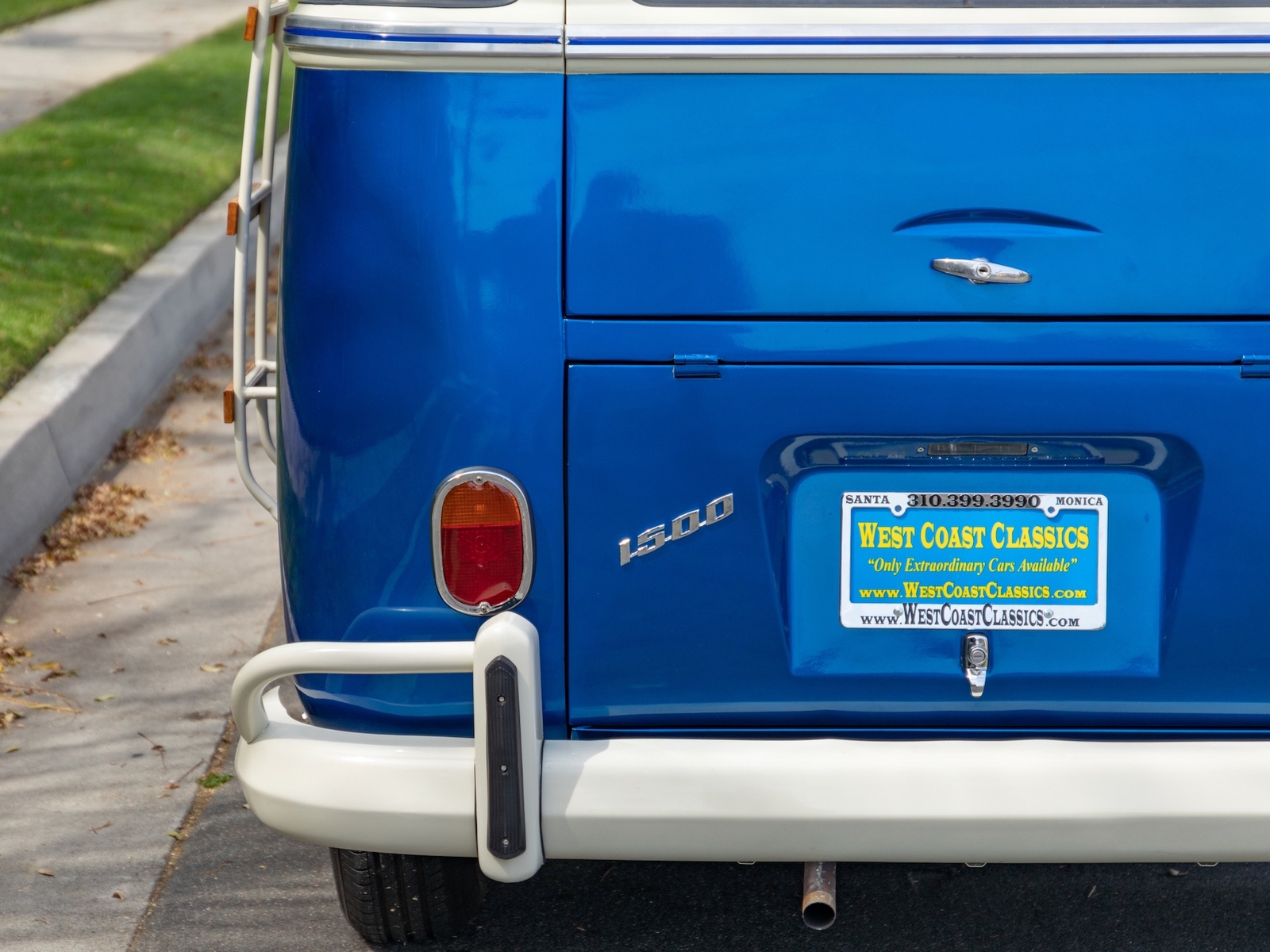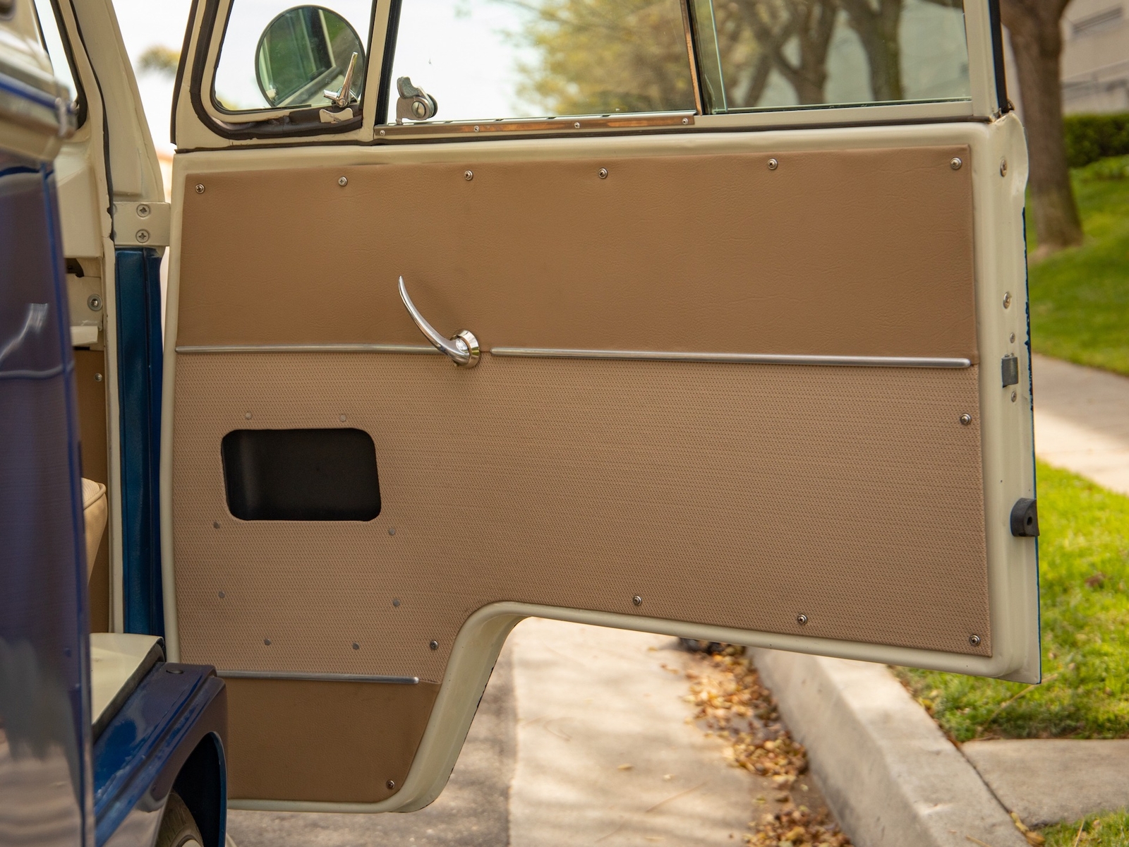 The bus is finished in two-tone colors with of Blue with an Ivory White top and a matching interior. It features safari front windows, two sets of pop-out windows on each side, a full center retractable ragtop sunroof, double cargo side doors and seating for nine. The rear wooden roof rack provides for additional storage.