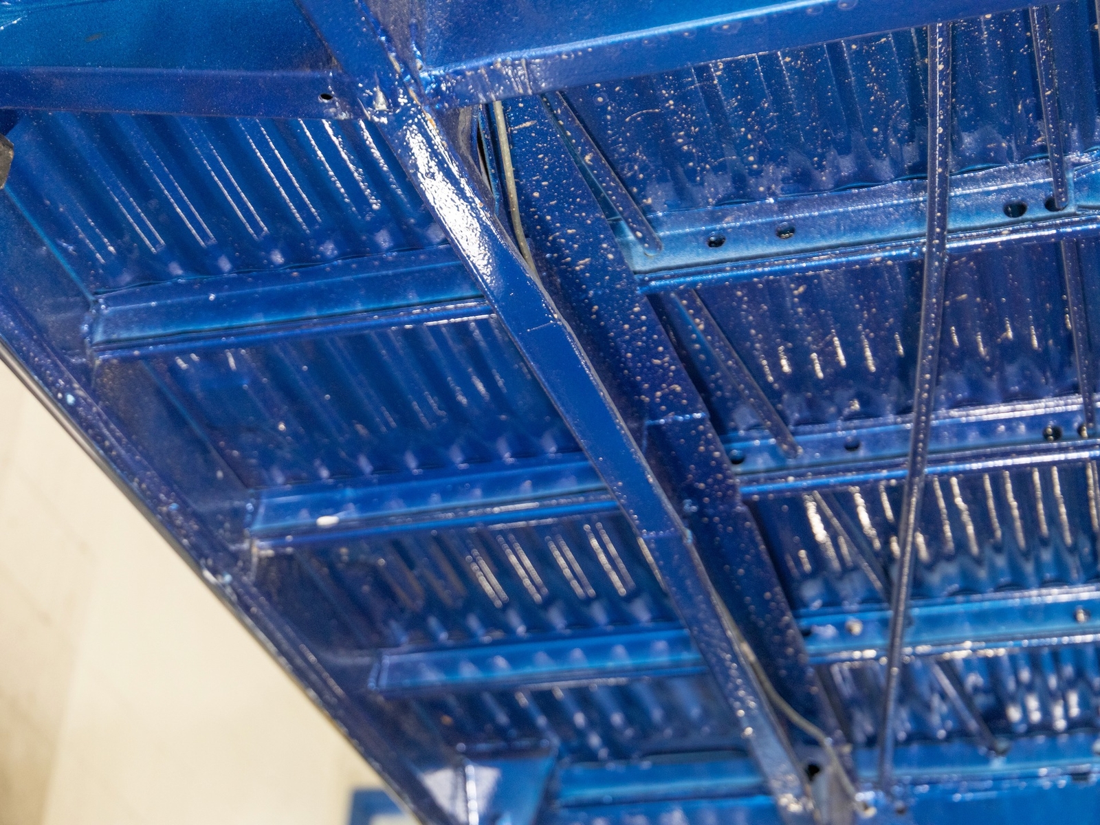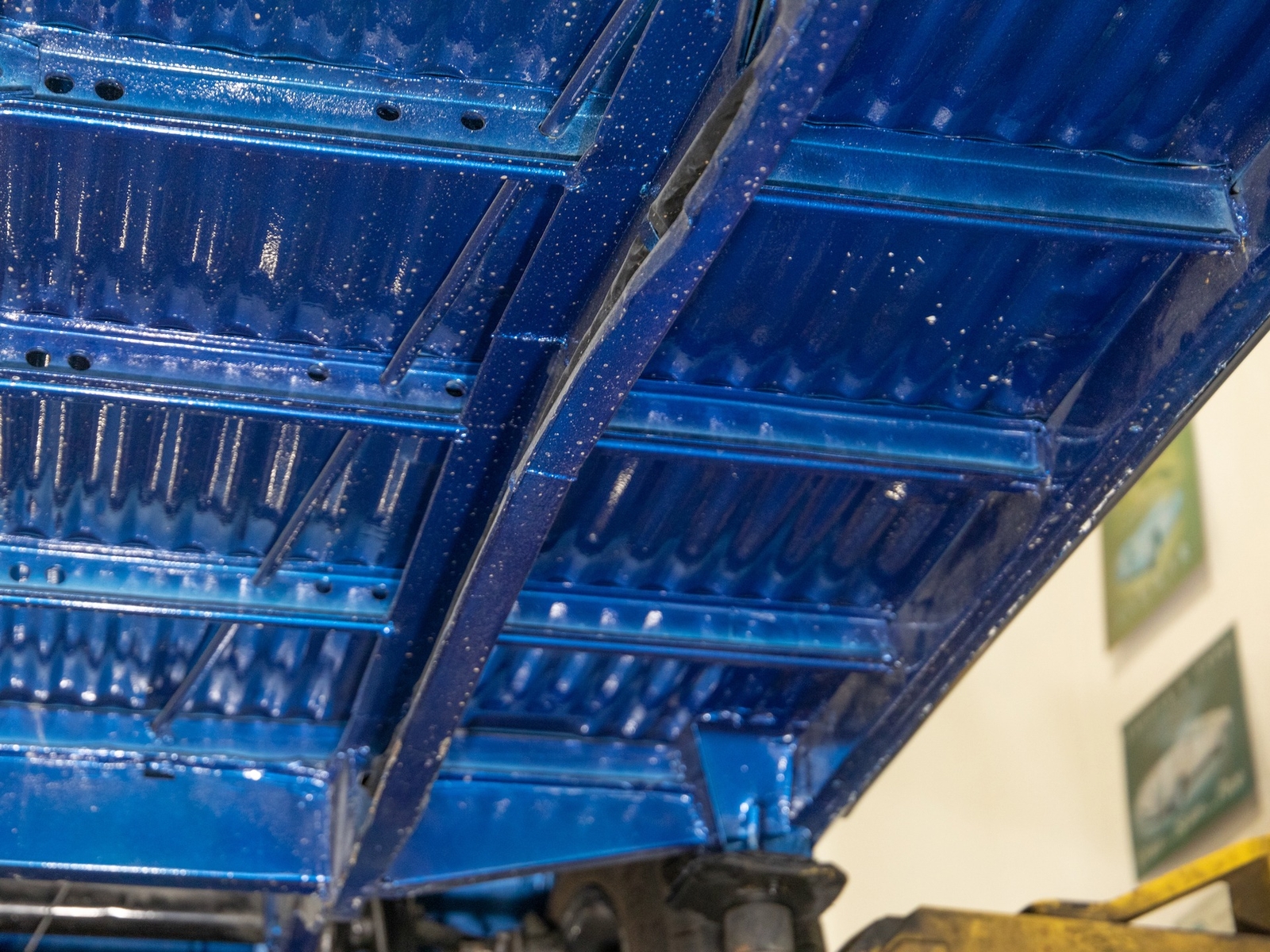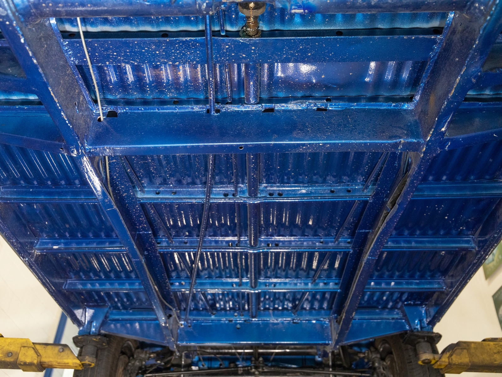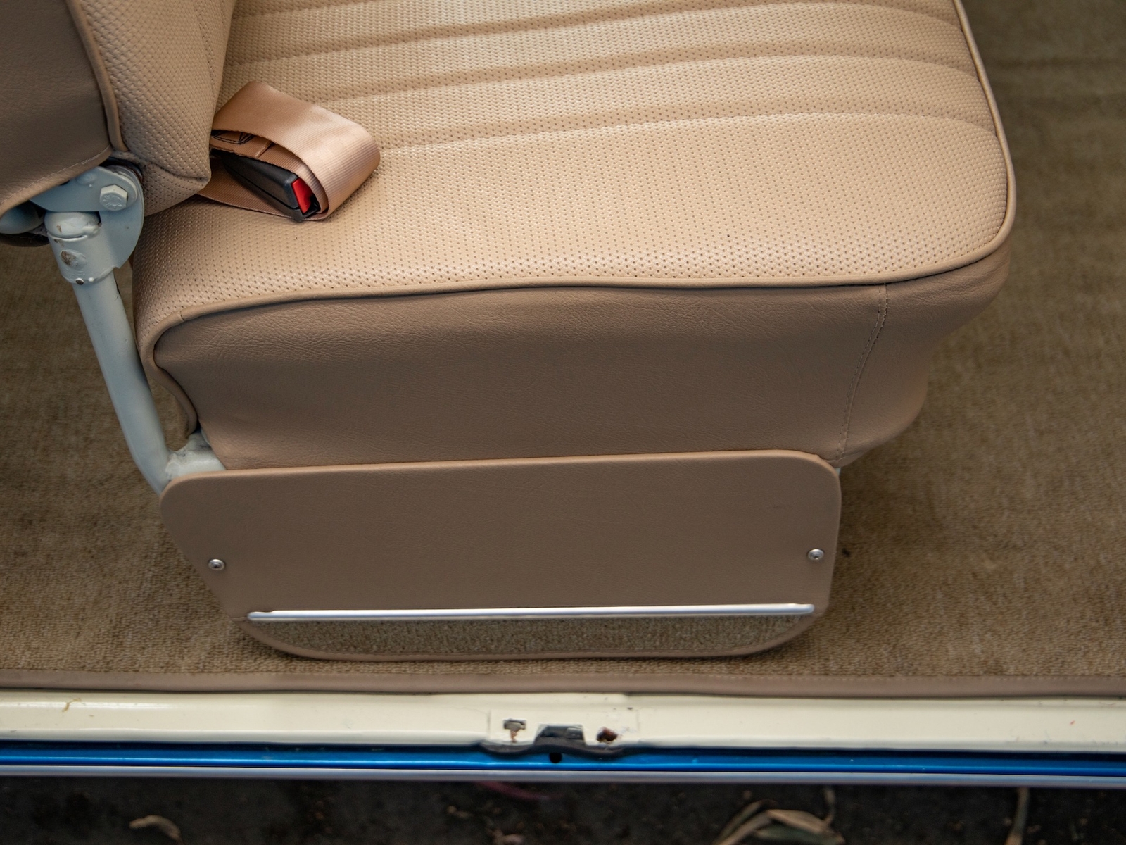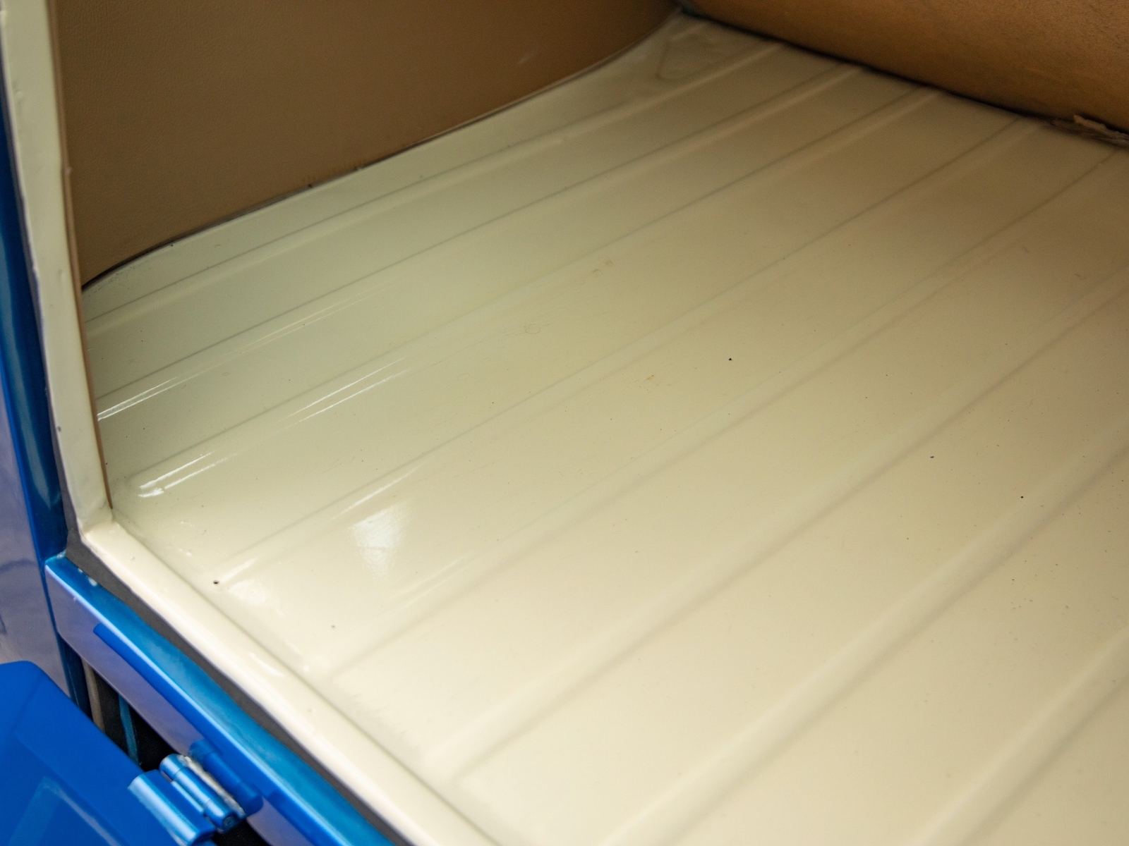 The bus is finished in two-tone colors with of Blue with an Ivory White top and a matching interior. It features safari front windows, two sets of pop-out windows on each side, a full center retractable ragtop sunroof, double cargo side doors and seating for nine. The rear wooden roof rack provides for additional storage.