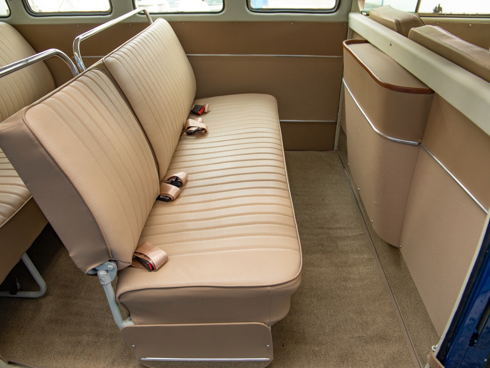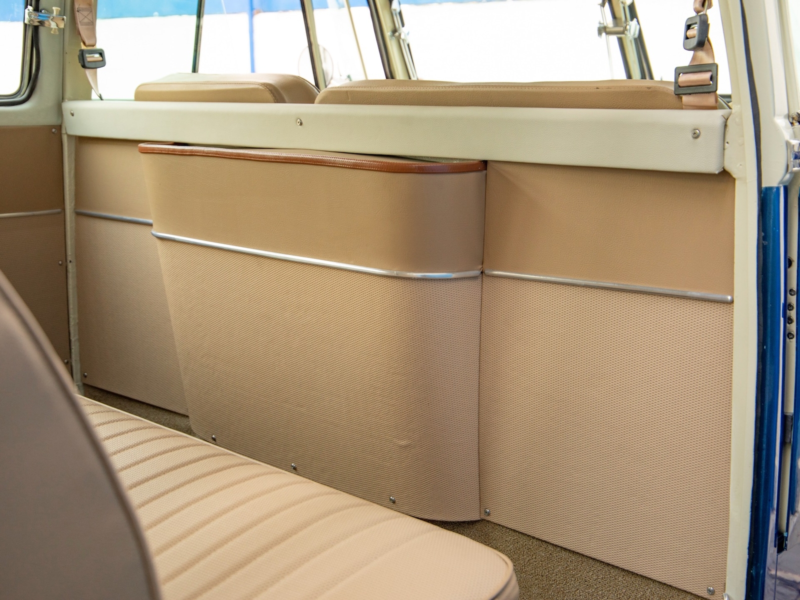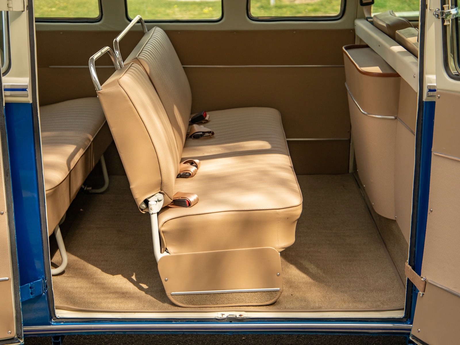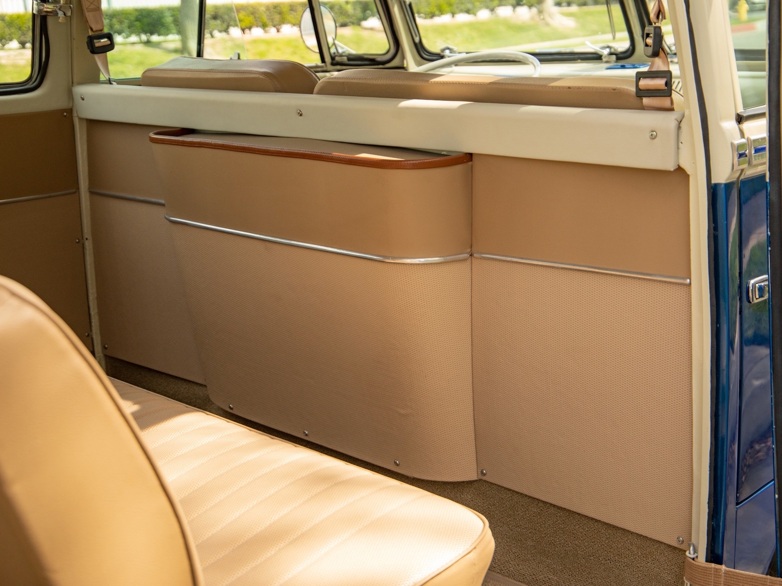 The body is straight and all the door and panel fits are as they should be and the bus is fitted with highly desirable 'original German' Safari front windows. The 1500 single carb 4 cylinder engine was completely rebuilt and is matched to a 4 speed manual transaxle. During the restoration, the complete drivetrain was refurbished, including the engine, gearbox, differential and reduction boxes as well as a new carburetor was installed along with a vacuum advanced electronic ignition distributor, ignition coil, spark plugs and wires. The suspension, steering and braking systems were also refurbished with new parts as well as the 12-volt electrical system. It features eight chrome framed panoramic samba windows, a retractable ragtop canvas sunroof, a split windshield with safari windows, a wider trunk lid and a roof rack and ladder that combines stainless steel and wood.