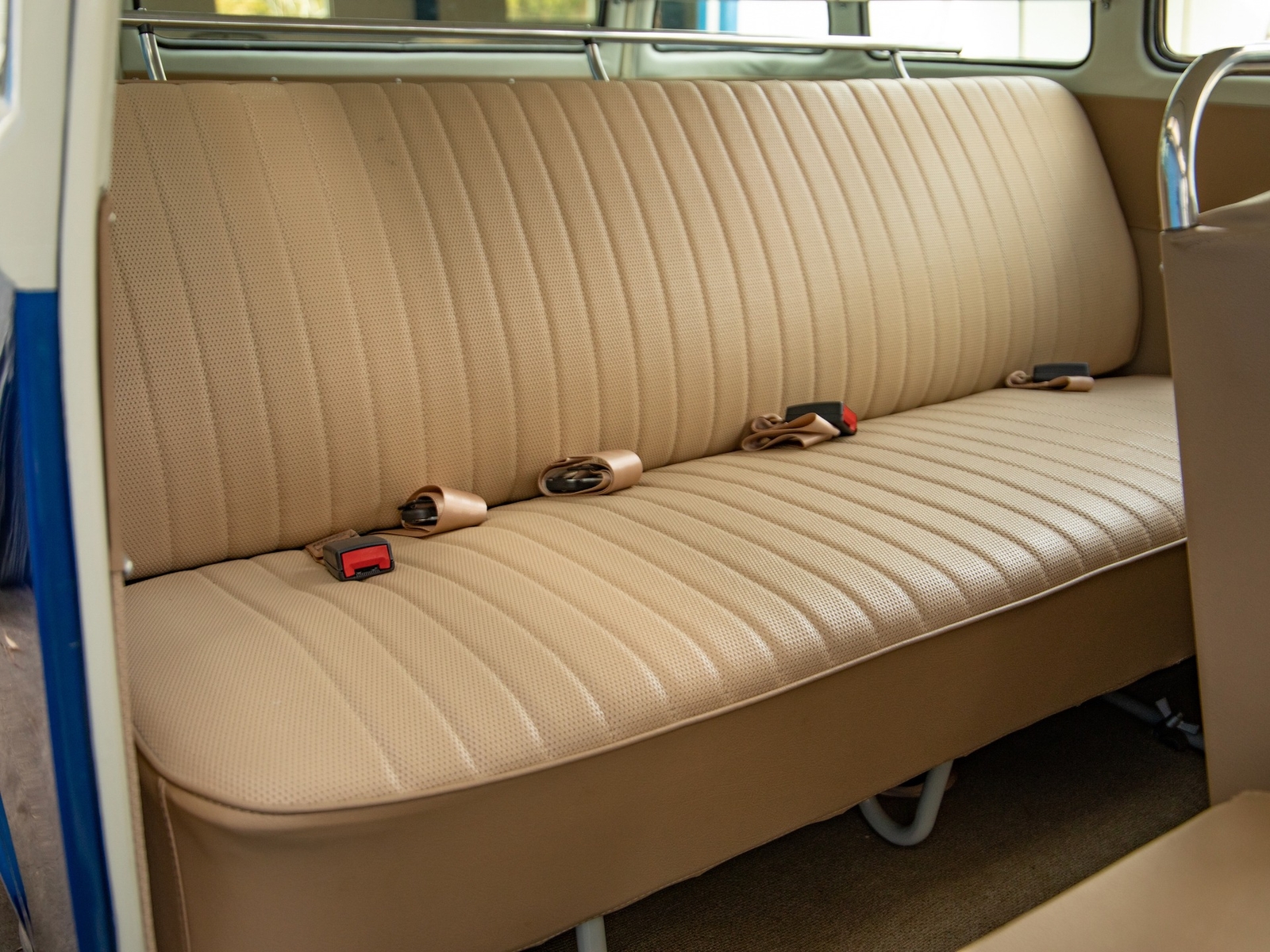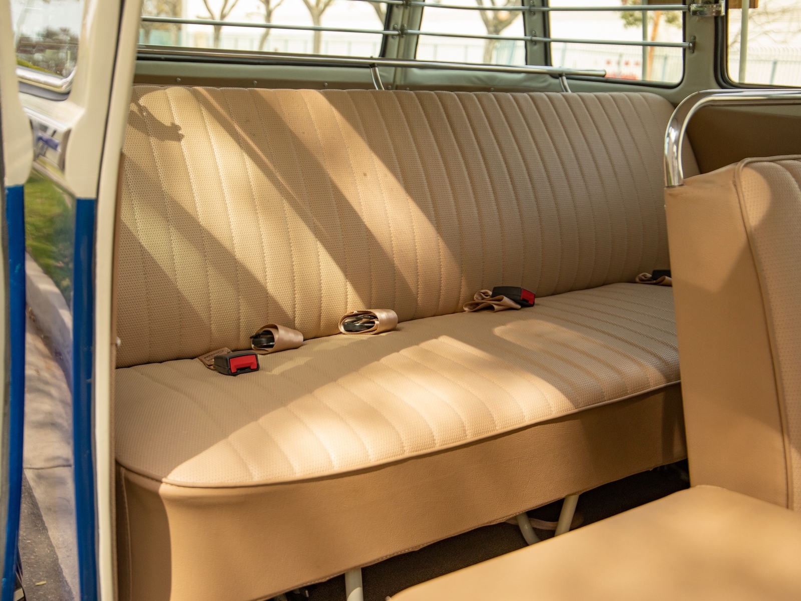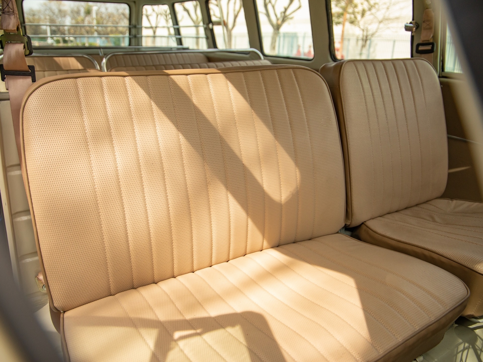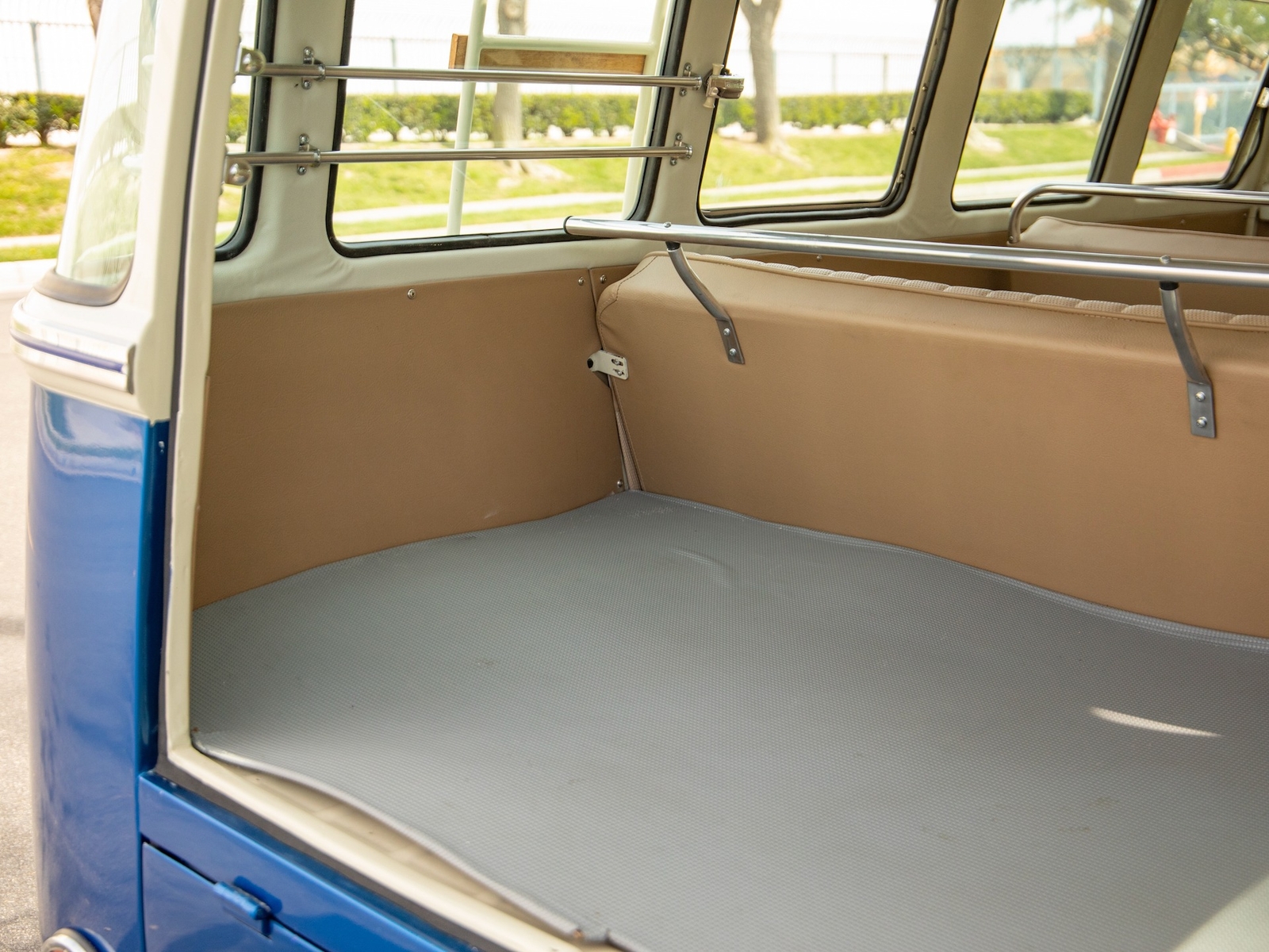 The body is straight and all the door and panel fits are as they should be and the bus is fitted with highly desirable 'original German' Safari front windows. The 1500 single carb 4 cylinder engine was completely rebuilt and is matched to a 4 speed manual transaxle. During the restoration, the complete drivetrain was refurbished, including the engine, gearbox, differential and reduction boxes as well as a new carburetor was installed along with a vacuum advanced electronic ignition distributor, ignition coil, spark plugs and wires. The suspension, steering and braking systems were also refurbished with new parts as well as the 12-volt electrical system. It features eight chrome framed panoramic samba windows, a retractable ragtop canvas sunroof, a split windshield with safari windows, a wider trunk lid and a roof rack and ladder that combines stainless steel and wood.