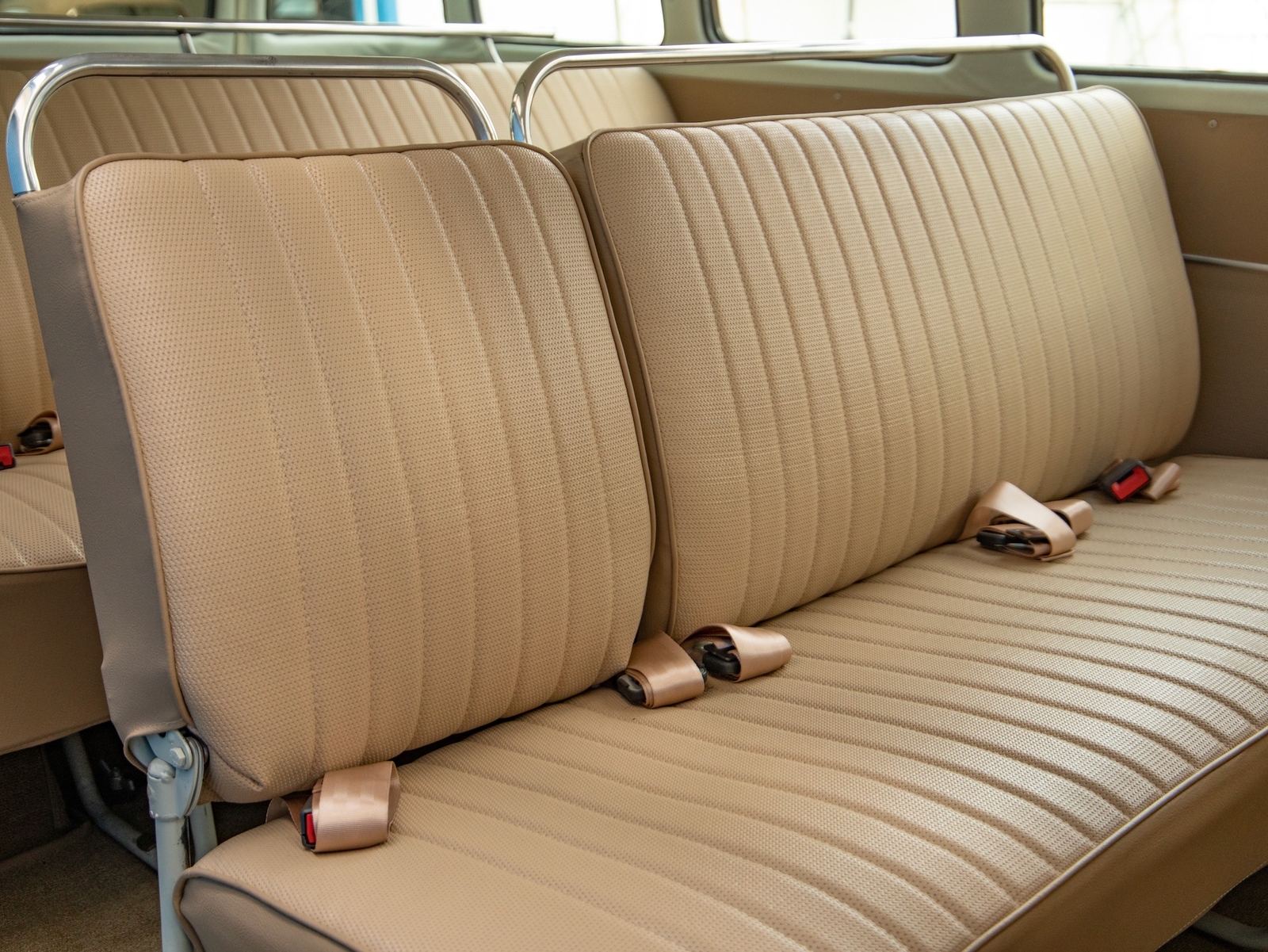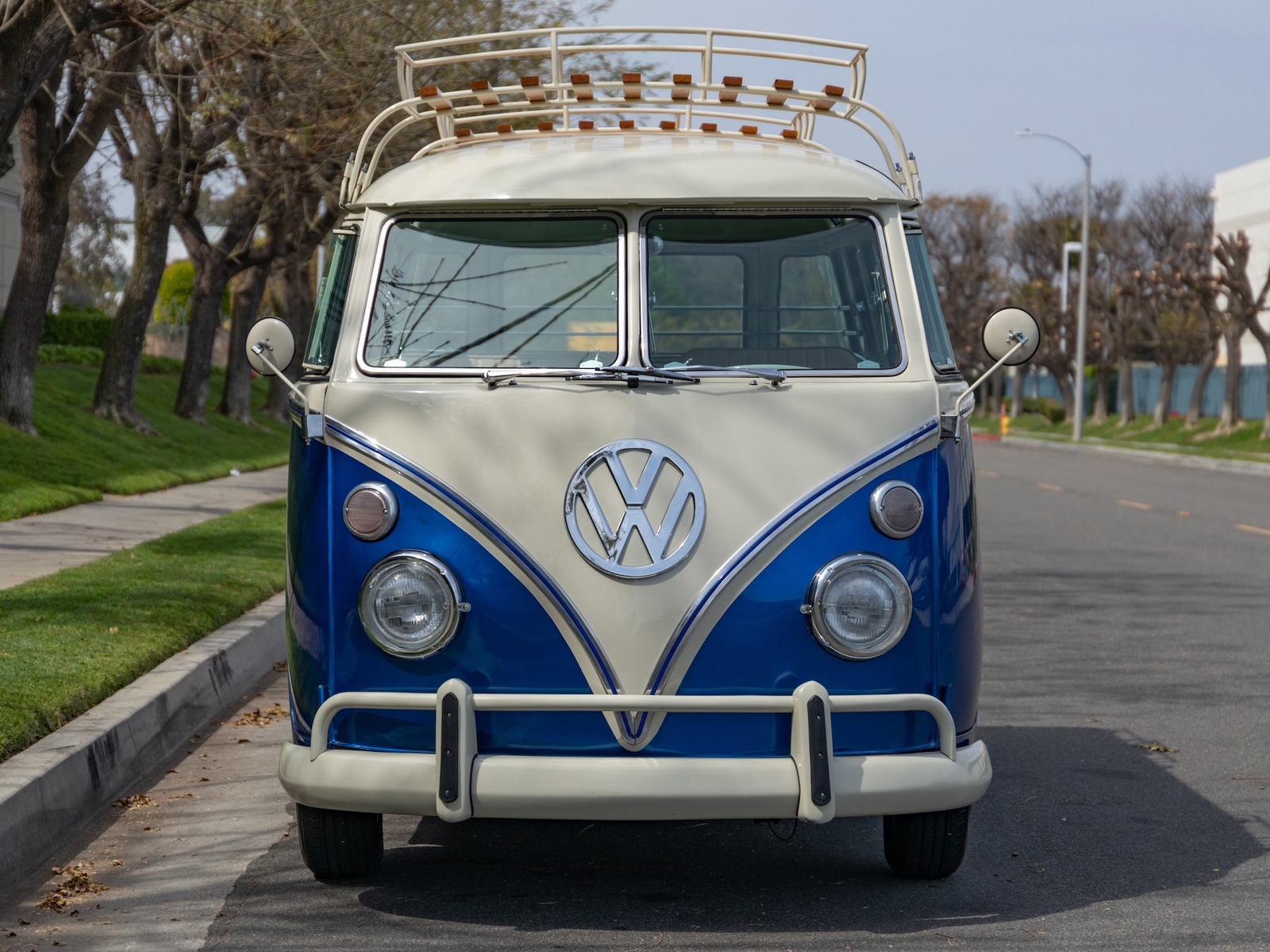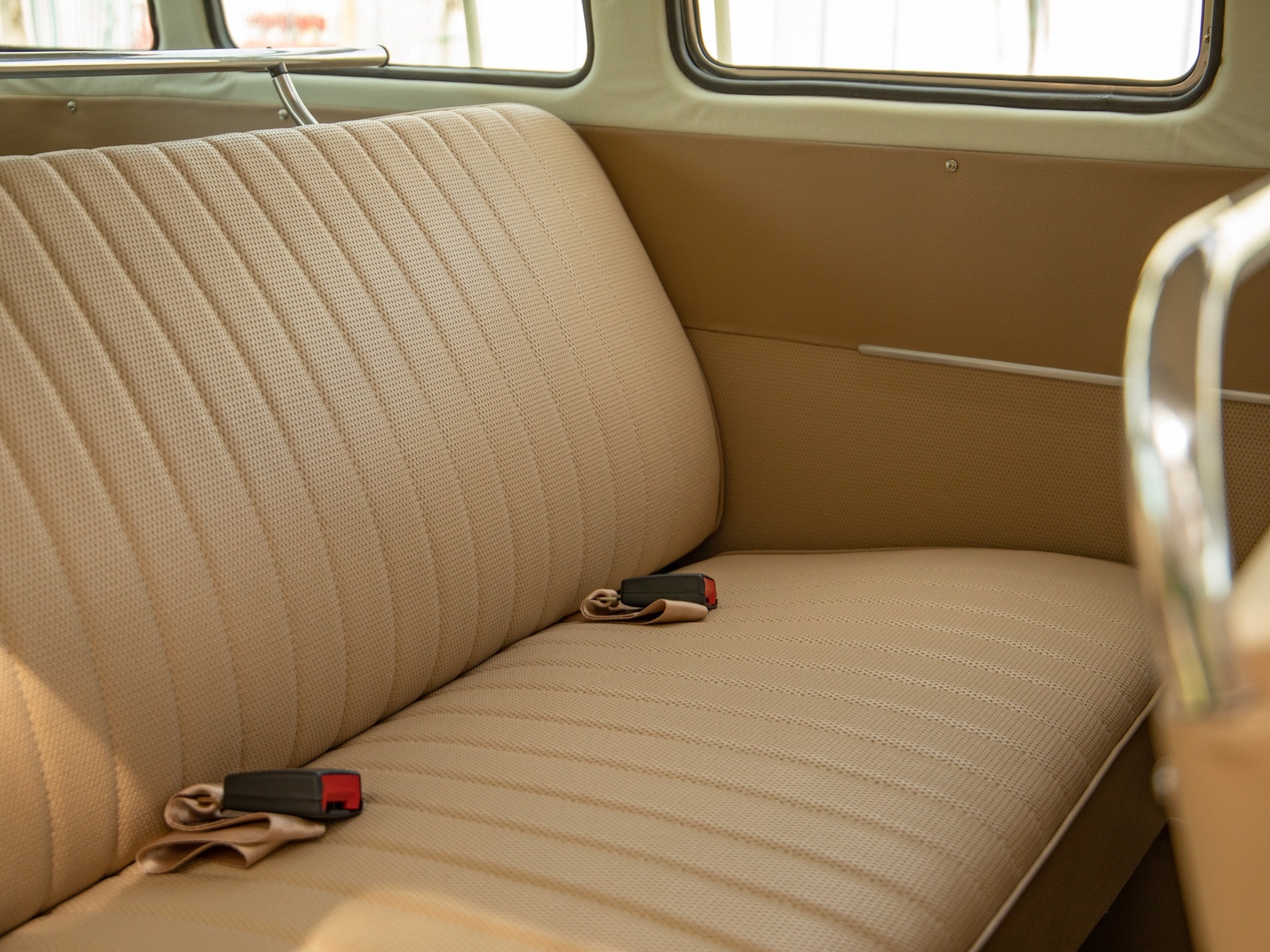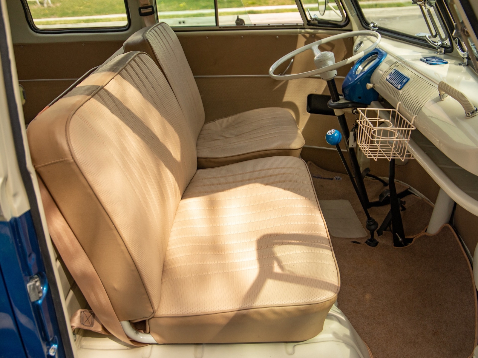 The body is straight and all the door and panel fits are as they should be and the bus is fitted with highly desirable 'original German' Safari front windows. The 1500 single carb 4 cylinder engine was completely rebuilt and is matched to a 4 speed manual transaxle. During the restoration, the complete drivetrain was refurbished, including the engine, gearbox, differential and reduction boxes as well as a new carburetor was installed along with a vacuum advanced electronic ignition distributor, ignition coil, spark plugs and wires. The suspension, steering and braking systems were also refurbished with new parts as well as the 12-volt electrical system. It features eight chrome framed panoramic samba windows, a retractable ragtop canvas sunroof, a split windshield with safari windows, a wider trunk lid and a roof rack and ladder that combines stainless steel and wood.