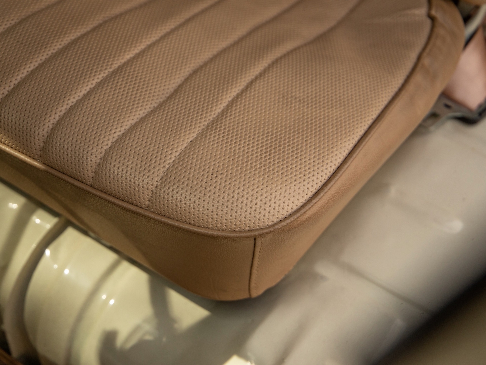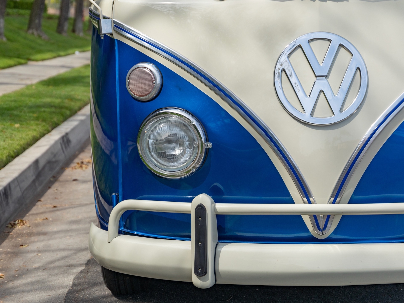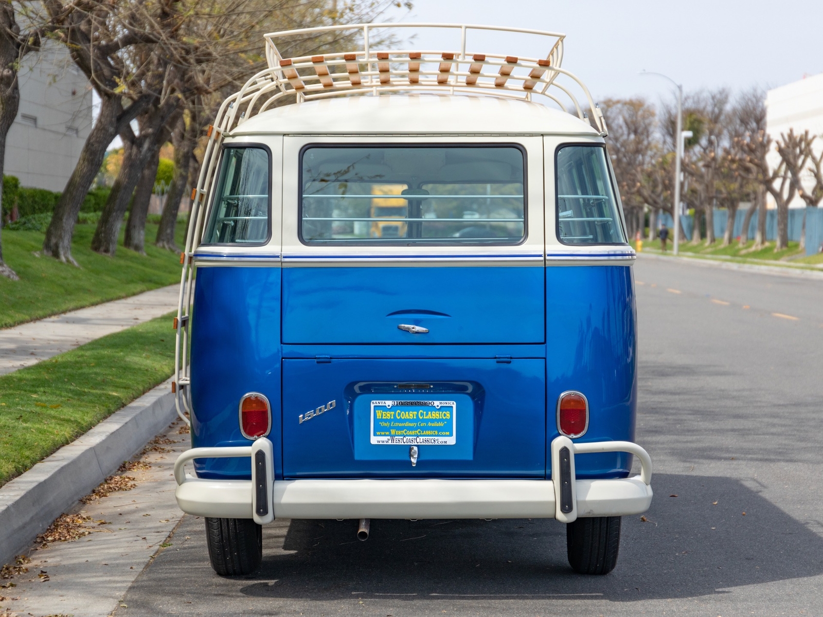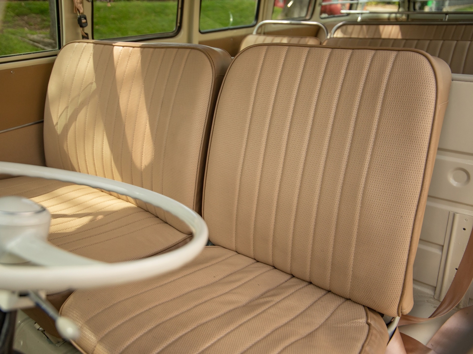 The body is straight and all the door and panel fits are as they should be and the bus is fitted with highly desirable 'original German' Safari front windows. The 1500 single carb 4 cylinder engine was completely rebuilt and is matched to a 4 speed manual transaxle. During the restoration, the complete drivetrain was refurbished, including the engine, gearbox, differential and reduction boxes as well as a new carburetor was installed along with a vacuum advanced electronic ignition distributor, ignition coil, spark plugs and wires. The suspension, steering and braking systems were also refurbished with new parts as well as the 12-volt electrical system. It features eight chrome framed panoramic samba windows, a retractable ragtop canvas sunroof, a split windshield with safari windows, a wider trunk lid and a roof rack and ladder that combines stainless steel and wood.