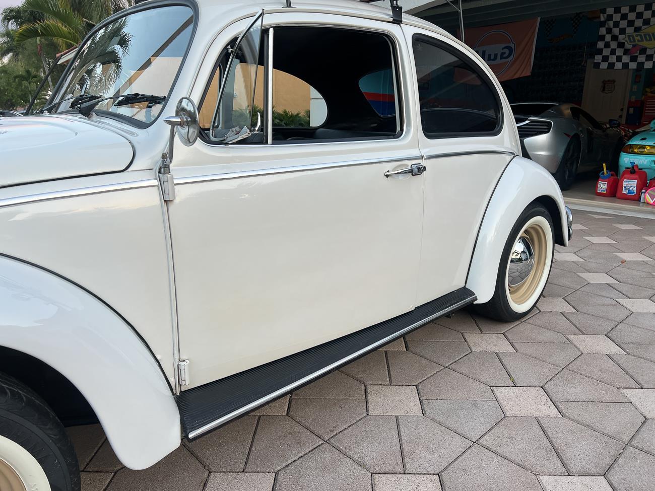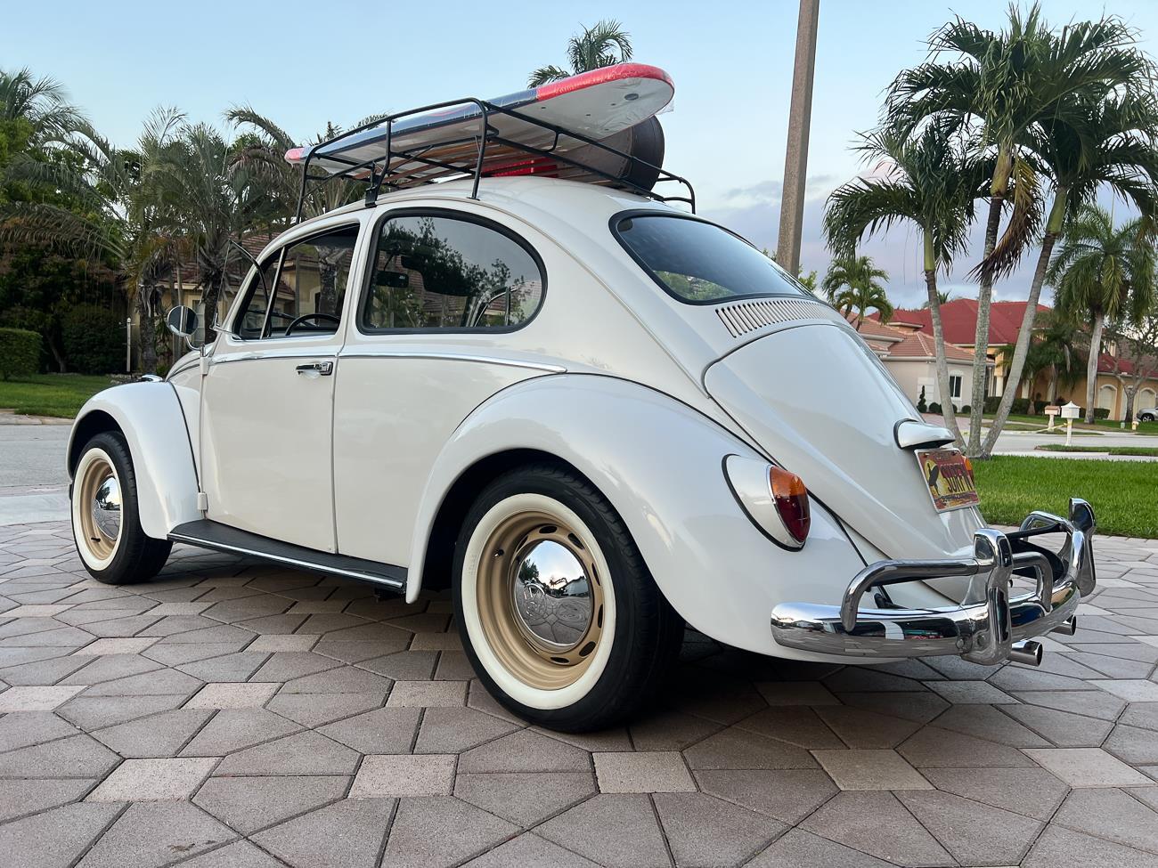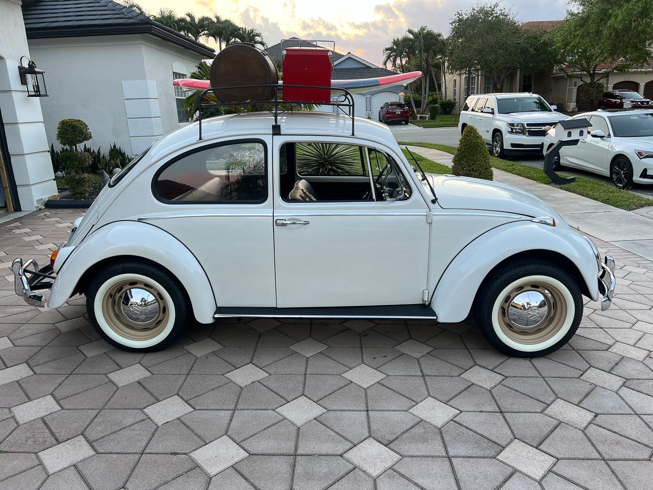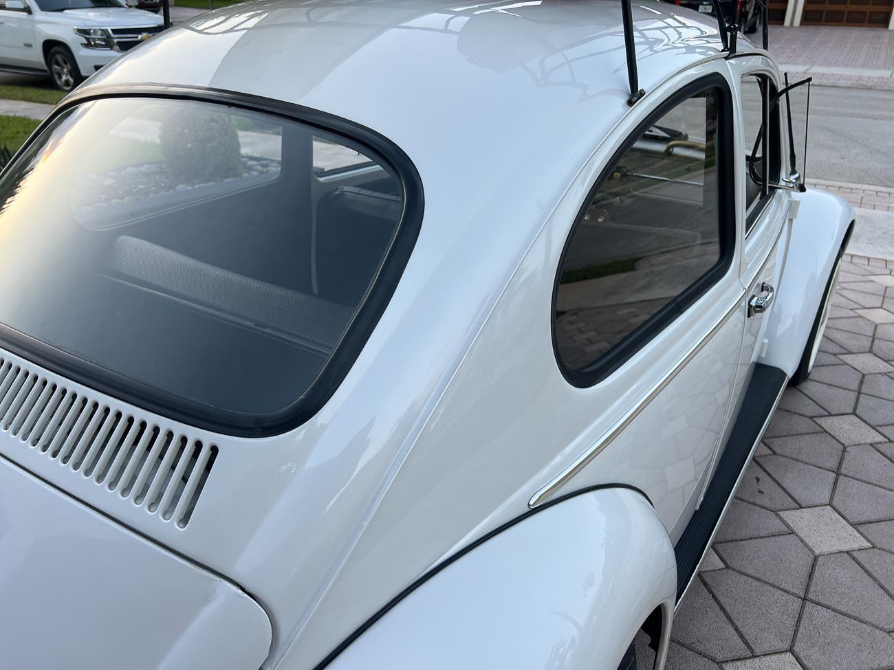 Call me 305-542-5662. Up for sale is my 1965 VW Beetle! German car. Finished in white with black interior! Roof rack! The beetle did receive a restoration by its previous owner, It drives well, you can take it to the car shows & for weekend cruises. Definitely gets a lot of attention & questions at the cars and coffee. The Beetle is powered by it's 1600cc engine, air cooled, It moves pretty good! It has a 4 speed manual transmission. Has a nice exhaust that sounds really nice. See the video. It has always been garage kept and well taken care. All the exterior chromes, trim, latches, bumperettes are all good. Underneath the floor pans are in great shape, everything was properly restored and looks good! It was fitted with steel wheels with chrome hubcaps and white wall, looks good.