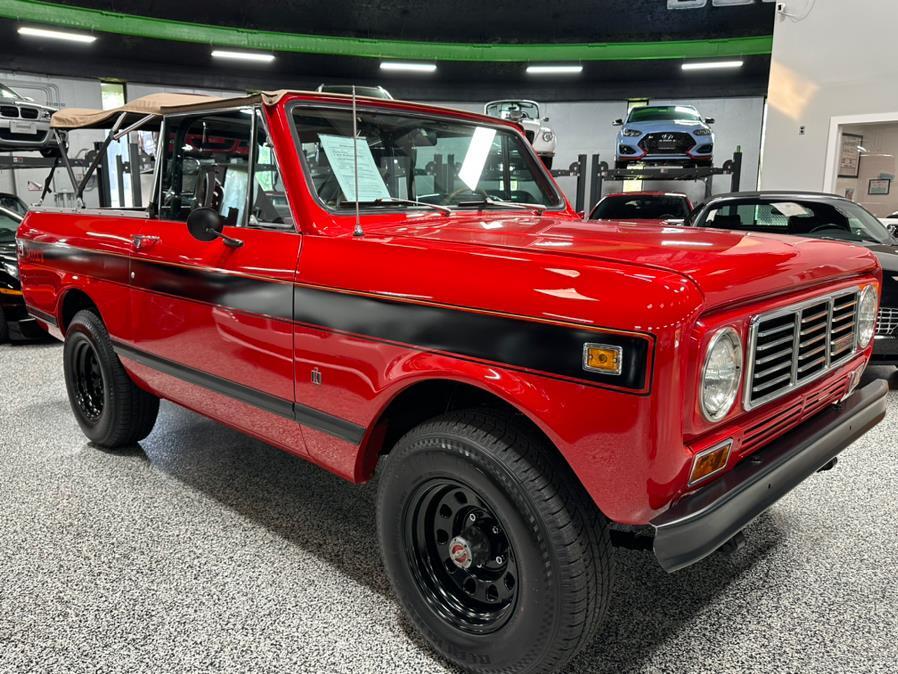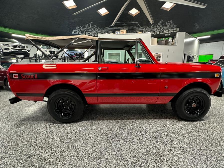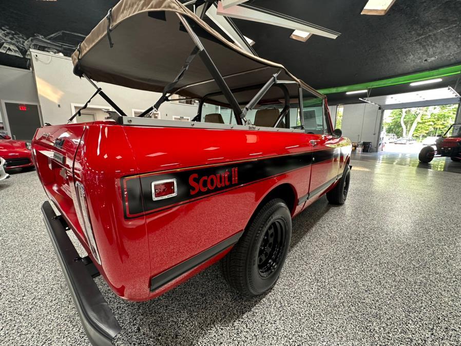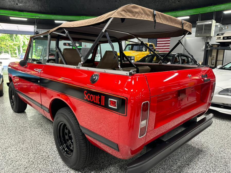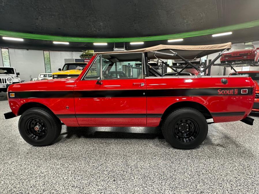 This 1977 International Harvester Scout II is finished in red over red and tan vinyl upholstery and is powered by a 345ci V8 mated to a three-speed automatic transmission and a two-speed transfer case. Equipment includes a tan folding soft top with removable side windows along with a Holley carburetor, 15? steel wheels, a roll bar, and a Kenwood CD stereo. recent work: Rebuilt the transmission and transfer case and overhauling the brakes along with replacing the shocks and leaf springs, ignition components, thermostat and housing, accessory belts, and the intake manifold and valve cover gaskets..