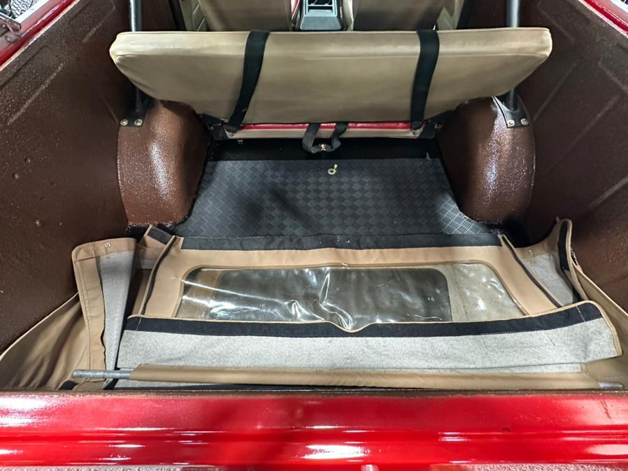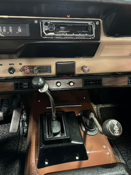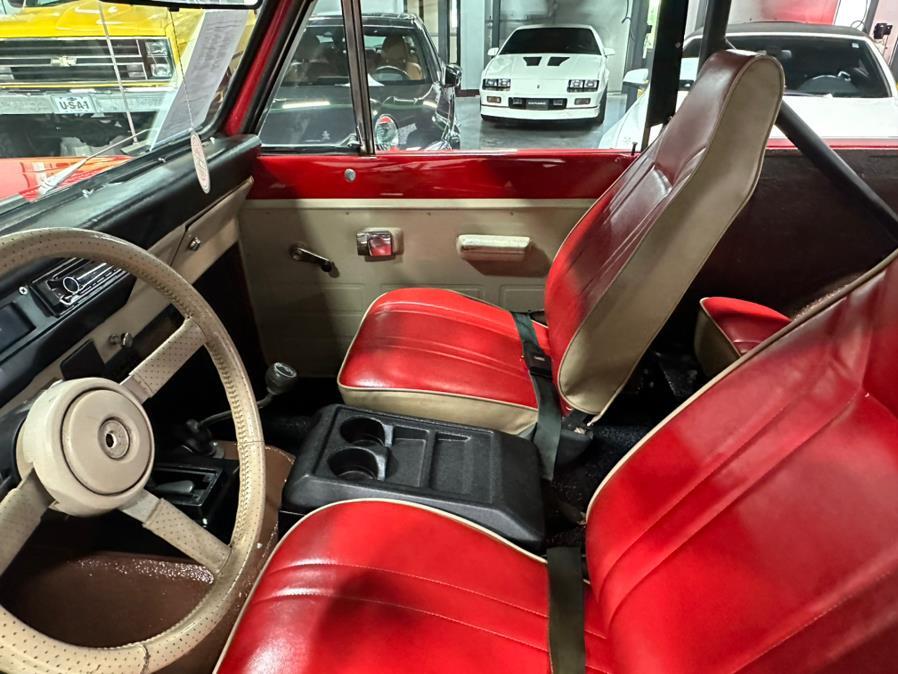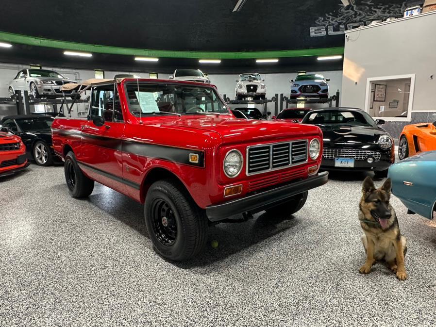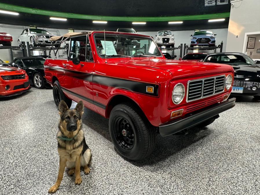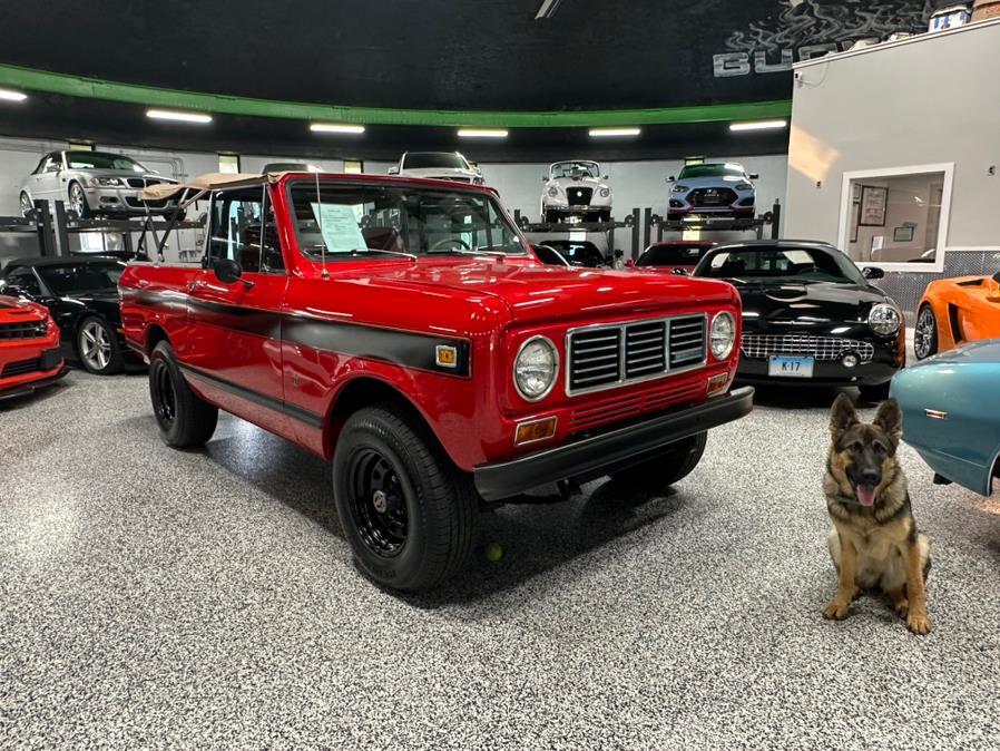 This 1977 International Harvester Scout II is finished in red over red and tan vinyl upholstery and is powered by a 345ci V8 mated to a three-speed automatic transmission and a two-speed transfer case. Equipment includes a tan folding soft top with removable side windows along with a Holley carburetor, 15? steel wheels, a roll bar, and a Kenwood CD stereo. recent work: Rebuilt the transmission and transfer case and overhauling the brakes along with replacing the shocks and leaf springs, ignition components, thermostat and housing, accessory belts, and the intake manifold and valve cover gaskets..