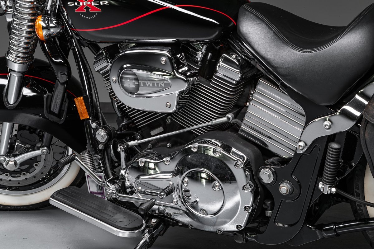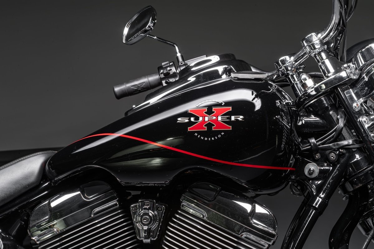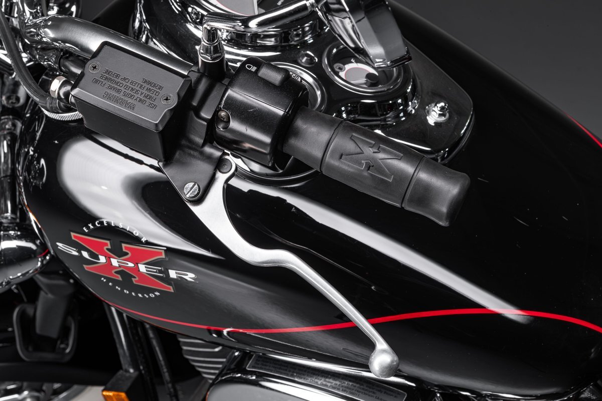 Jamie or Librandis Plating in Harrisburg, PA, have re-chromed or replaced many parts around 2005. Although early production Super X bikes were often two-tone, this is a rare black-on-black example. It is believed that the individual parts manufacturer painted the fuel tanks and fenders and not Excelsior-Henderson, so solid-color bikes often had slightly different colors on these three components. To correct this minor variation in component color, the new tank (after properly coating the inside with a red coat) and fenders were expertly painted to the original black with factory-correct red pinstripes in 2005. The result is spectacular, with many show-quality chrome parts and glossy, clear-coated, deep black paint.