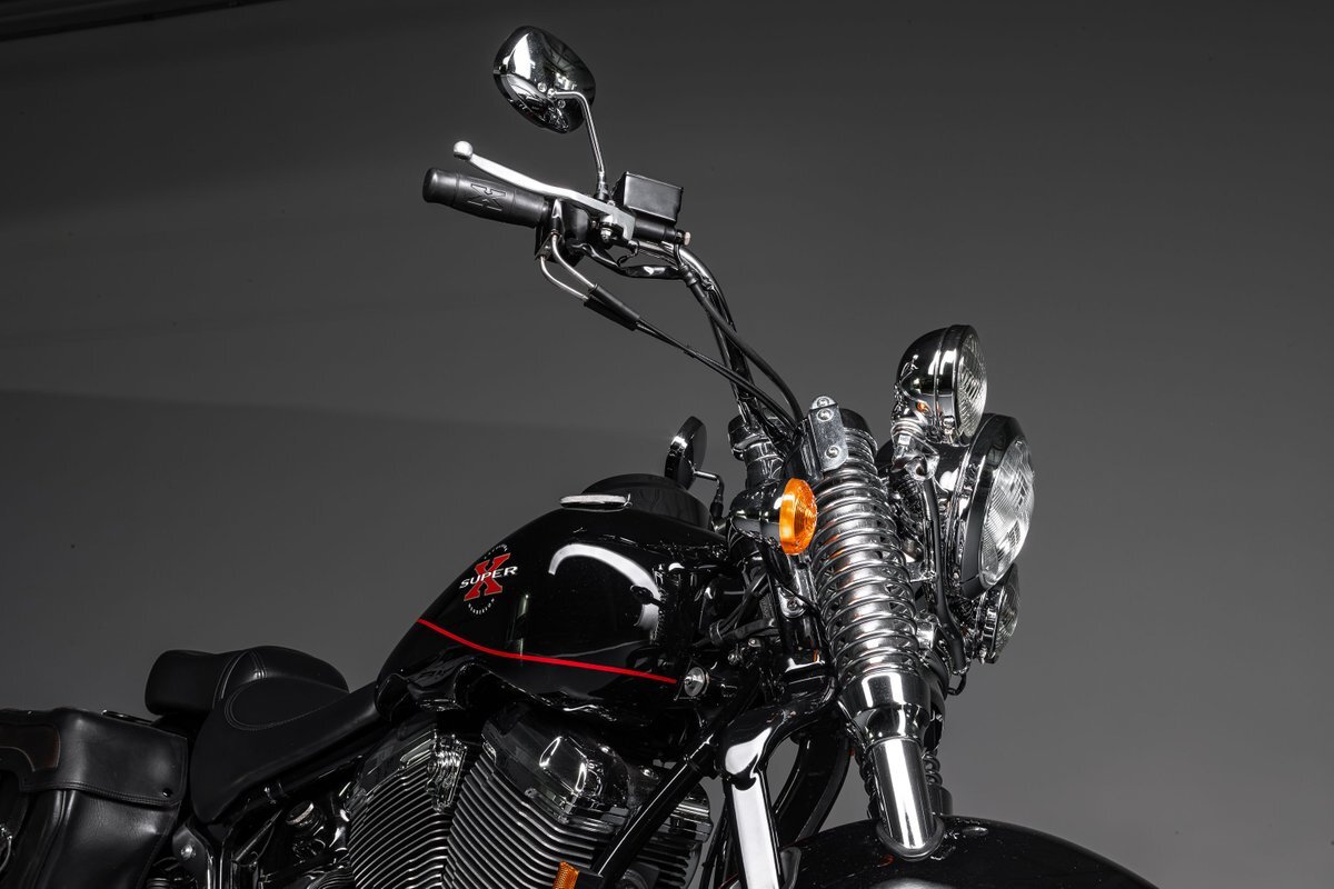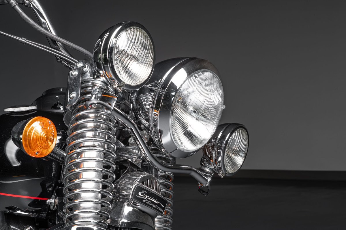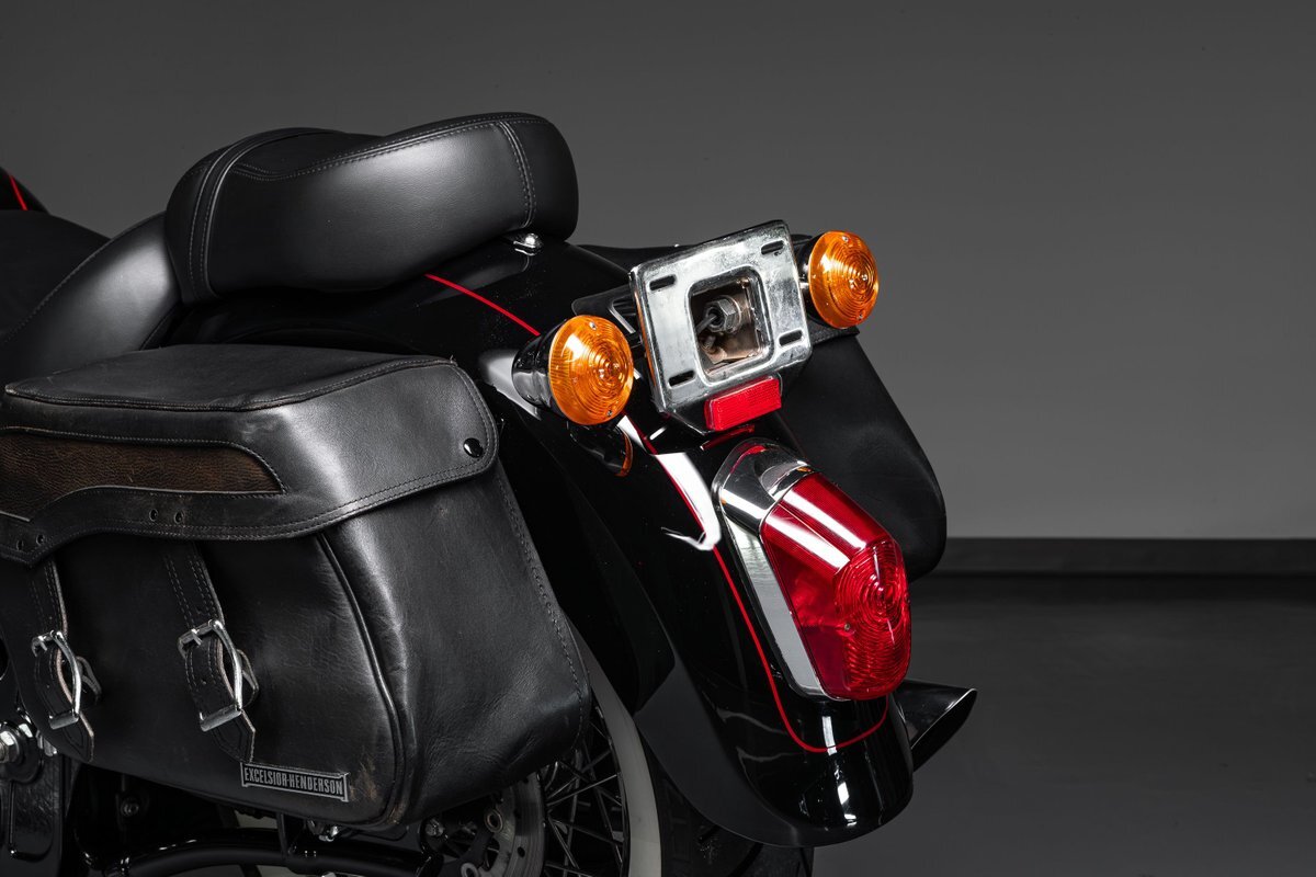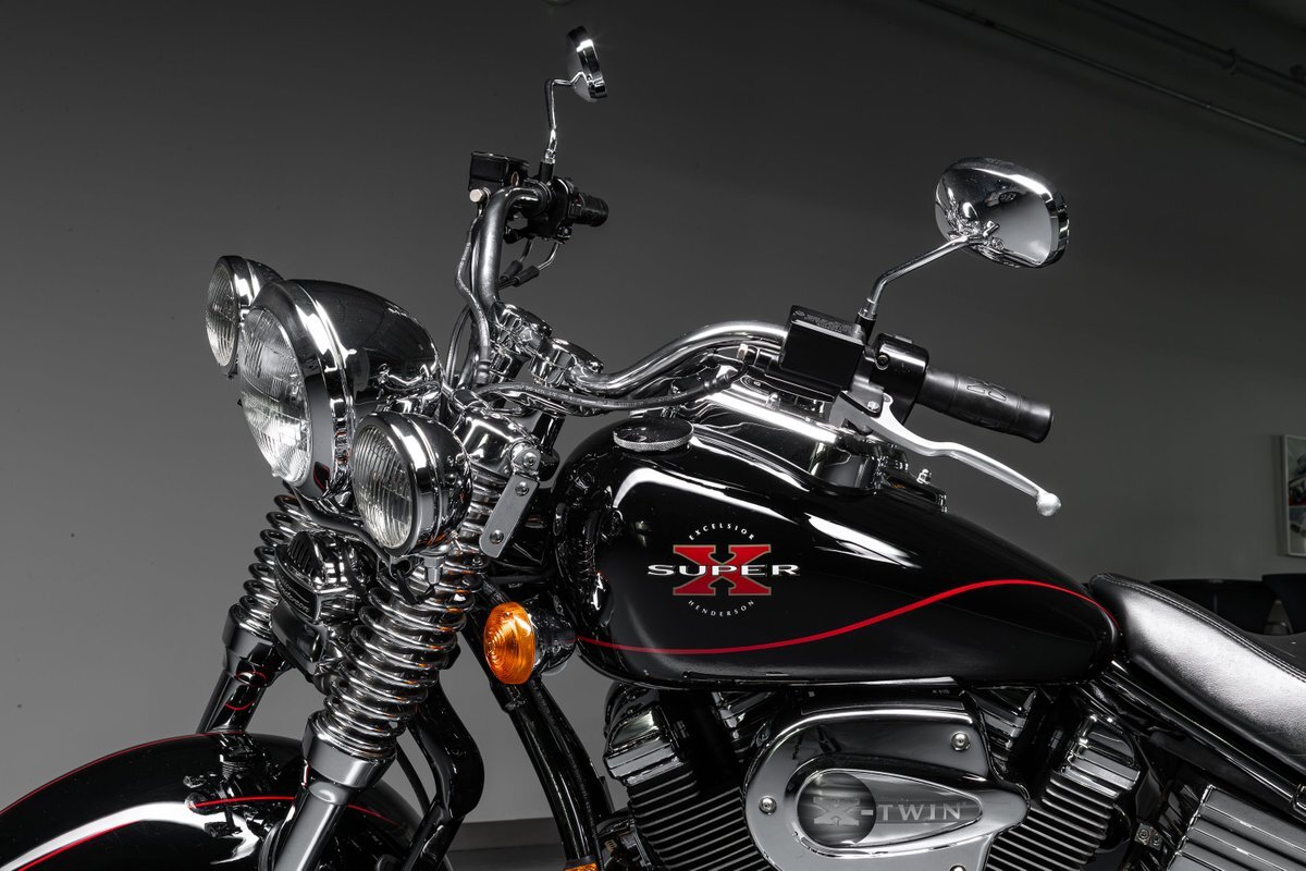 Jamie or Librandis Plating in Harrisburg, PA, have re-chromed or replaced many parts around 2005. Although early production Super X bikes were often two-tone, this is a rare black-on-black example. It is believed that the individual parts manufacturer painted the fuel tanks and fenders and not Excelsior-Henderson, so solid-color bikes often had slightly different colors on these three components. To correct this minor variation in component color, the new tank (after properly coating the inside with a red coat) and fenders were expertly painted to the original black with factory-correct red pinstripes in 2005. The result is spectacular, with many show-quality chrome parts and glossy, clear-coated, deep black paint.