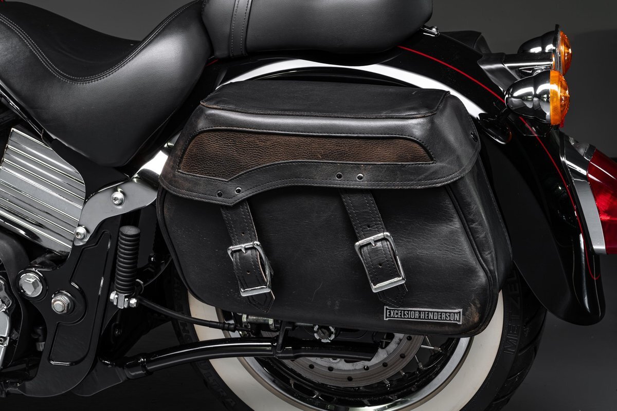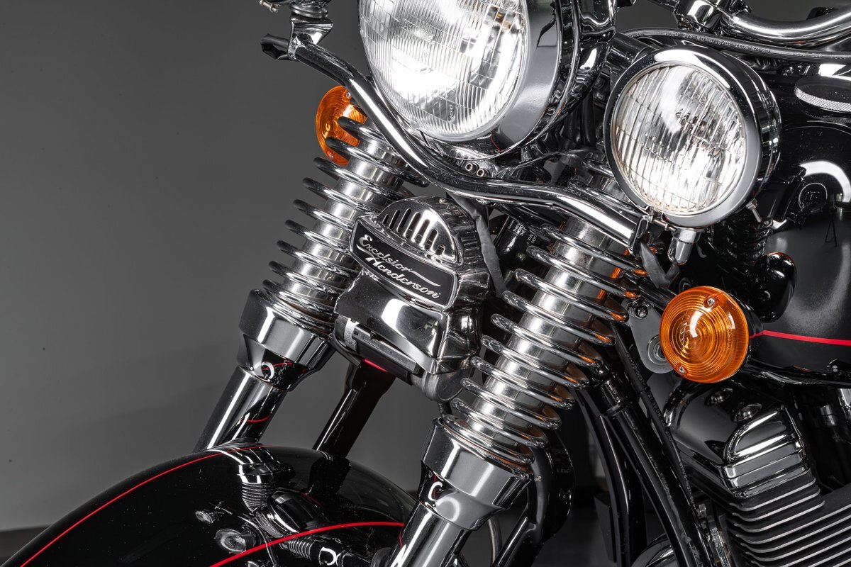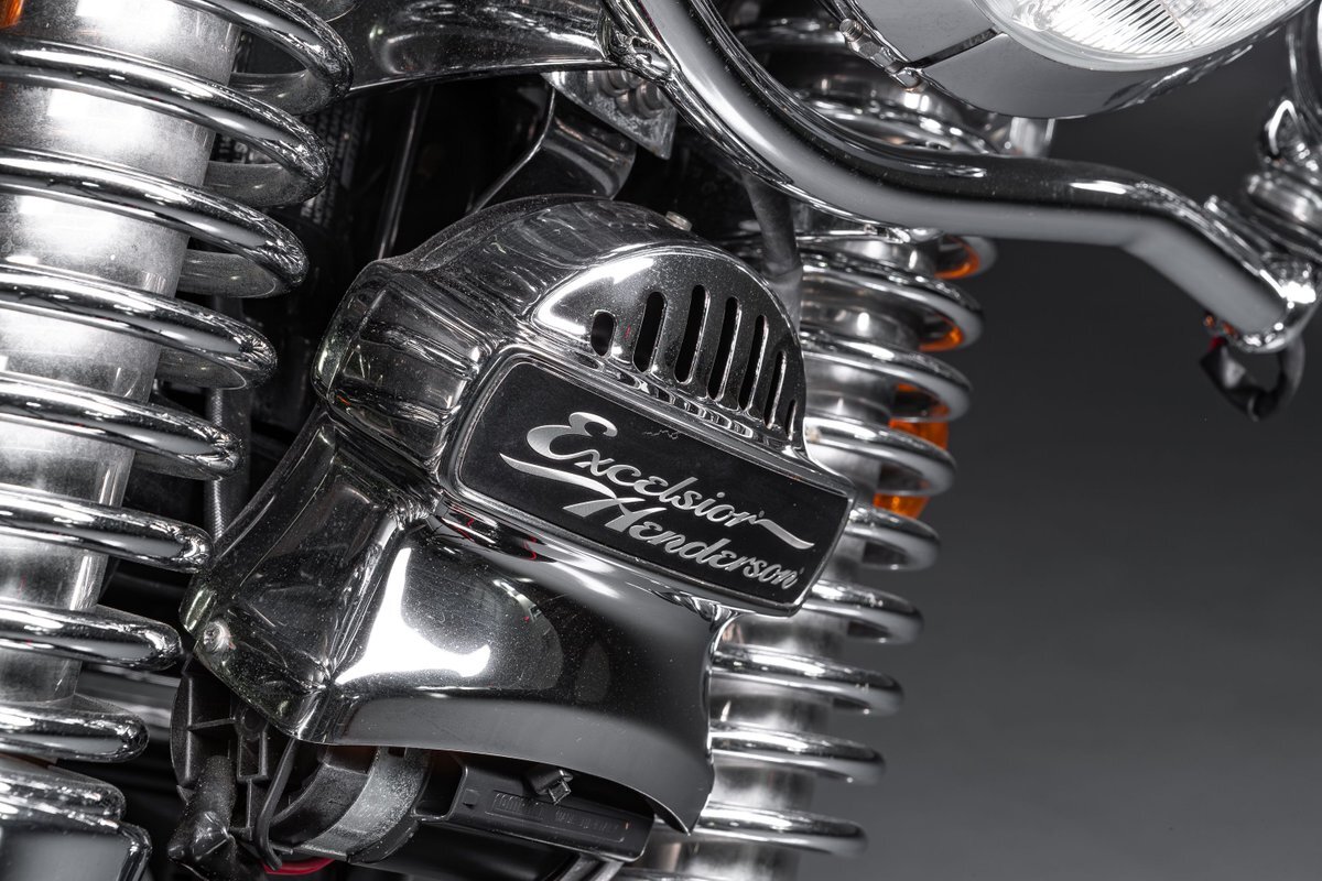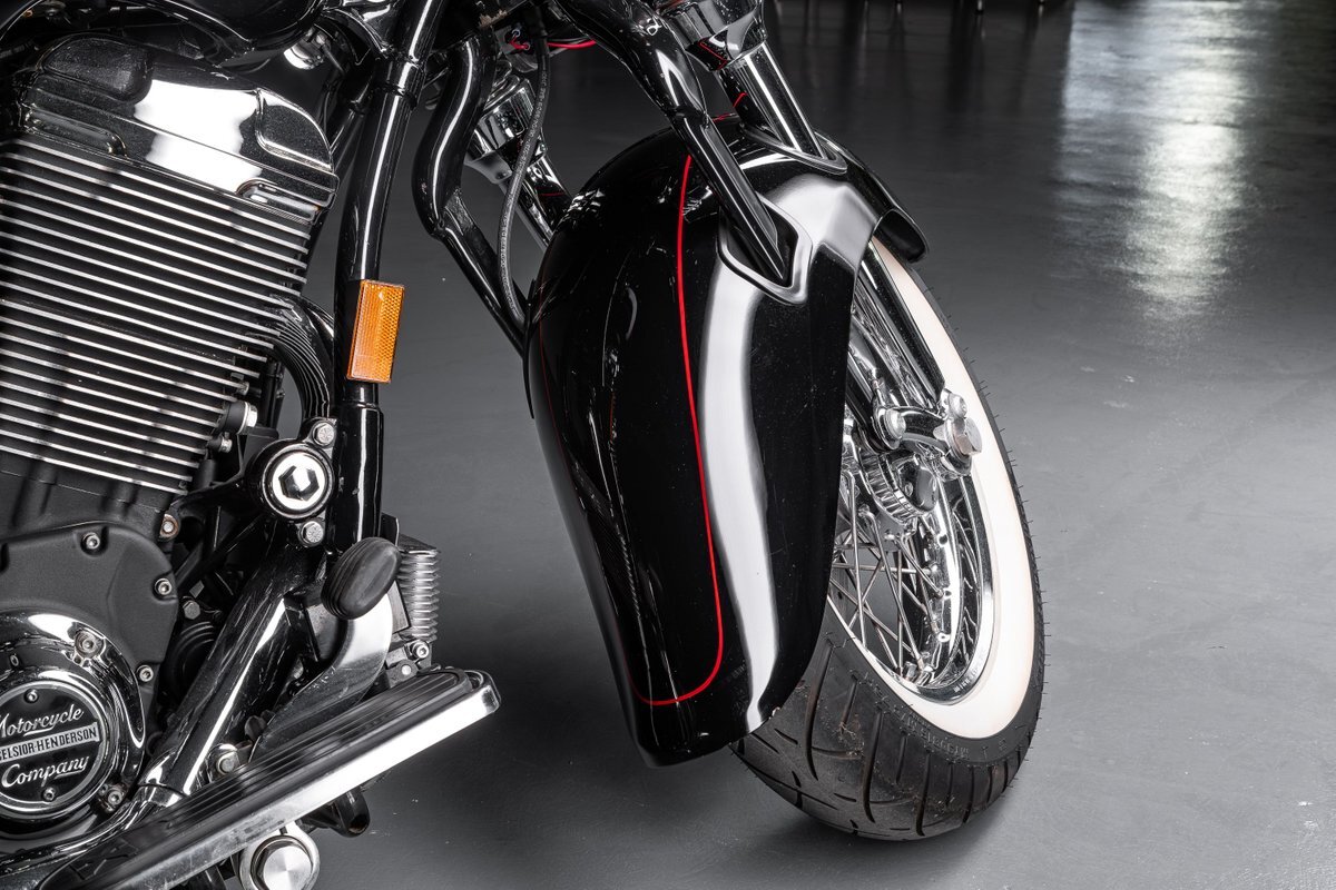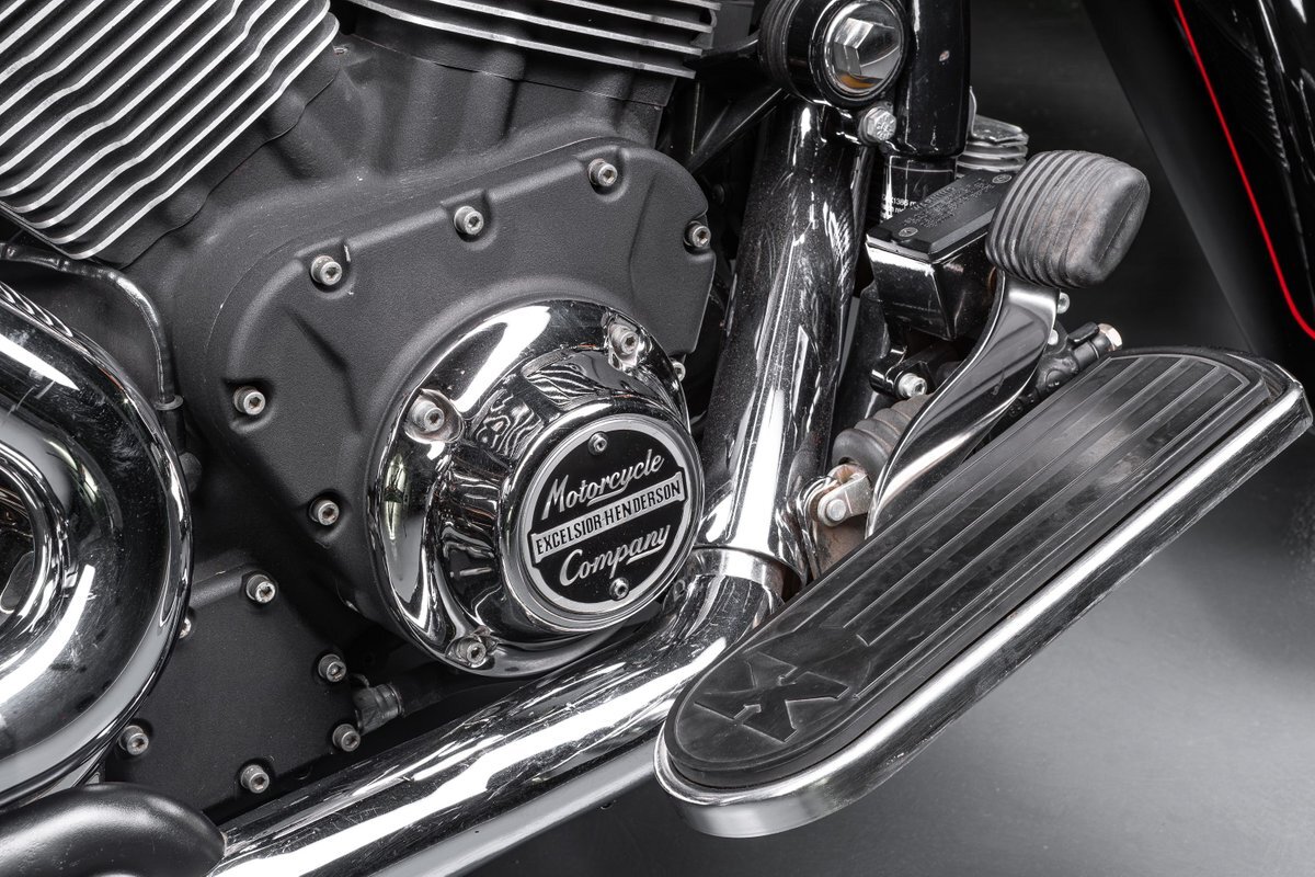 The first 100 Excelsior-Henderson motorcycles were designed and built in Belle Plain, Minnesota, to compete with Harley Davidson. These bikes were allocated to early investors who had bought many pre-production shares. This specific bike, serial number 61, is one of about 1,700 built during the two-year production run. However, it was never assembled or delivered to the early investor. Instead, it was purchased new by the current owner from an authorized Excelsior-Henderson dealer in 1999. The bike came with every accessory available at the time, including a windshield, soft saddle bags, and driving lights. The owner has all promotional material, a copy of the certificate of origin, complete service records, keys, books, accessories, and spare parts. The rare service manual that was unfortunately never completed before the company folded is also included. Even the door of the shipping crate is included, which still bears the signatures of most of the Excelsior-Henderson staff at the time.