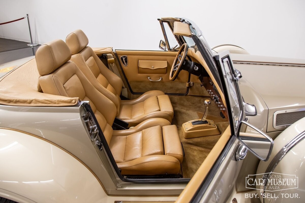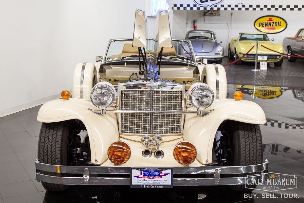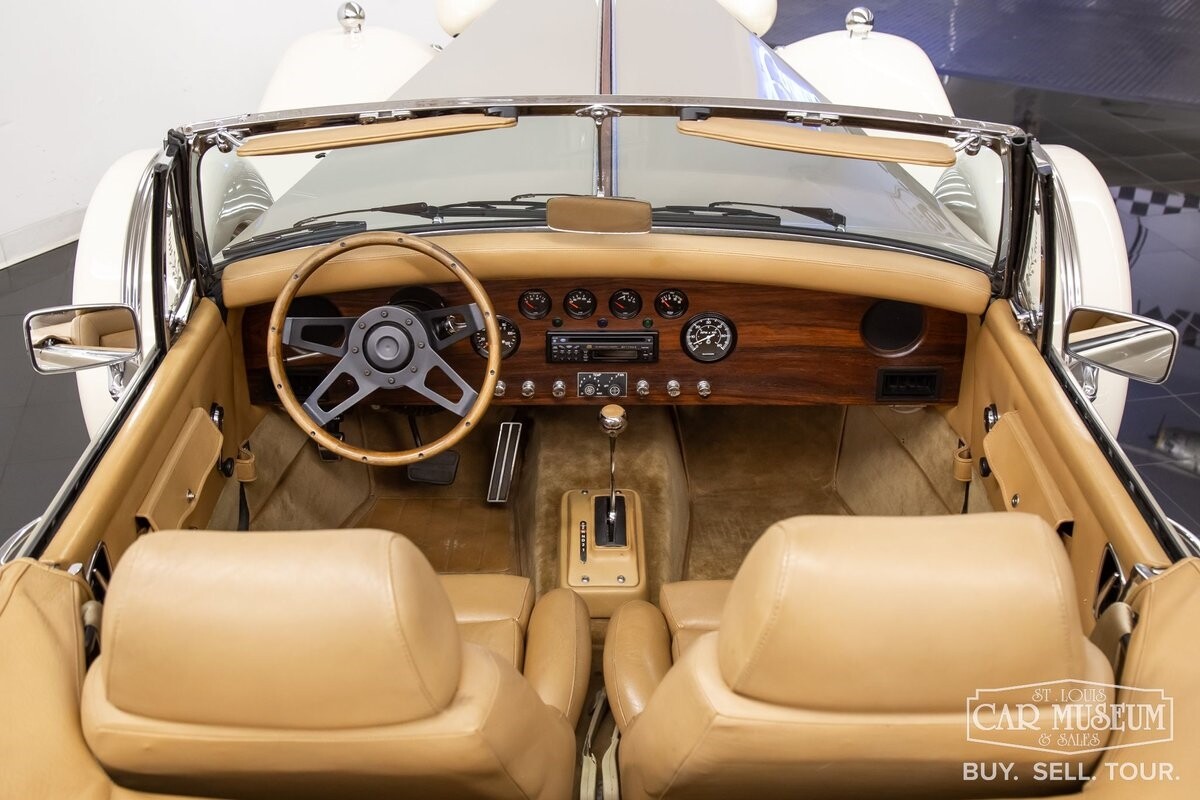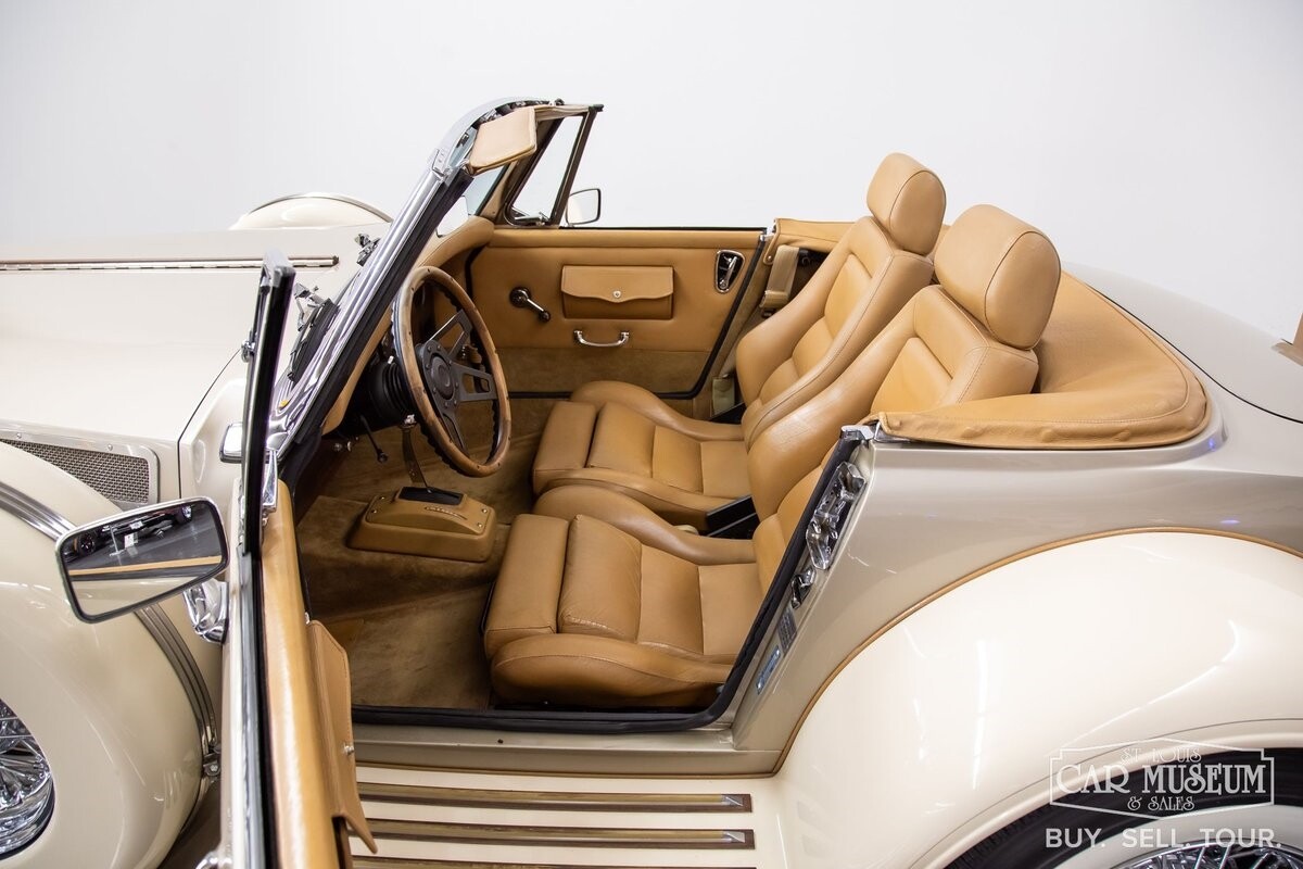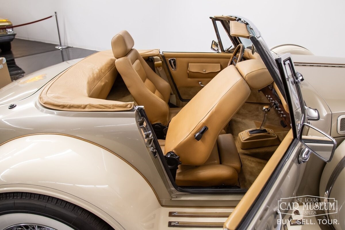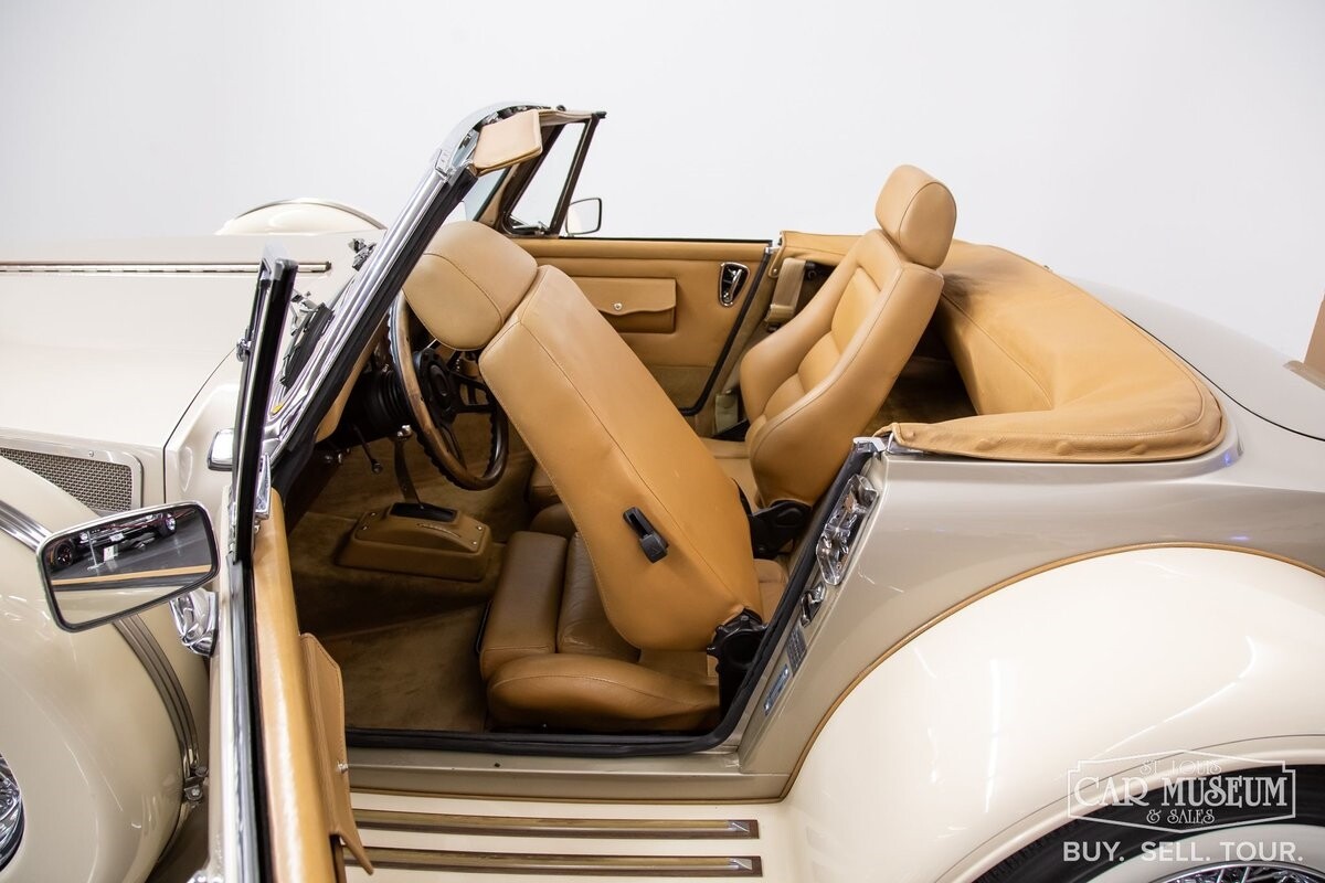 We are excited to offer this beautiful 1988 Corsair "Harlow" Roadster finished in Champagne Gold and Magnolia White two-tone exterior with a Beige Leather interior. Powered by its original Ford 429ci V8-4bbl engine and C6 automatic transmission, this impressive example is equipped with air conditioning, power steering, power front disc brakes, sport seats, VDO instrumentation, solid wood dash, 15" chrome wire spoke wheels, Coker Classic wide whitewall tires measuring 235/75R15, etched vent window glass, reverse lights, locking rear trunk, AFI trumpet air horns, amber fog lamps, dual outside mirrors, chrome faux side exhaust pipes, and triple windshield wiper blades.