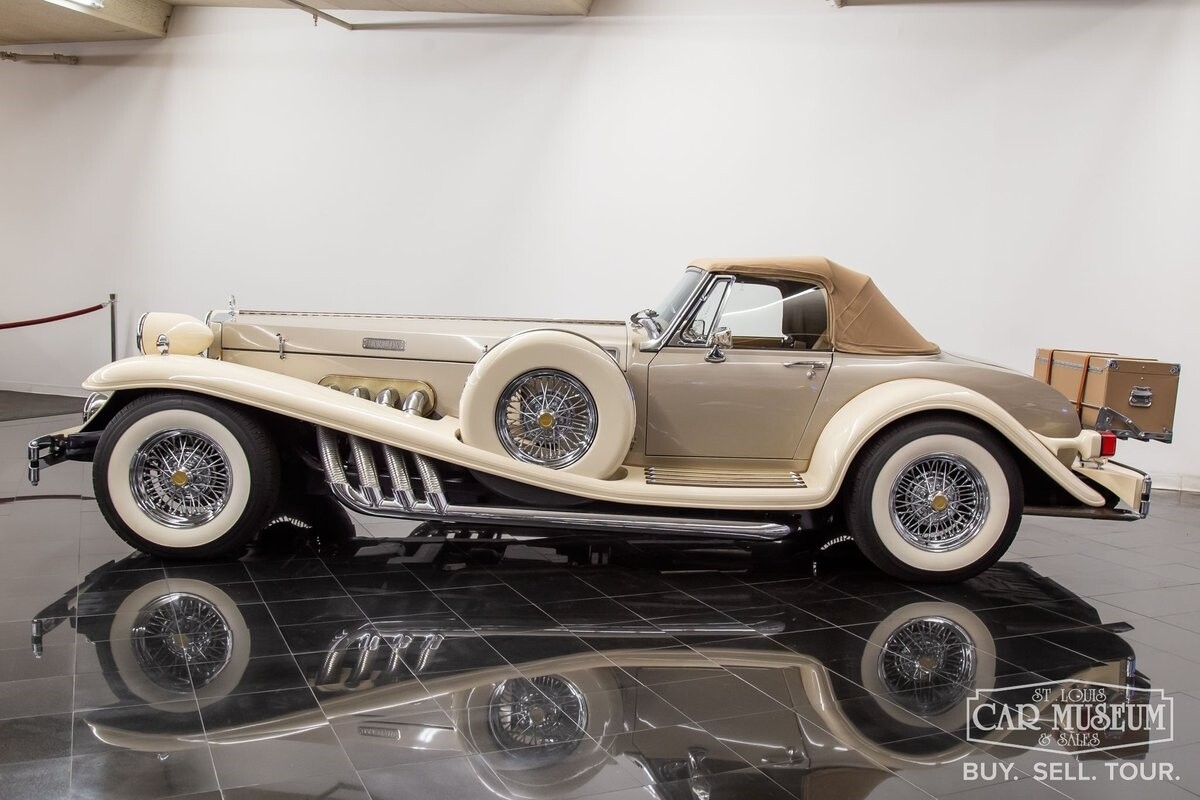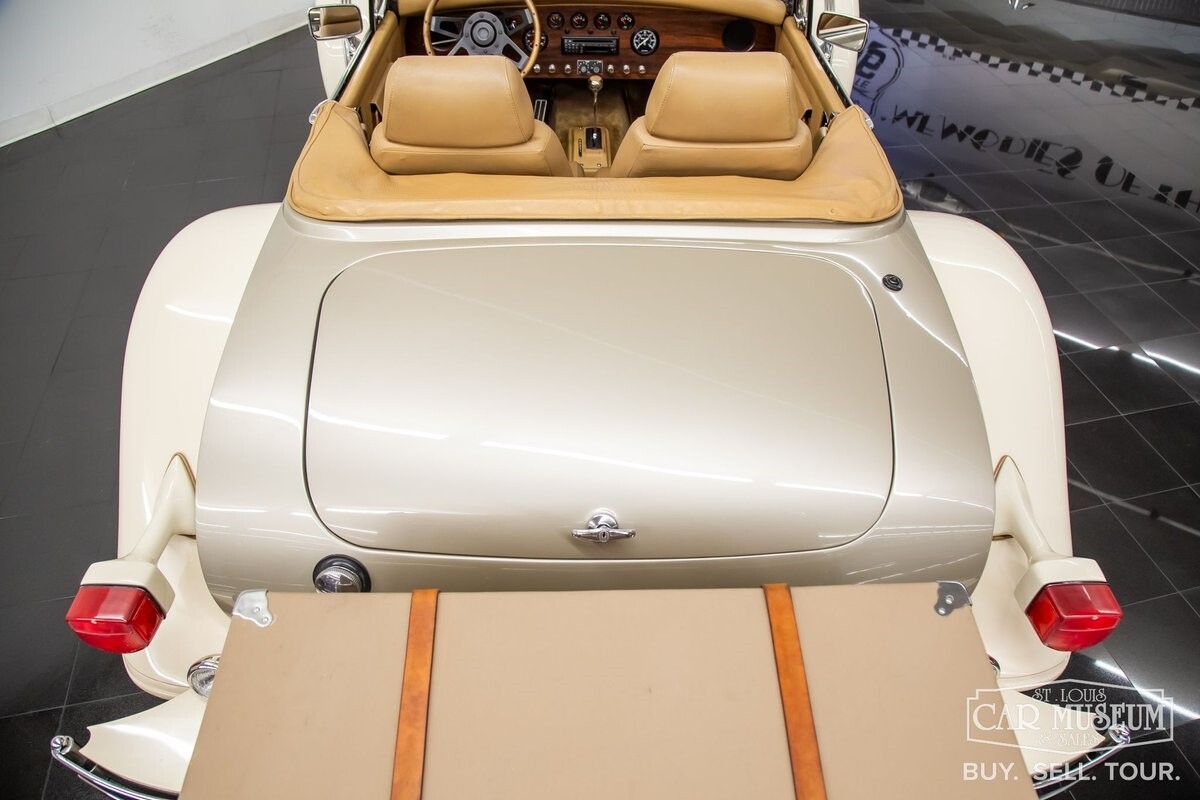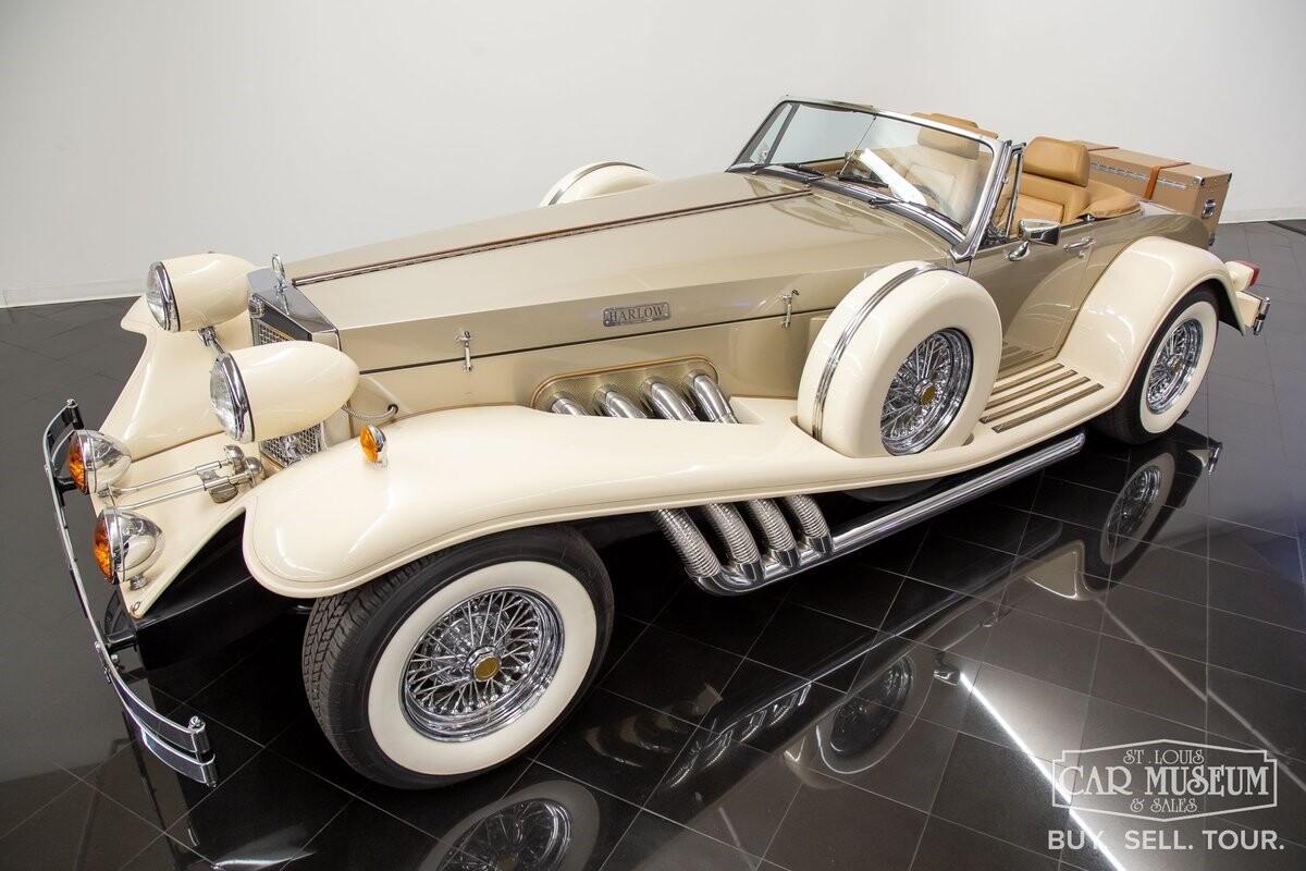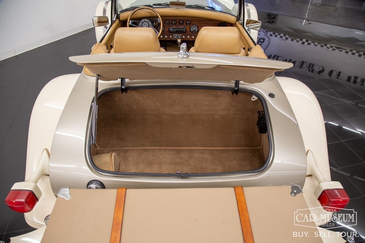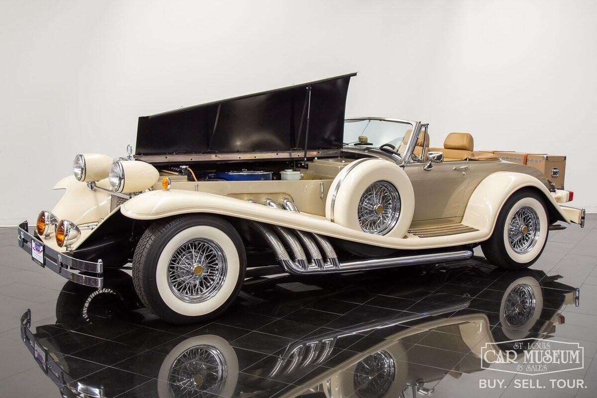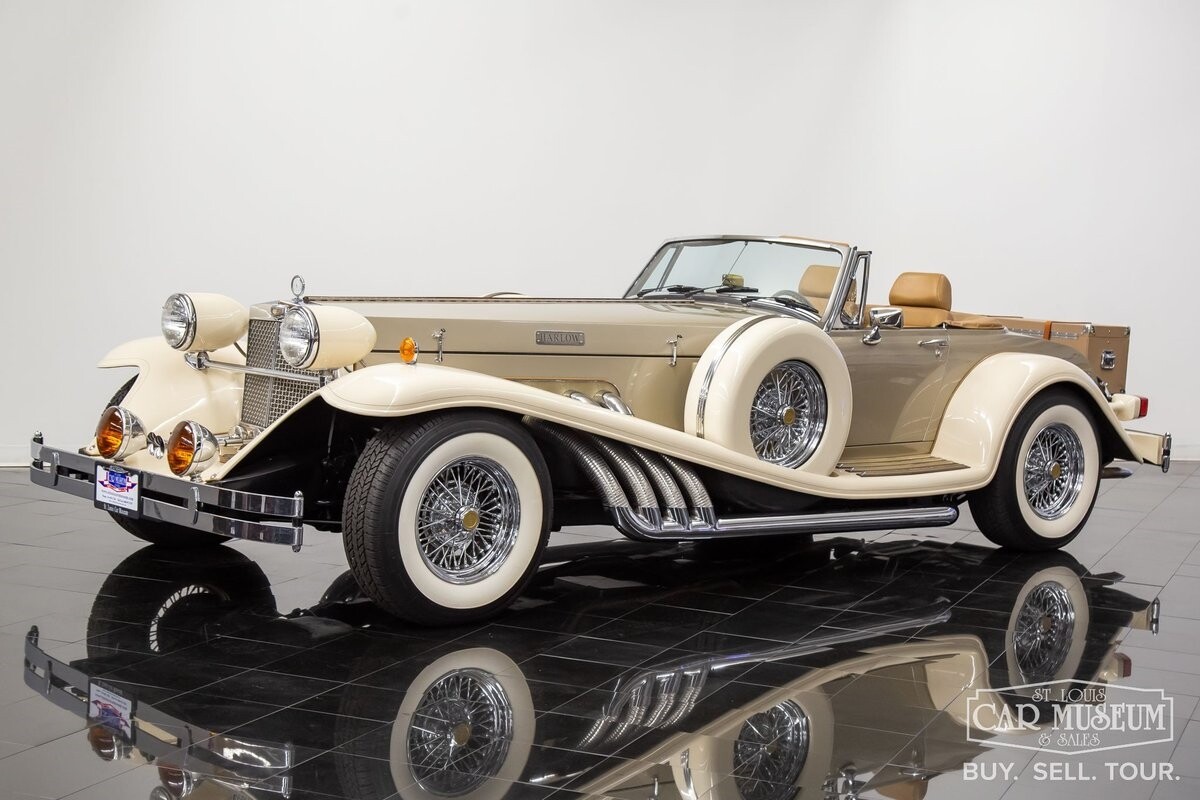 We are excited to offer this beautiful 1988 Corsair "Harlow" Roadster finished in Champagne Gold and Magnolia White two-tone exterior with a Beige Leather interior. Powered by its original Ford 429ci V8-4bbl engine and C6 automatic transmission, this impressive example is equipped with air conditioning, power steering, power front disc brakes, sport seats, VDO instrumentation, solid wood dash, 15" chrome wire spoke wheels, Coker Classic wide whitewall tires measuring 235/75R15, etched vent window glass, reverse lights, locking rear trunk, AFI trumpet air horns, amber fog lamps, dual outside mirrors, chrome faux side exhaust pipes, and triple windshield wiper blades.