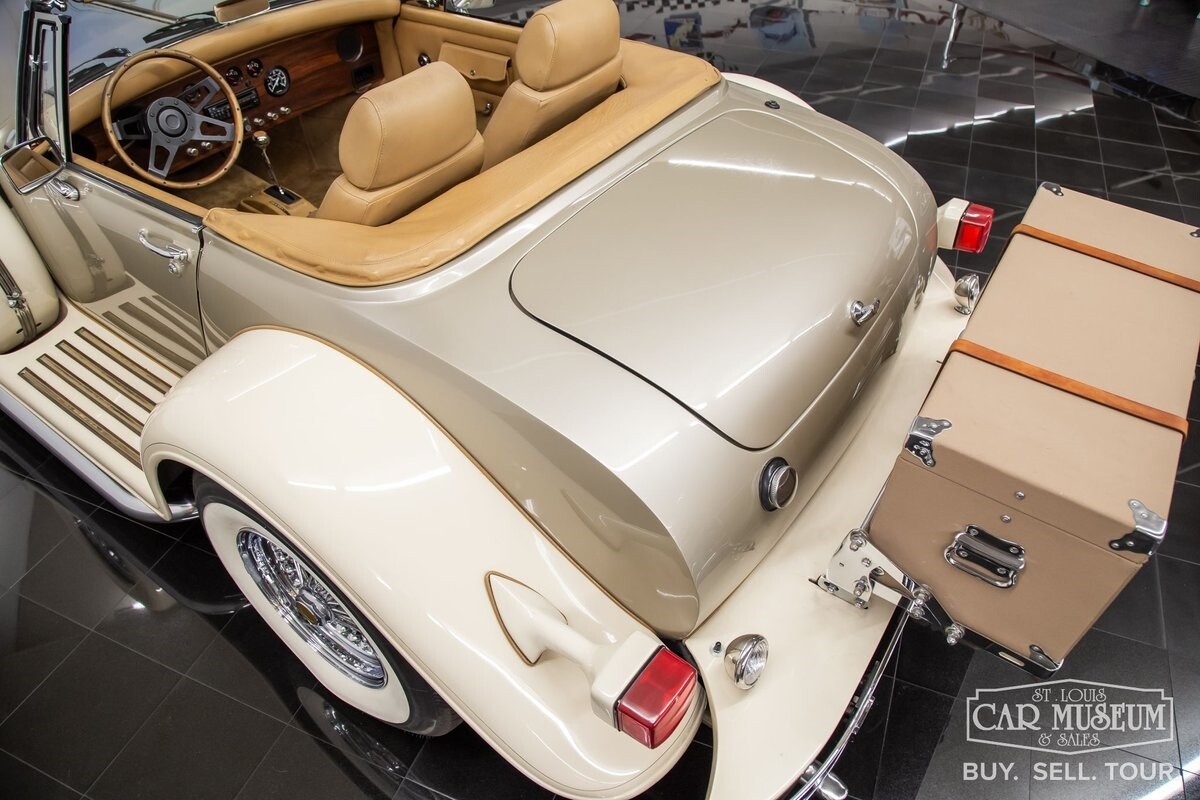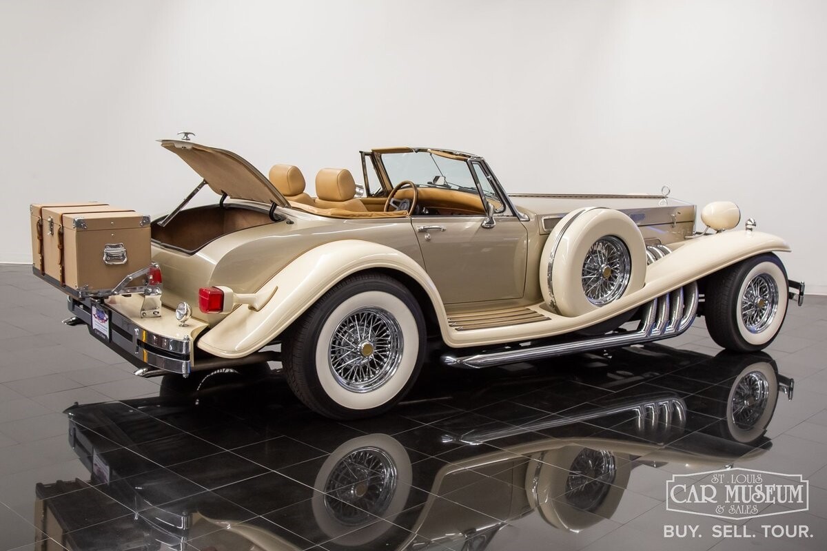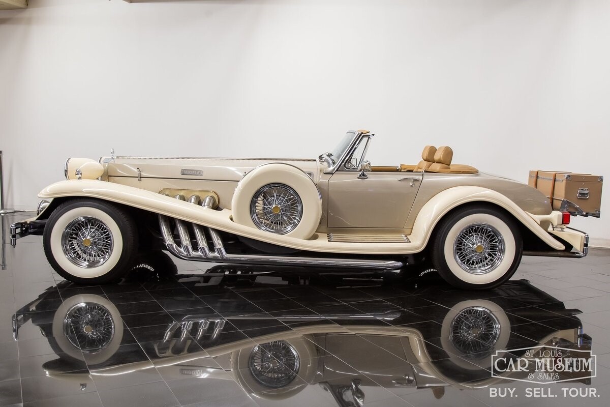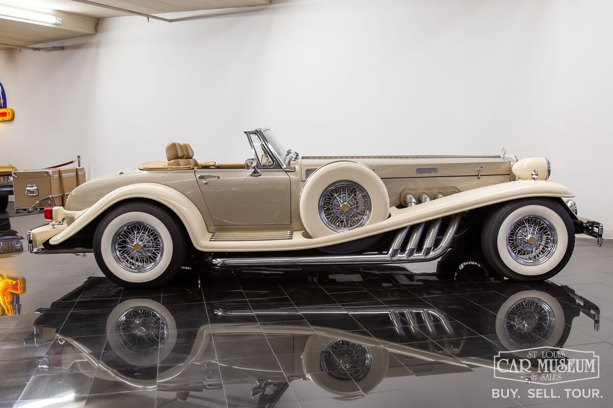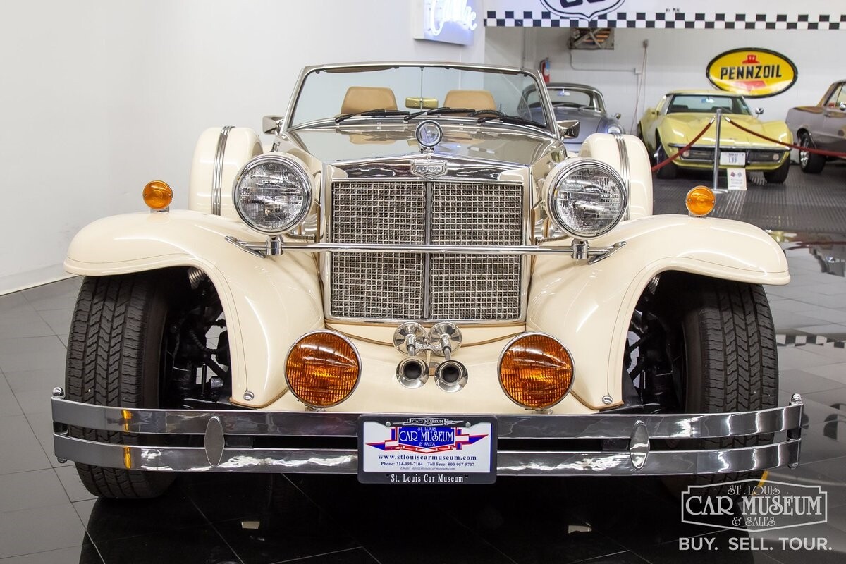 We are excited to offer this beautiful 1988 Corsair "Harlow" Roadster finished in Champagne Gold and Magnolia White two-tone exterior with a Beige Leather interior. Powered by its original Ford 429ci V8-4bbl engine and C6 automatic transmission, this impressive example is equipped with air conditioning, power steering, power front disc brakes, sport seats, VDO instrumentation, solid wood dash, 15" chrome wire spoke wheels, Coker Classic wide whitewall tires measuring 235/75R15, etched vent window glass, reverse lights, locking rear trunk, AFI trumpet air horns, amber fog lamps, dual outside mirrors, chrome faux side exhaust pipes, and triple windshield wiper blades.