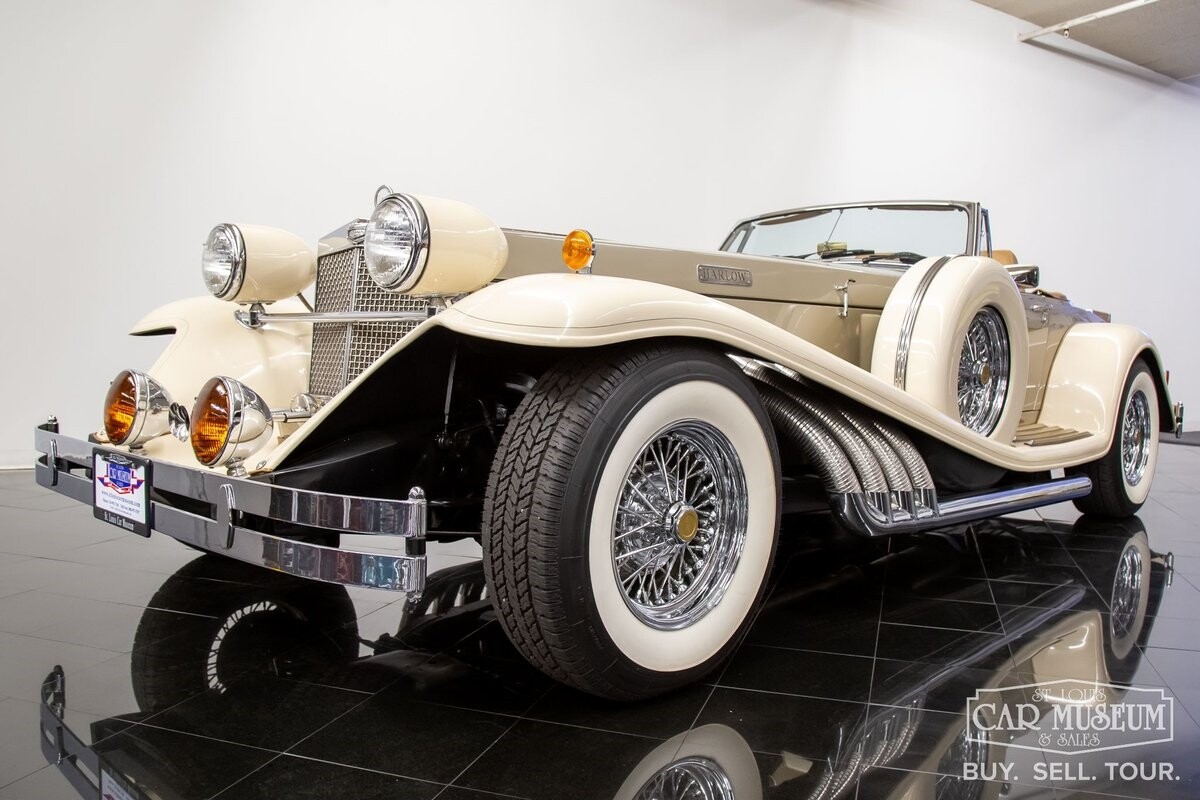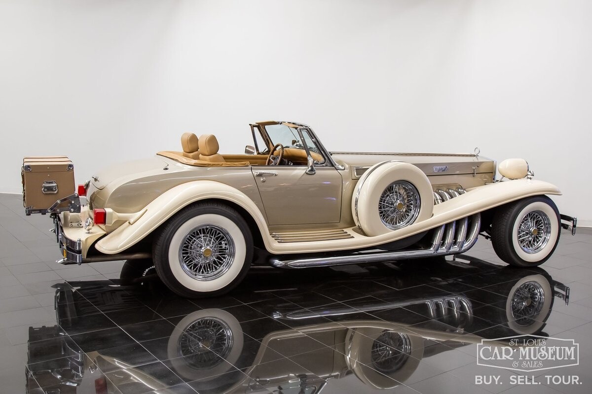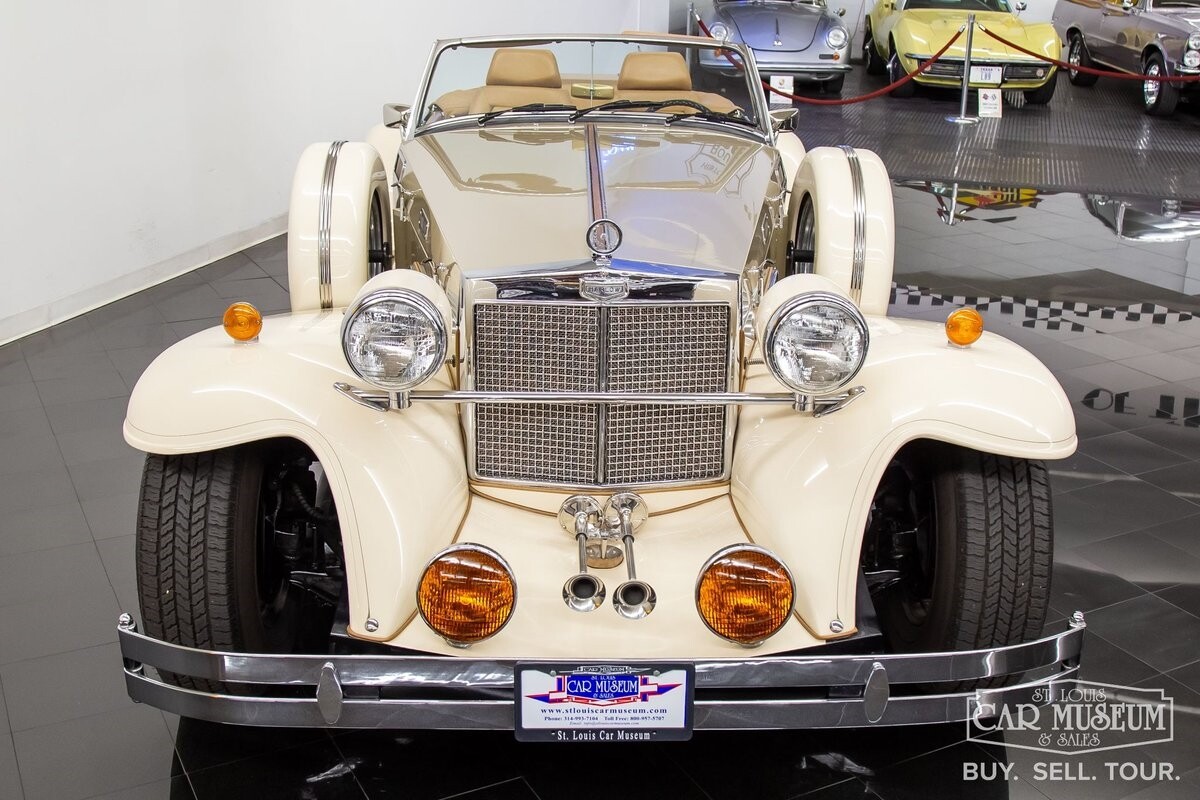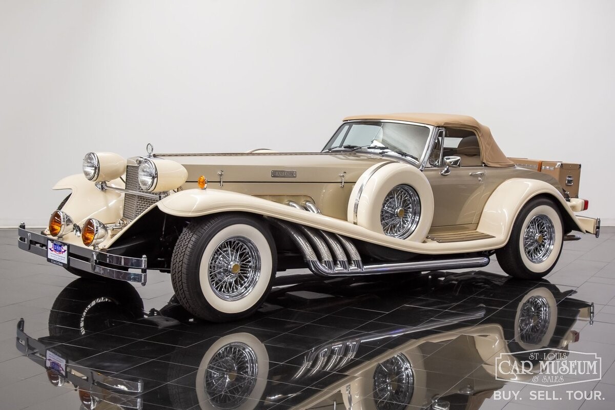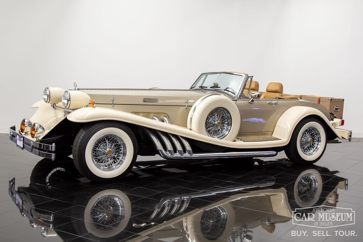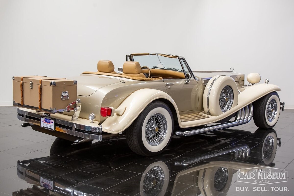 We are excited to offer this beautiful 1988 Corsair "Harlow" Roadster finished in Champagne Gold and Magnolia White two-tone exterior with a Beige Leather interior. Powered by its original Ford 429ci V8-4bbl engine and C6 automatic transmission, this impressive example is equipped with air conditioning, power steering, power front disc brakes, sport seats, VDO instrumentation, solid wood dash, 15" chrome wire spoke wheels, Coker Classic wide whitewall tires measuring 235/75R15, etched vent window glass, reverse lights, locking rear trunk, AFI trumpet air horns, amber fog lamps, dual outside mirrors, chrome faux side exhaust pipes, and triple windshield wiper blades.