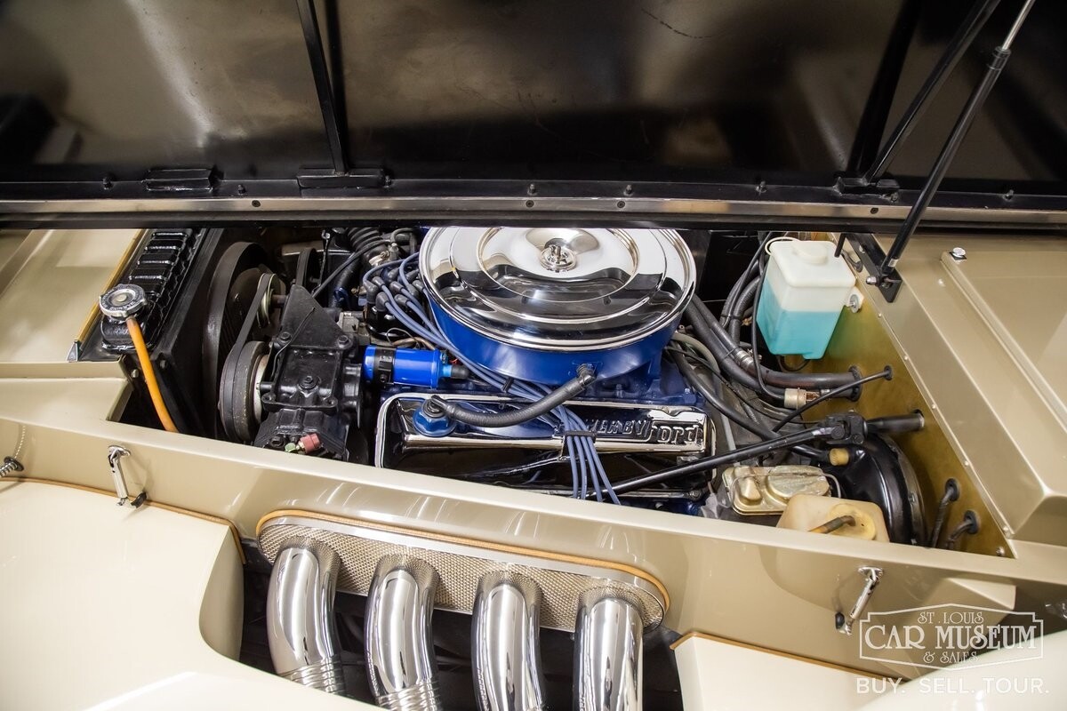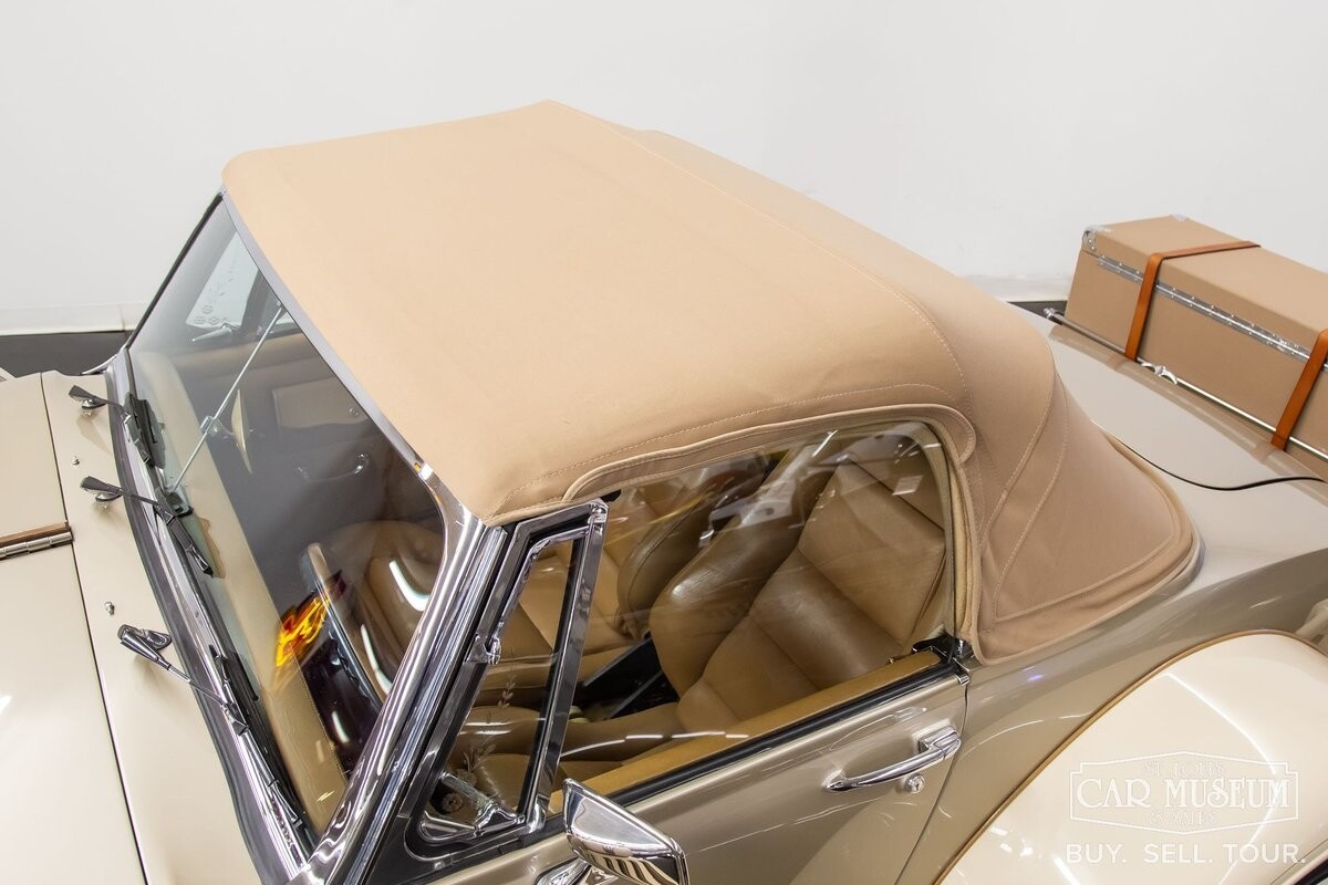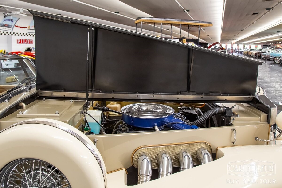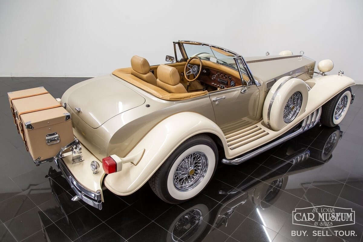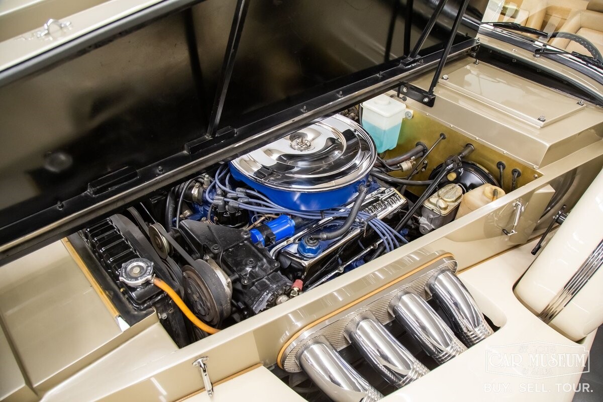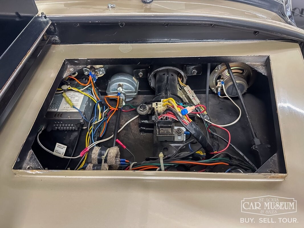 We are excited to offer this beautiful 1988 Corsair "Harlow" Roadster finished in Champagne Gold and Magnolia White two-tone exterior with a Beige Leather interior. Powered by its original Ford 429ci V8-4bbl engine and C6 automatic transmission, this impressive example is equipped with air conditioning, power steering, power front disc brakes, sport seats, VDO instrumentation, solid wood dash, 15" chrome wire spoke wheels, Coker Classic wide whitewall tires measuring 235/75R15, etched vent window glass, reverse lights, locking rear trunk, AFI trumpet air horns, amber fog lamps, dual outside mirrors, chrome faux side exhaust pipes, and triple windshield wiper blades.