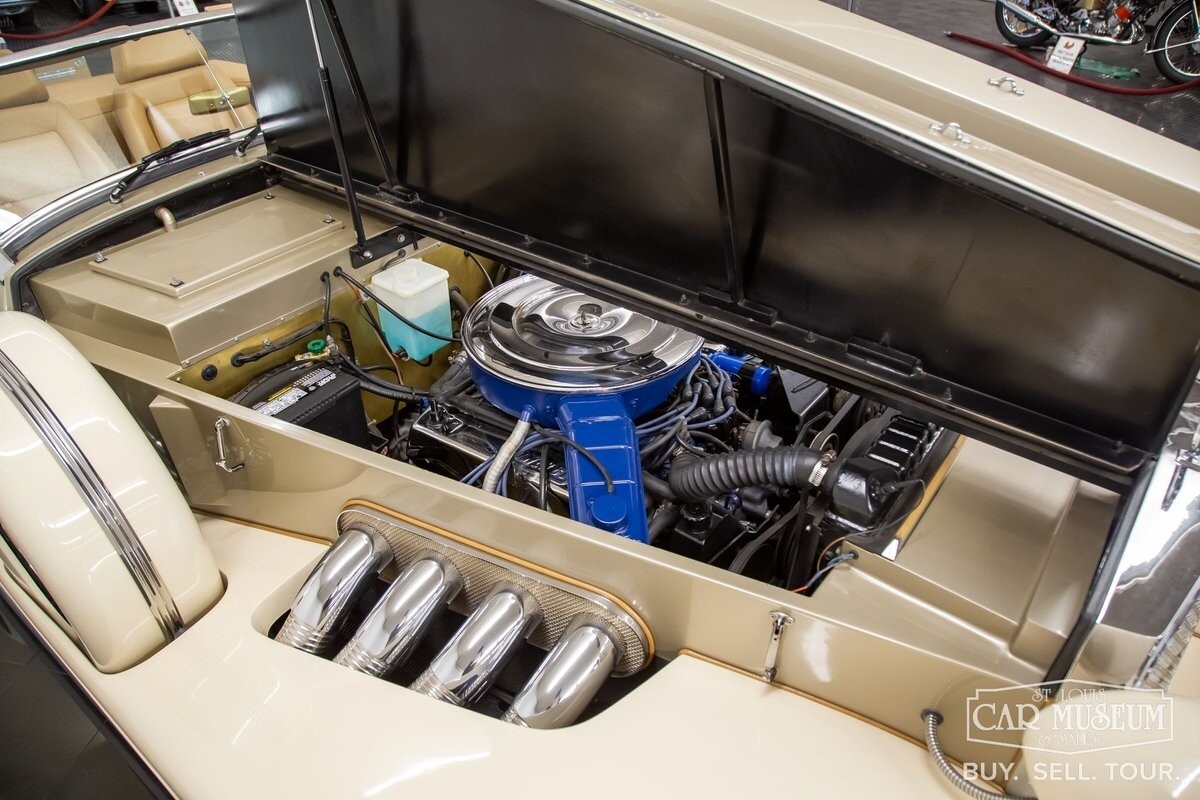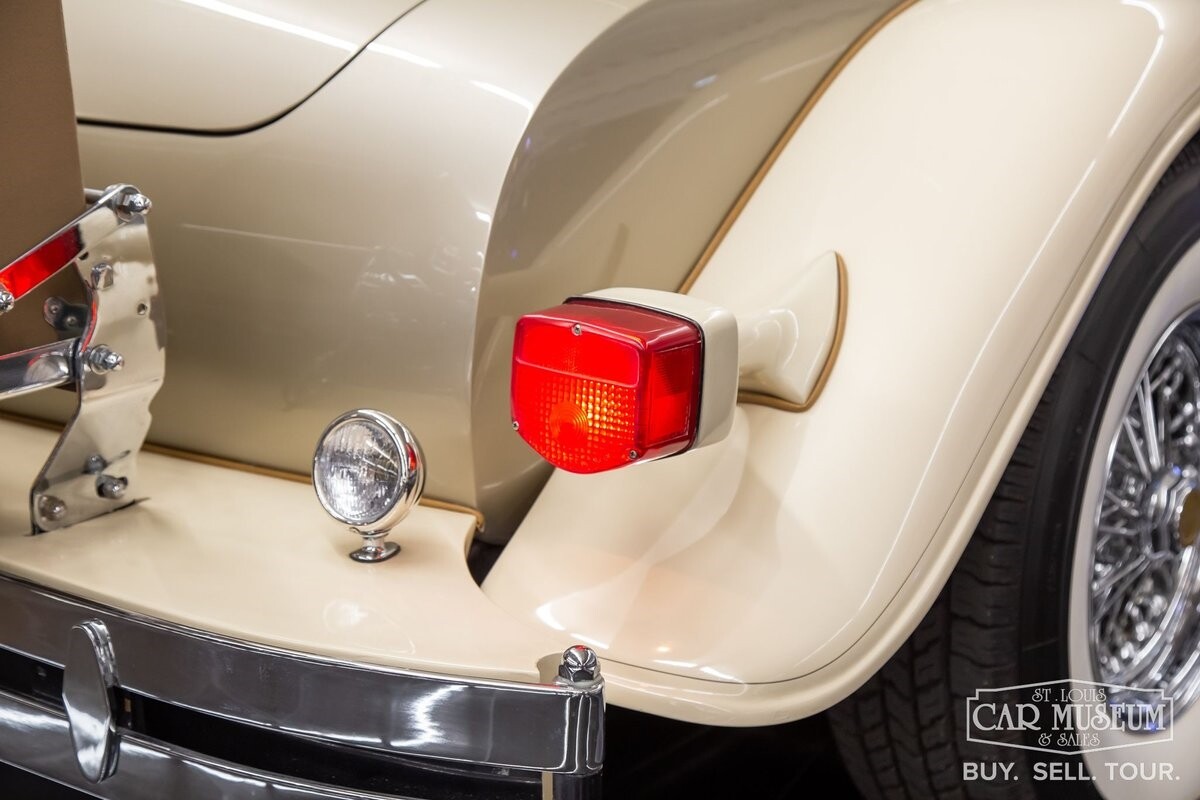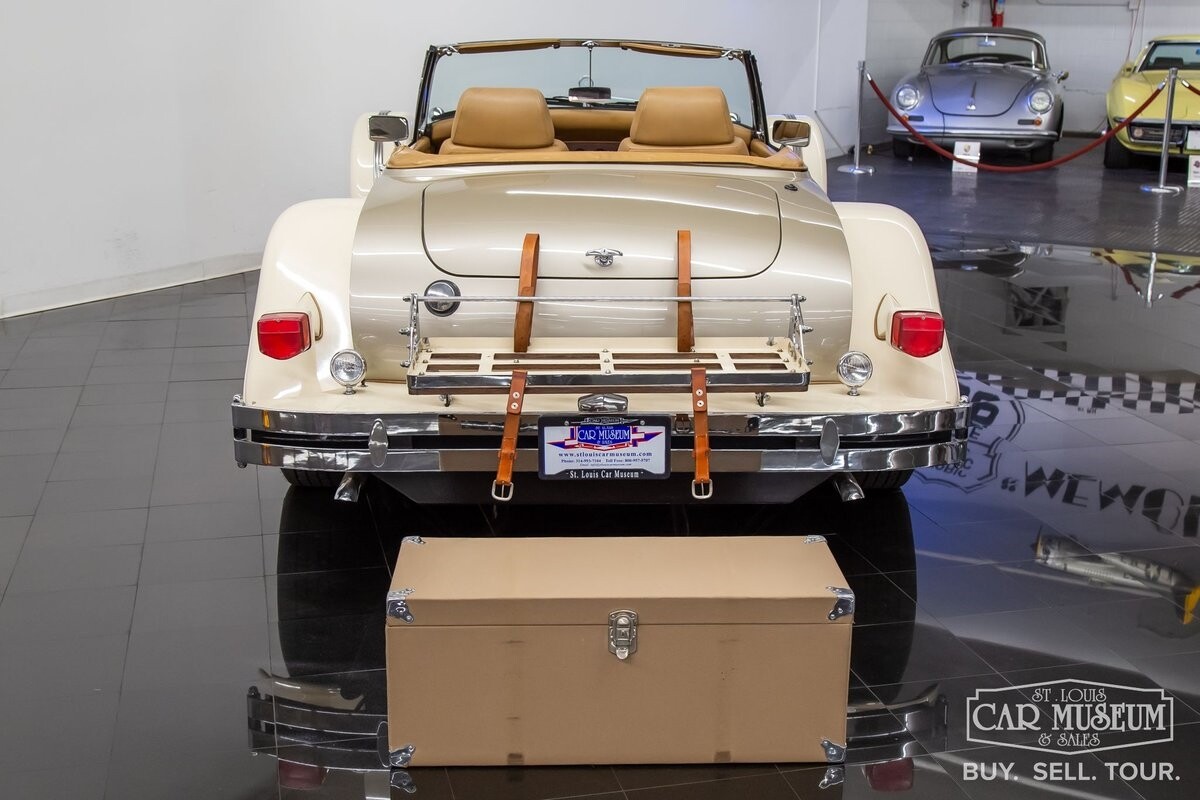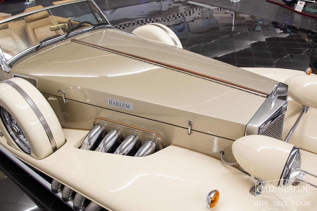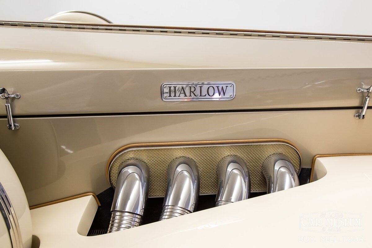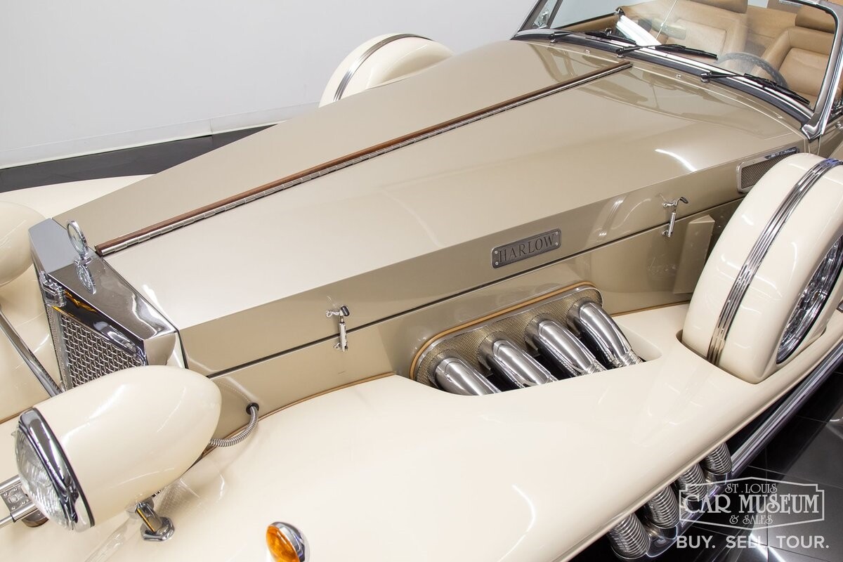 These kits were built in the late-1980's with a vision in mind to set it apart from other neo-classic examples on the market. This project became affectionately known as "Harlow", named after the builder's admiration of Gene Harlow, a blonde bombshell actress from the early 1930's known for her bad girl sex appeal. As if built for her personally, the Corsair was treated to special touches not found on any other roadster, most notably, dual side-mounted spare tires with covers, rear-mounted custom rack with removable trunk, and elongated front headlight buckets that are now bar-mounted for a more prominent presentation. The Corsair showcased lowered and more rounded front fenders along with extended and reshaped rear fenders with a traditional imitation bead-rolled edge along the entire length; faux exhaust ports are made more visible with new trim surround, prominent forward air horns, new one piece front bumper with matching rear bumper, lockable storage trunk, revised firewall with sealed hard covers over auxiliary components; hood sides with special venting, Harlow emblems, and hydraulic lifts; and an etched rear window glass in the soft top!