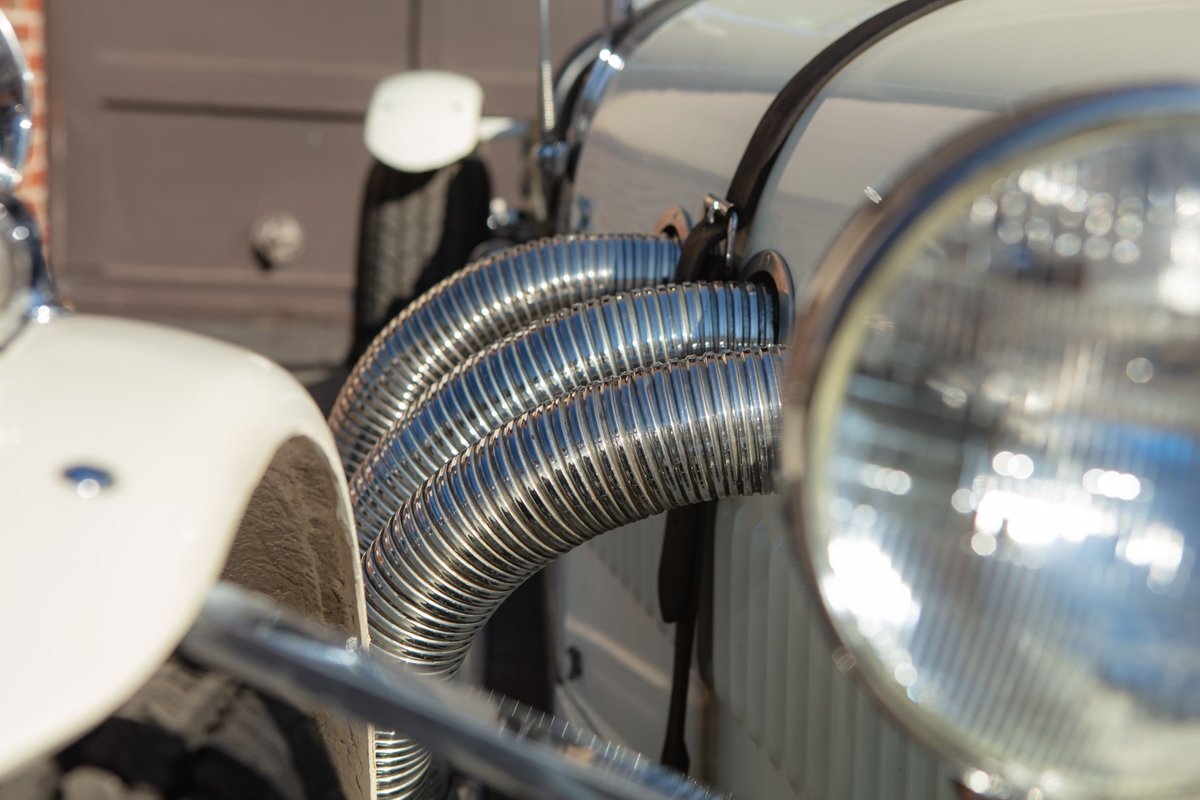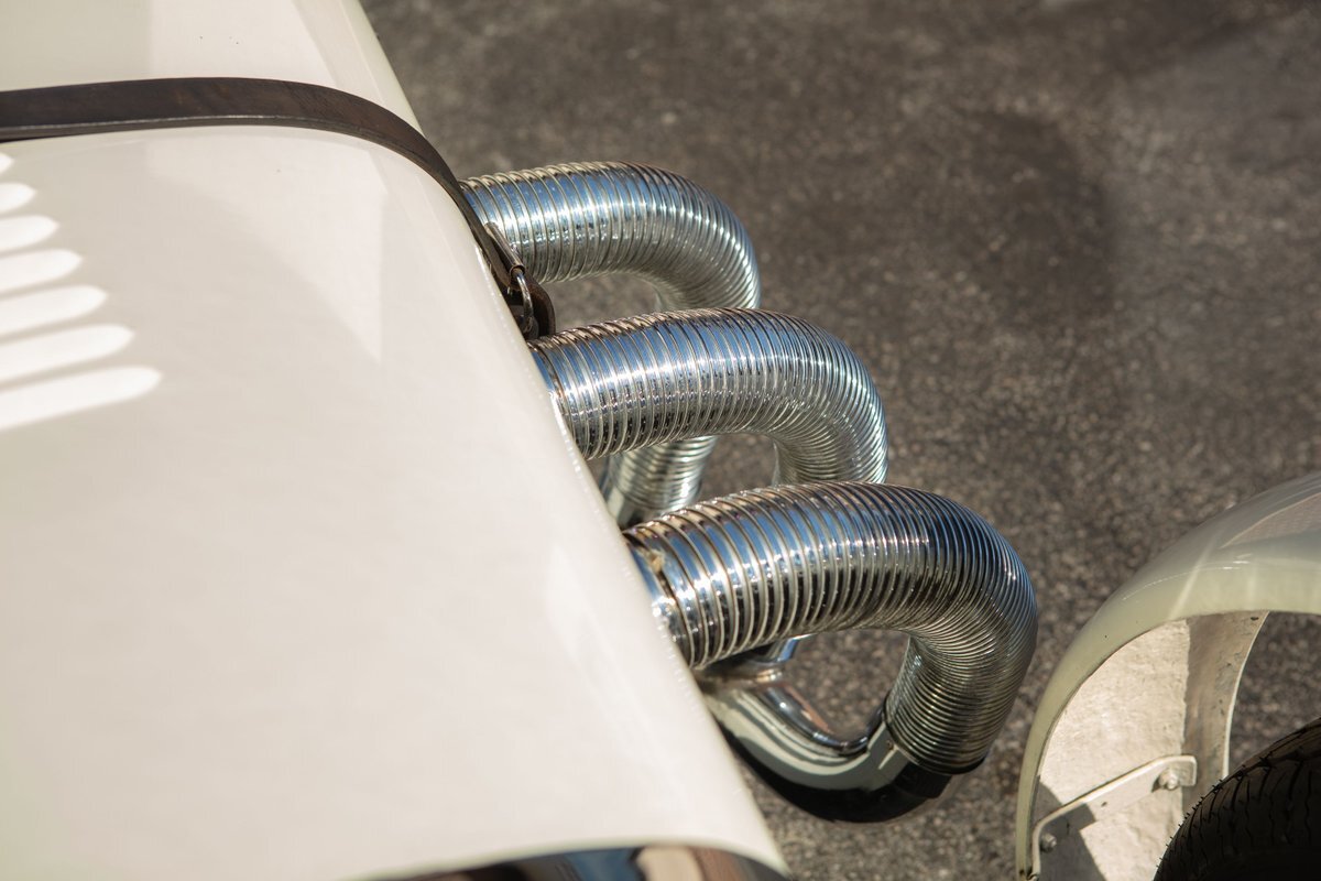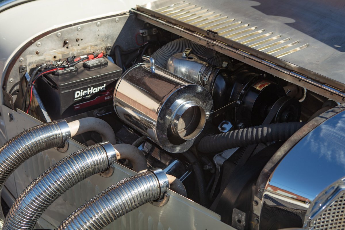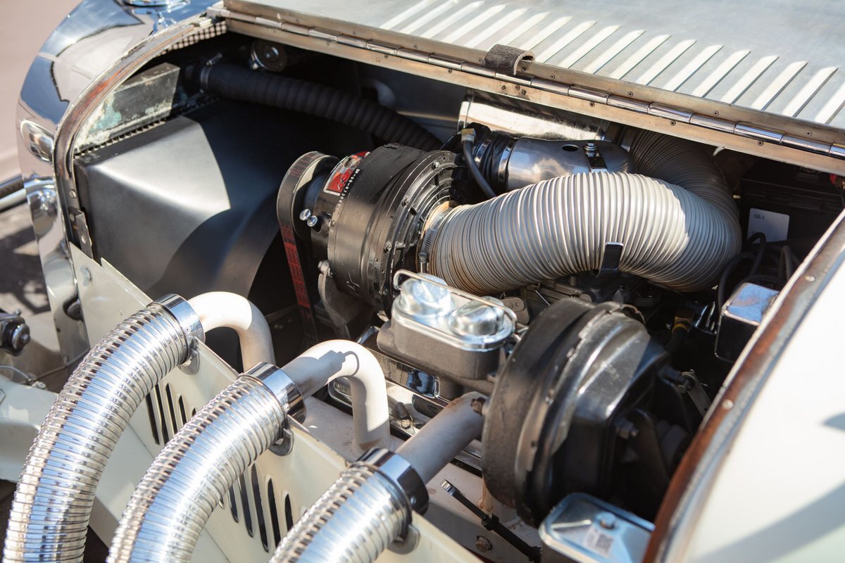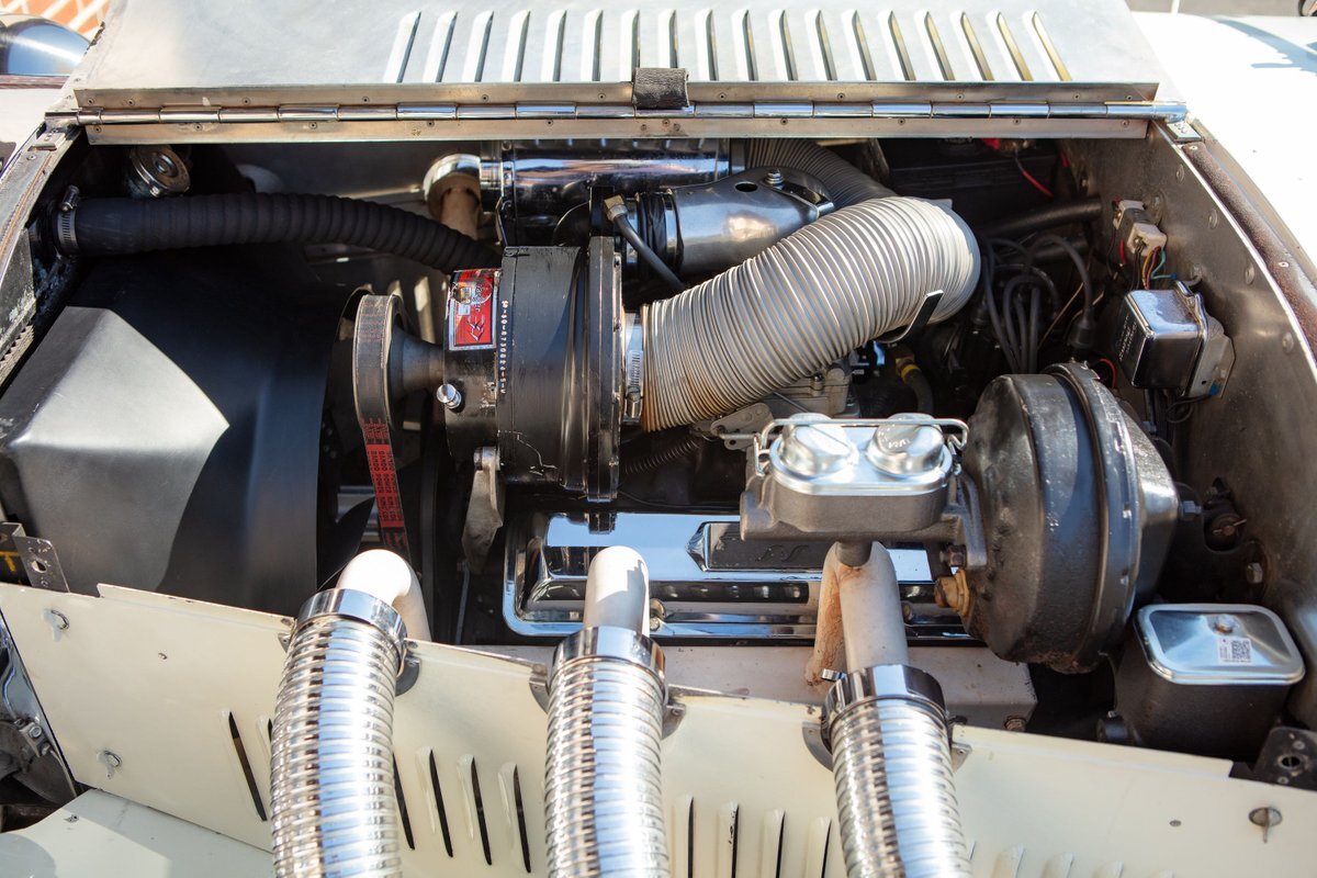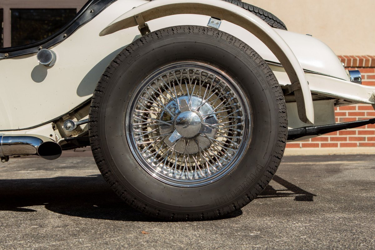 This Excalibur SSK series one-car is the ultimate Excalibur to own. It is the "no door" SSK and is powered by a Chevy 327 V8 engine with a Paxton supercharger, producing 400 HP. This power is transmitted through a Borg Warner four-speed manual transmission. Only 97 Excalibur's were built without doors, and it is believed that only between five and seven cars were factory supercharged.