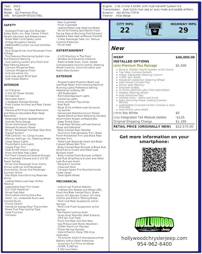 State or local taxes, title, license fee, processing fees, registration fee, dealer documentary fee, finance charges, emission testing fees, and compliance fees are additional to the advertised price.