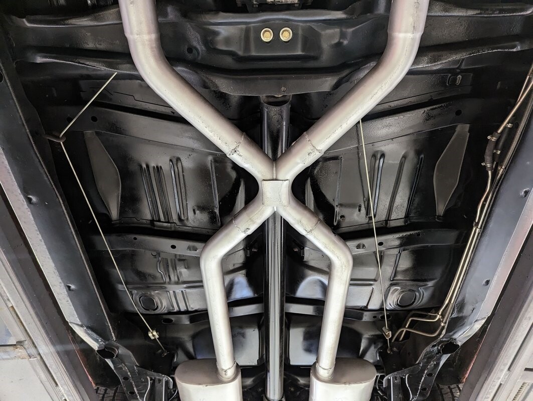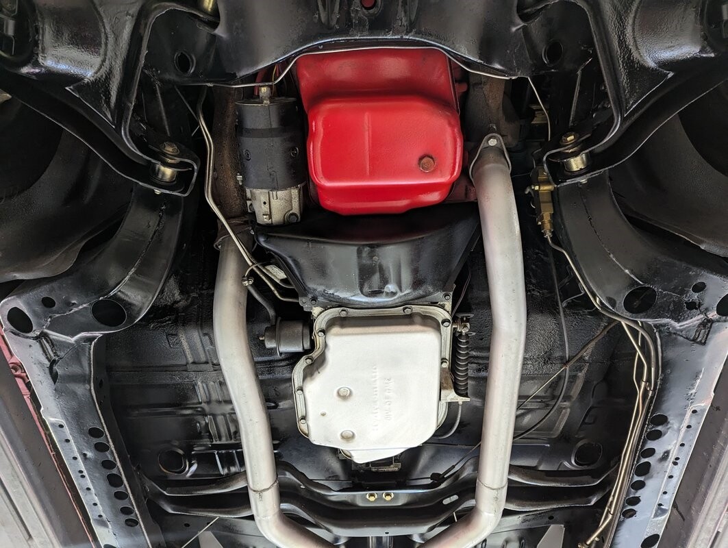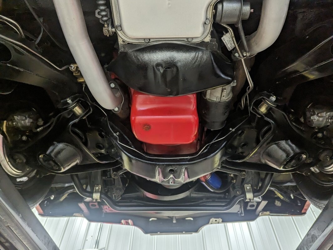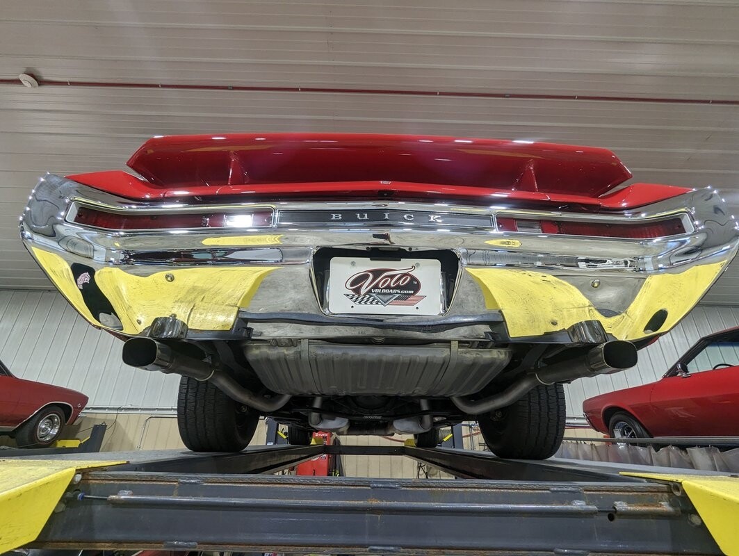 UNDERSIDE: The underside of this car is very detailed and looks amazing! The steering components all look to be in good condition and are currently working well. The suspension was rebuilt and upgraded with a Hotchkis Sport Suspension package. Upgrades include lowering springs, KYB gas shocks and a fatter swaybar in front. In back Hotchkis control arms, sway bar, lowering springs and KYB gas shocks improve the handling. A lot of Buicks were still using drum brakes, this one has front disc, the brakes were redone, the emergency brake is hooked up. Upgraded Pypes exhaust with an X-Pipe and stainless tips looks fresh. The fuel system including the tank and fuel lines have been replaced. Looking up at the #'s matching 455 motor everything appears to be fresh and clean with red paint and no visible leaks. Same goes for the VIN #'s matching Turbo 400 transmission; it looks nice and clean with no visible leaks. The trans linkage and mount have both been replaced. The 10 bolt rear end looks fresh with nice black paint. The floors look very solid with neatly applied black paint and no rust anywhere.