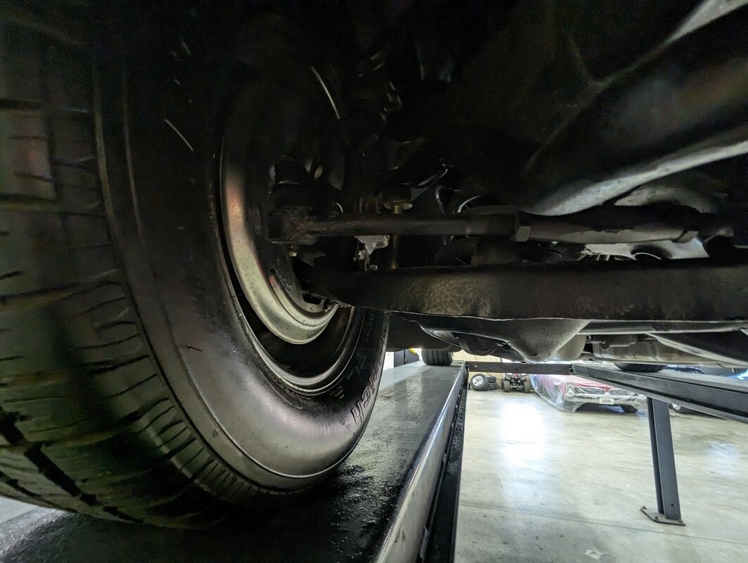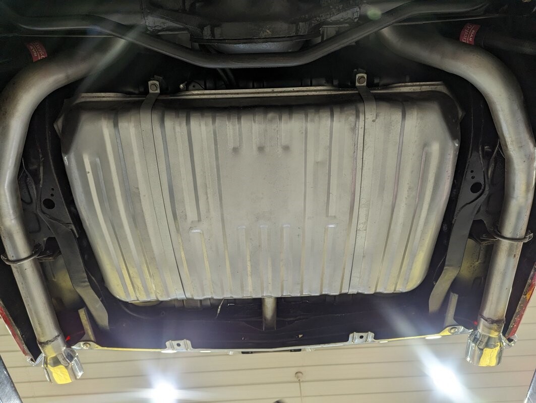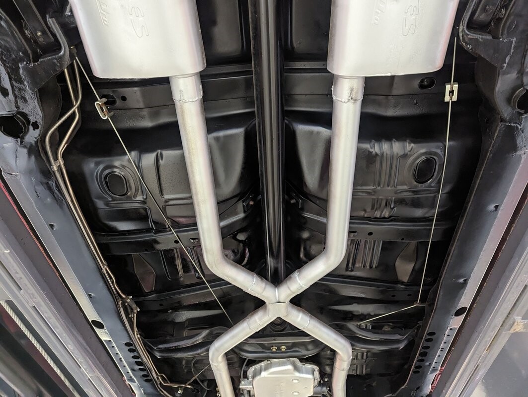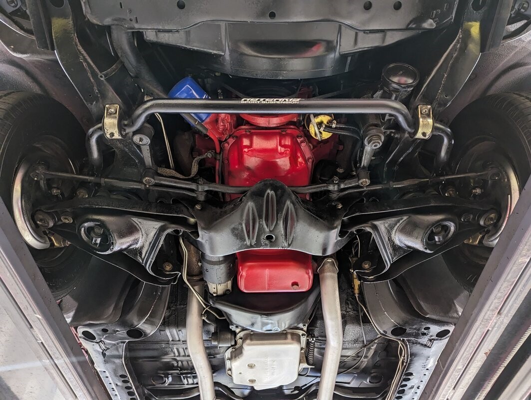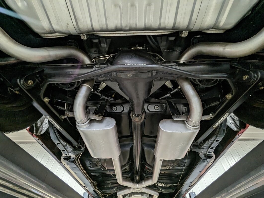 UNDERSIDE: The underside of this car is very detailed and looks amazing! The steering components all look to be in good condition and are currently working well. The suspension was rebuilt and upgraded with a Hotchkis Sport Suspension package. Upgrades include lowering springs, KYB gas shocks and a fatter swaybar in front. In back Hotchkis control arms, sway bar, lowering springs and KYB gas shocks improve the handling. A lot of Buicks were still using drum brakes, this one has front disc, the brakes were redone, the emergency brake is hooked up. Upgraded Pypes exhaust with an X-Pipe and stainless tips looks fresh. The fuel system including the tank and fuel lines have been replaced. Looking up at the #'s matching 455 motor everything appears to be fresh and clean with red paint and no visible leaks. Same goes for the VIN #'s matching Turbo 400 transmission; it looks nice and clean with no visible leaks. The trans linkage and mount have both been replaced. The 10 bolt rear end looks fresh with nice black paint. The floors look very solid with neatly applied black paint and no rust anywhere.