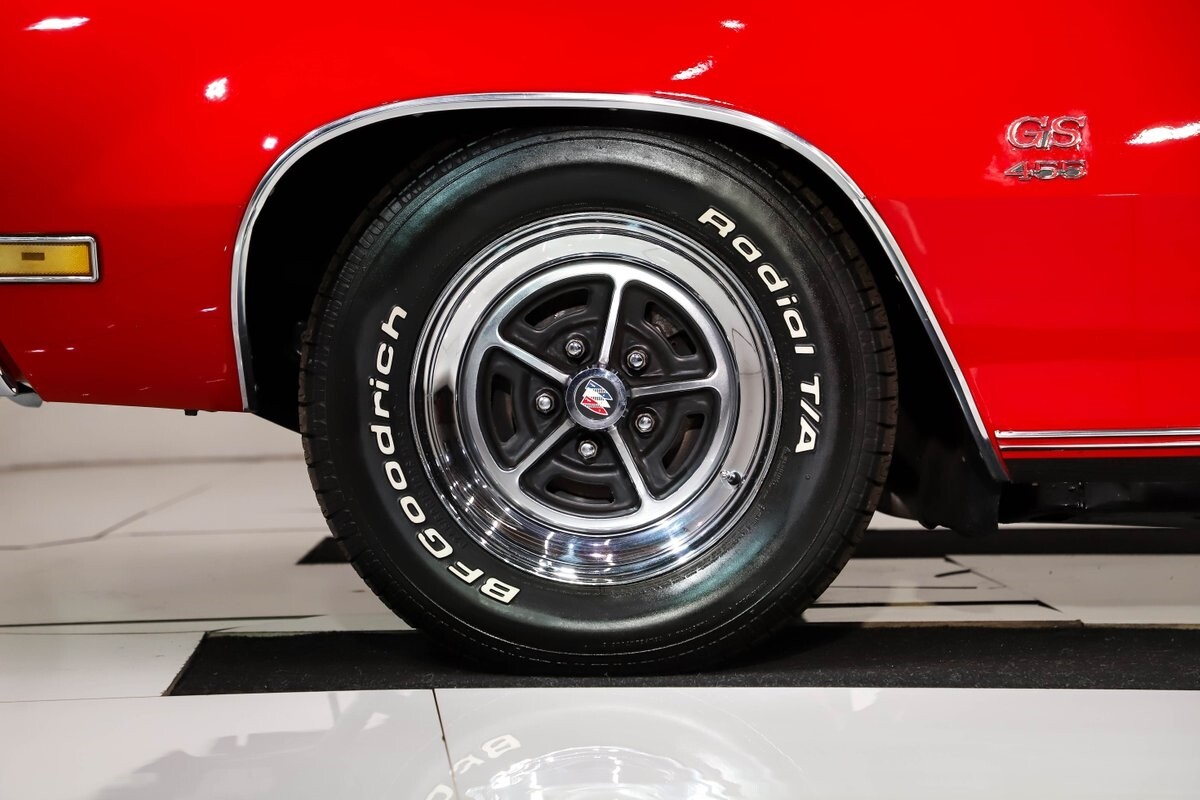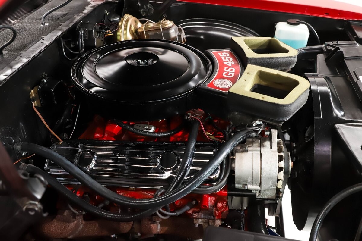 ENGINE COMPARTMENT: What a sweet looking engine bay! This rare #'s matching 455 is a pure powerhouse rated at 350 hp and a stump pulling 510 foot pounds of torque! The 70 Buick was the torquiest V-8 produced in the muscle car era. This example which has received a meticulous restoration looks extremely clean and correct. It has the factory air cleaner which looks brand new and functions through the hood scoops. The remainder of the engine appears to be rebuilt with many fresh parts including the hoses and wires. It features power steering and brakes. Factory valve covers have been chromed. It has a factory style radiator, overflow bottle and fan shroud. It has electric wipers with a fender mounted washer bottle and even the squirters are hooked up. The bottom side of the hood, fender wells, and firewall have all been painted neatly in satin black.