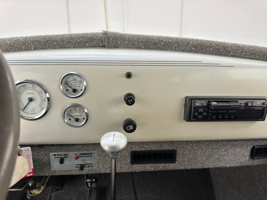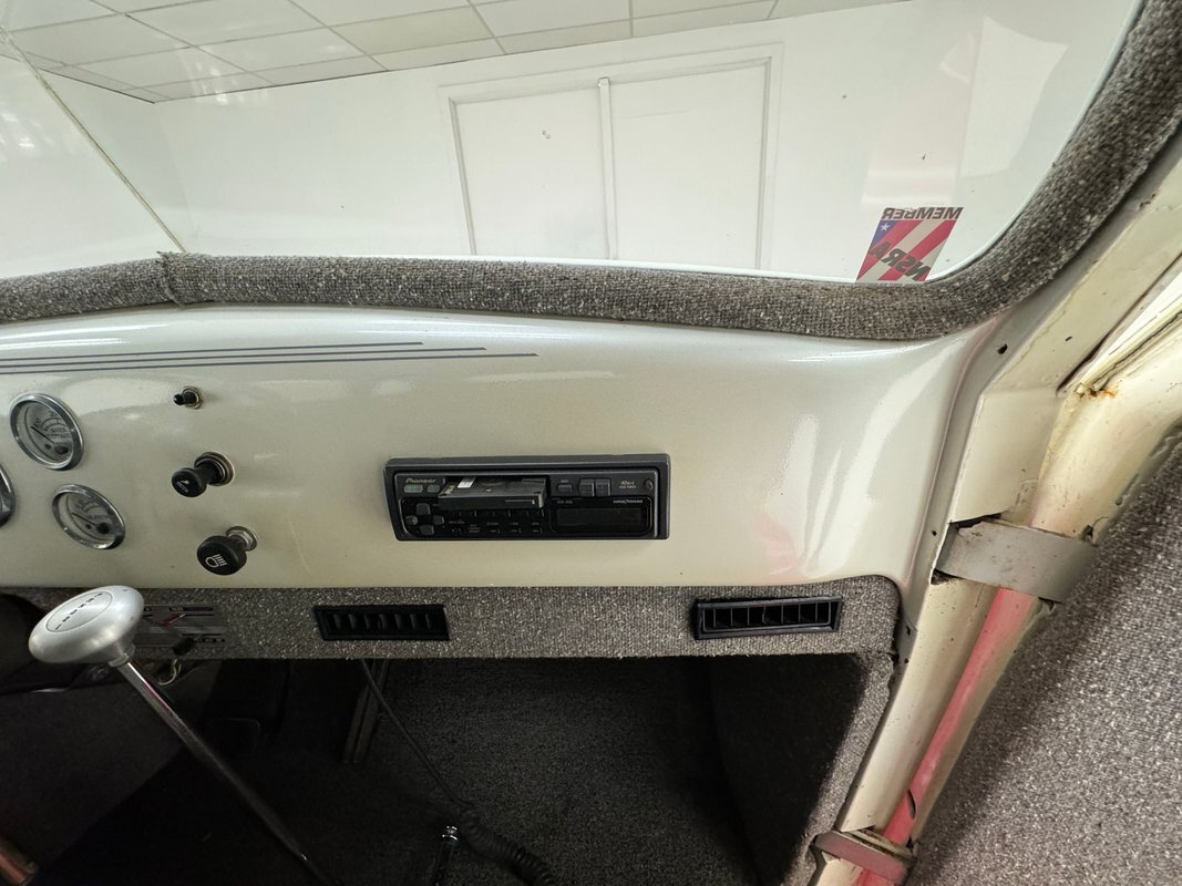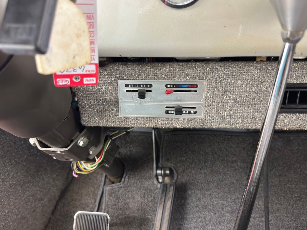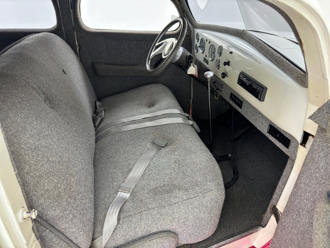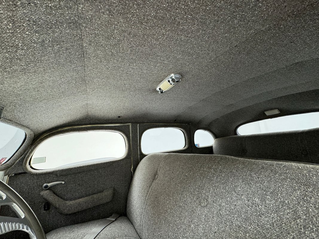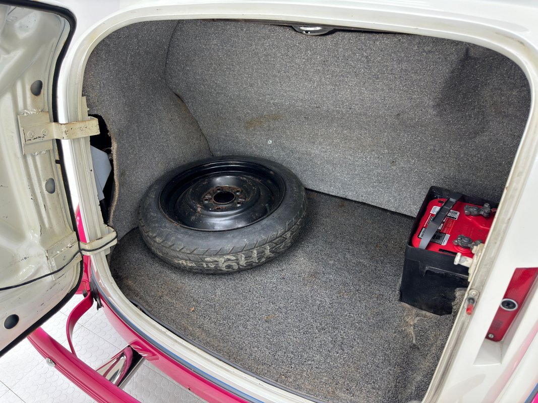 Gray tweed covers the door cards including the window frame, arm rests, and door pulls. Power windows and power locks are present! The back doors, which open suicide style, receive the same treatment. Tweed covers the walls and spills onto the bench seats, front and rear, for a clean monochromatic look. Rear passengers have ample space and a handlebar mounted on the back of the front seats. Soft and spacious, the bench seats are in great shape save for a hole on the front passenger side. A wings style hotrod steering wheel recalls the outside wheels and the metal dash is smooth, painted in body color white. VDO vintage line gauges relay the important information including RPMs, while a panel of tiny lights let you know what gear you are in. An AM/FM/Cassette radio is on the right side of the dash and vent controls are found lower on a tweed panel. A Lokar knob sits atop the floor mounted automatic shifter, and can you guess the material covering the floor? Tweed, it is! Everything matches including the headliner which is in fine shape. Yep, in the trunk as well where we find a spare tire and the battery.