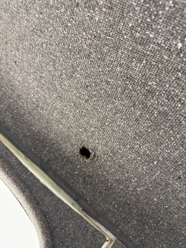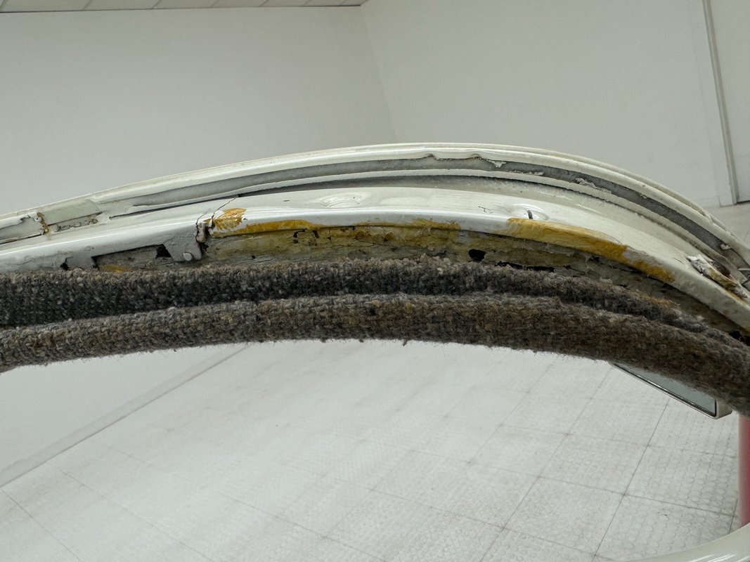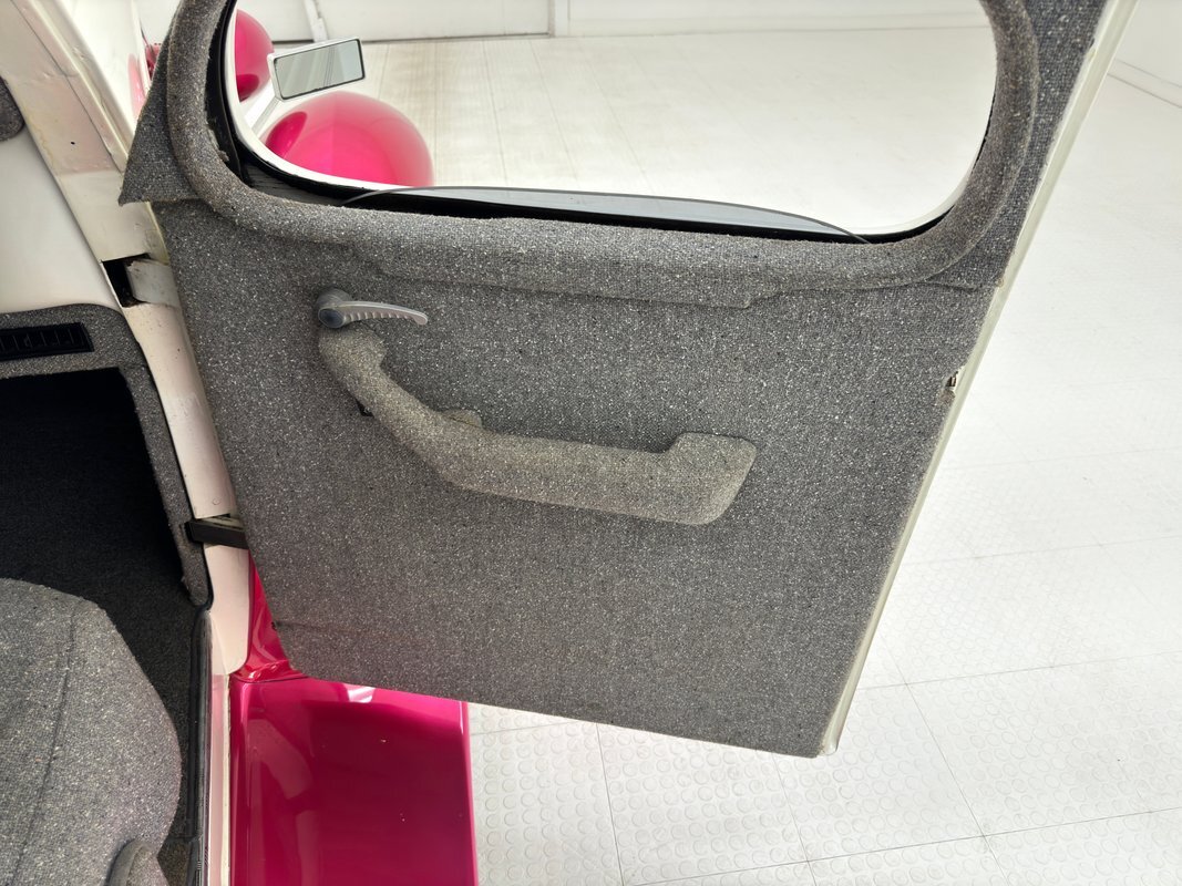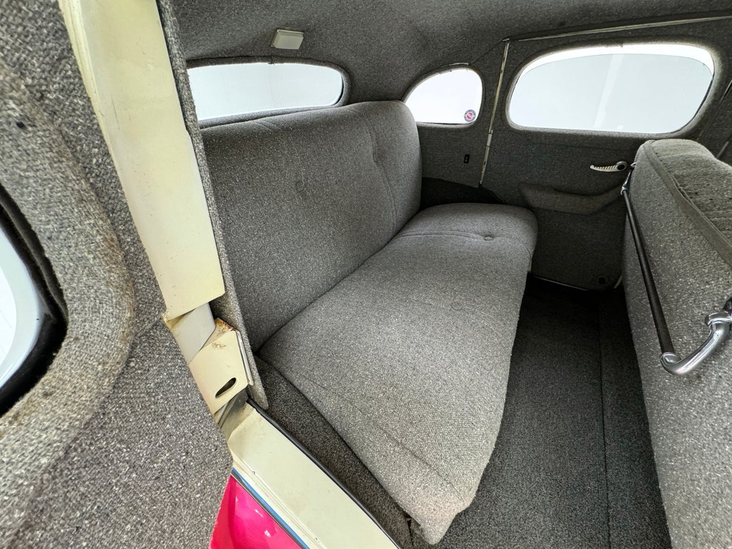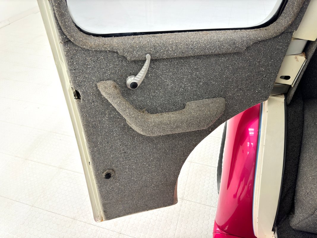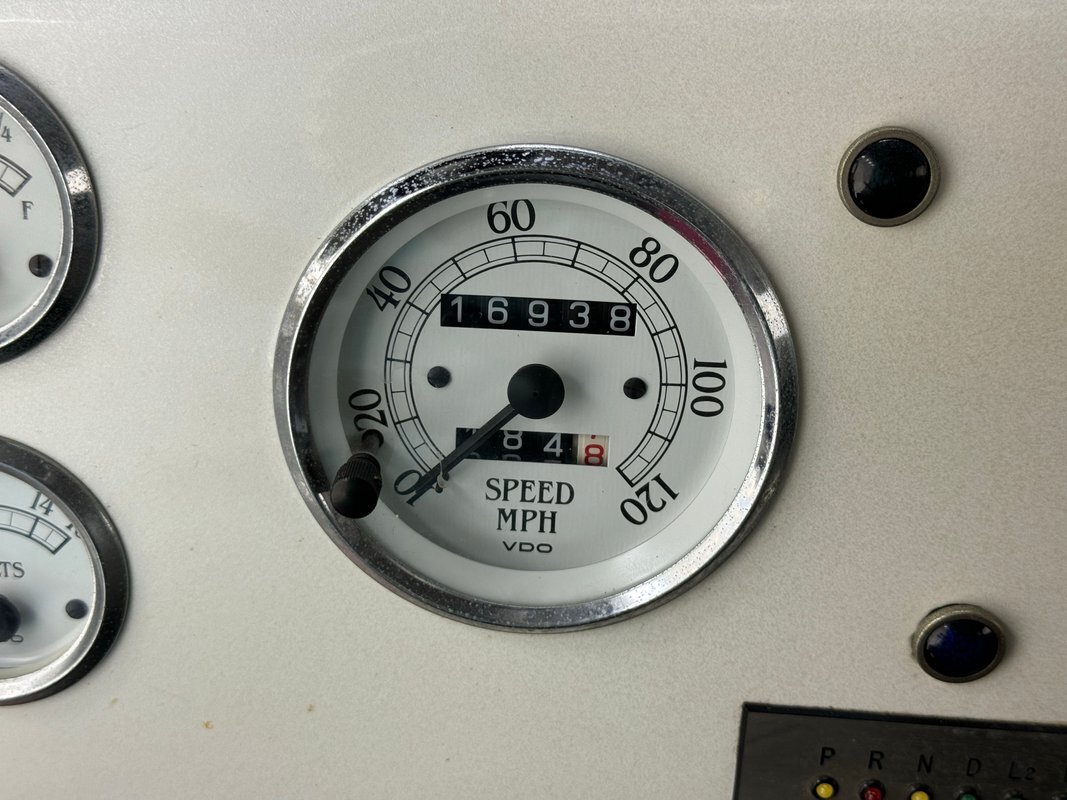 Gray tweed covers the door cards including the window frame, arm rests, and door pulls. Power windows and power locks are present! The back doors, which open suicide style, receive the same treatment. Tweed covers the walls and spills onto the bench seats, front and rear, for a clean monochromatic look. Rear passengers have ample space and a handlebar mounted on the back of the front seats. Soft and spacious, the bench seats are in great shape save for a hole on the front passenger side. A wings style hotrod steering wheel recalls the outside wheels and the metal dash is smooth, painted in body color white. VDO vintage line gauges relay the important information including RPMs, while a panel of tiny lights let you know what gear you are in. An AM/FM/Cassette radio is on the right side of the dash and vent controls are found lower on a tweed panel. A Lokar knob sits atop the floor mounted automatic shifter, and can you guess the material covering the floor? Tweed, it is! Everything matches including the headliner which is in fine shape. Yep, in the trunk as well where we find a spare tire and the battery.